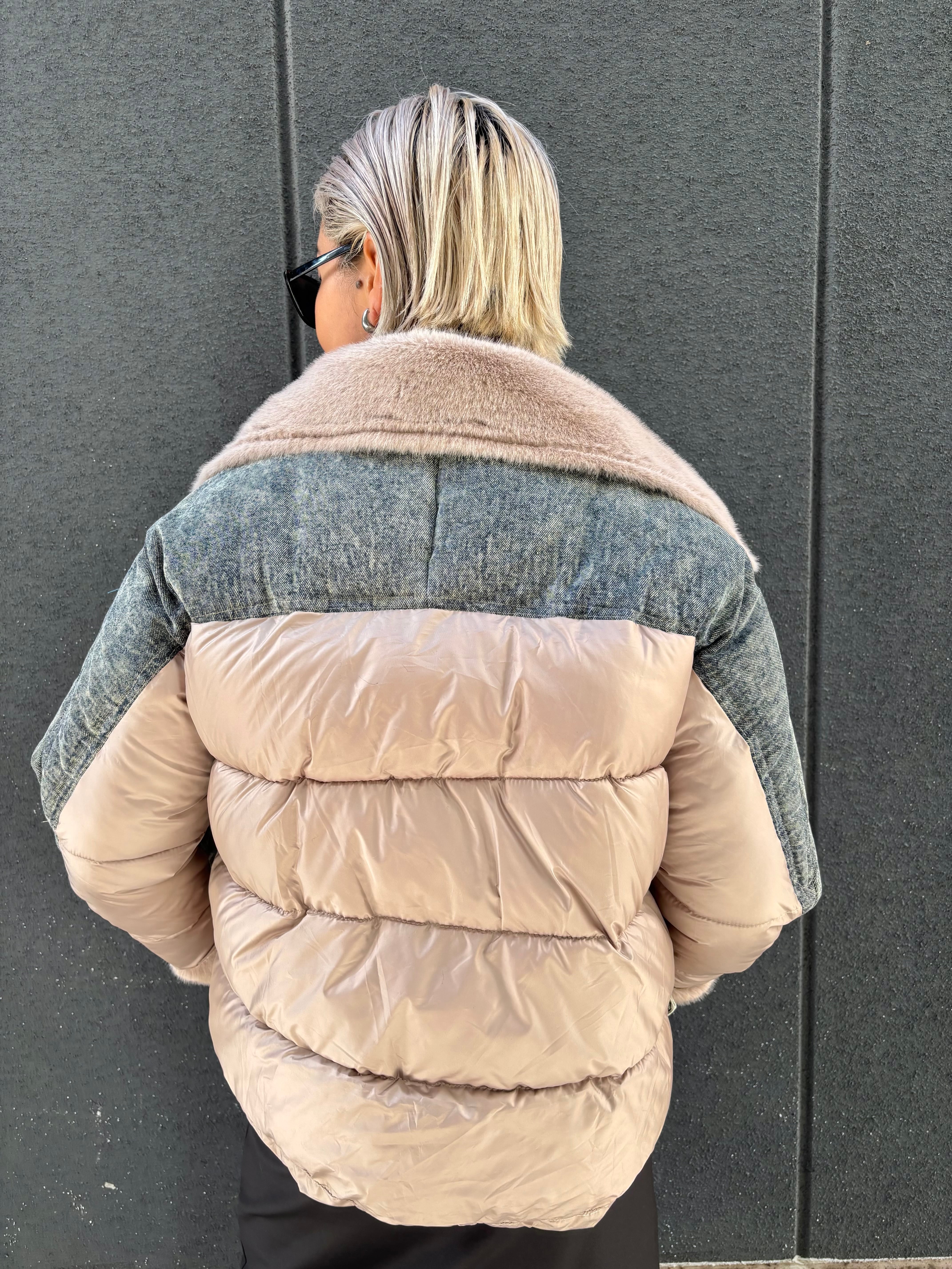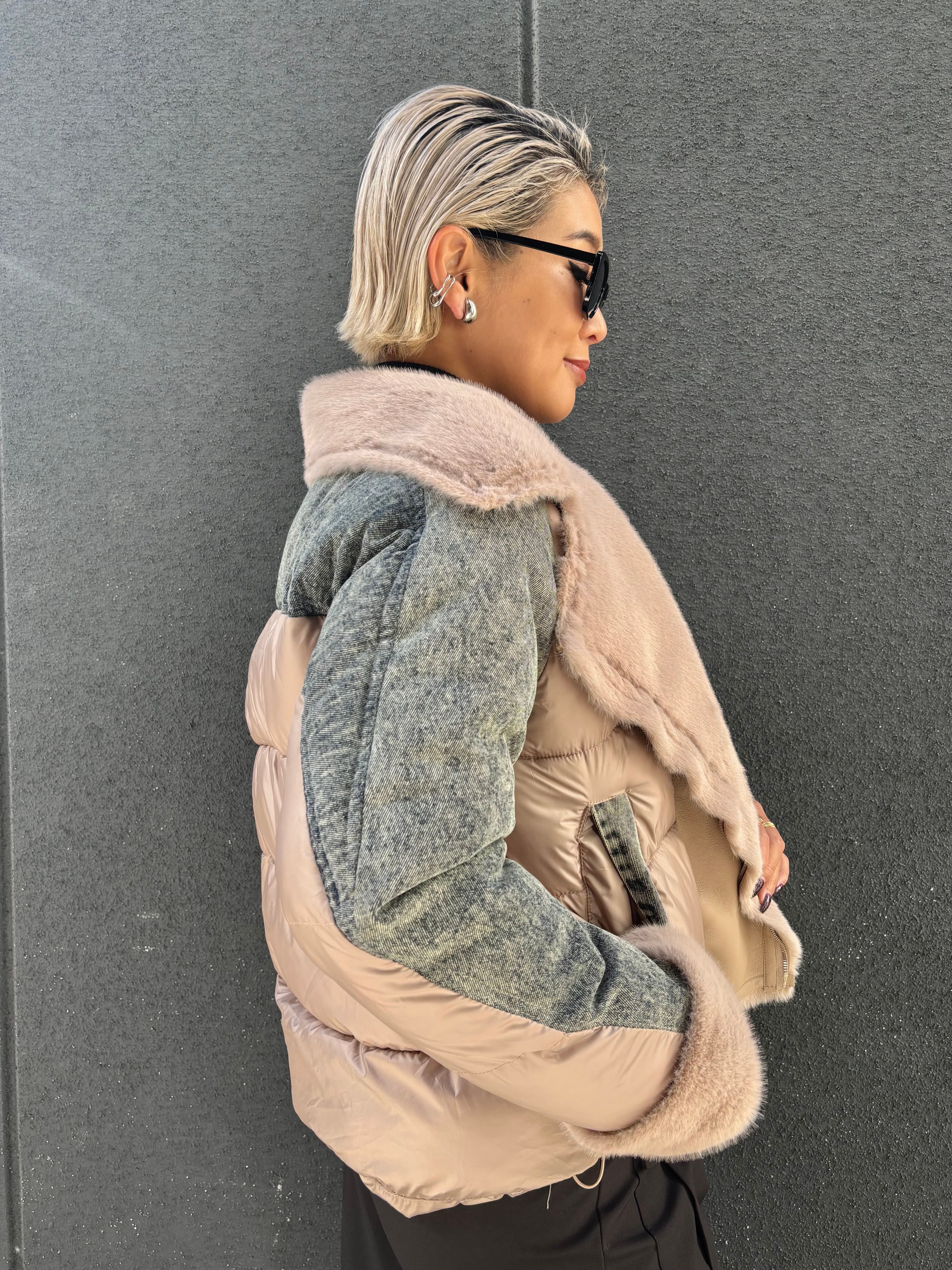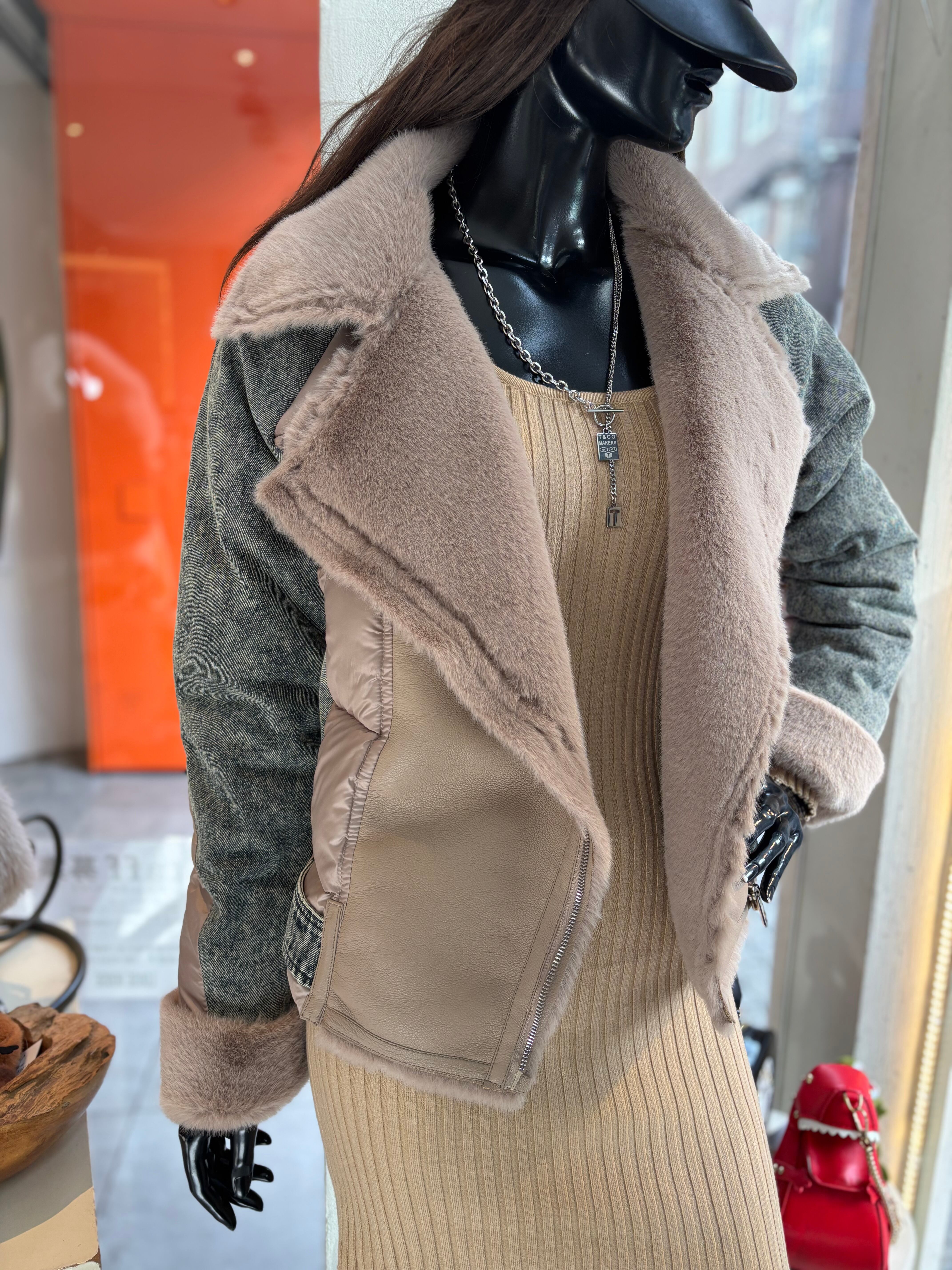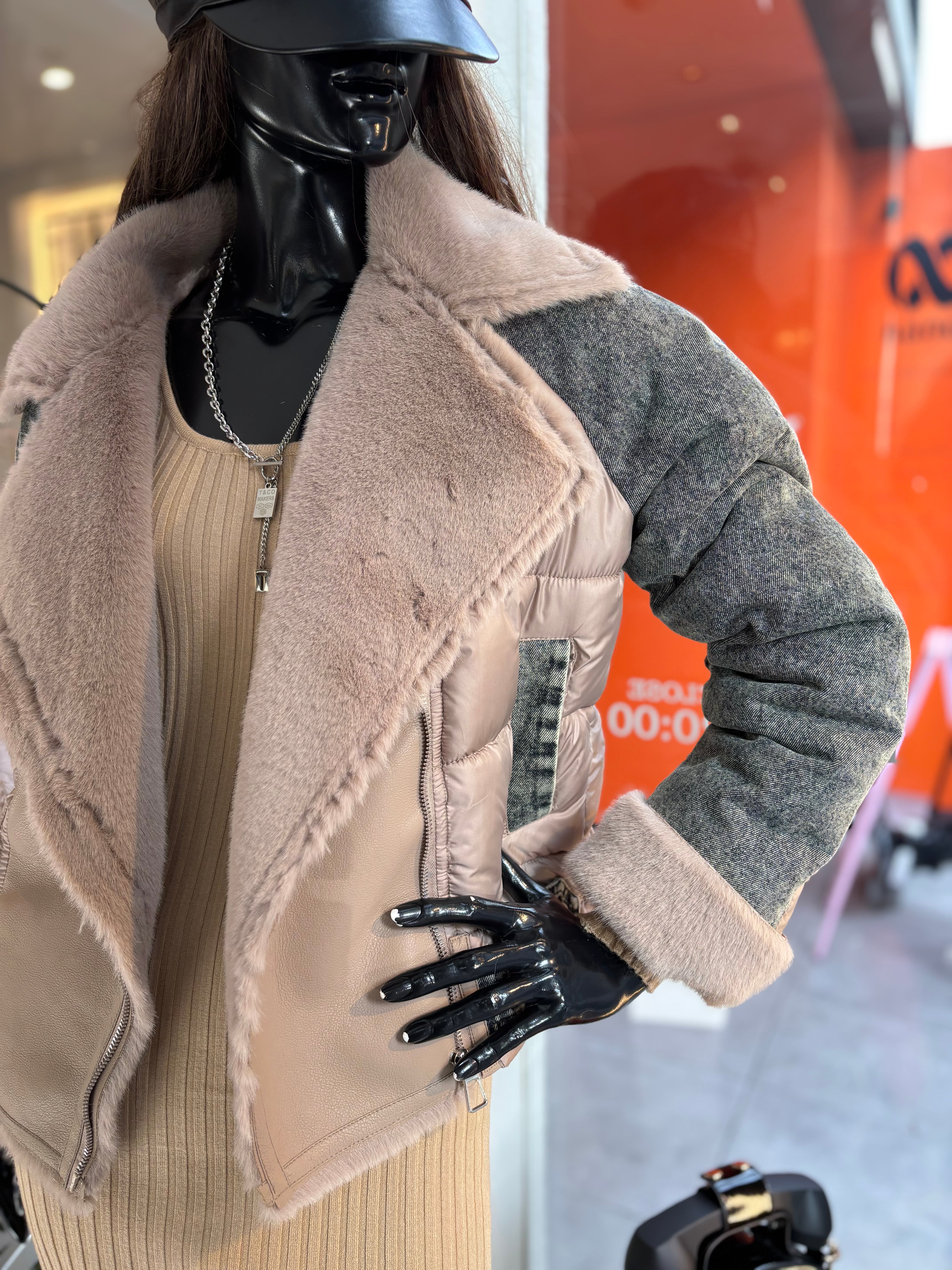 異素材を巧みにミックスしたデザインが特徴のジャケット。中綿入りで、寒い季節でもしっかりとした暖かさを提供します。ファー、デニム、そしてエコレザーの切り替えデザインにより、スタイリッシュさと機能性を兼ね備えた一着に仕上がっています。ライトな着心地でありながら、しっかりとした防寒性を持つこのジャケットは、普段使いからお出かけまで幅広く活躍します。