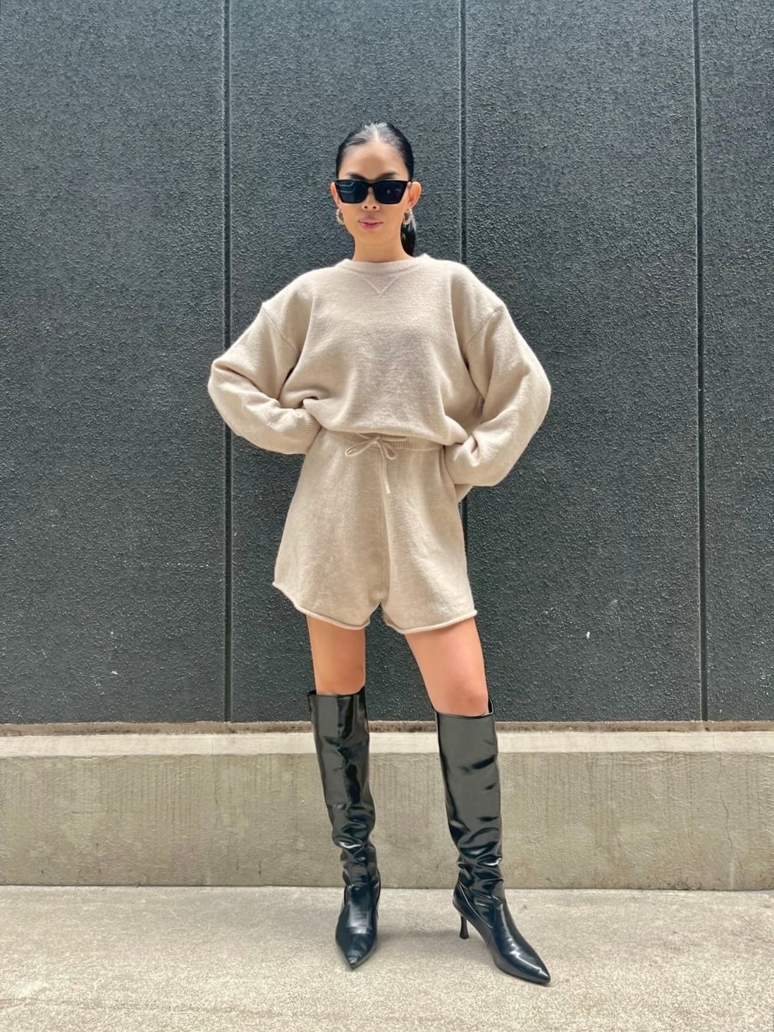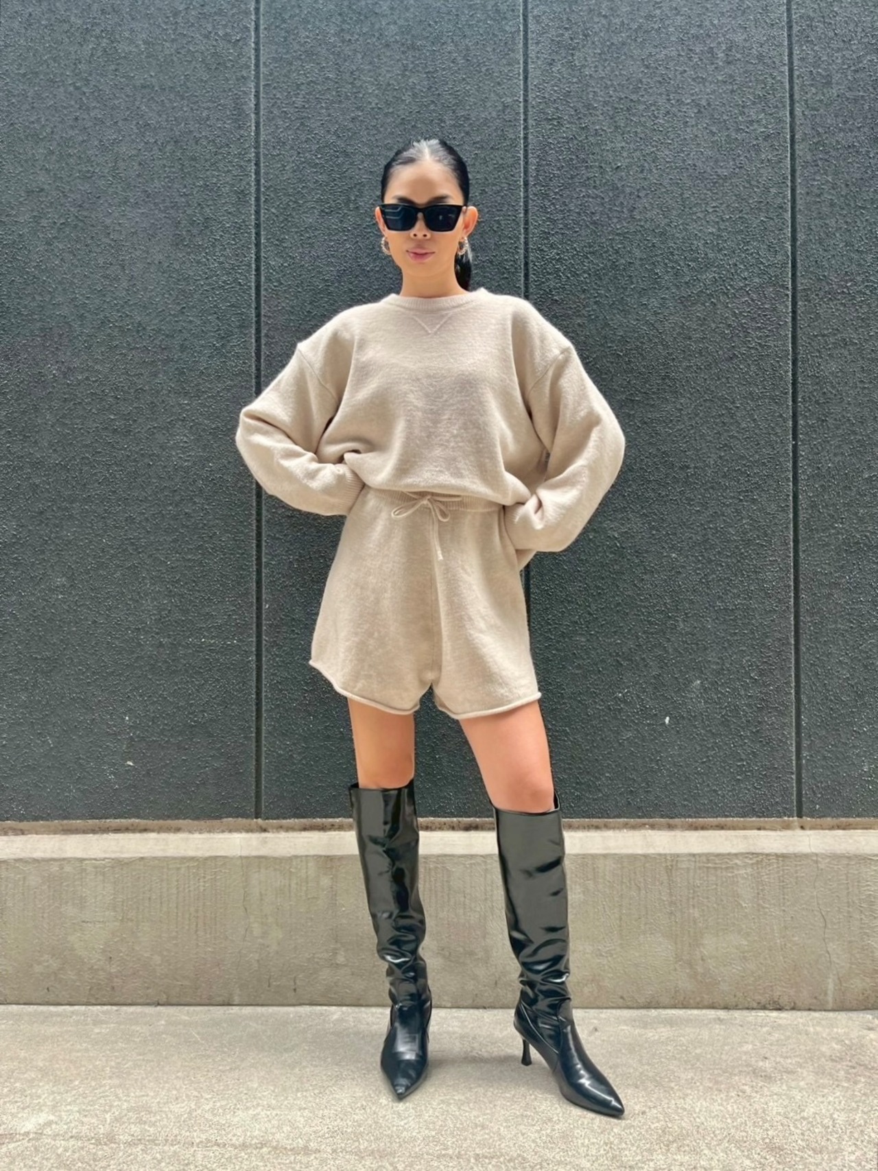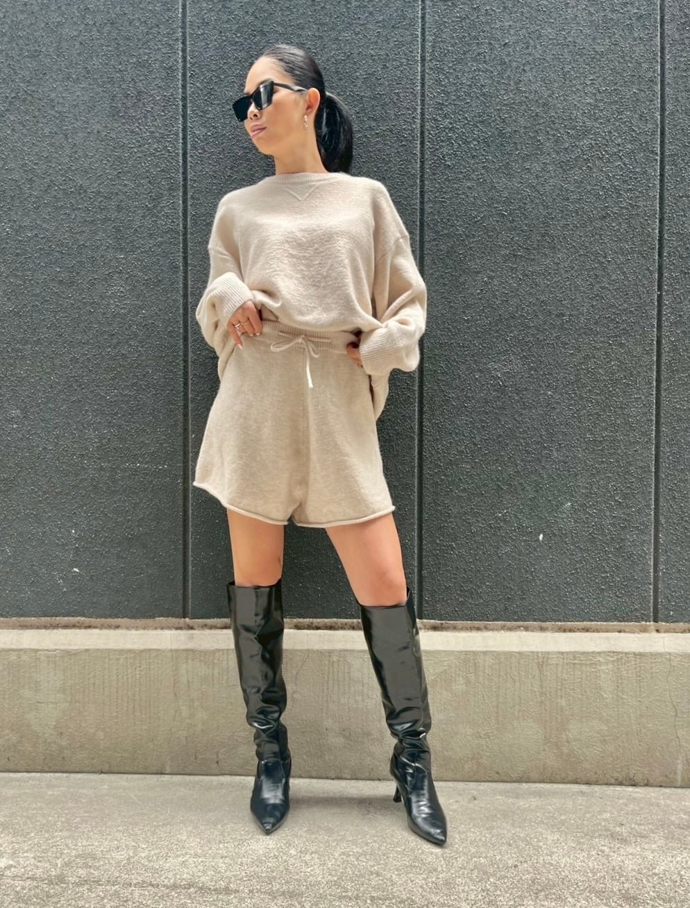 ニットのトップスとショートパンツの2点セットで、様々なコーディネートが可能です。