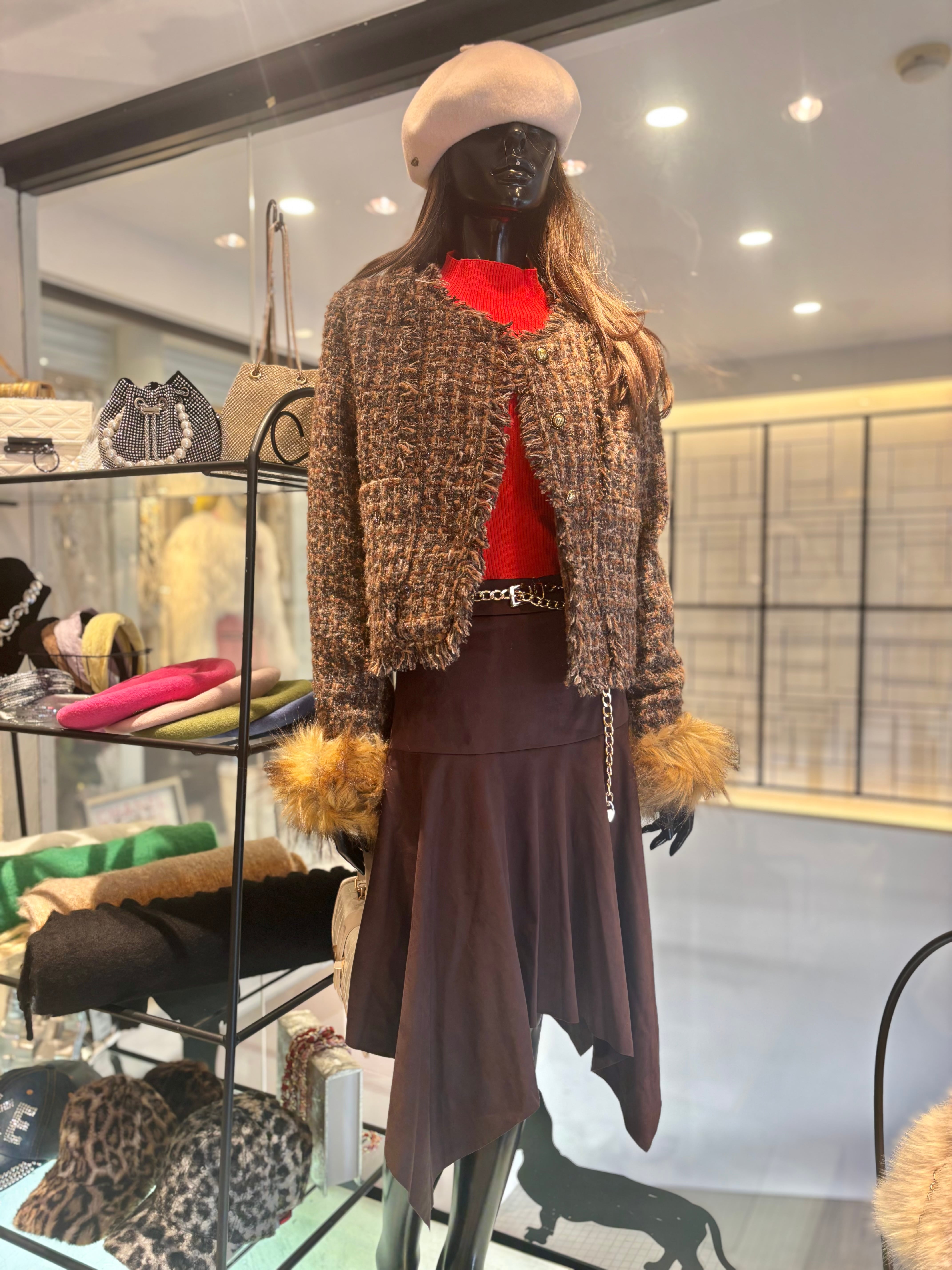 イレギュラーな裾デザインが魅力で、日常のコーディネートに新しい風を吹き込んでくれます。フェイクスエード素材を使用しており、柔らかな肌触りが特長です。