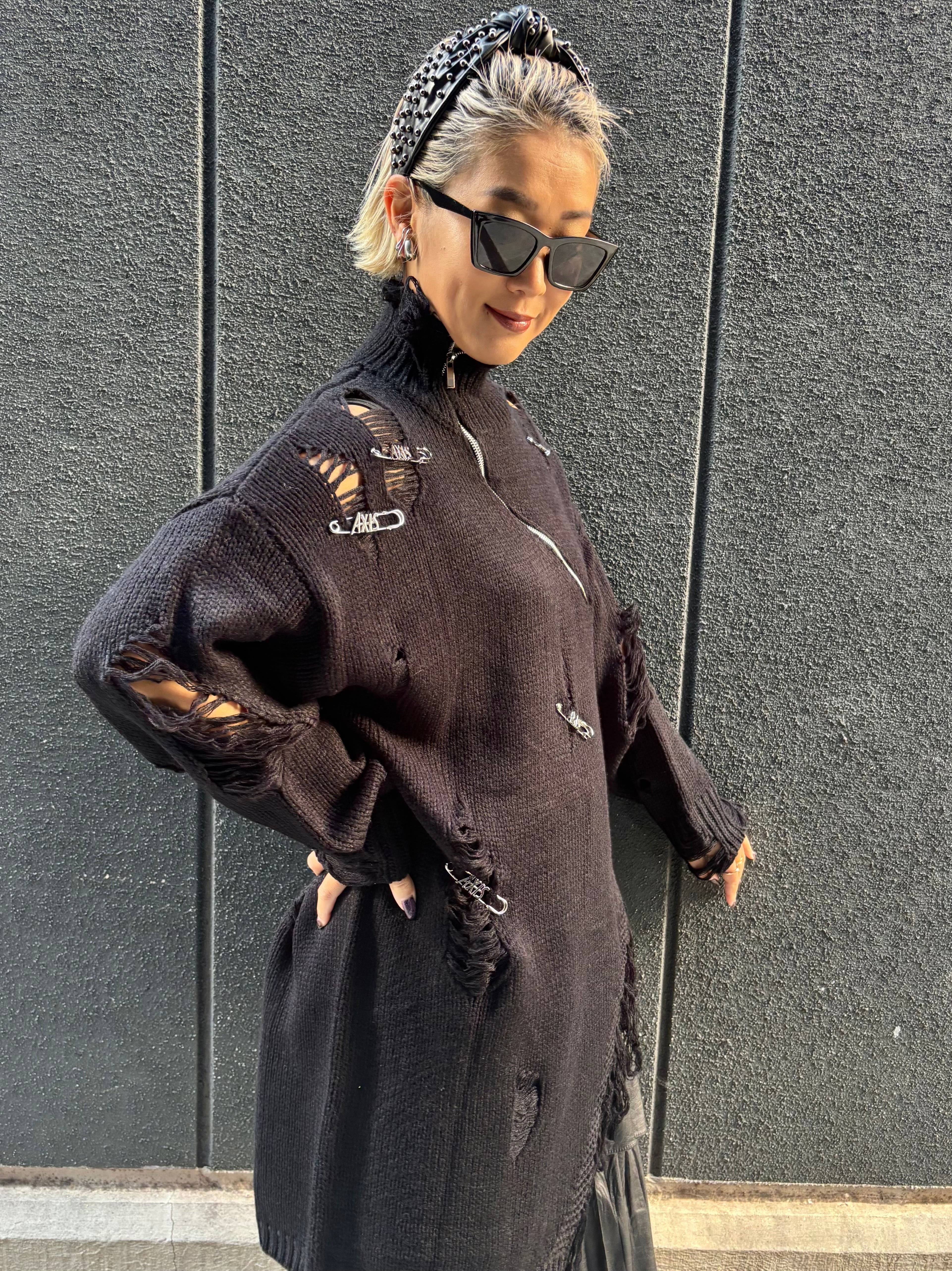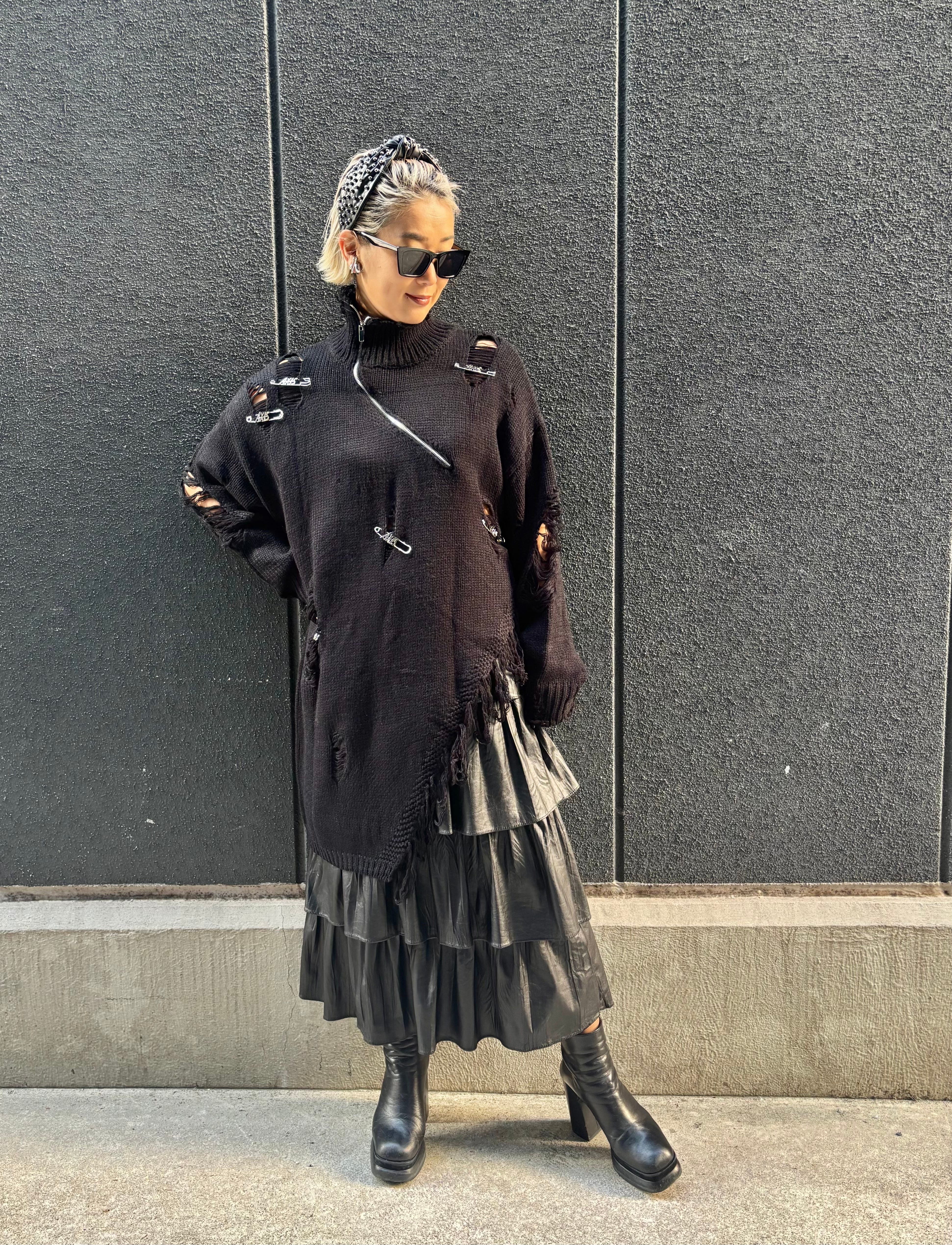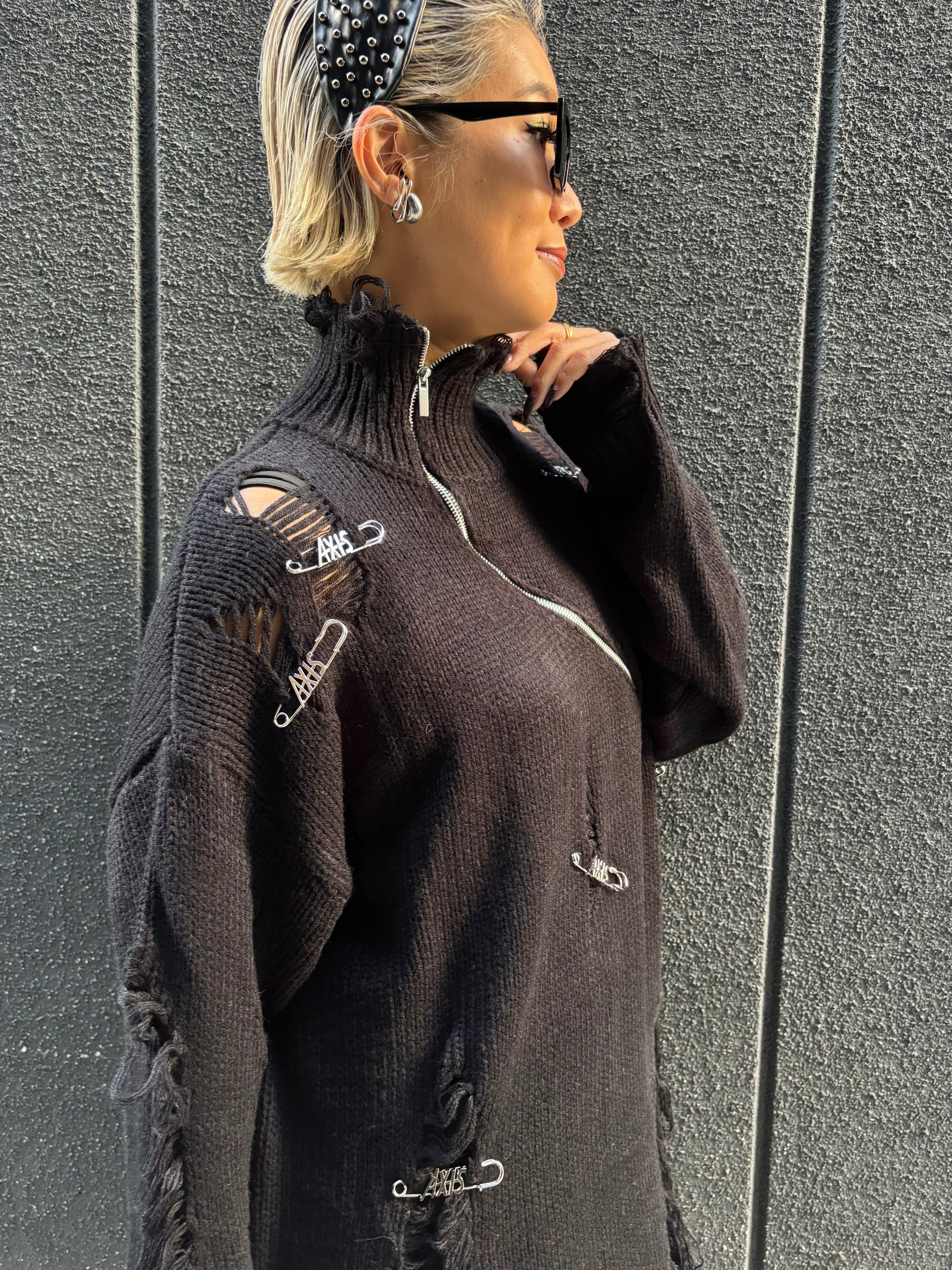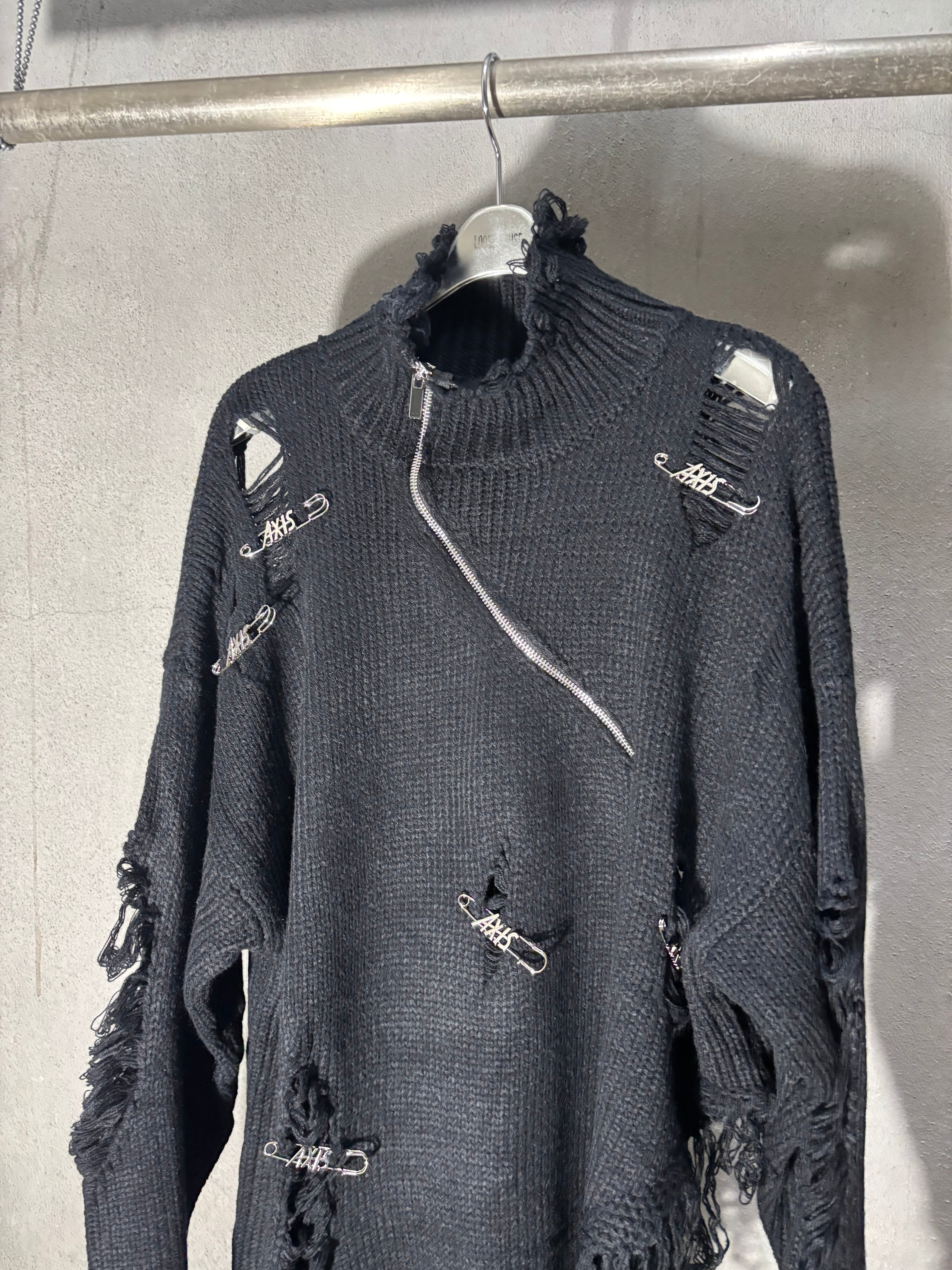 damage × safety pin × zip design knit tops ニット トップス ダメージ 安全ピン ジッパー アシンメトリー ブラック 黒