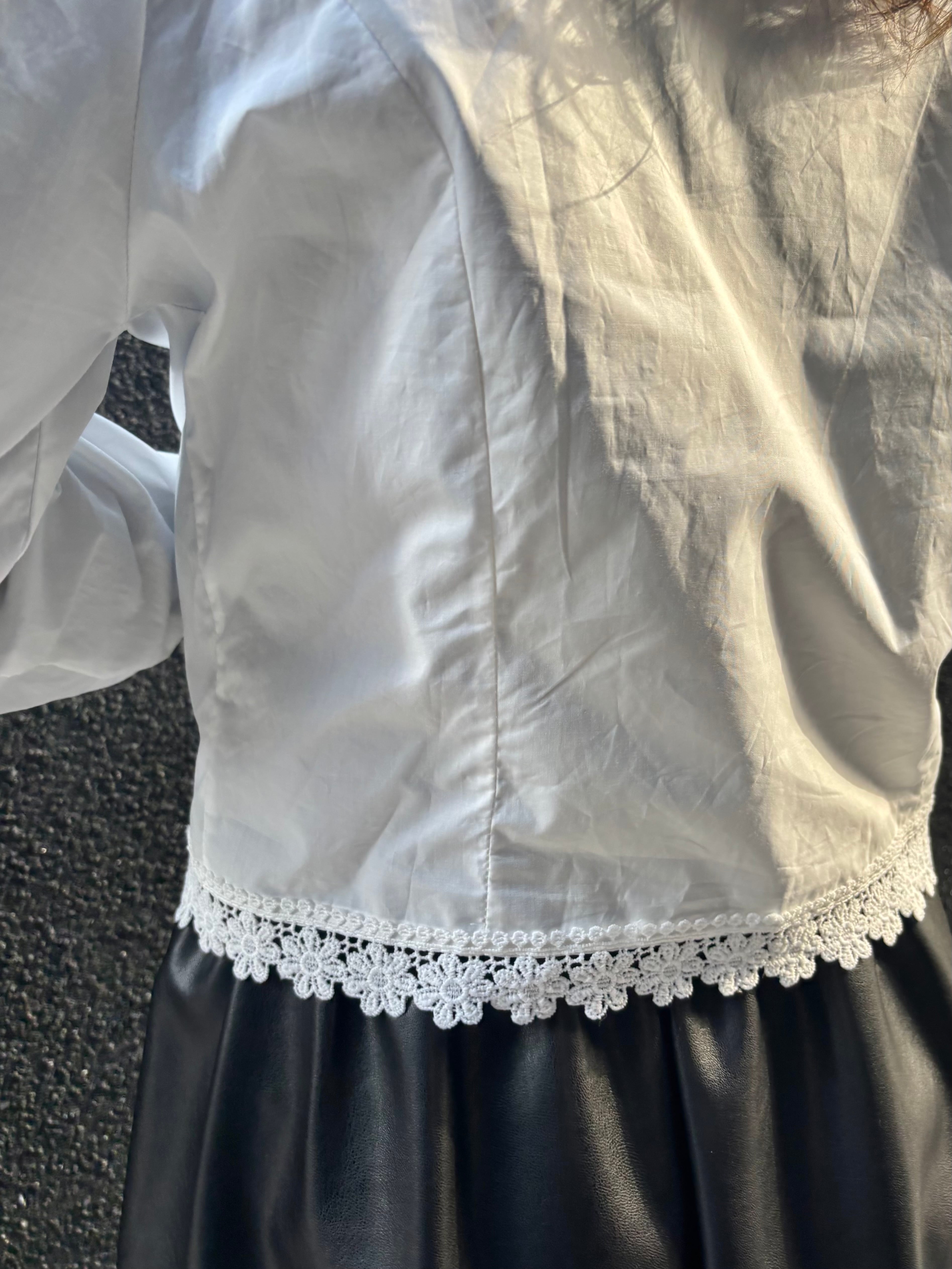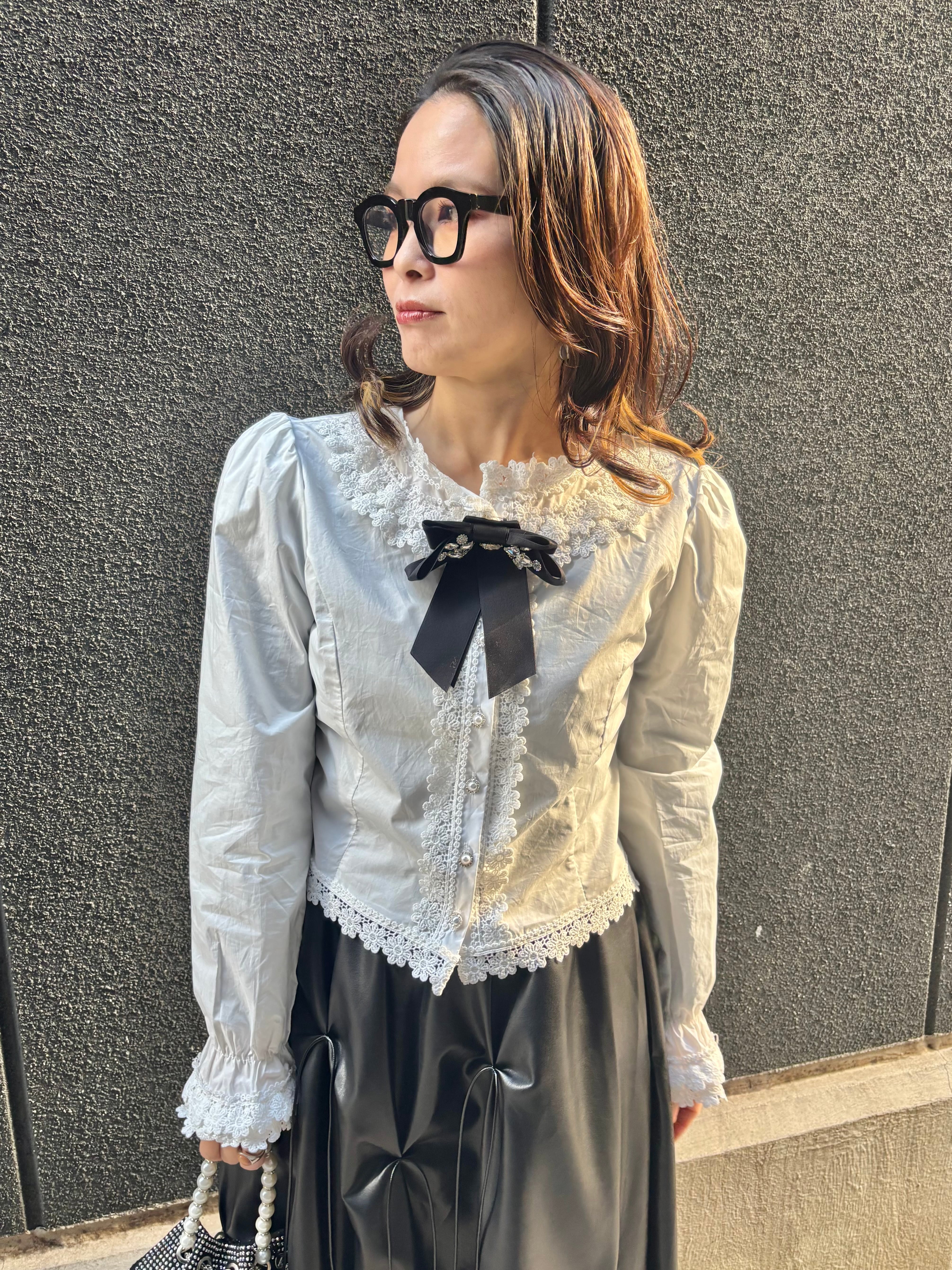 lace trimming × pearl button ribbon broach design tops blouse ブラウス トップス レース パール ボタン ブローチ 白 ホワイト