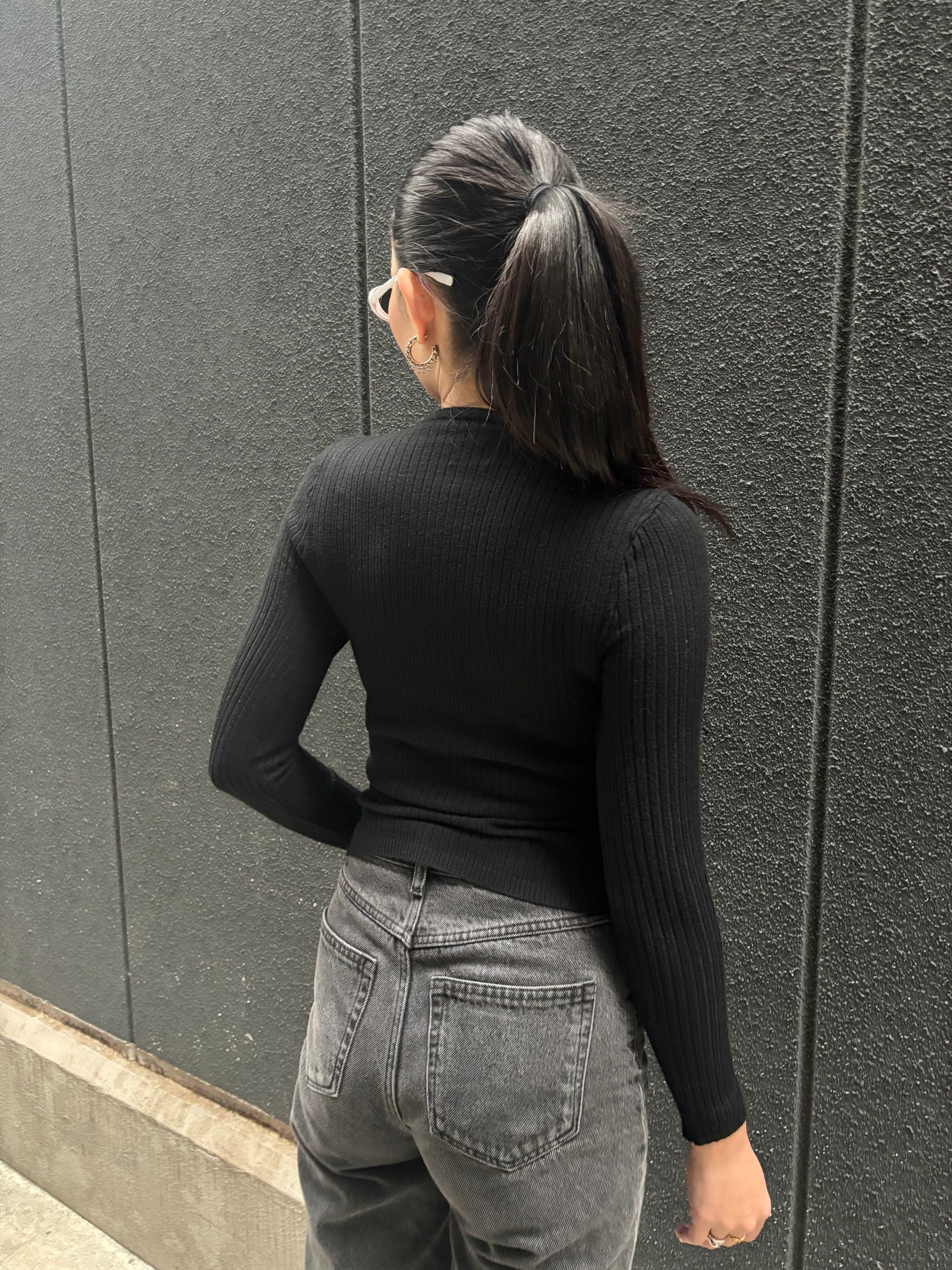 リブニットのストレッチ性があり、動きやすさも兼ね備えています。