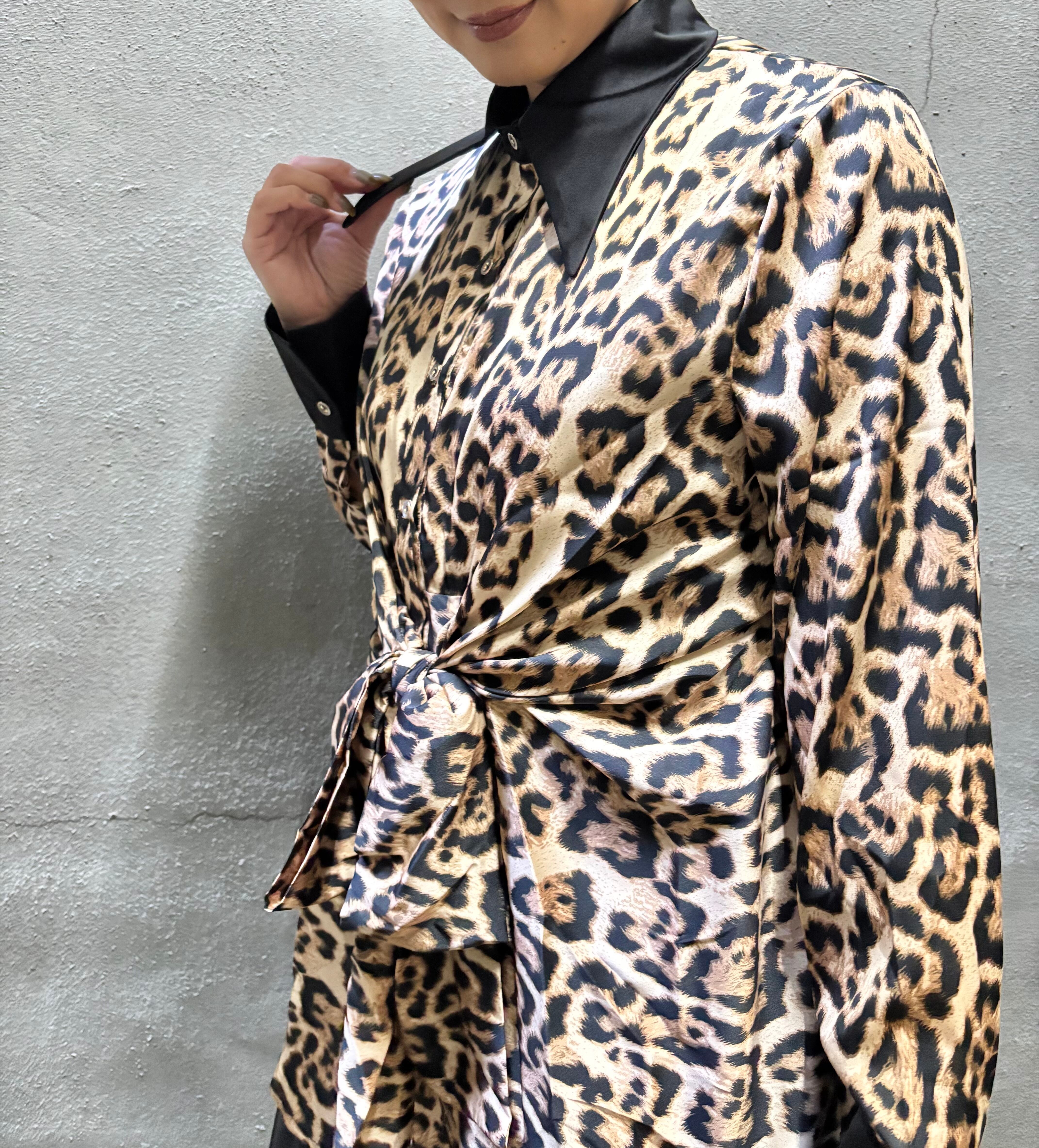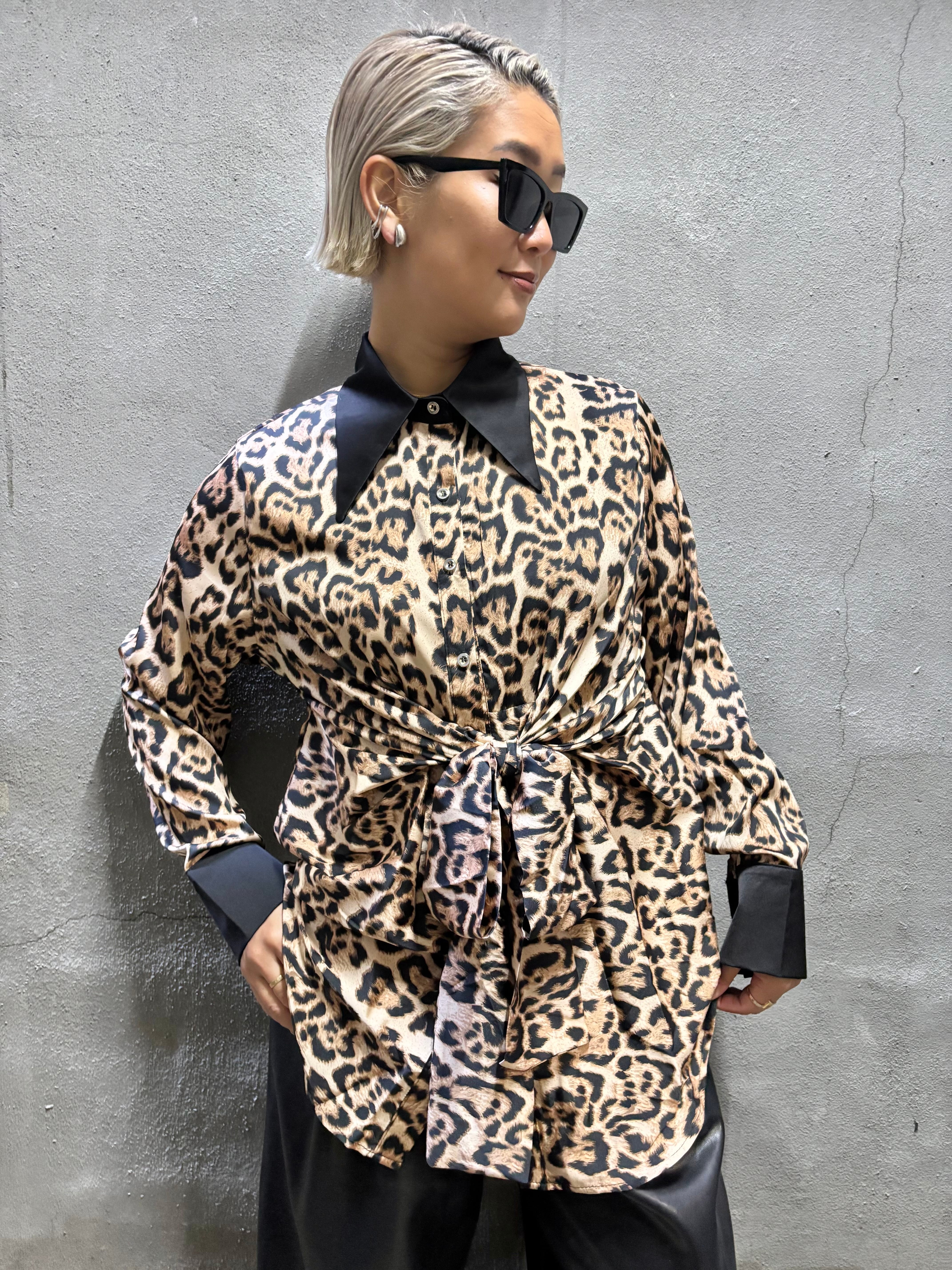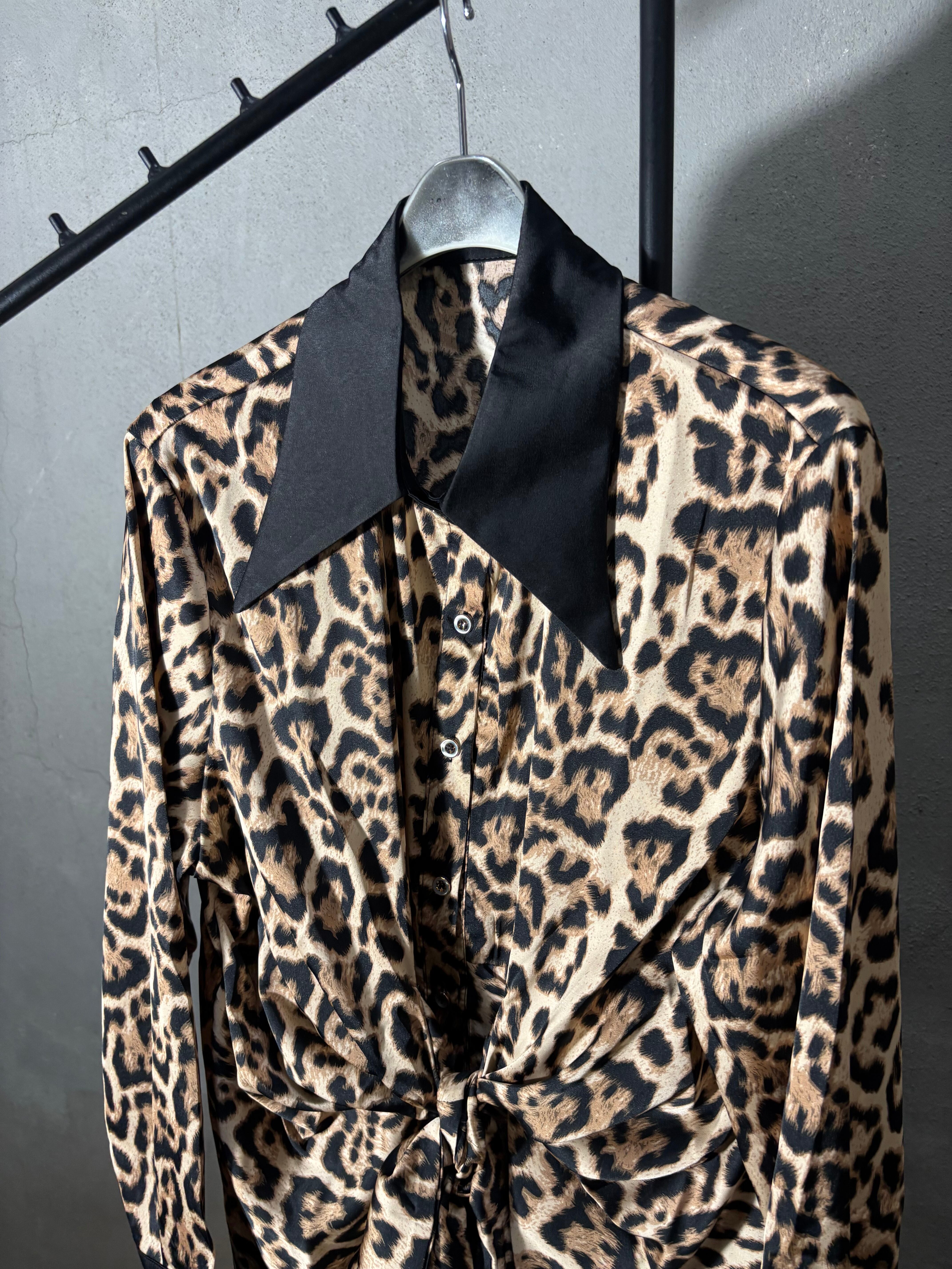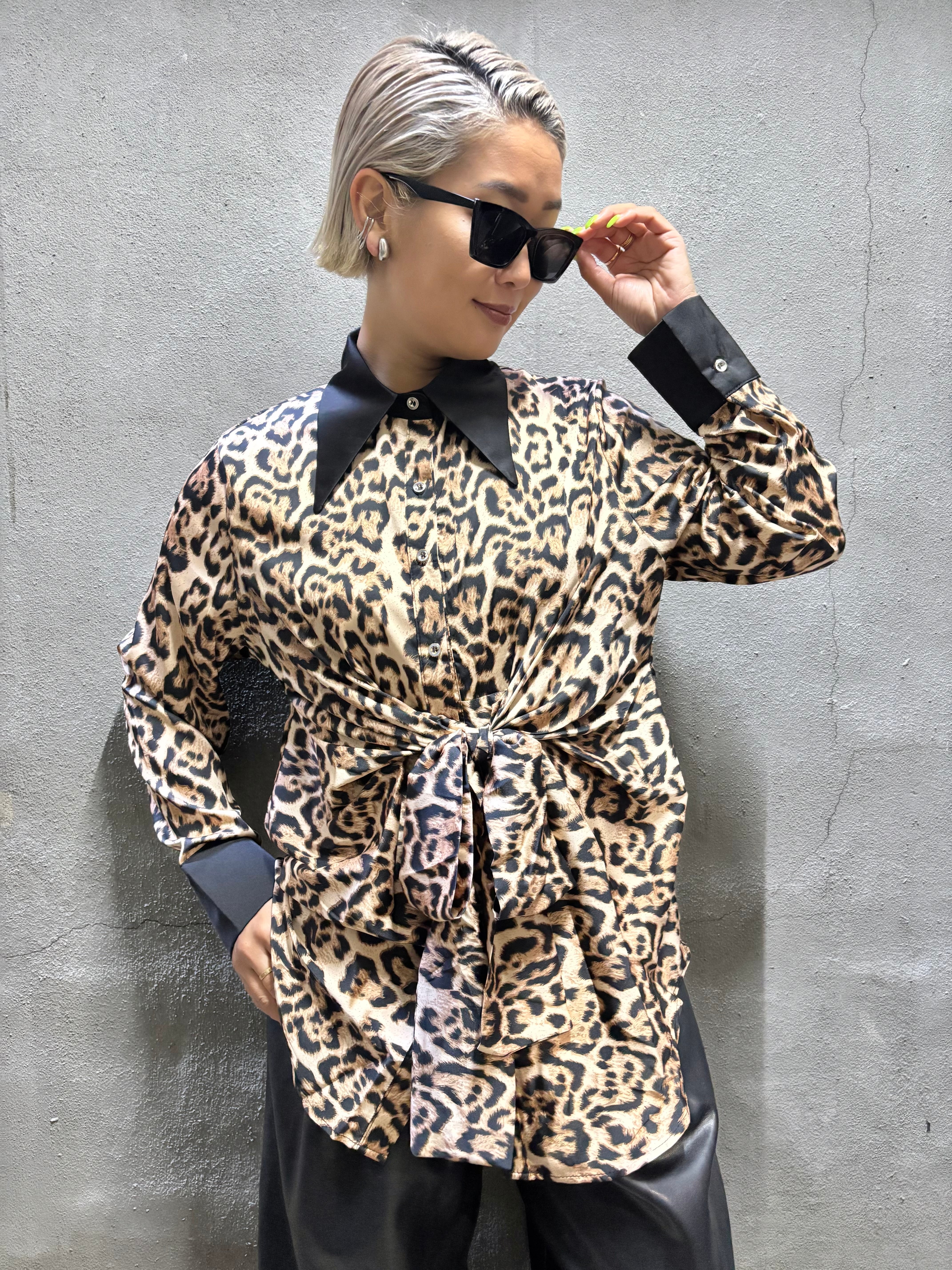 satin leopard print front ribbon design shirt シャツ サテン レオパード 豹柄 ヒョウ柄 アニマル フロントリボン