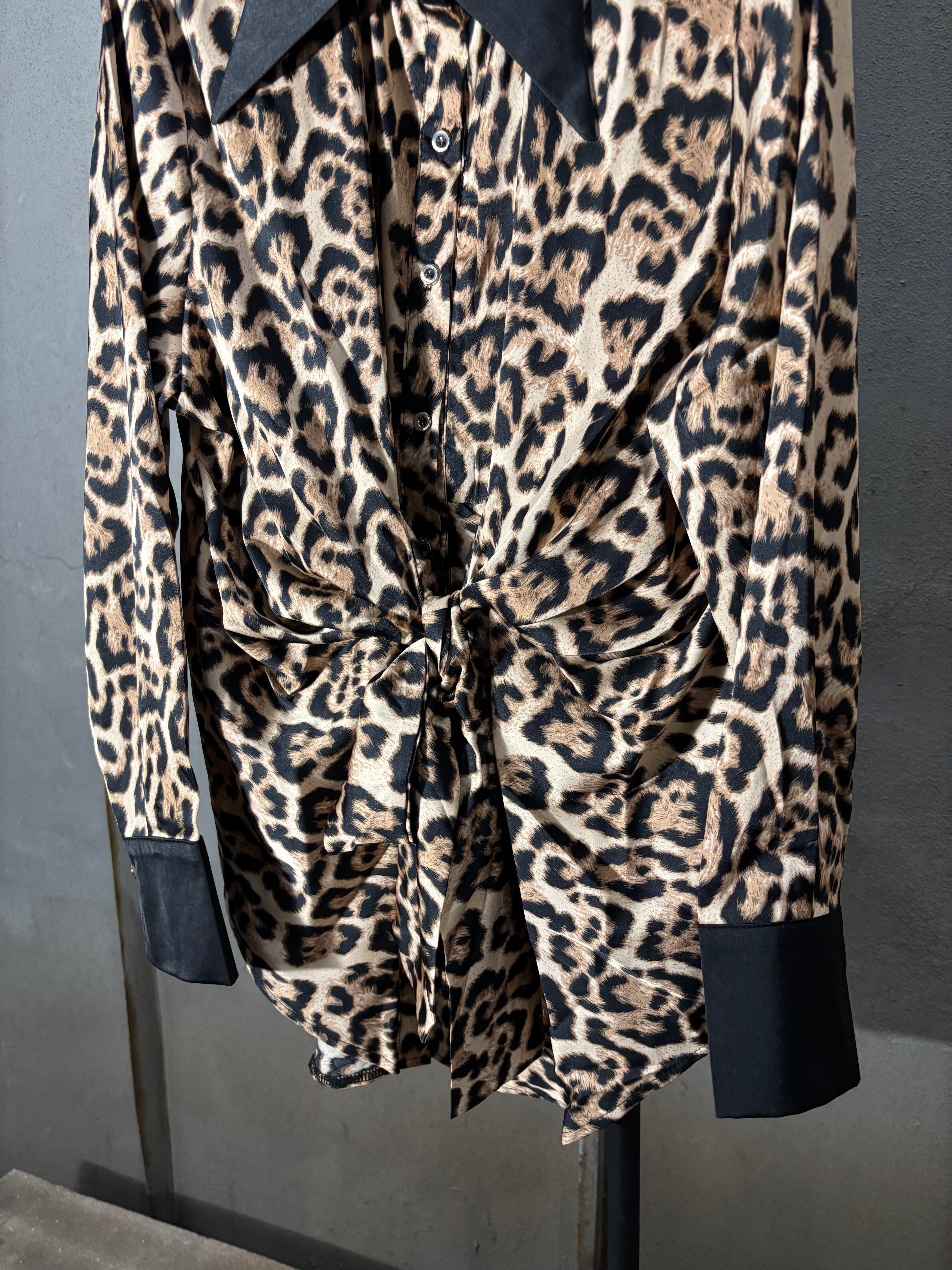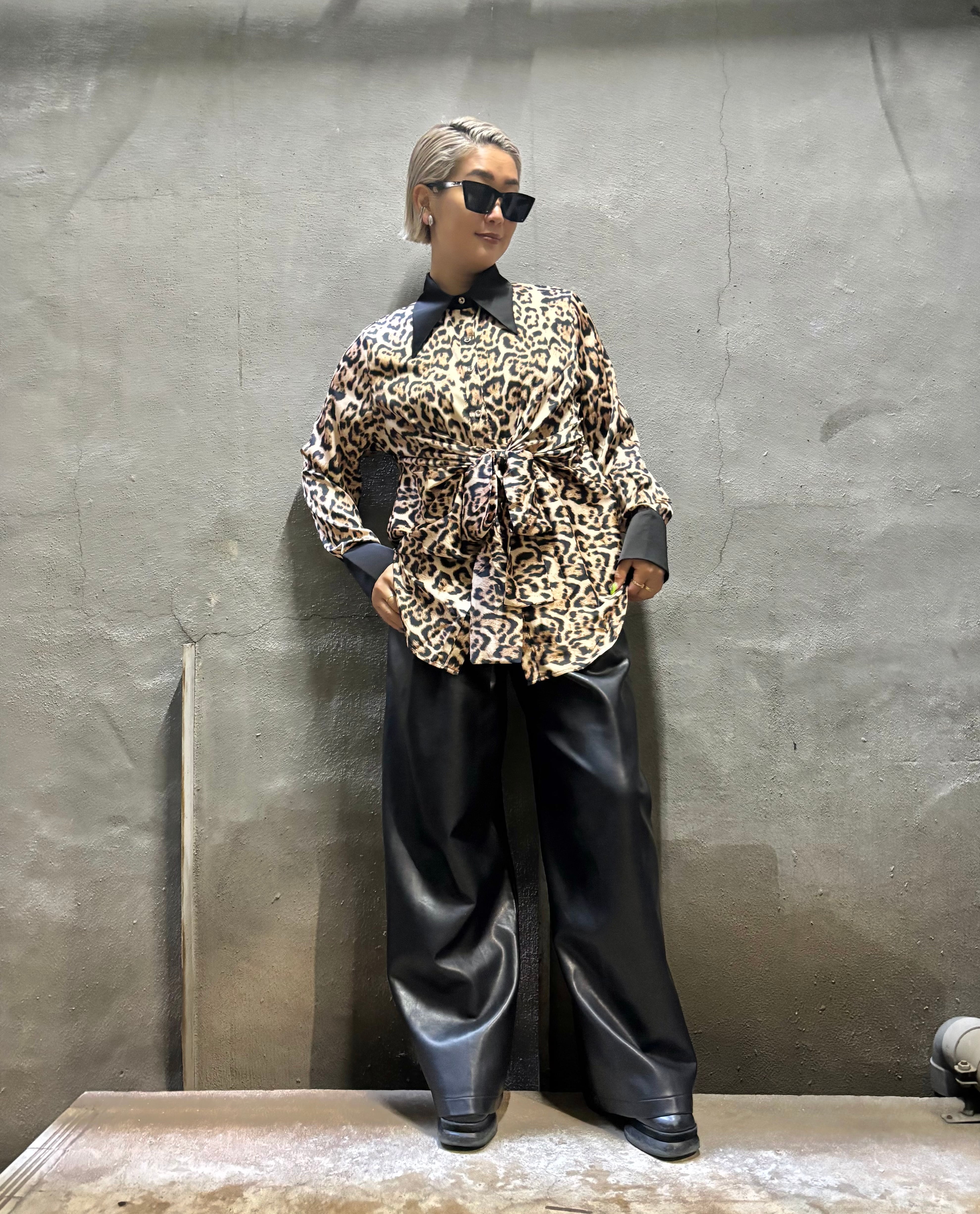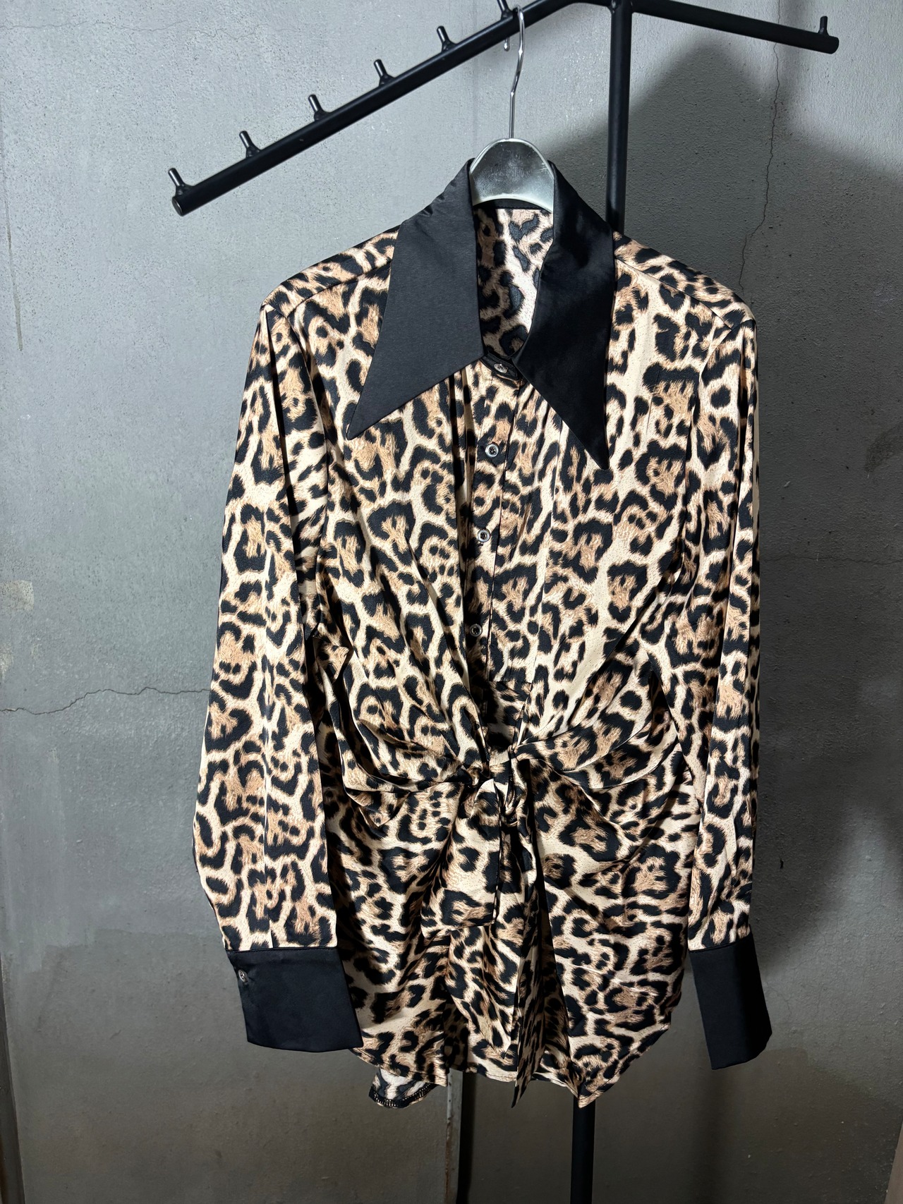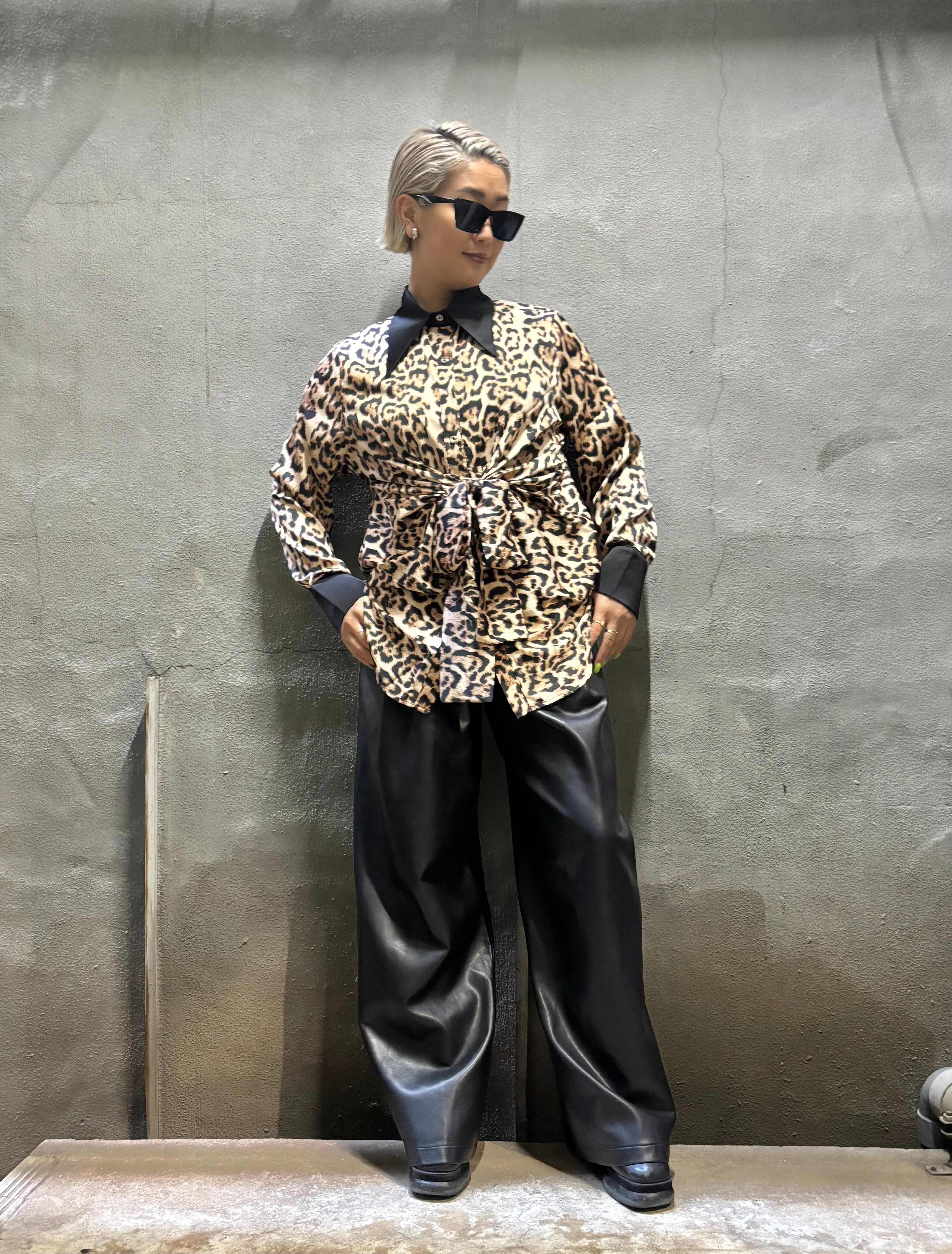 satin leopard print front ribbon design shirt シャツ サテン レオパード 豹柄 ヒョウ柄 アニマル フロントリボン