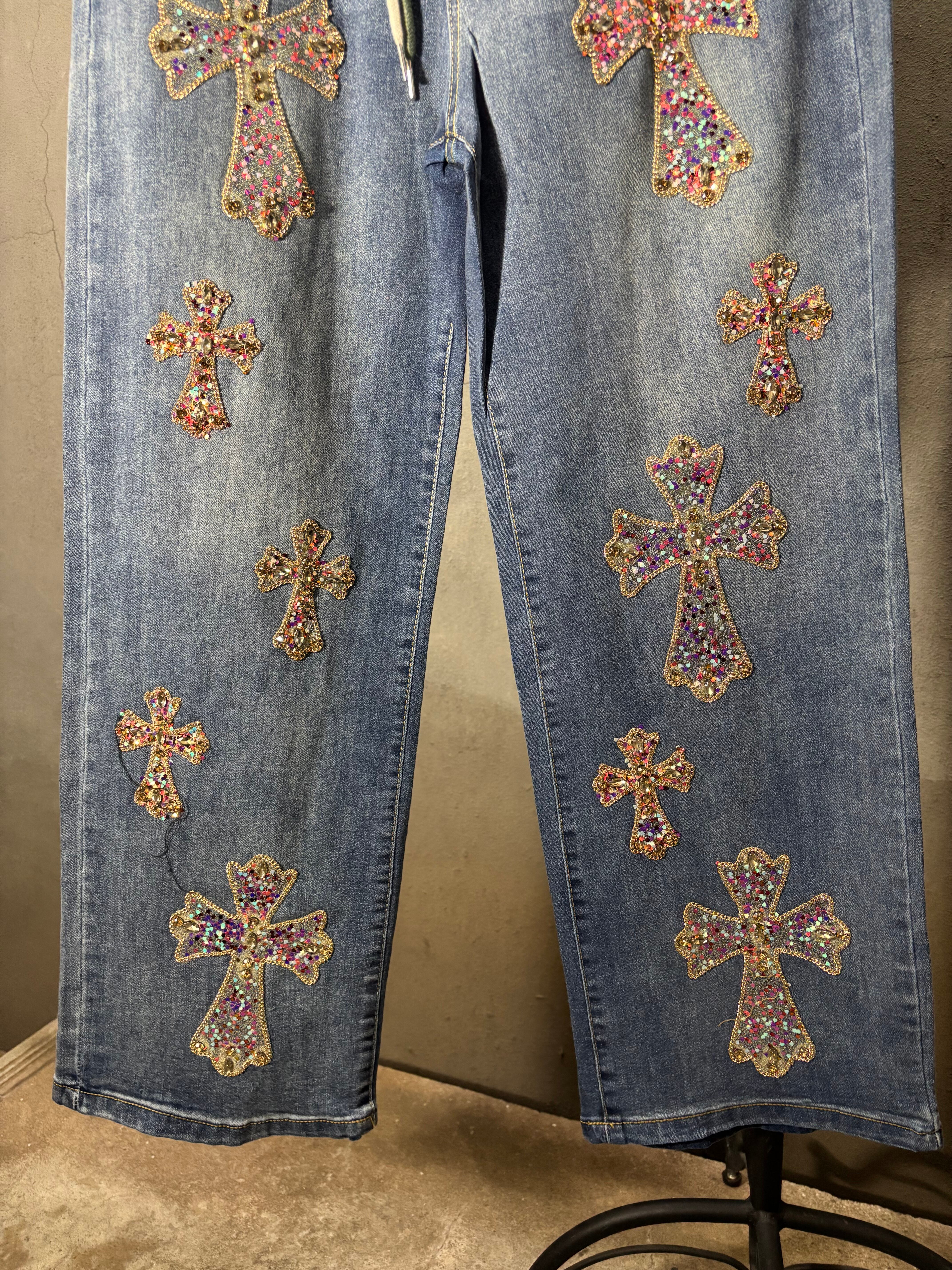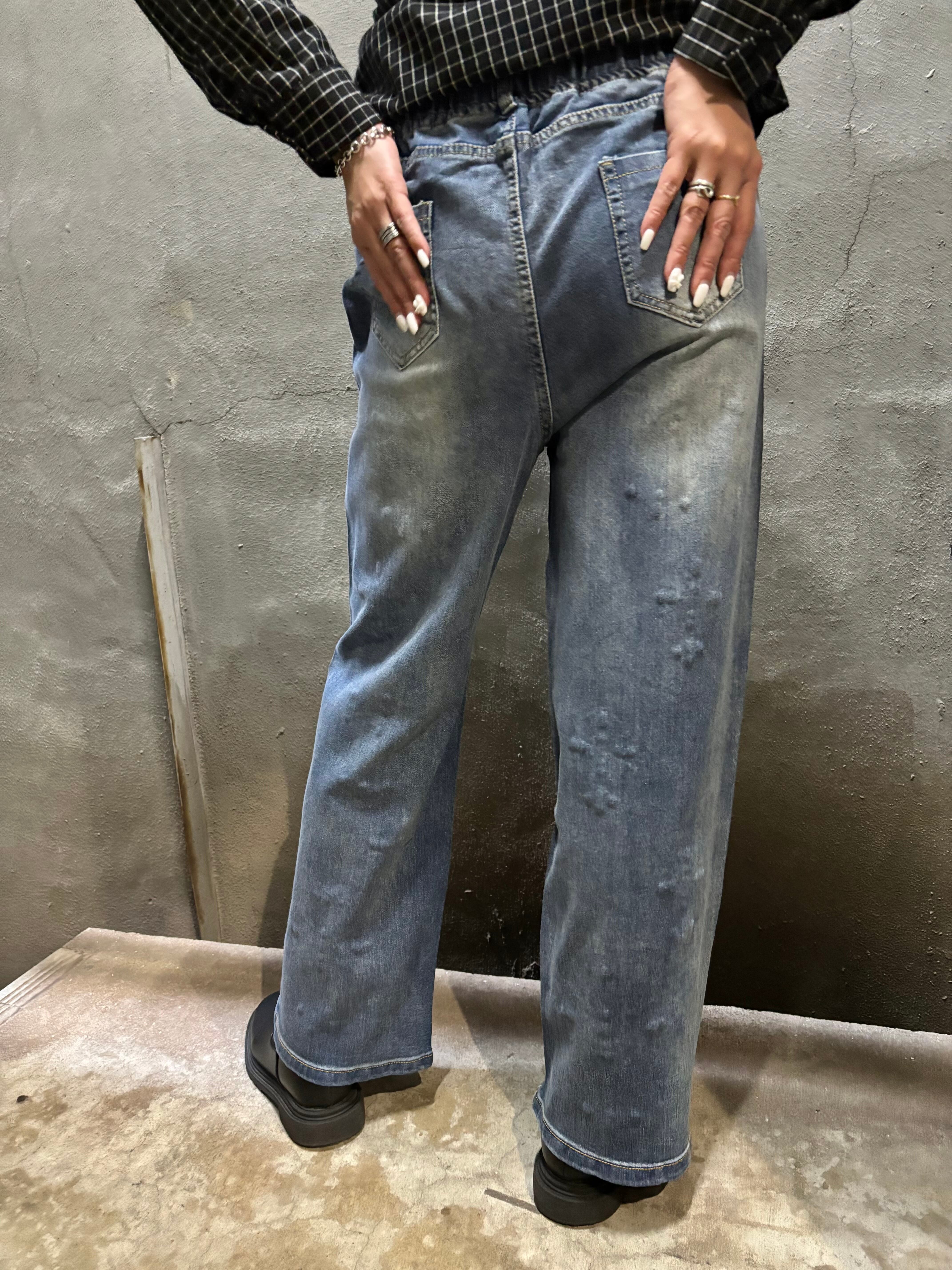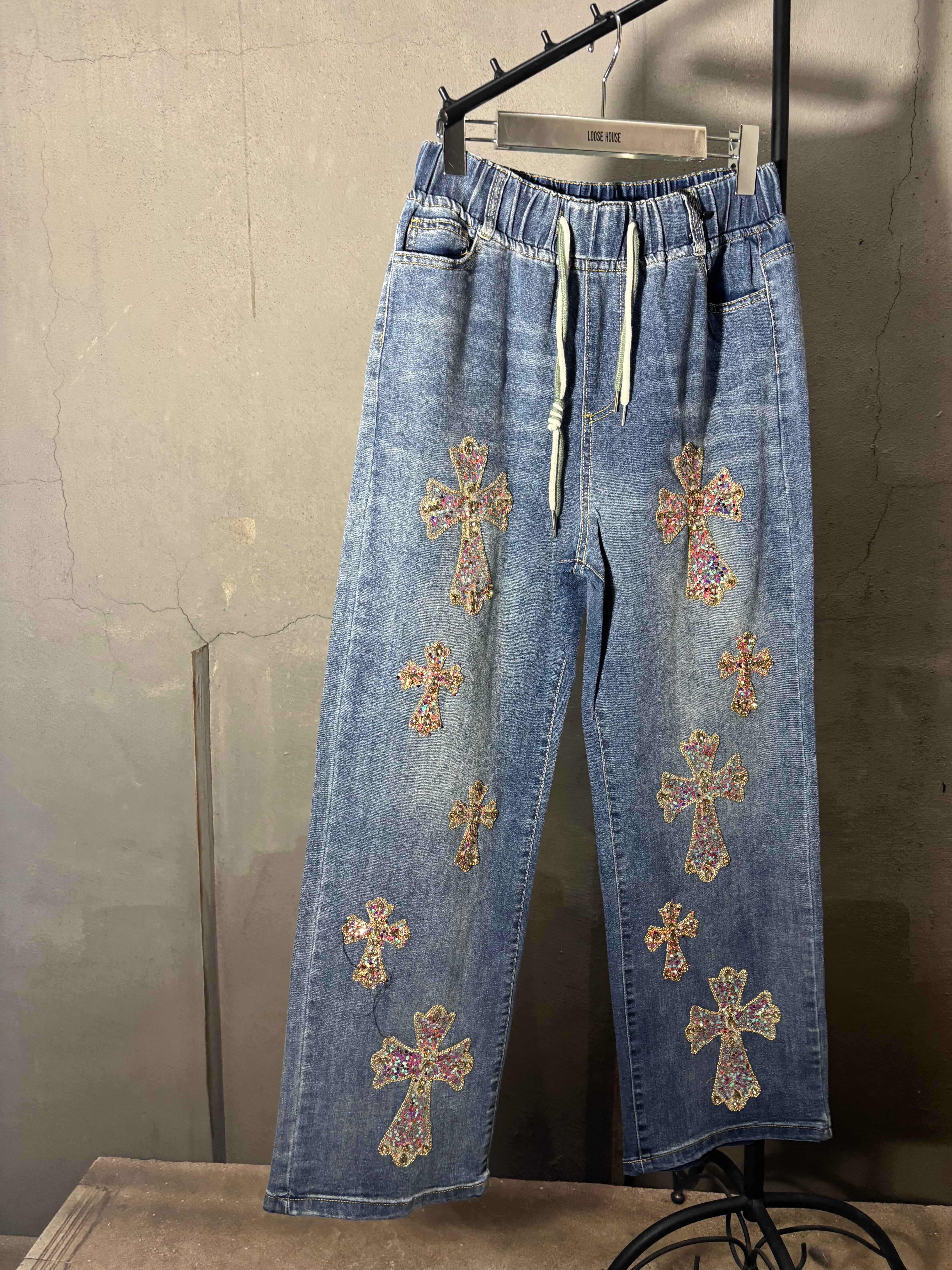 bijou cross design denim pants パンツ デニム クロス 十字架 ビジュー ゴムウエスト カジュアル