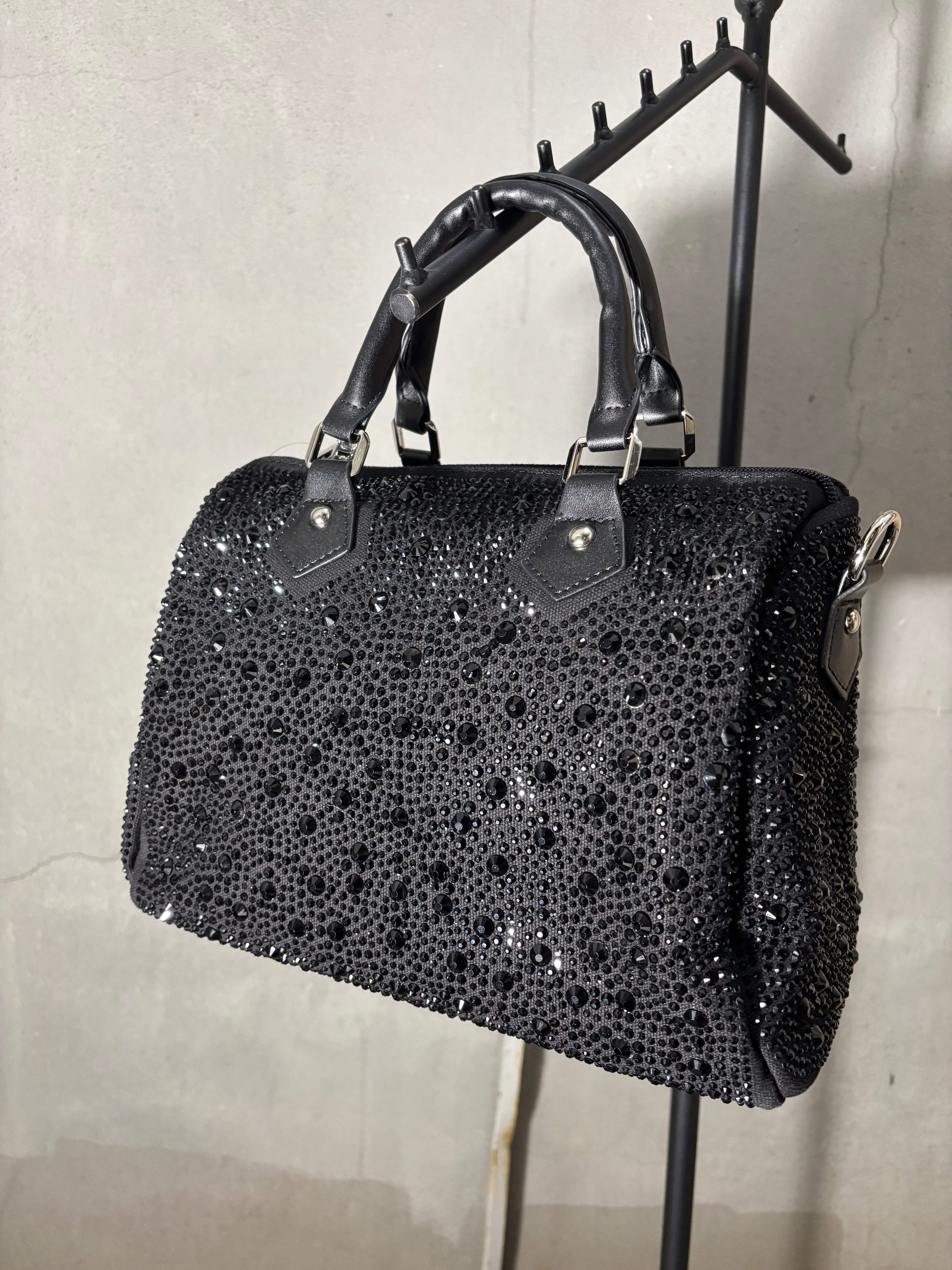 black stone boston bag バッグ ボストンバッグ かばん ブラック 黒 ストーン キラキラ ストラップ 斜めがけ
