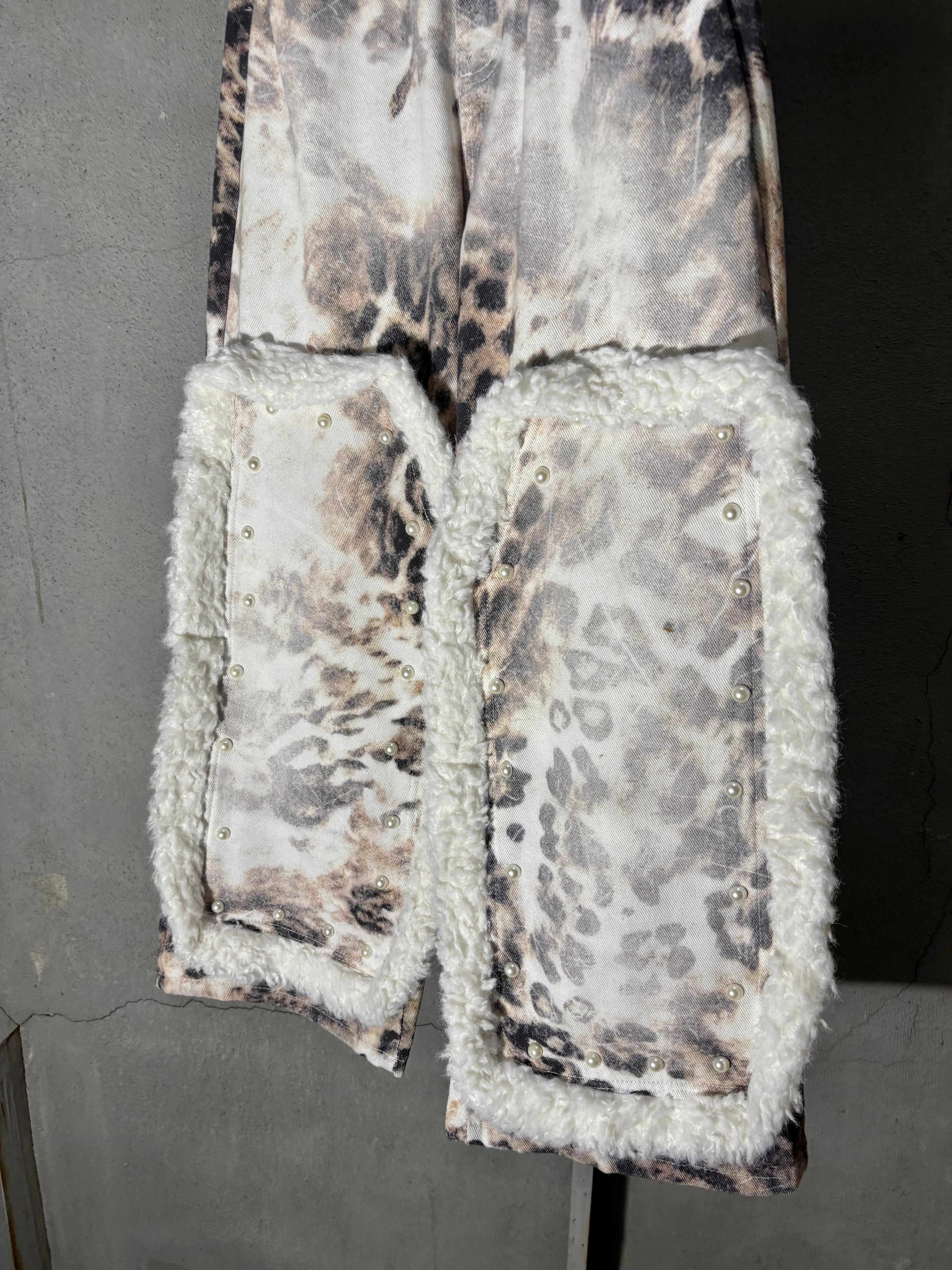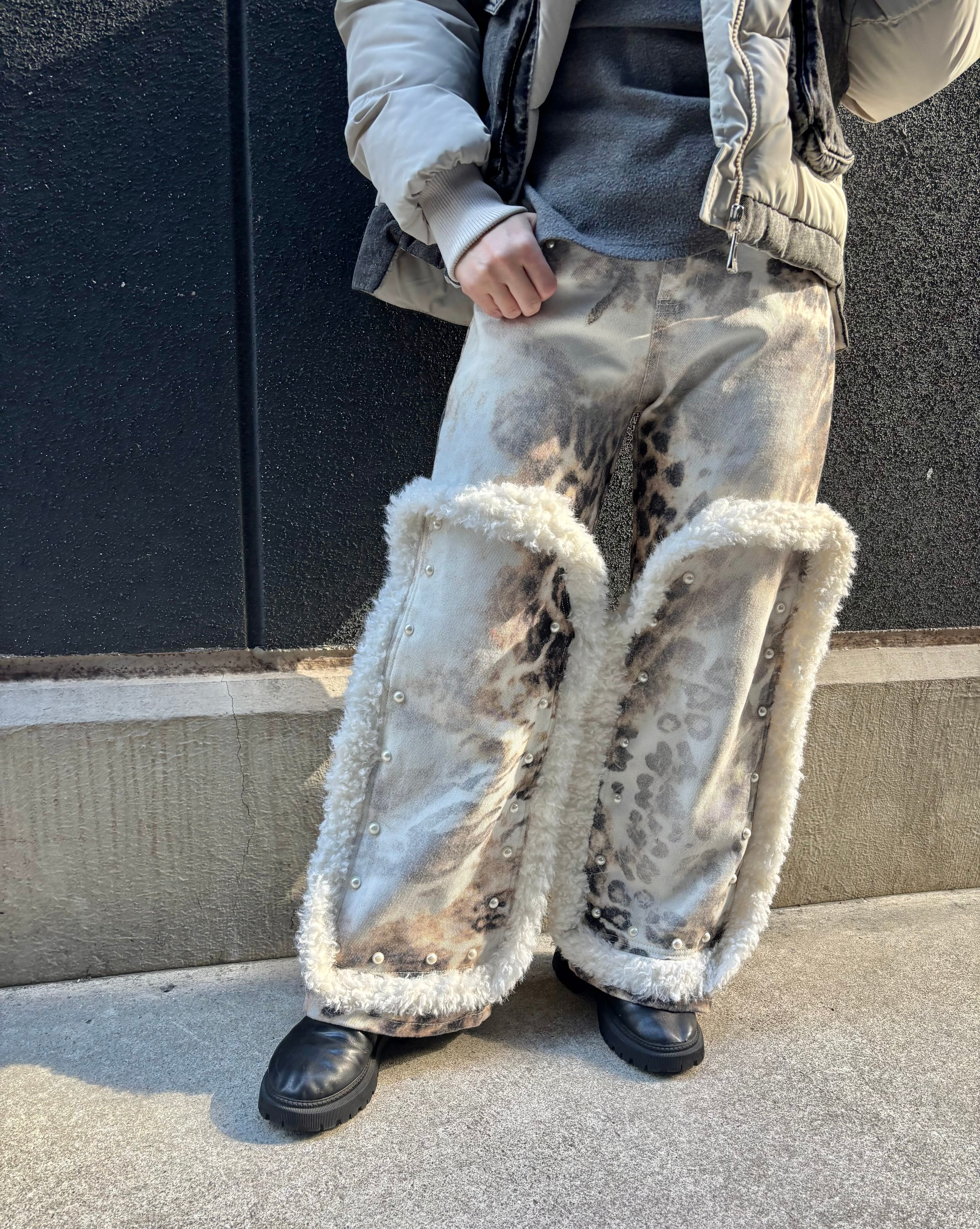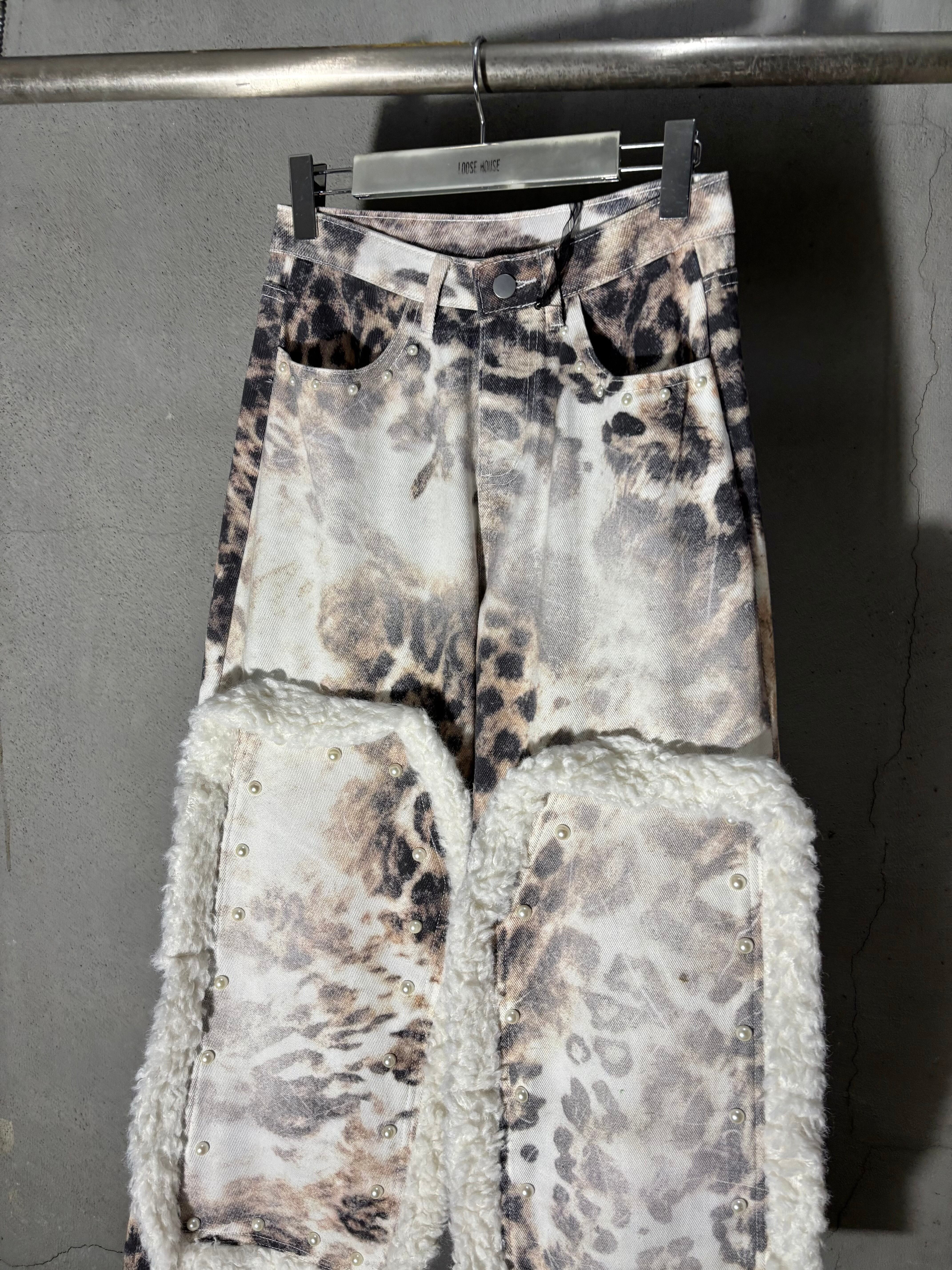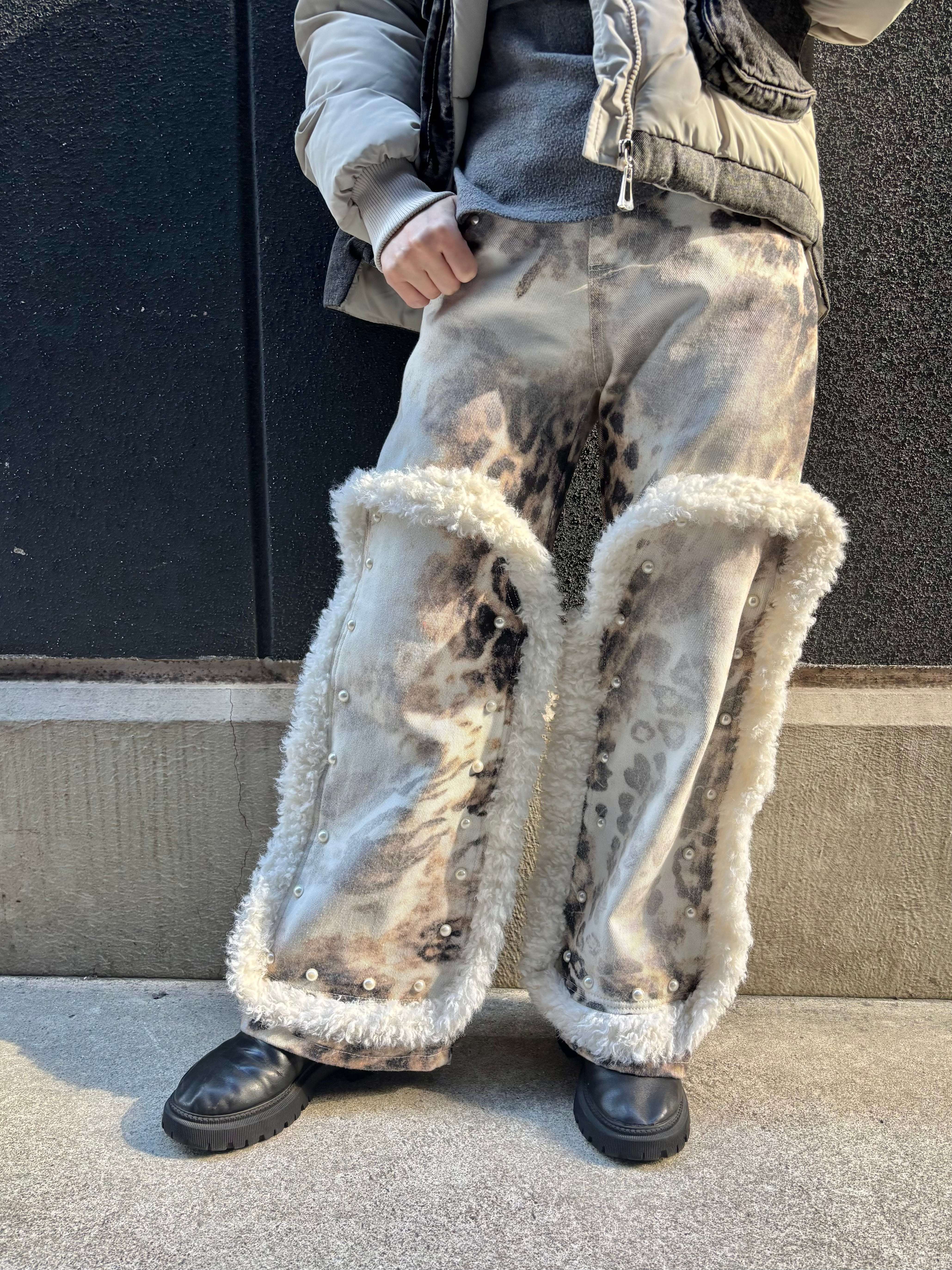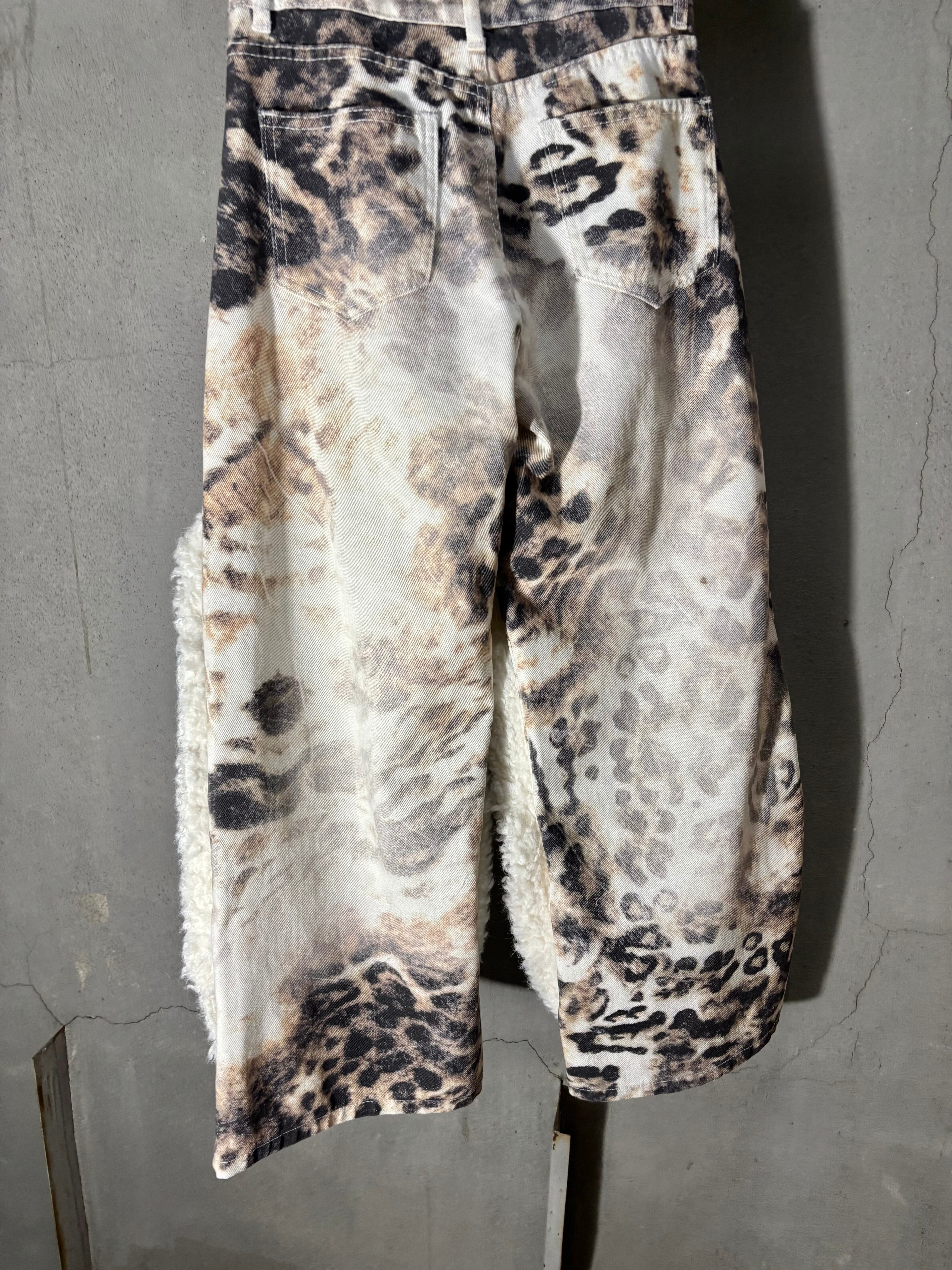 leopard print × eco fur × pearl design denim pants パンツ デニム レオパード 豹柄 エコファー パール
