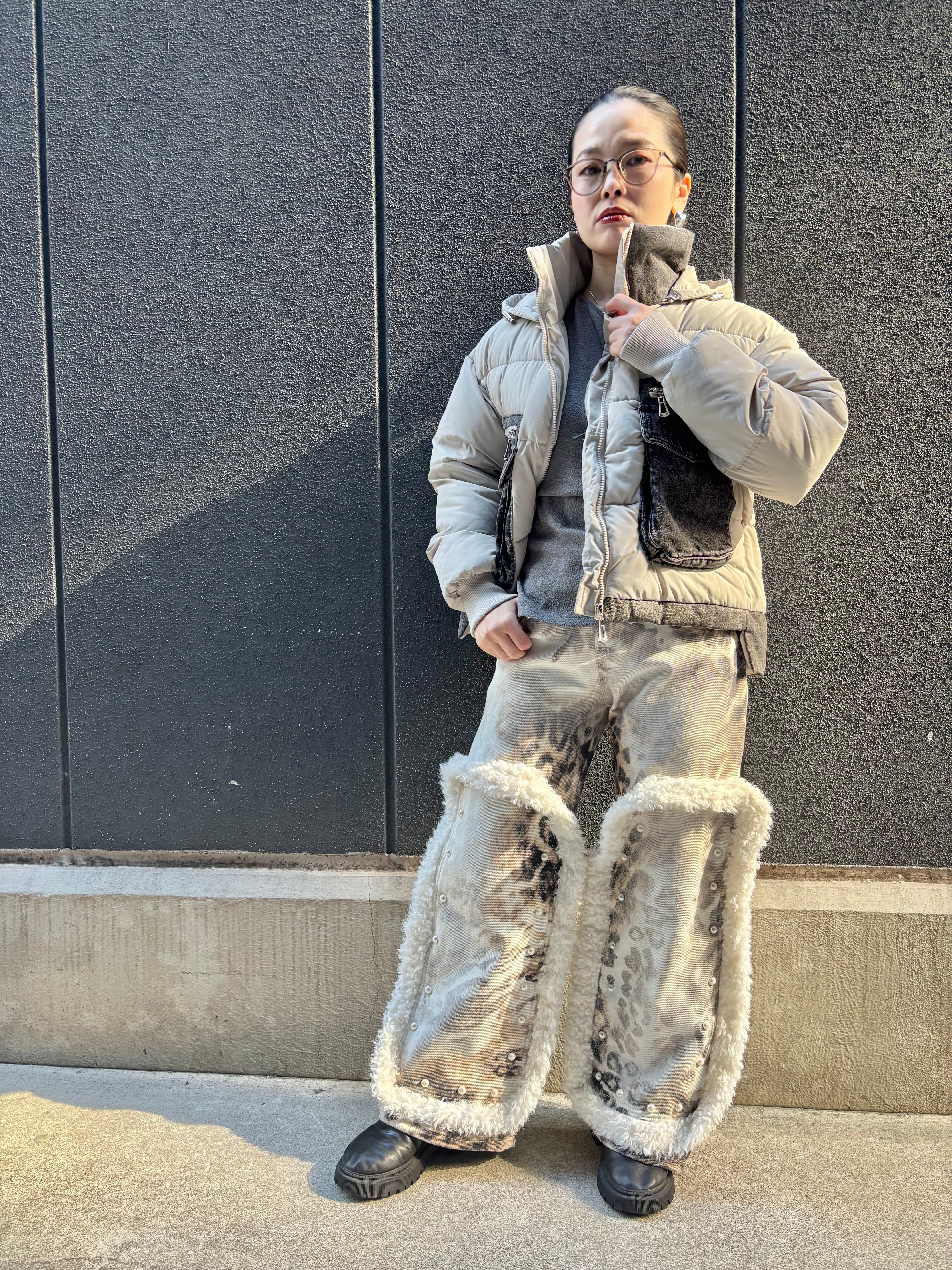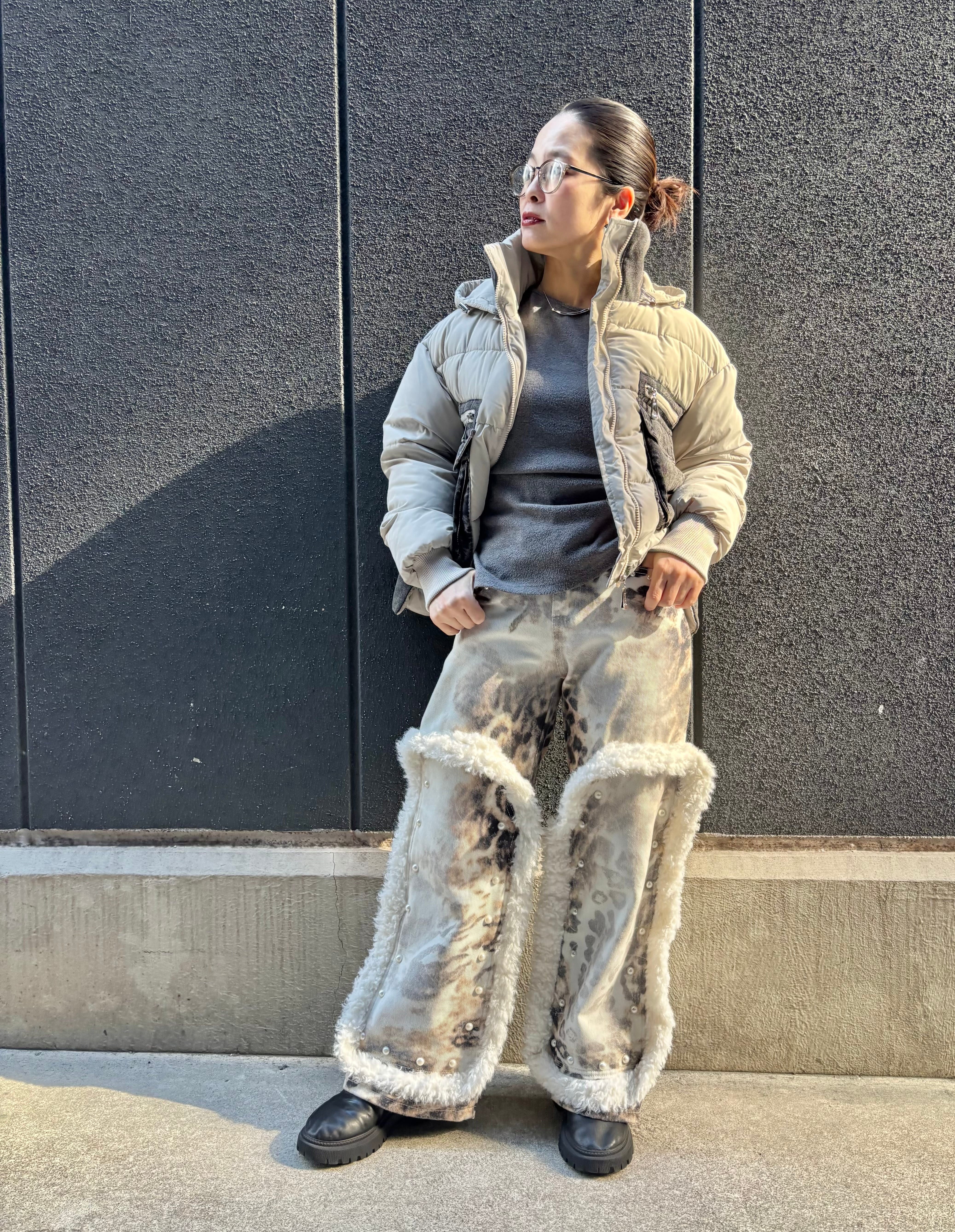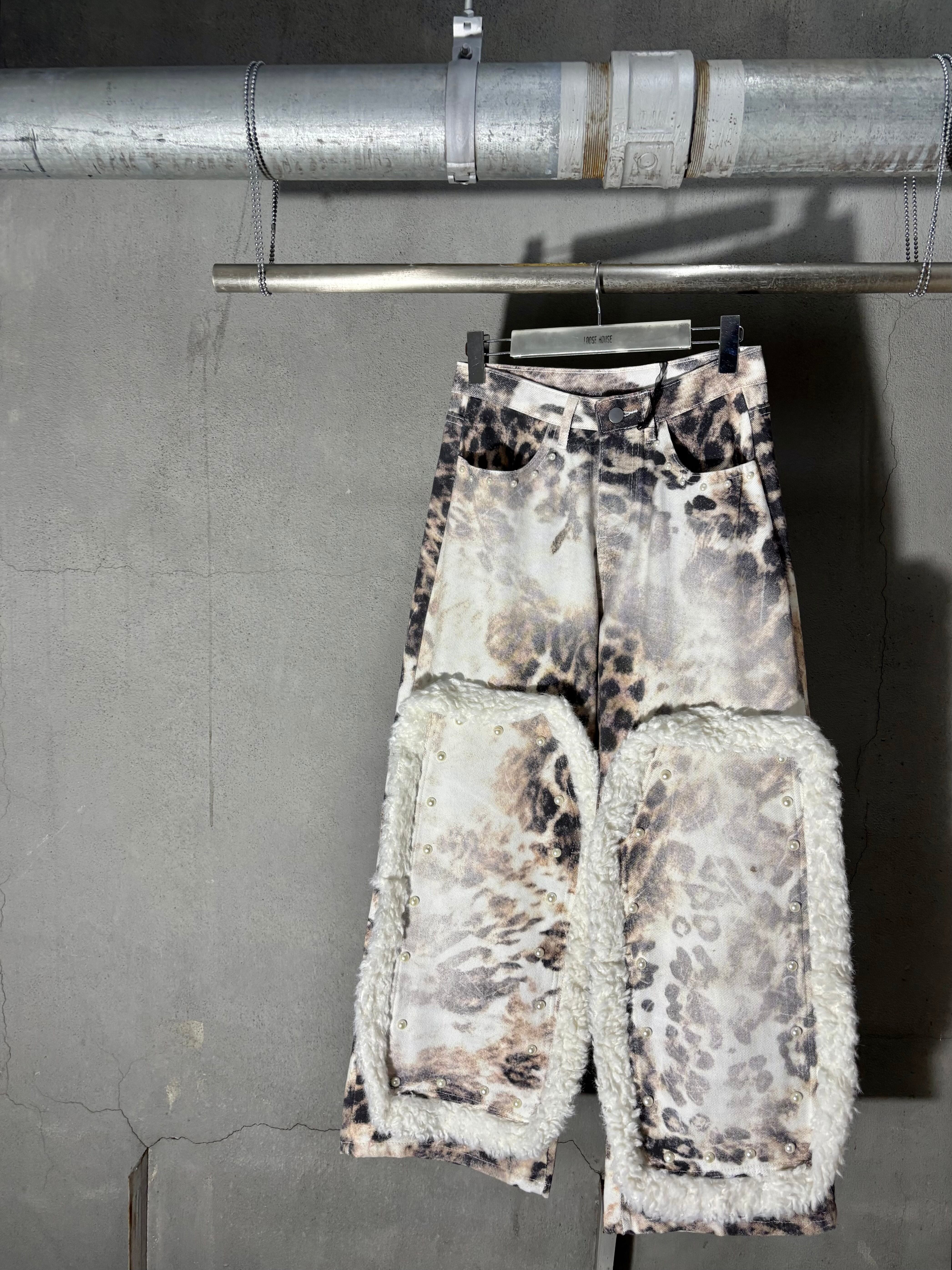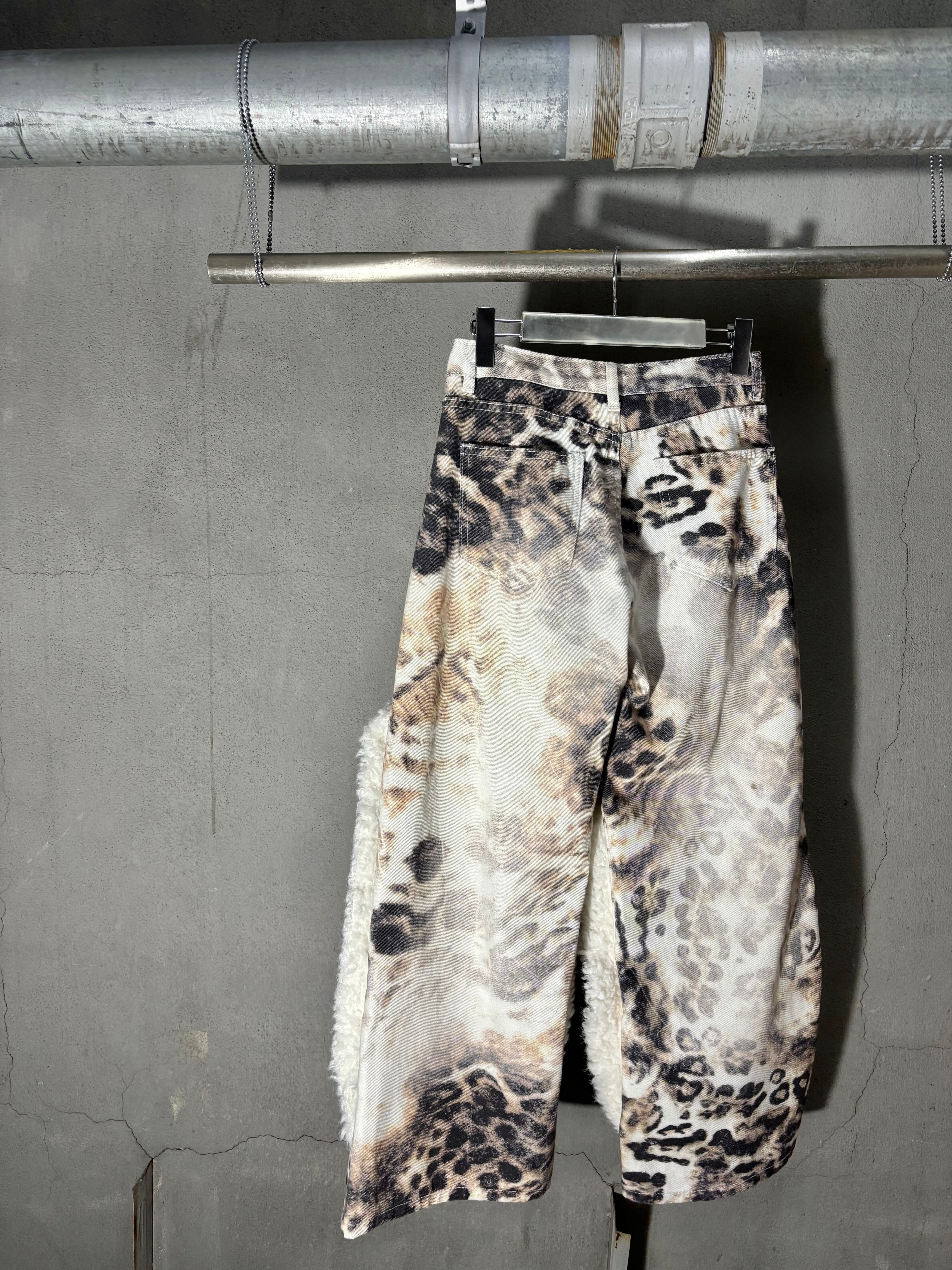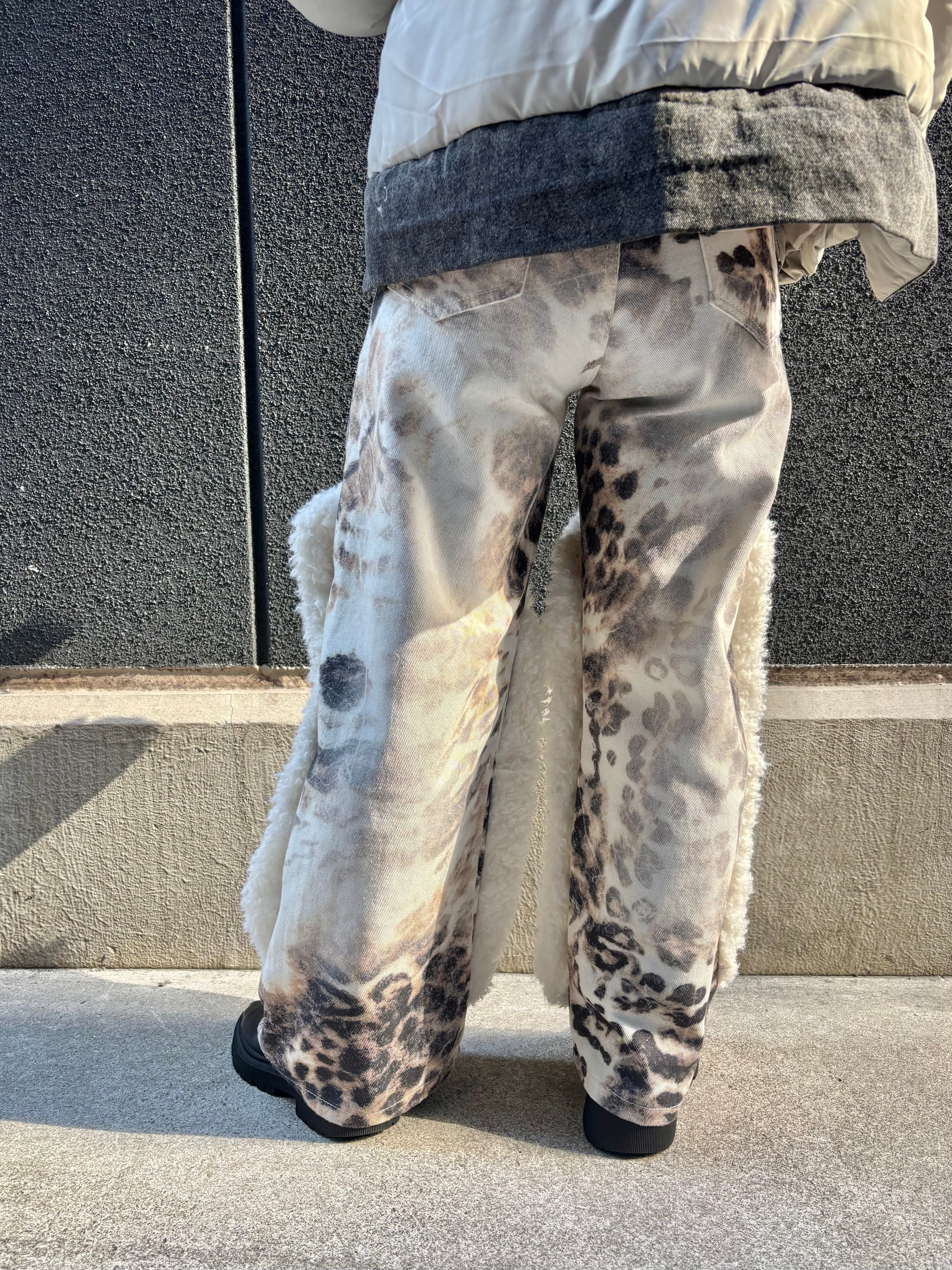 leopard print × eco fur × pearl design denim pants パンツ デニム レオパード 豹柄 エコファー パール
