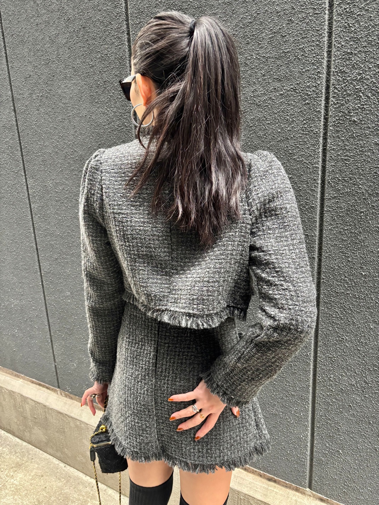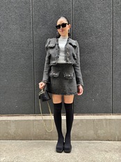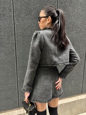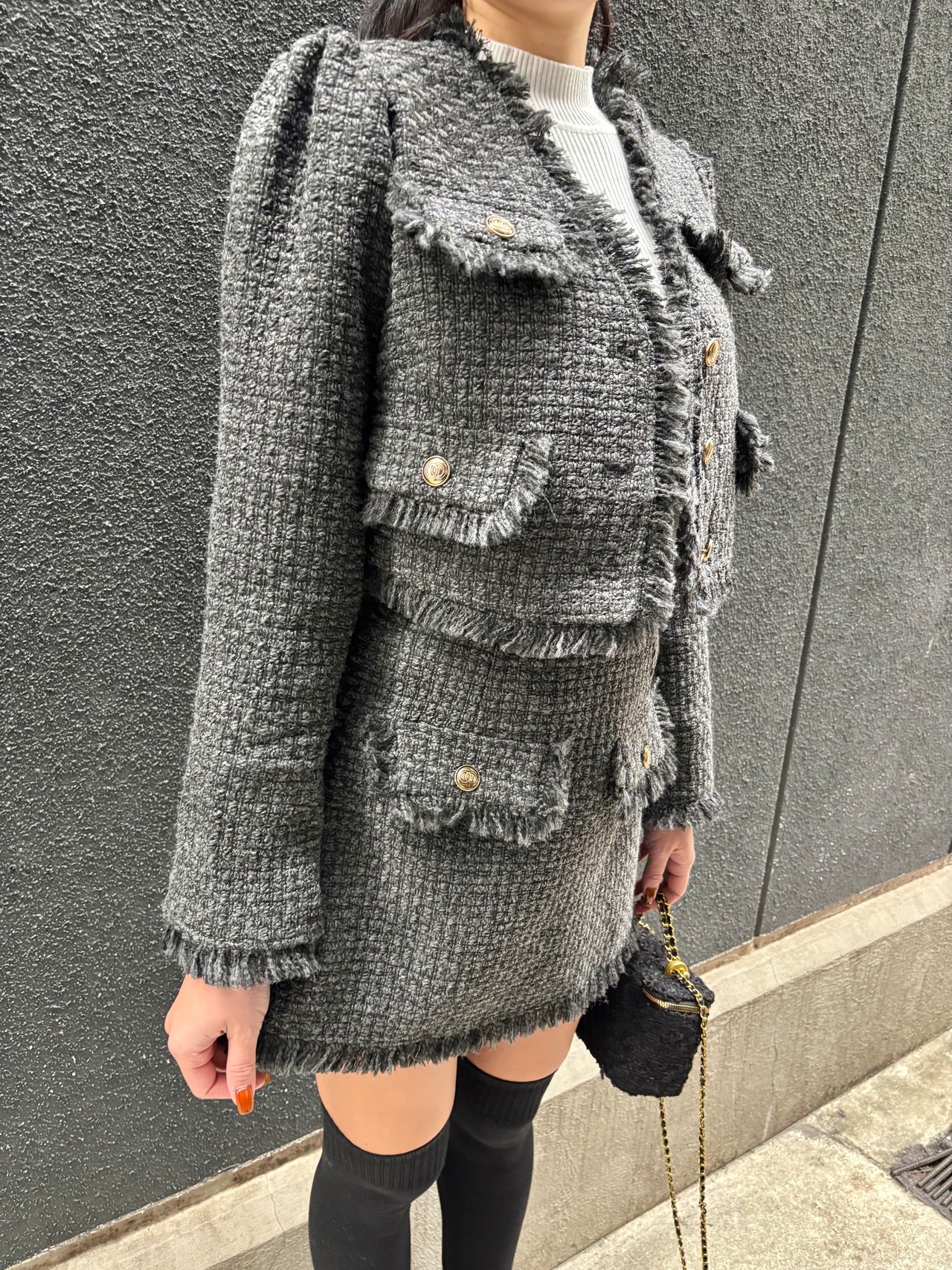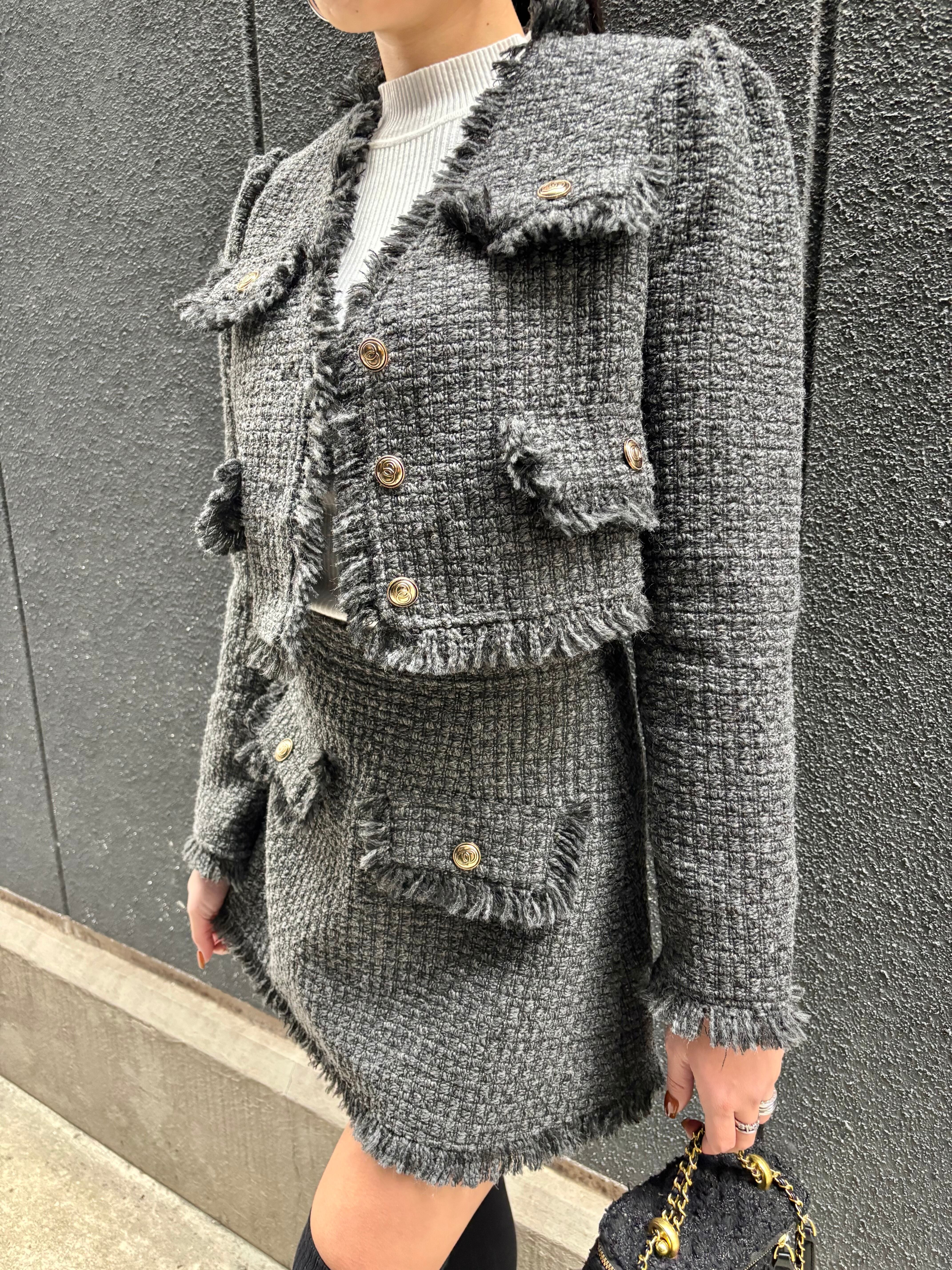 全体を華やかに演出するツィード素材のジャケットとミニスカートのセット。