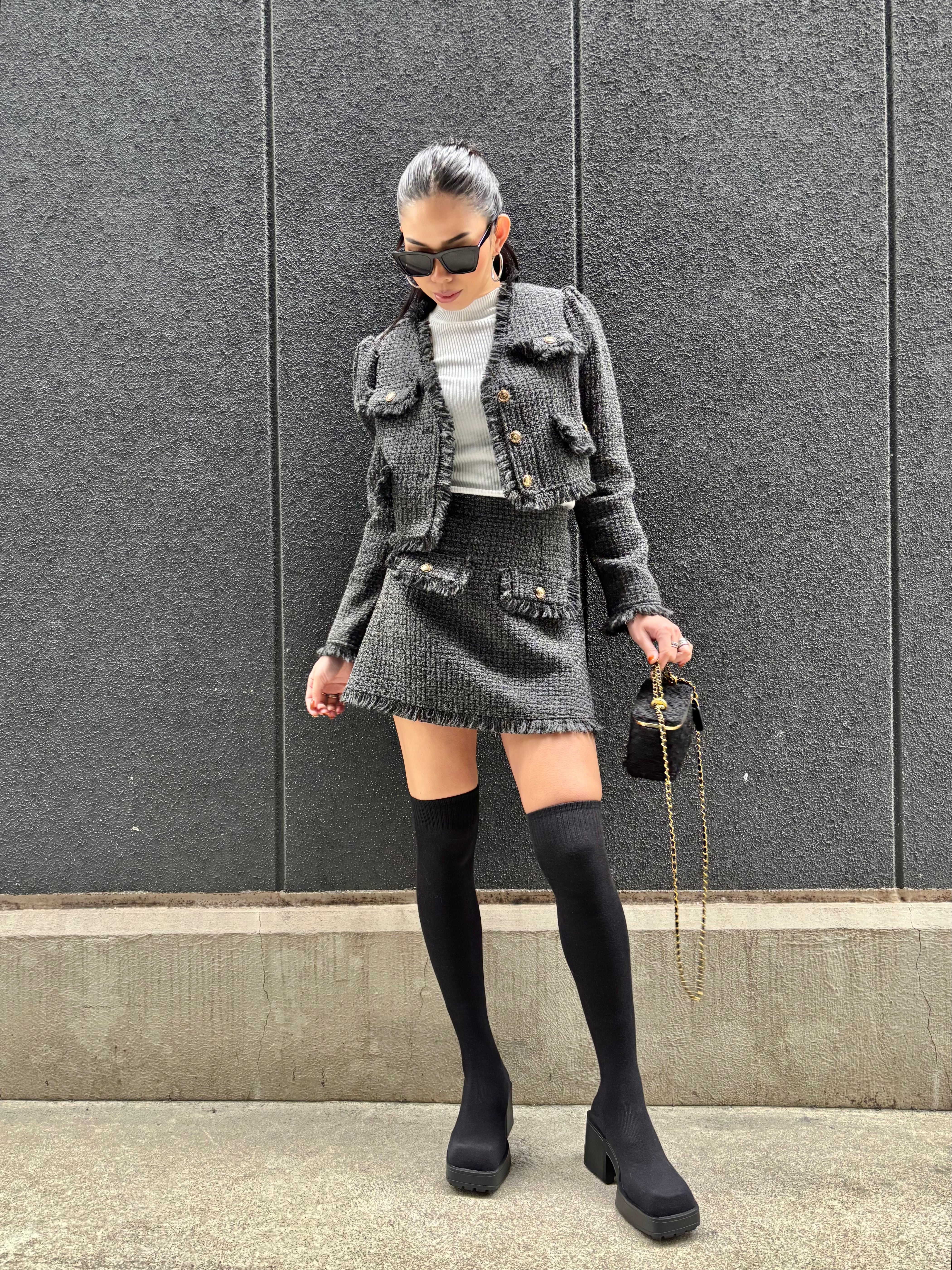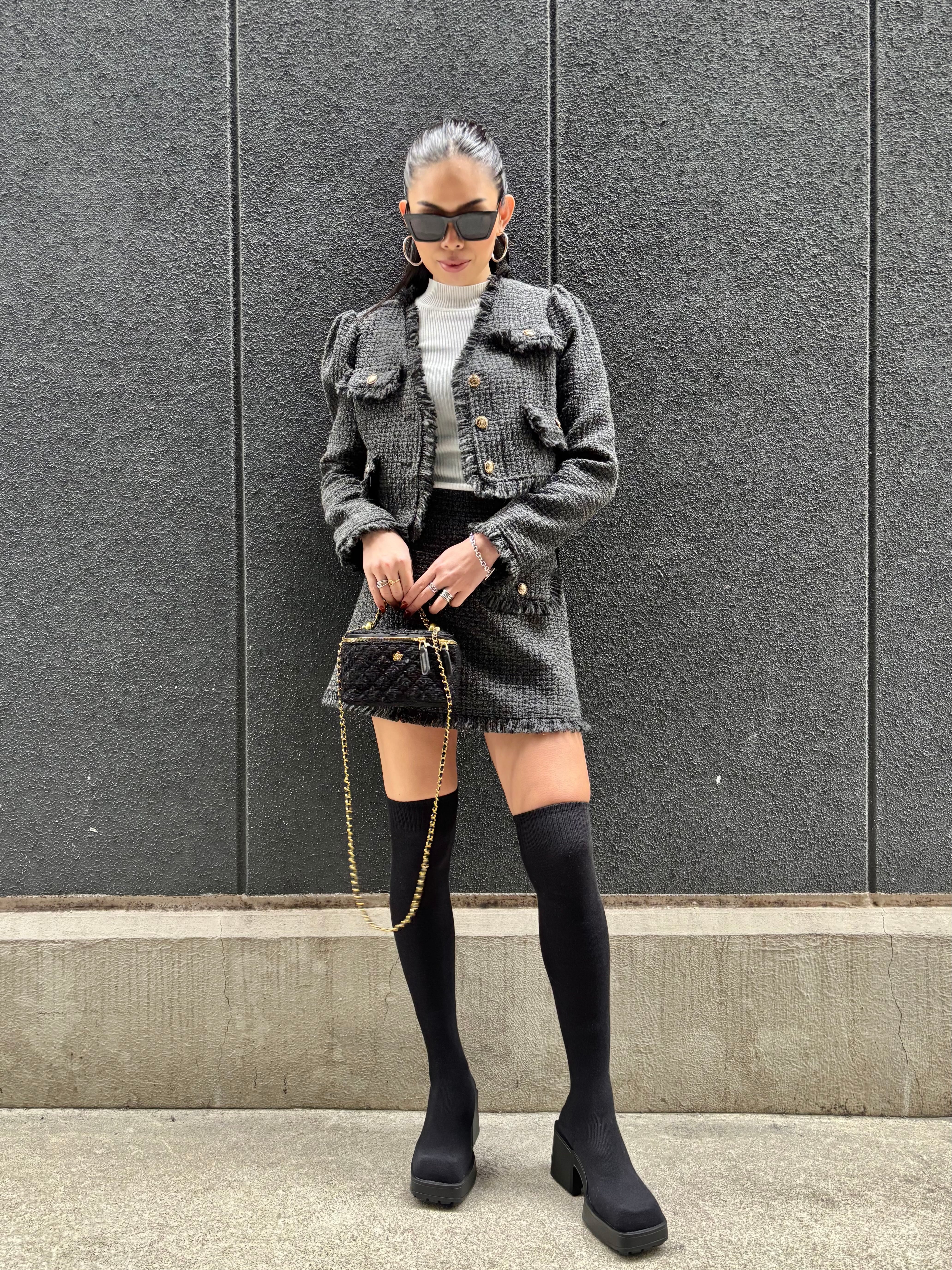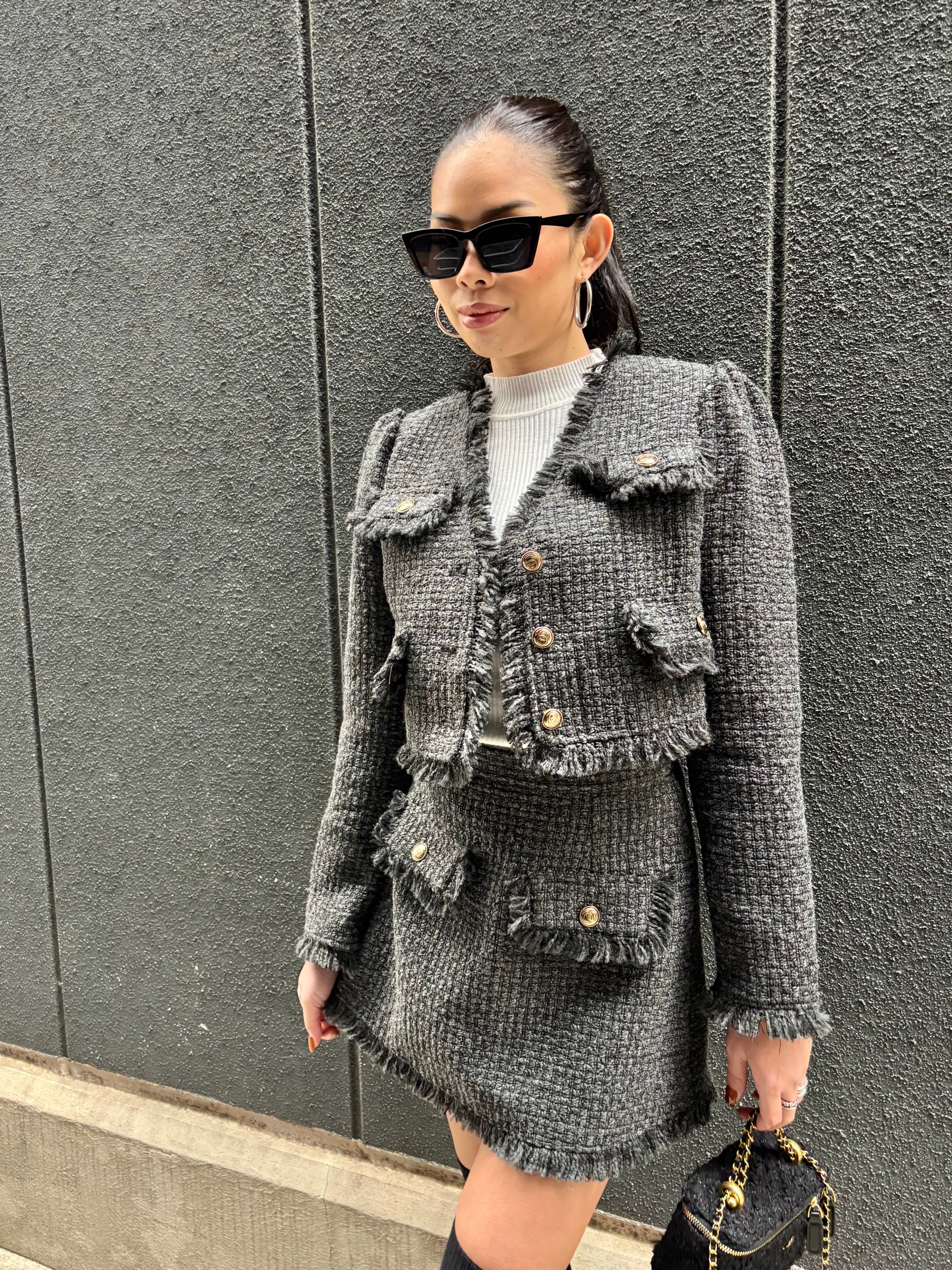 全体を華やかに演出するツィード素材のジャケットとミニスカートのセット。