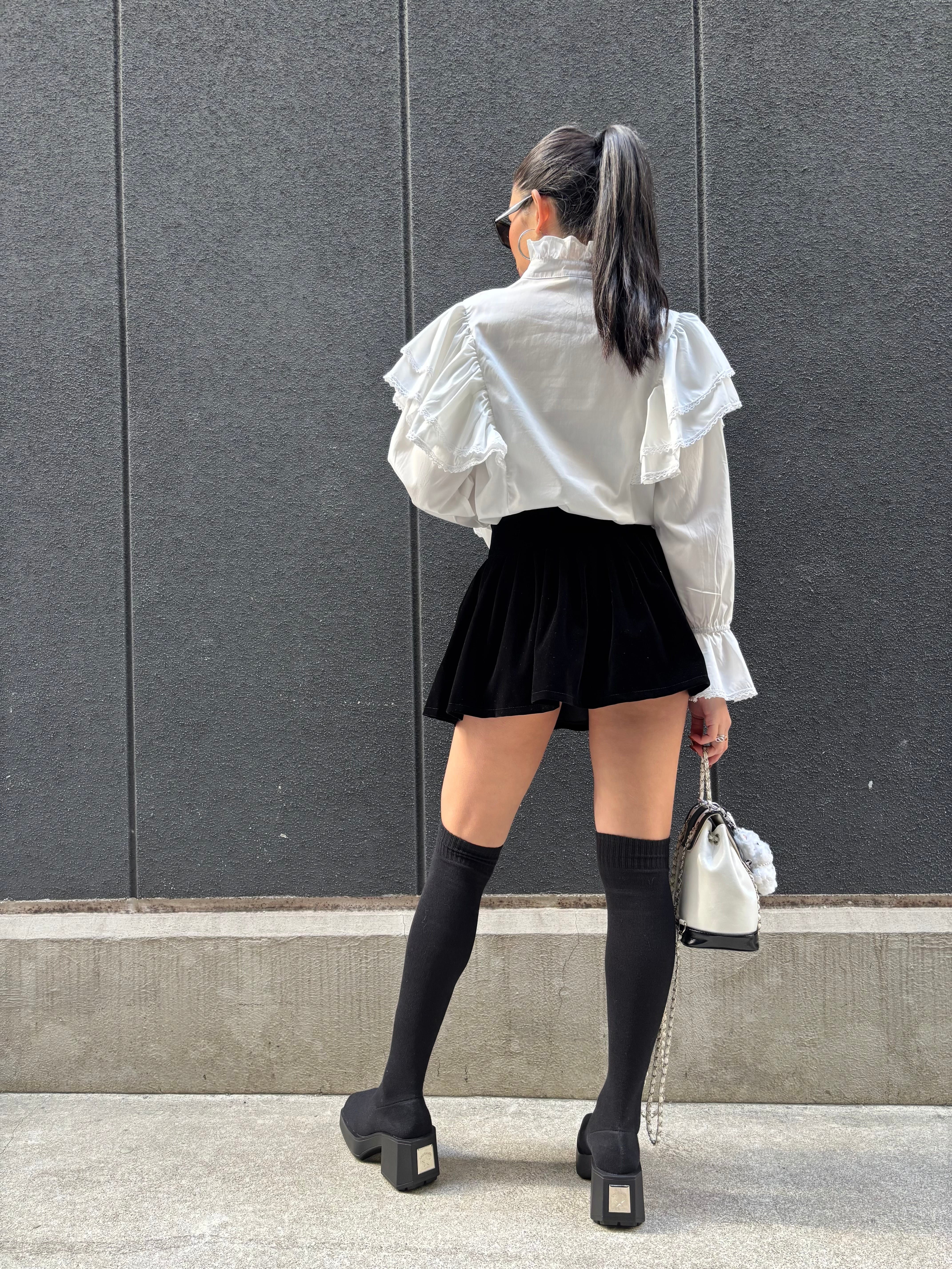 フリルの存在感がありながら、さりげないレースが全体を華やかに彩ります。