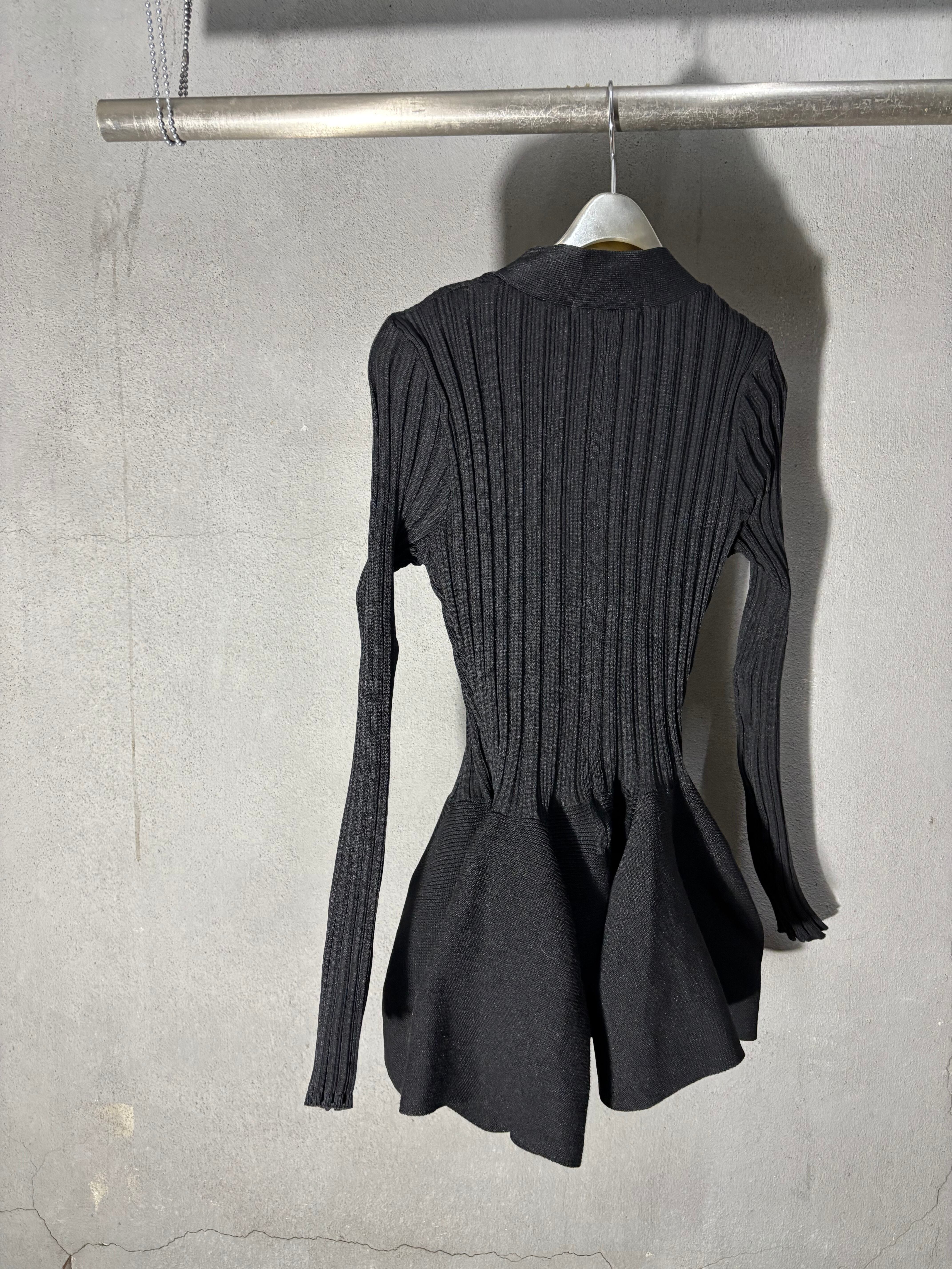 リブニット素材のデザインワンピースは、女性らしさを引き立てるフレアーシルエットが特徴です。