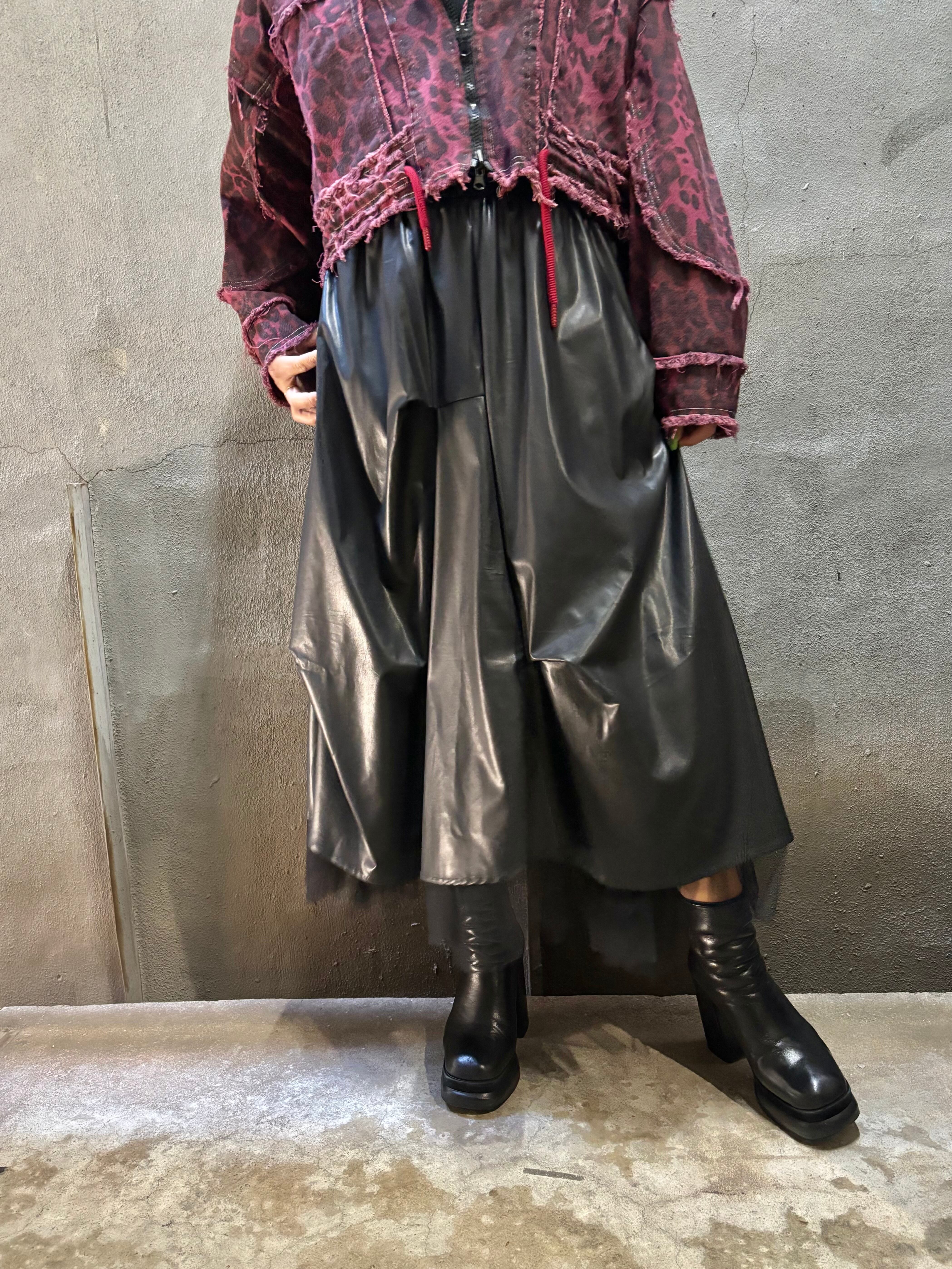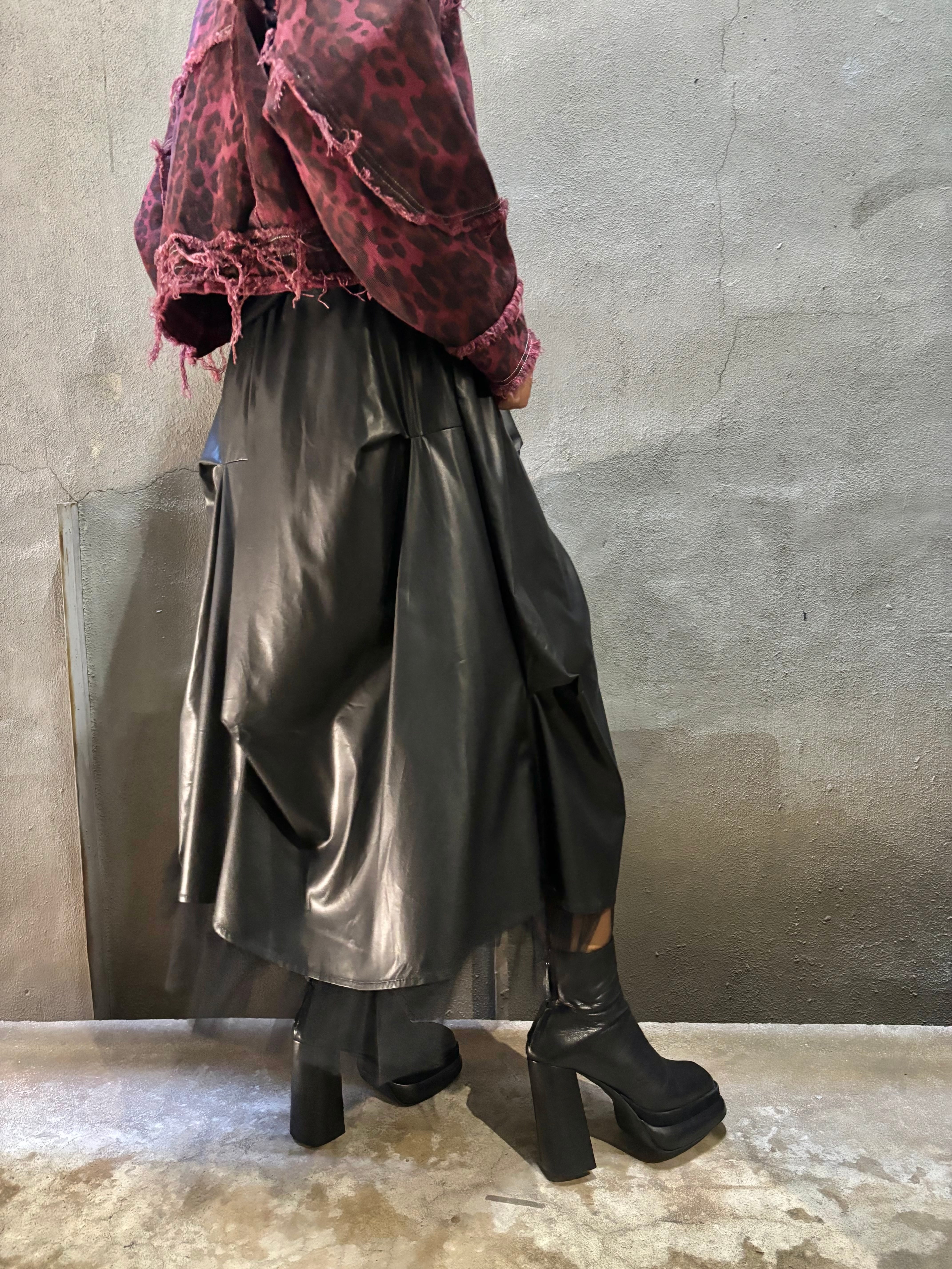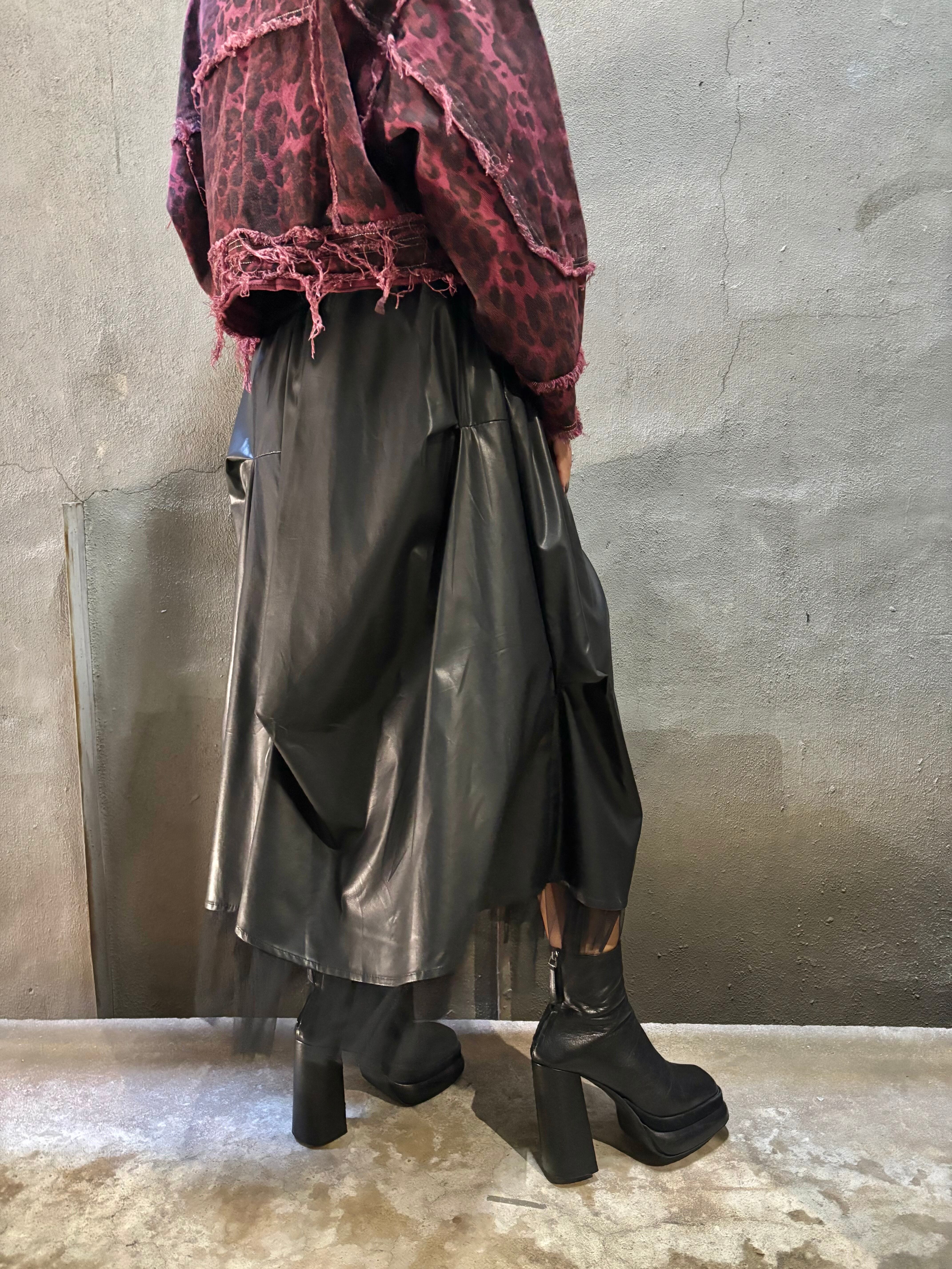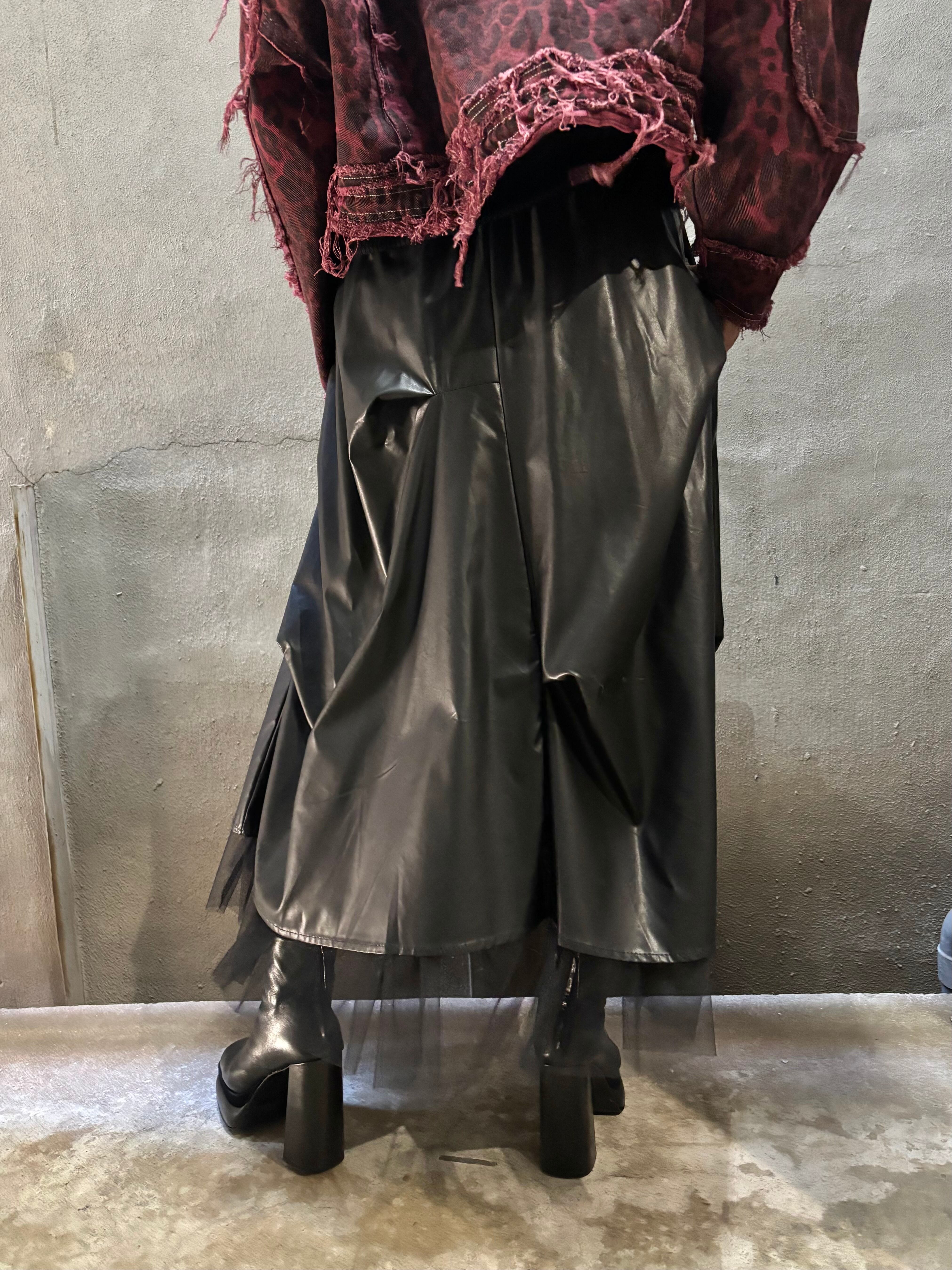 eco leather × tulle mix design black skirt スカート エコレザー チュール ゴムウエスト ブラック 黒