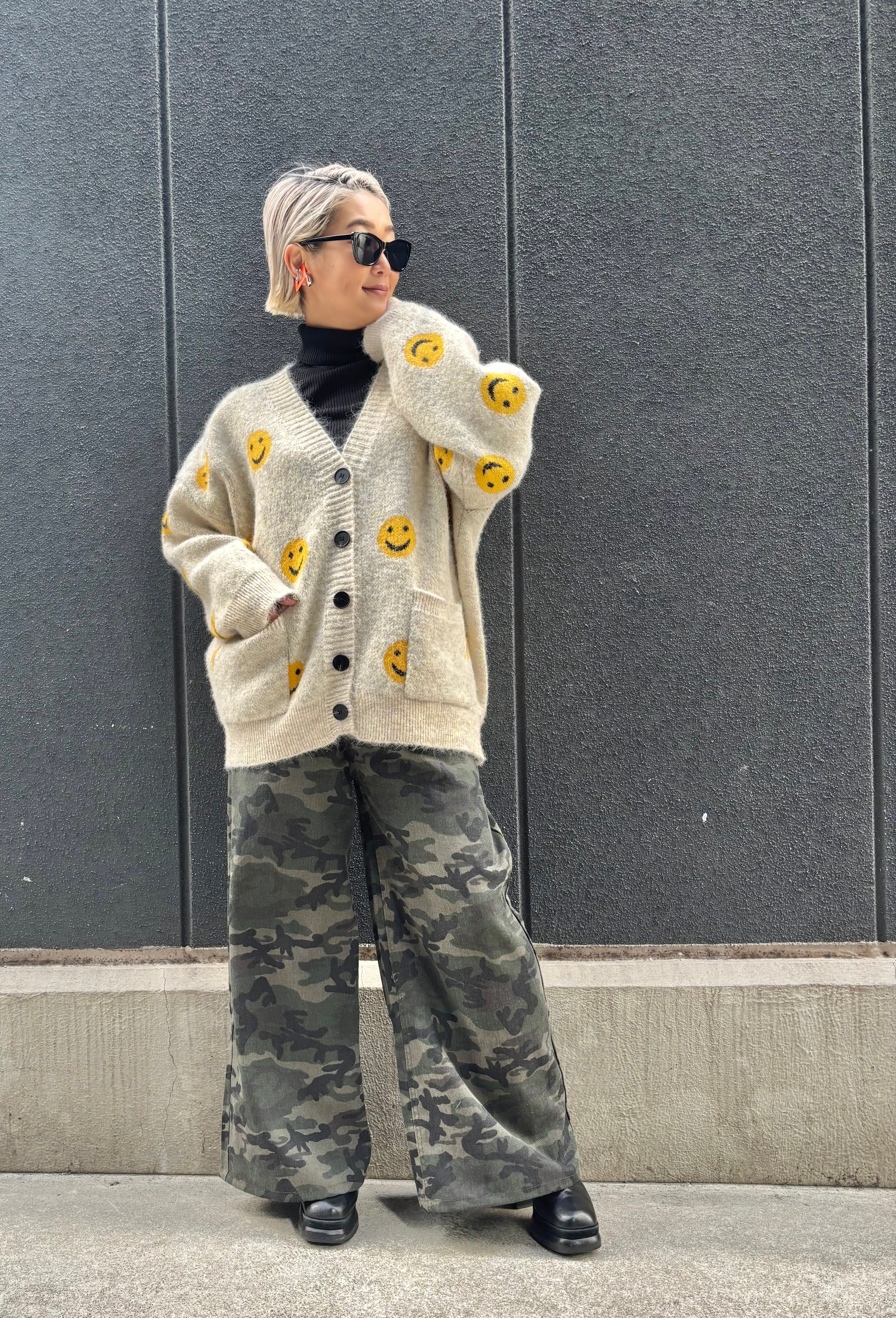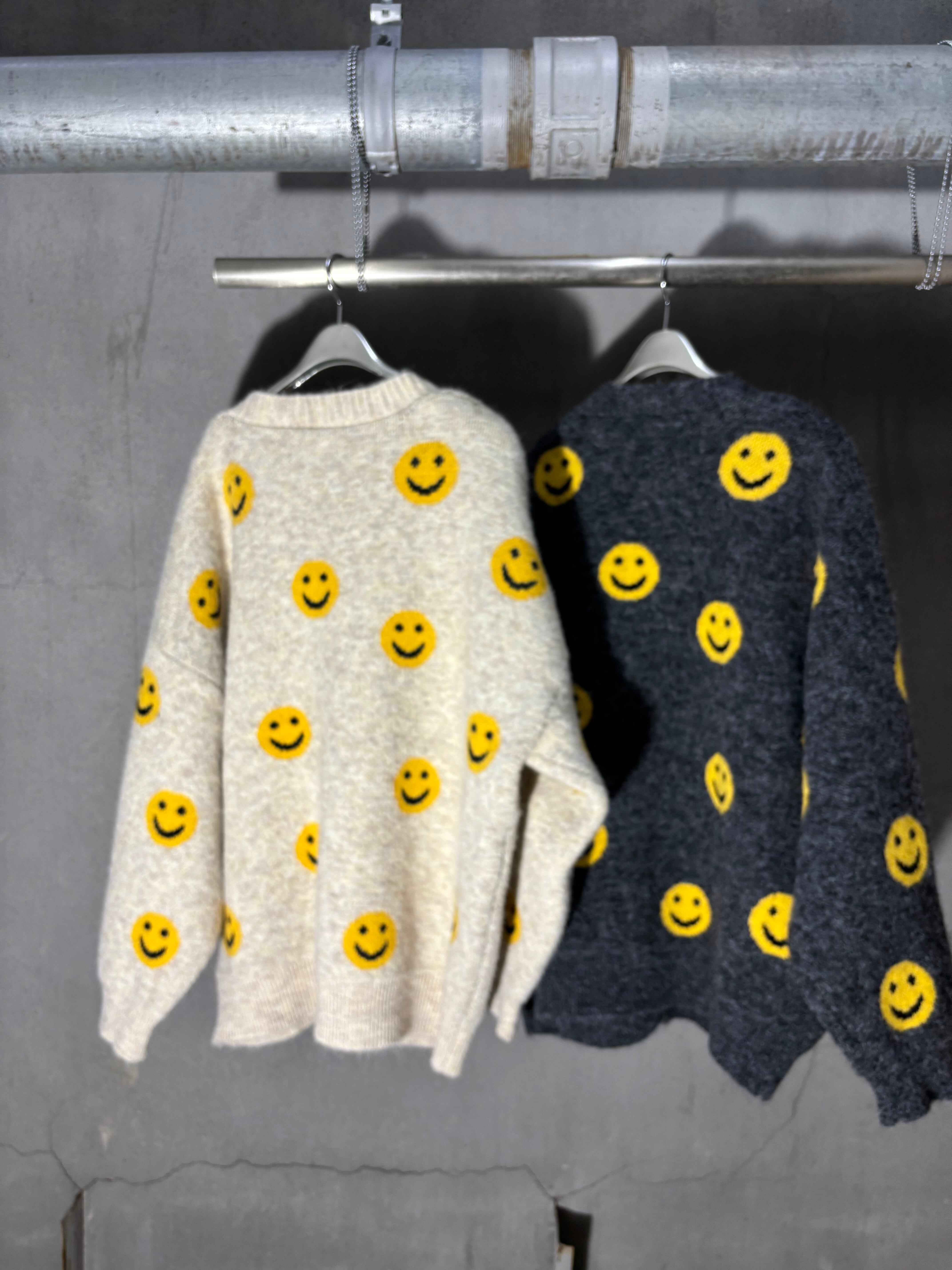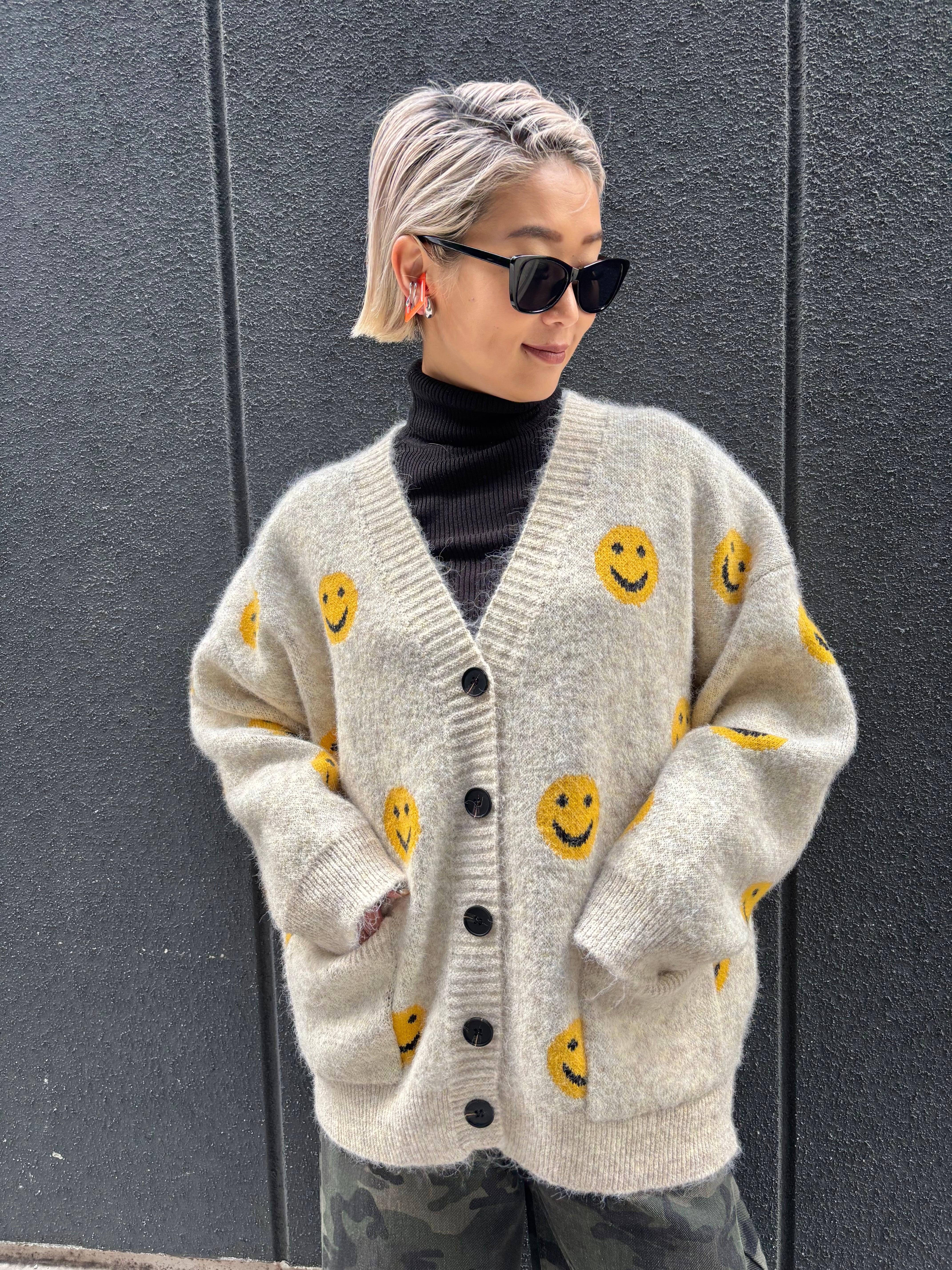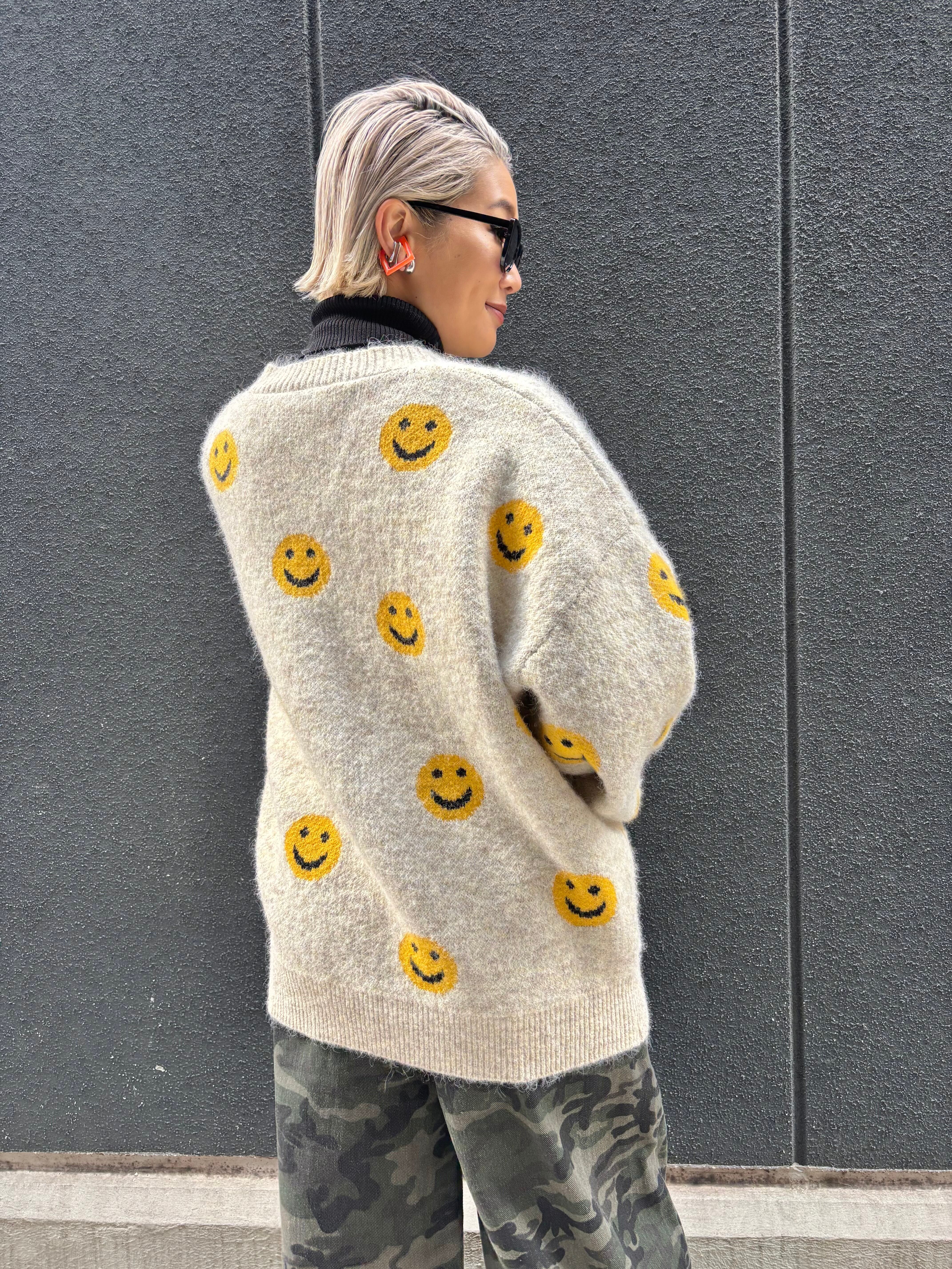 smiley jacquard knit V-neck cardigan ニット カーディガン ジャガード スマイリー ニコちゃん Vネック ポケット