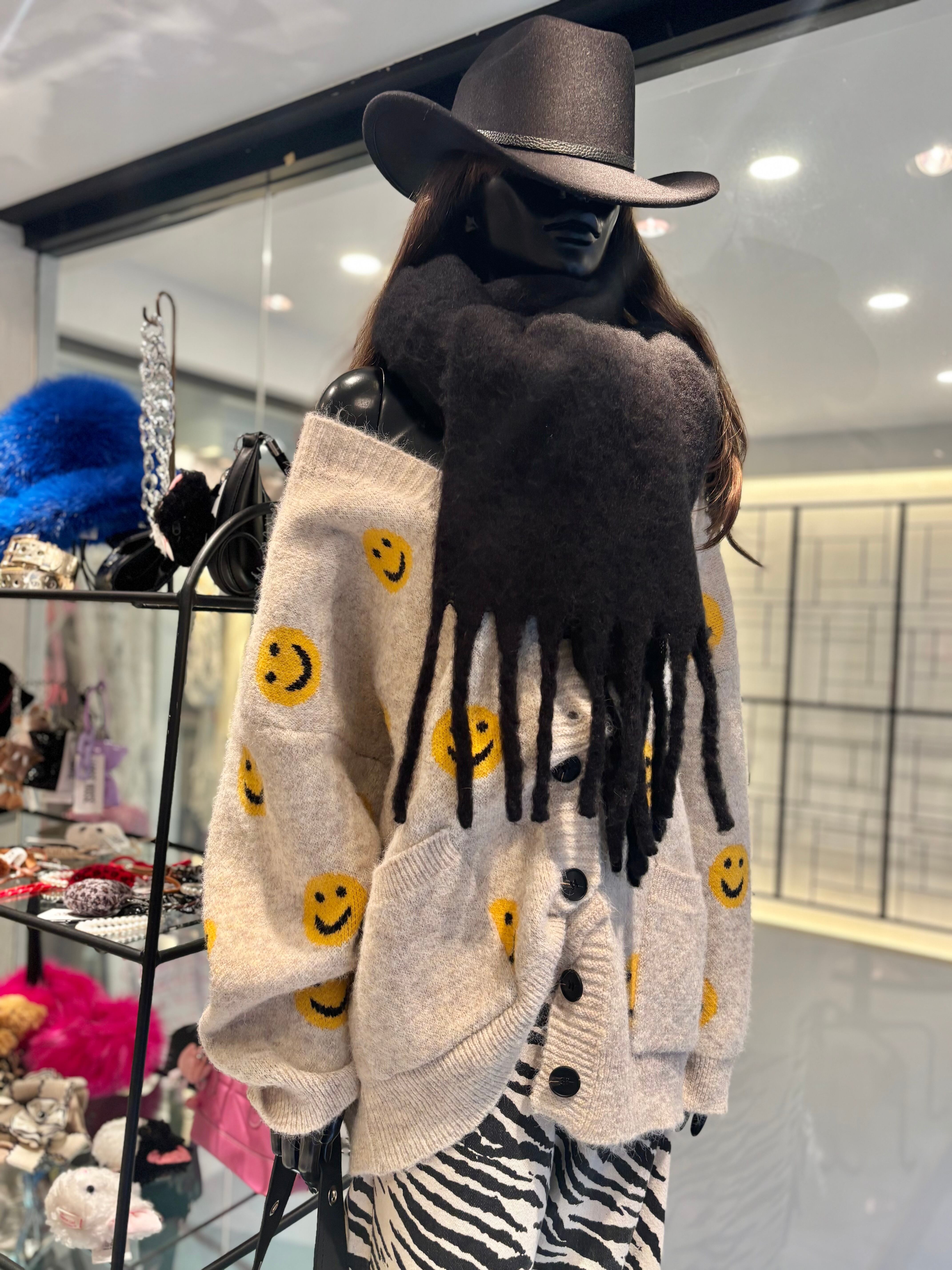 ジャガード編みのスマイリーモチーフが、見る人の心をほっこりさせます。