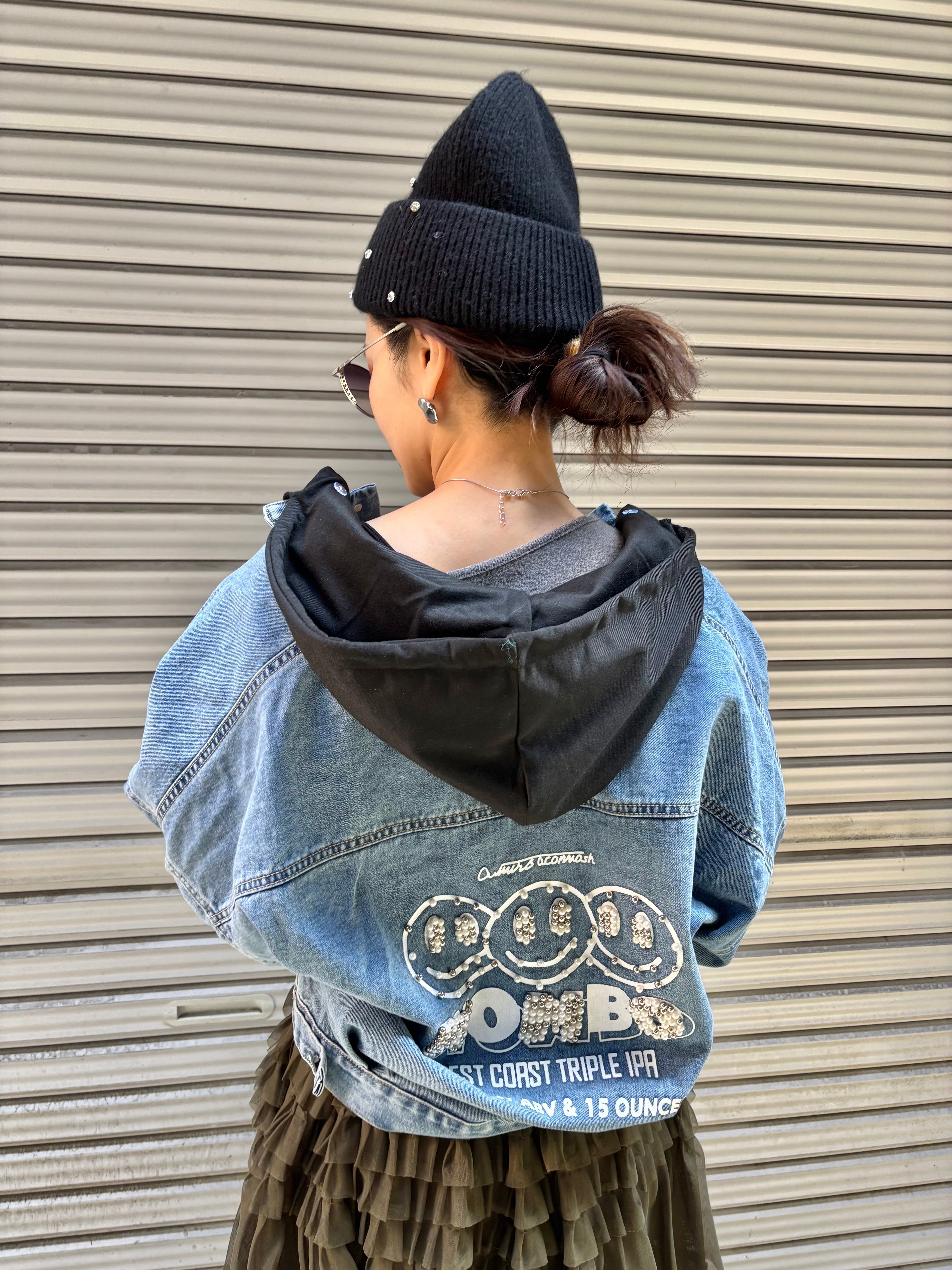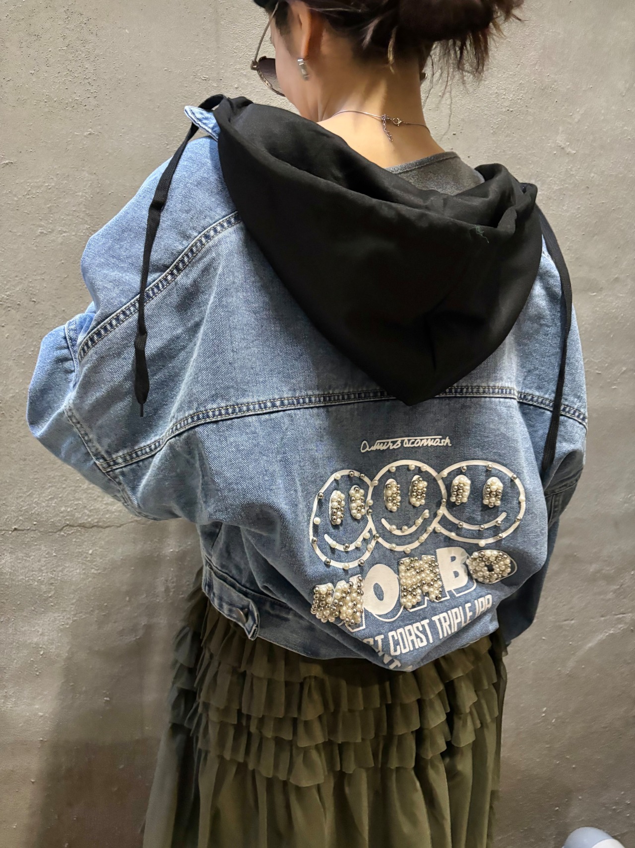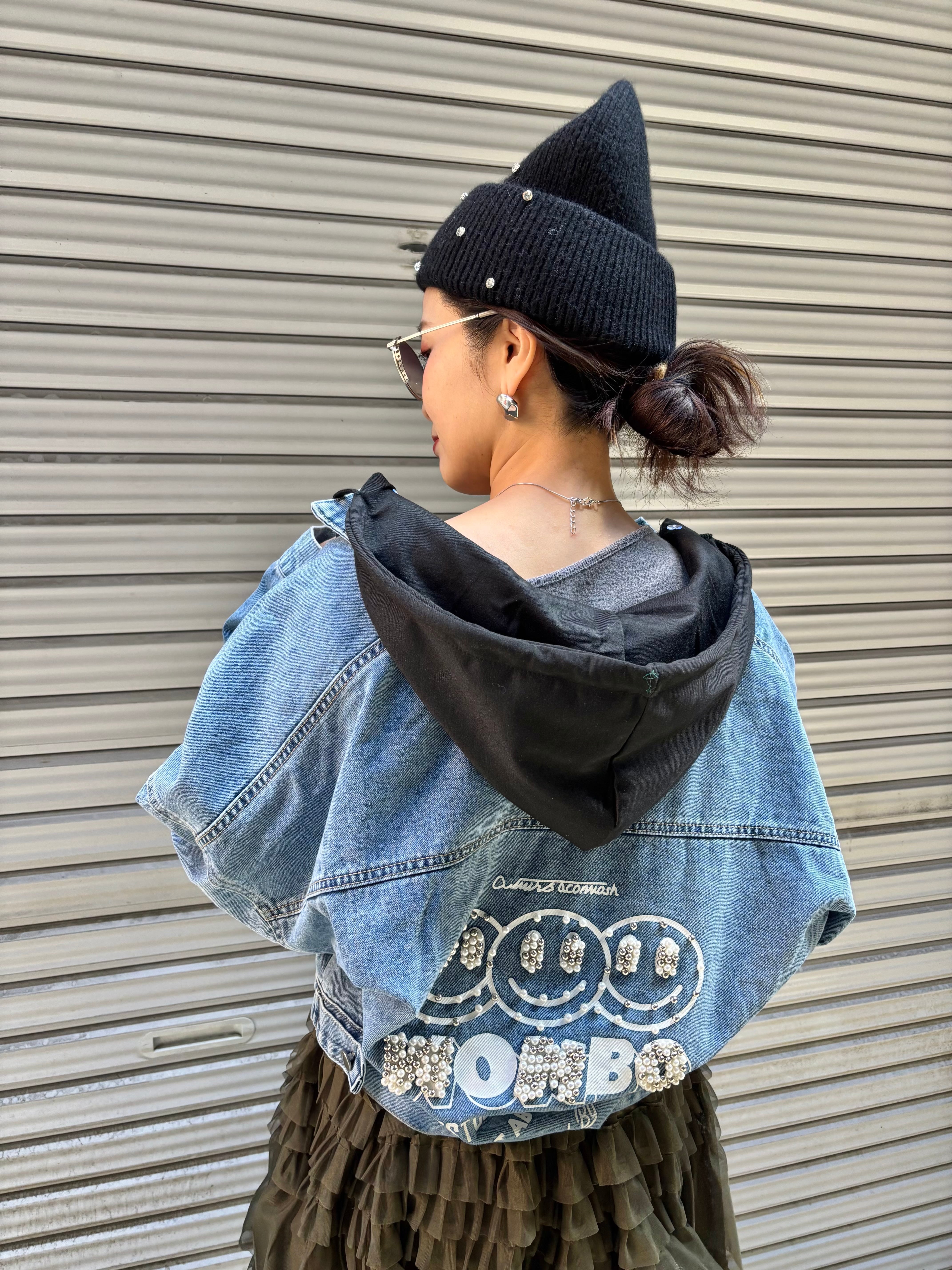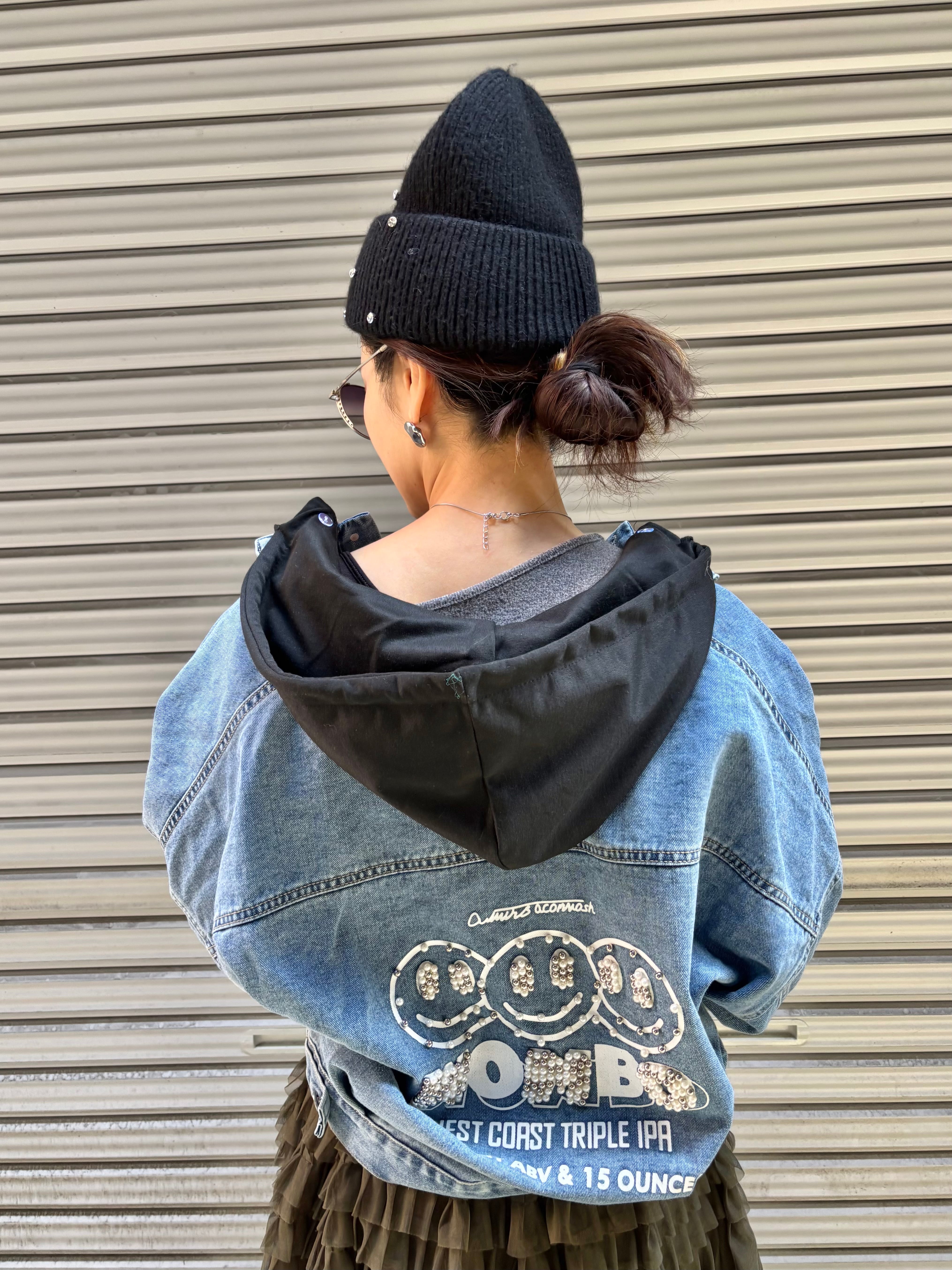 デニムジャケットに取り外し可能なフードを合わせた、カジュアルながらもおしゃれな一着です。デザインのポイントは、かわいらしいにこちゃんとビジューデザイン !!