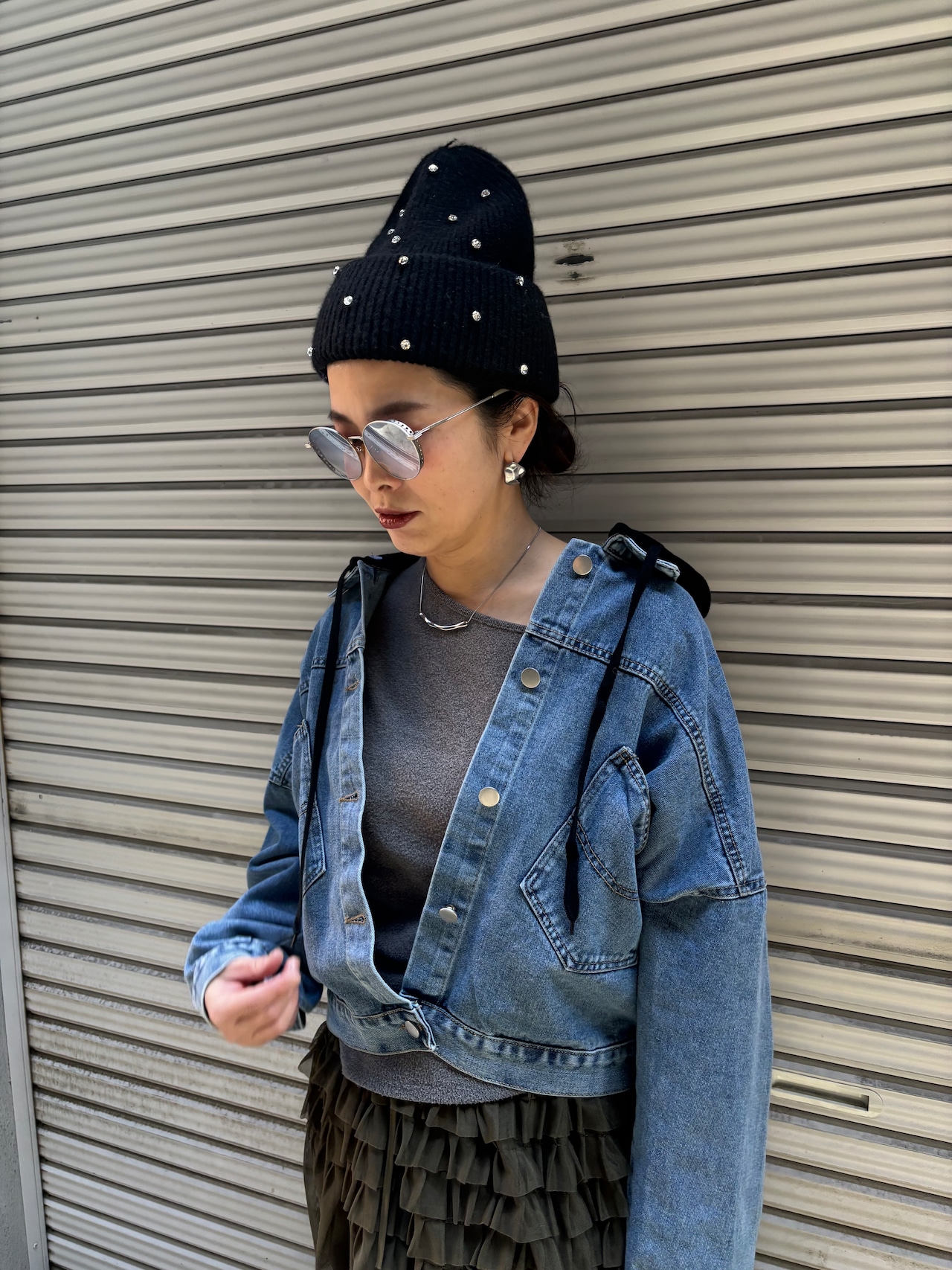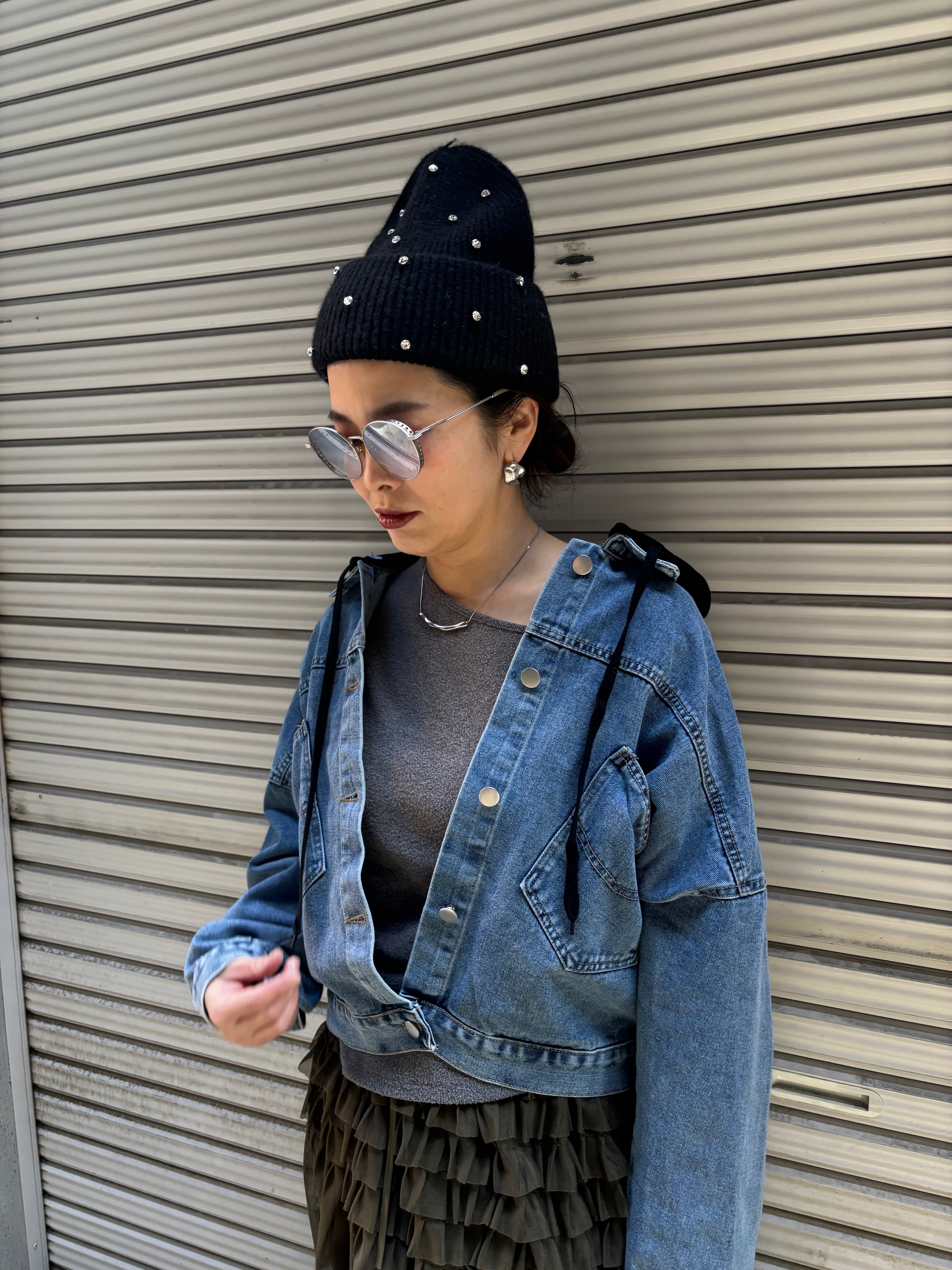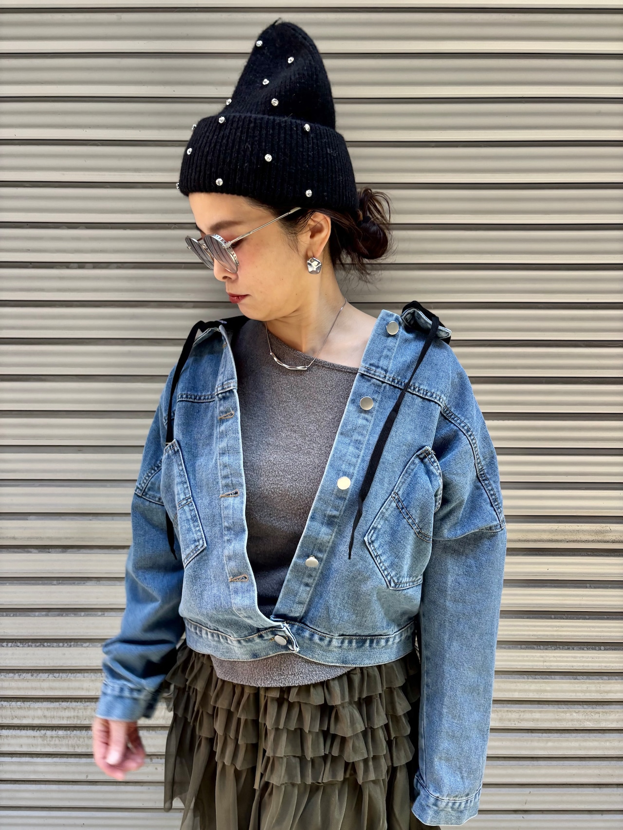 デニムジャケットに取り外し可能なフードを合わせた、カジュアルながらもおしゃれな一着です。デザインのポイントは、かわいらしいにこちゃんとビジューデザイン !!