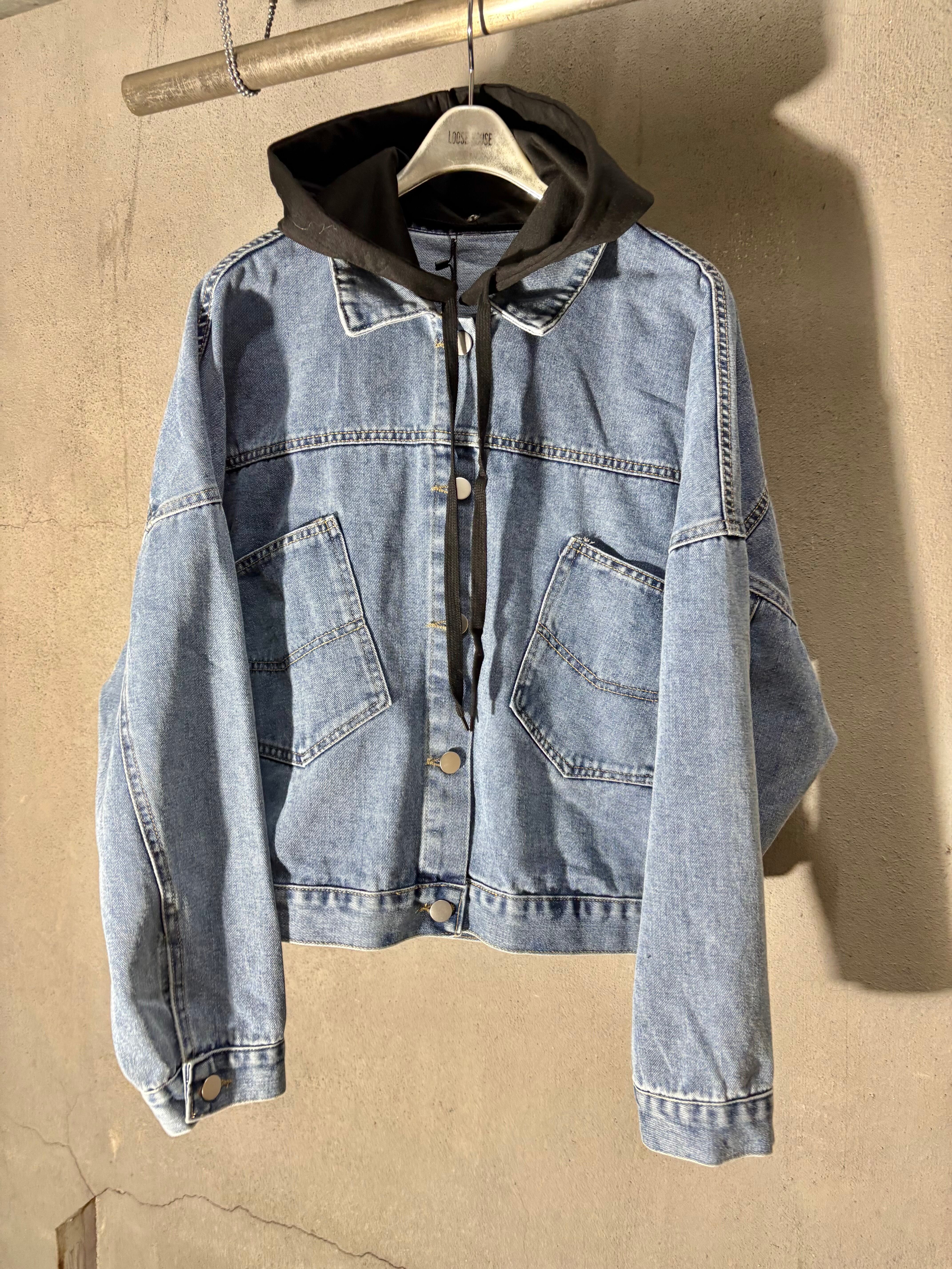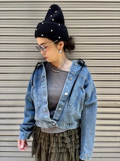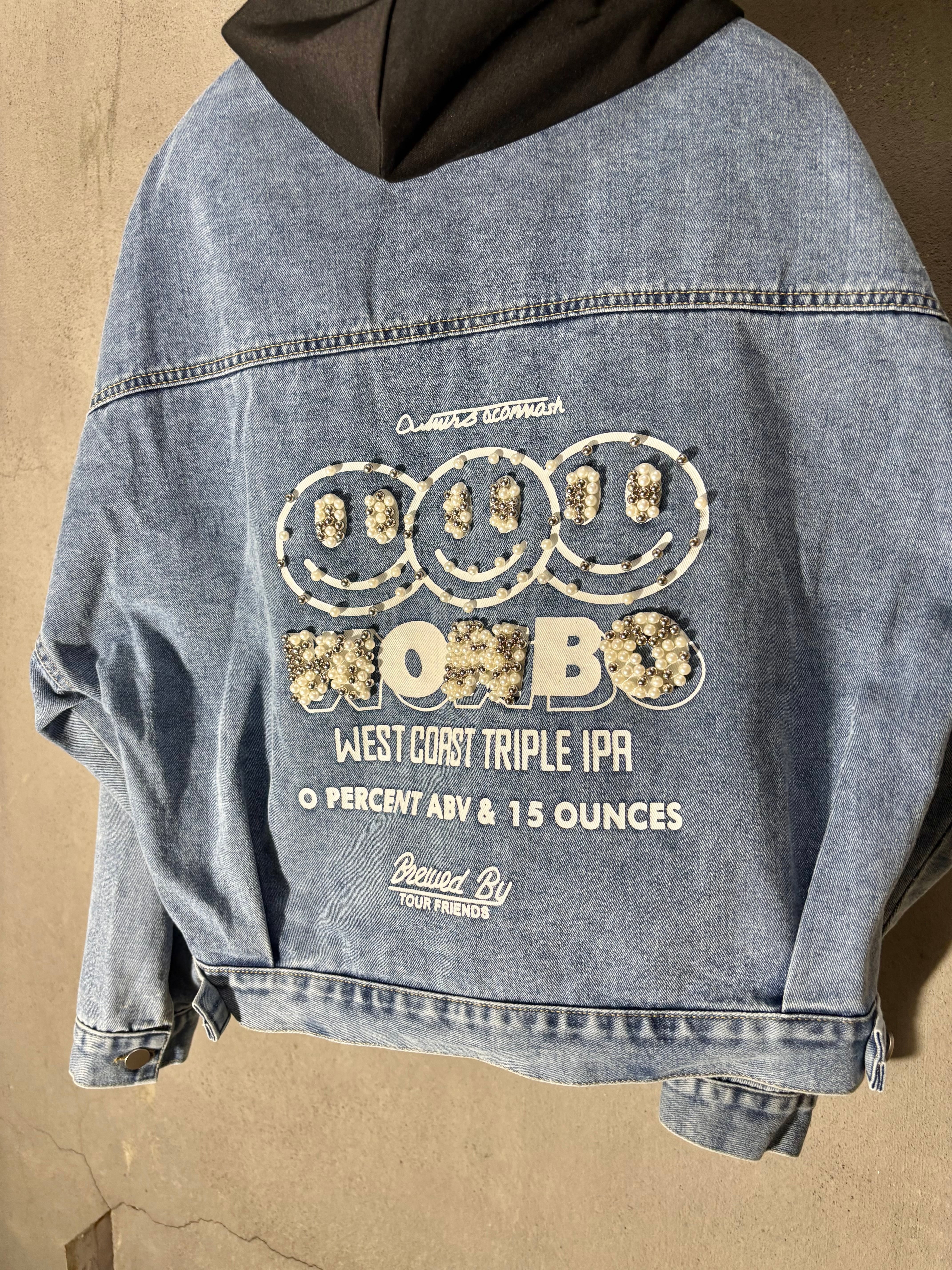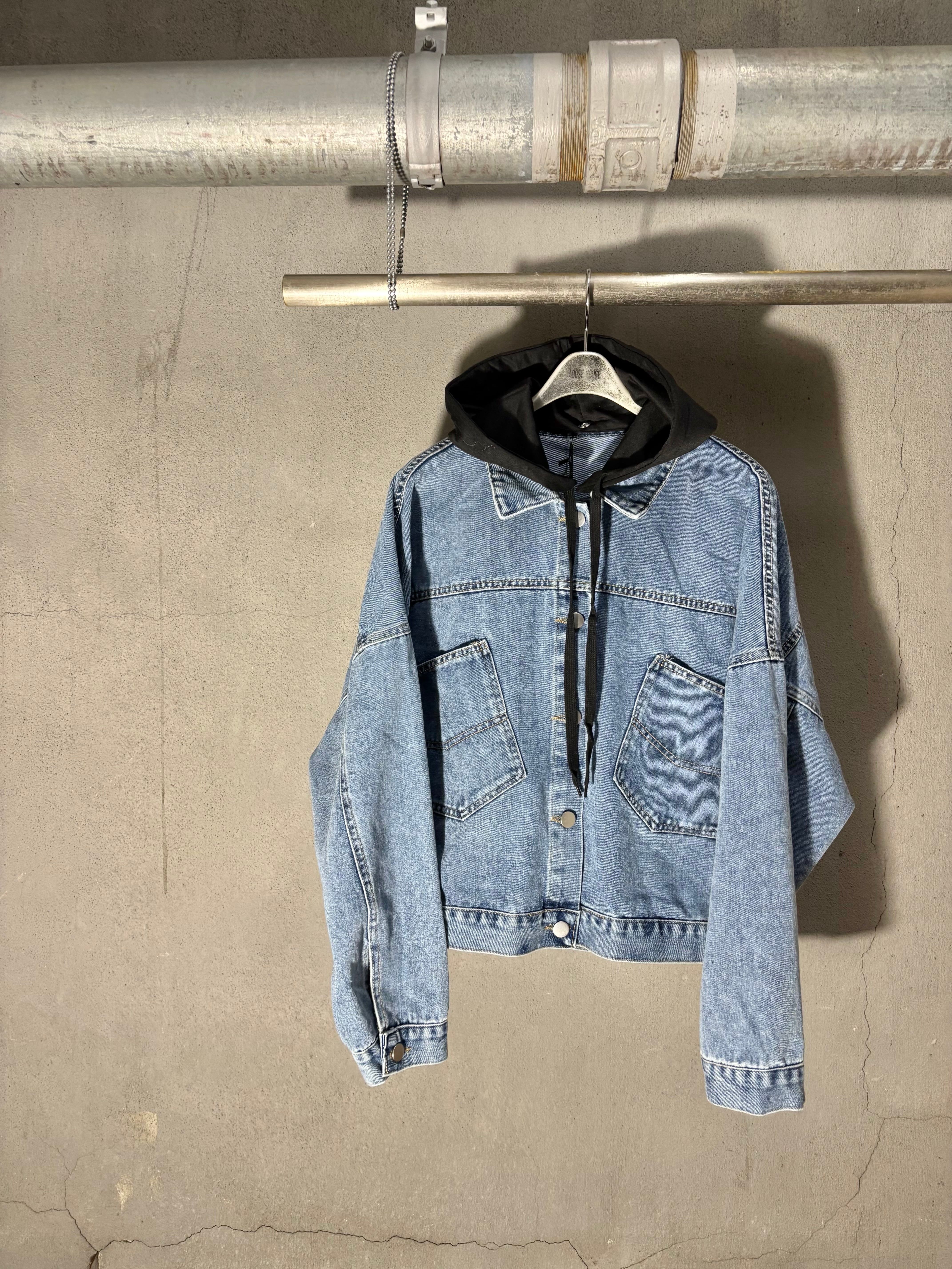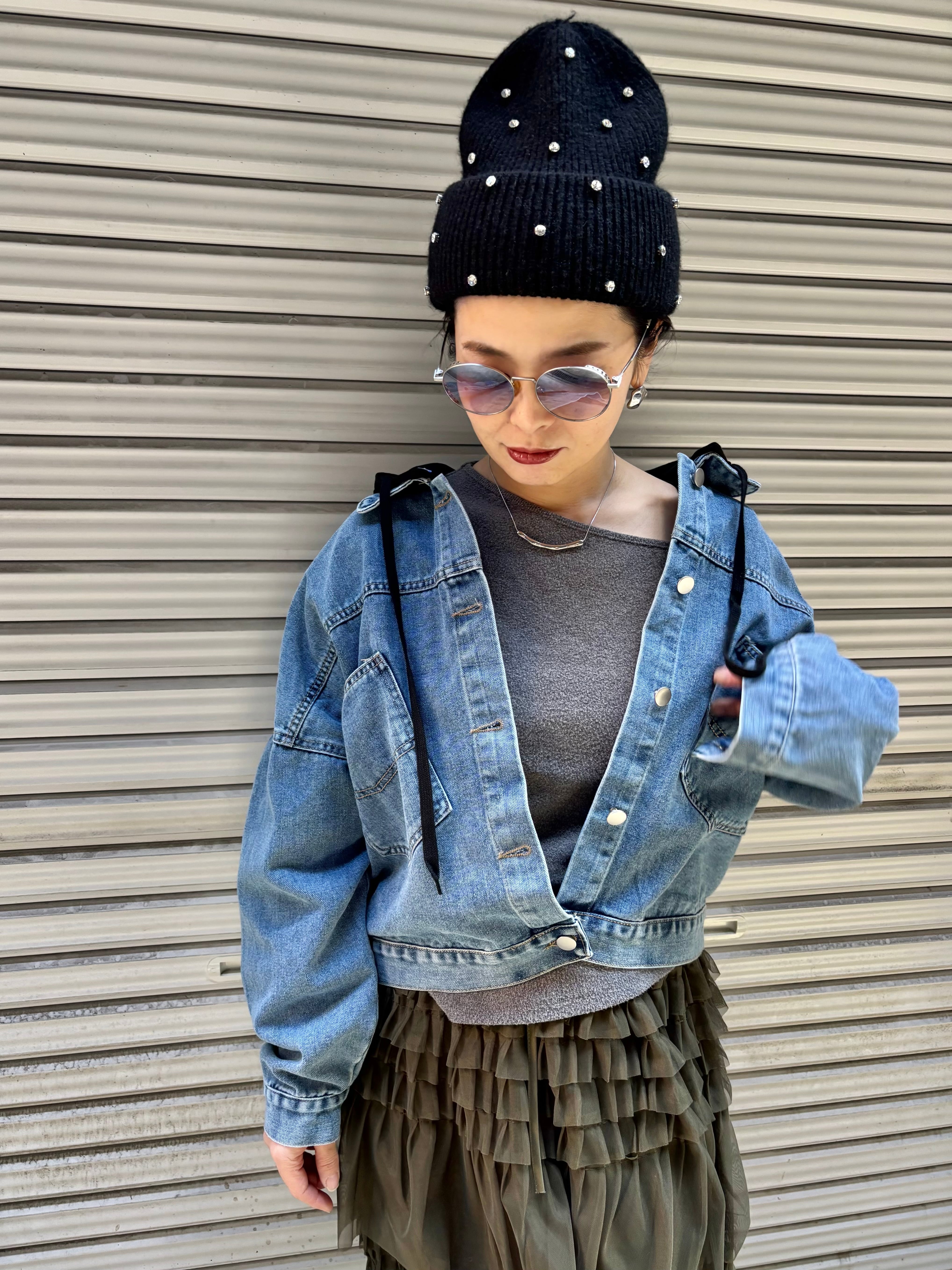 デニムジャケットに取り外し可能なフードを合わせた、カジュアルながらもおしゃれな一着です。デザインのポイントは、かわいらしいにこちゃんとビジューデザイン !!