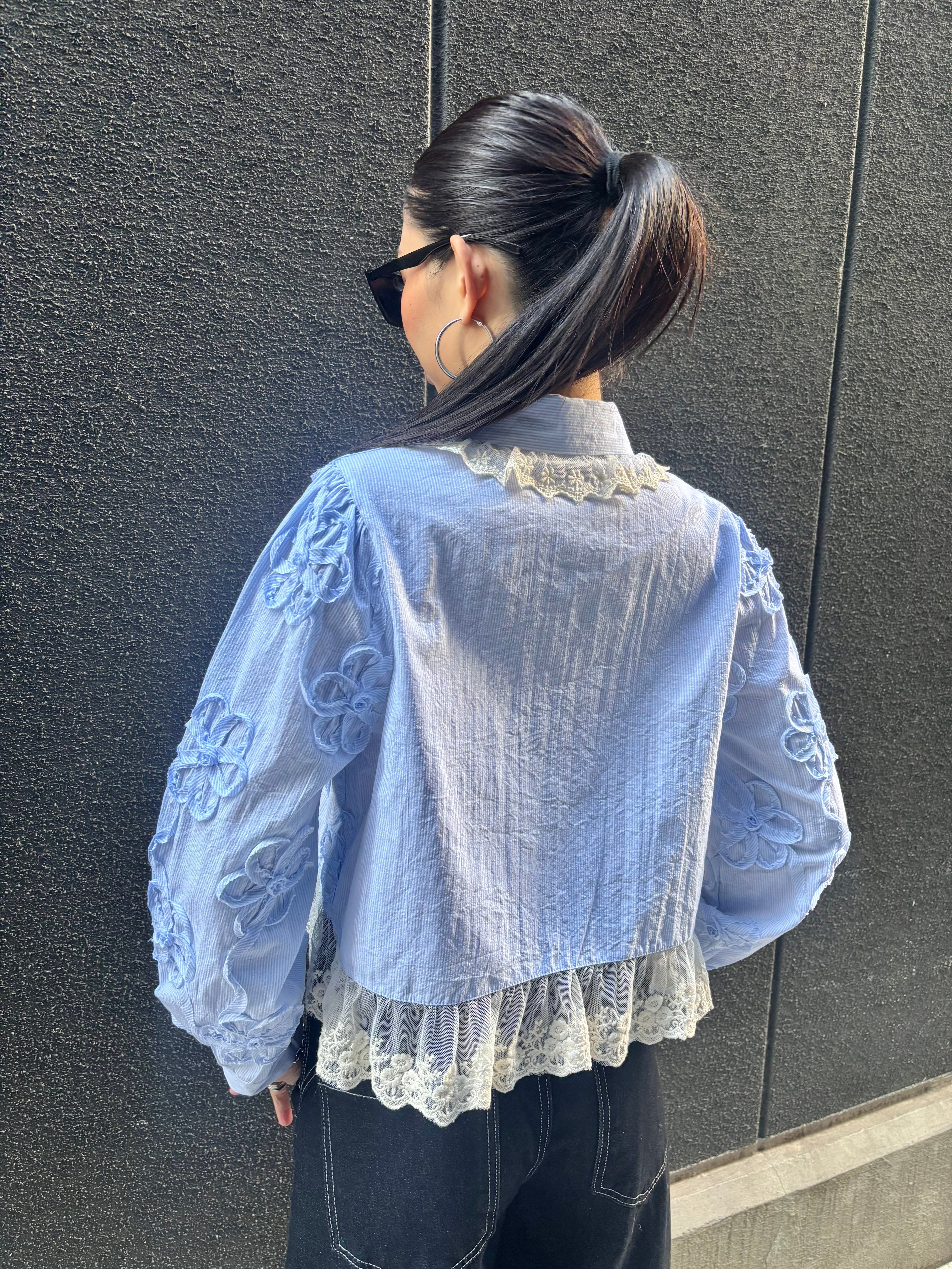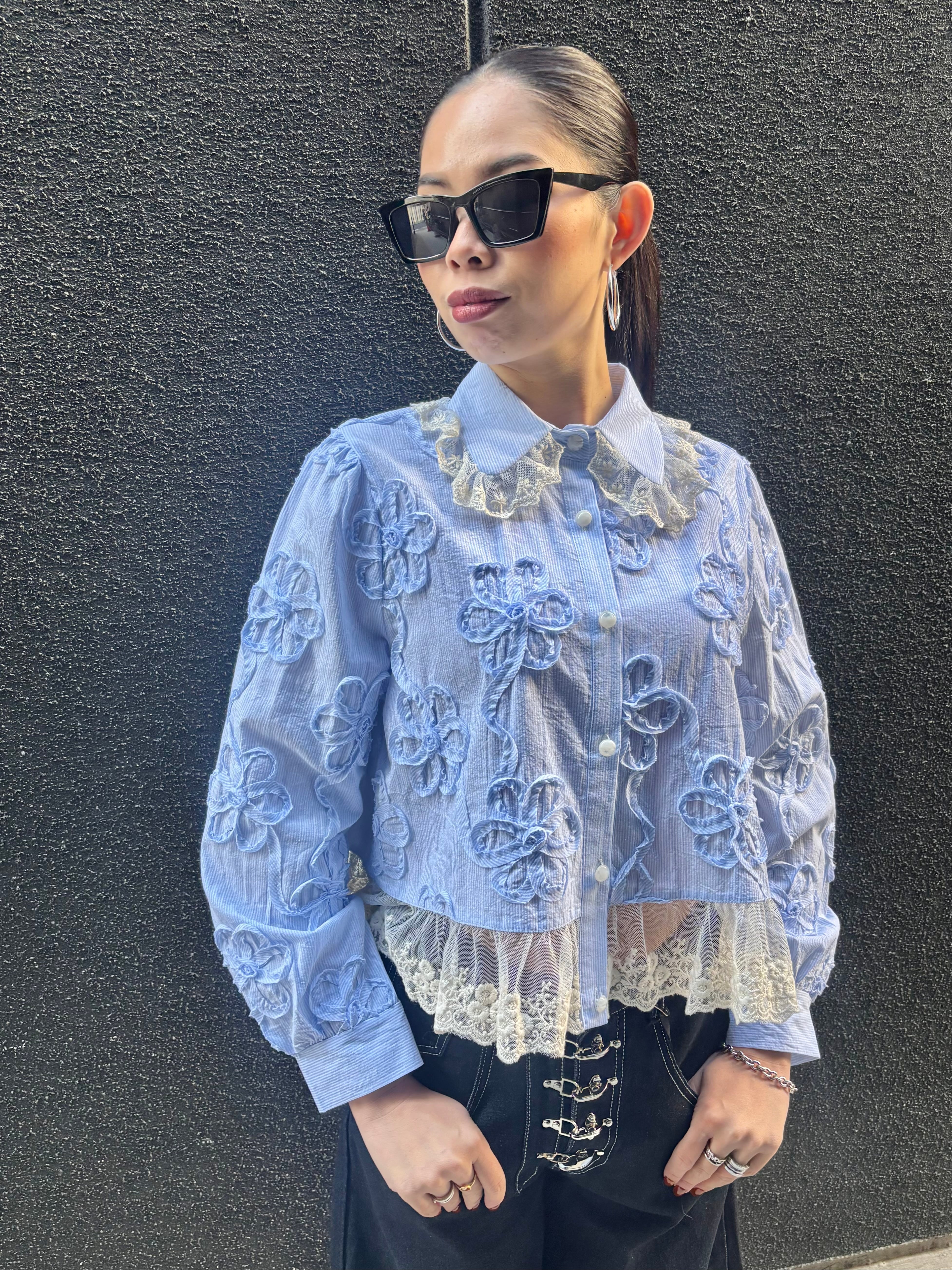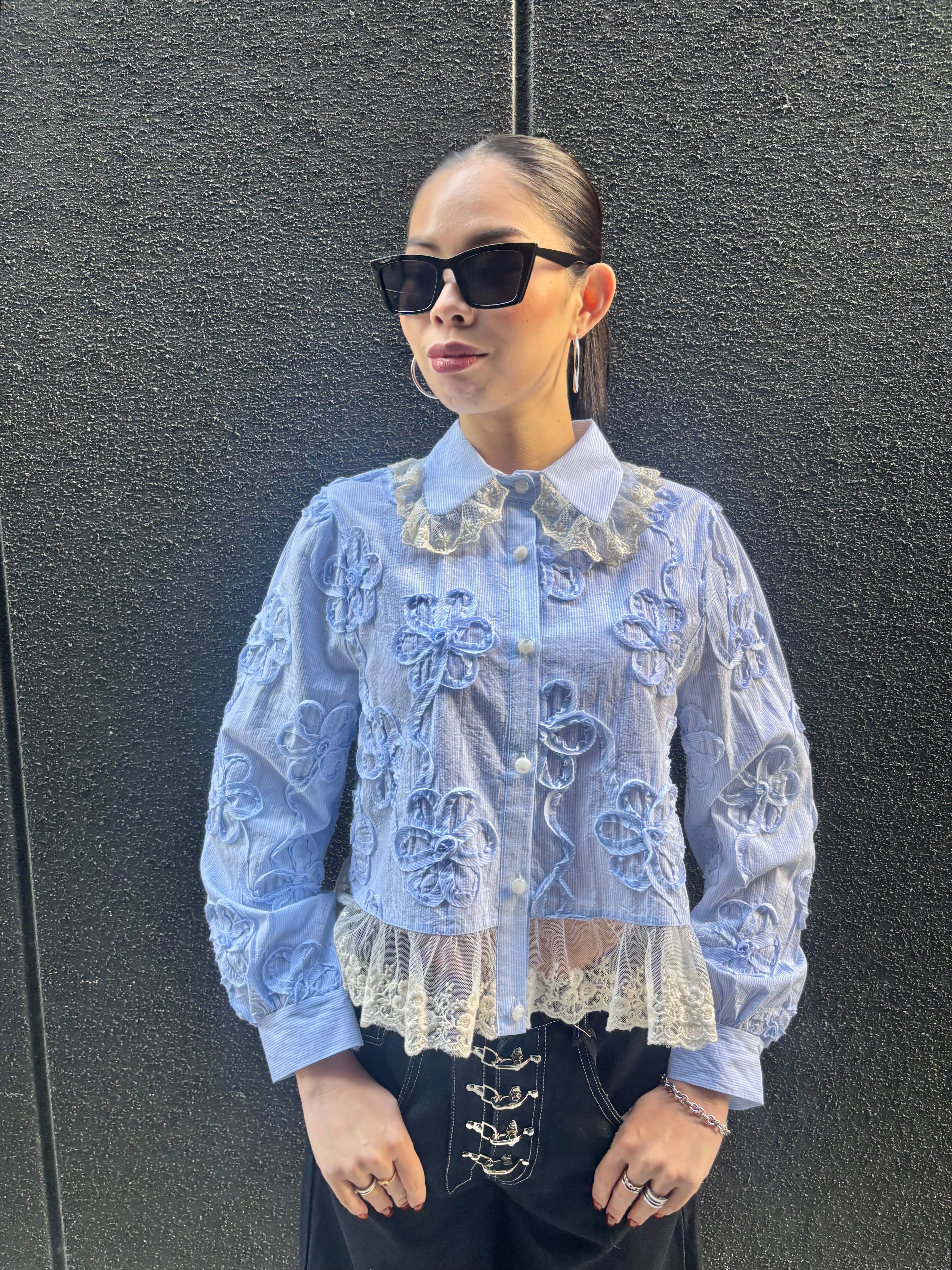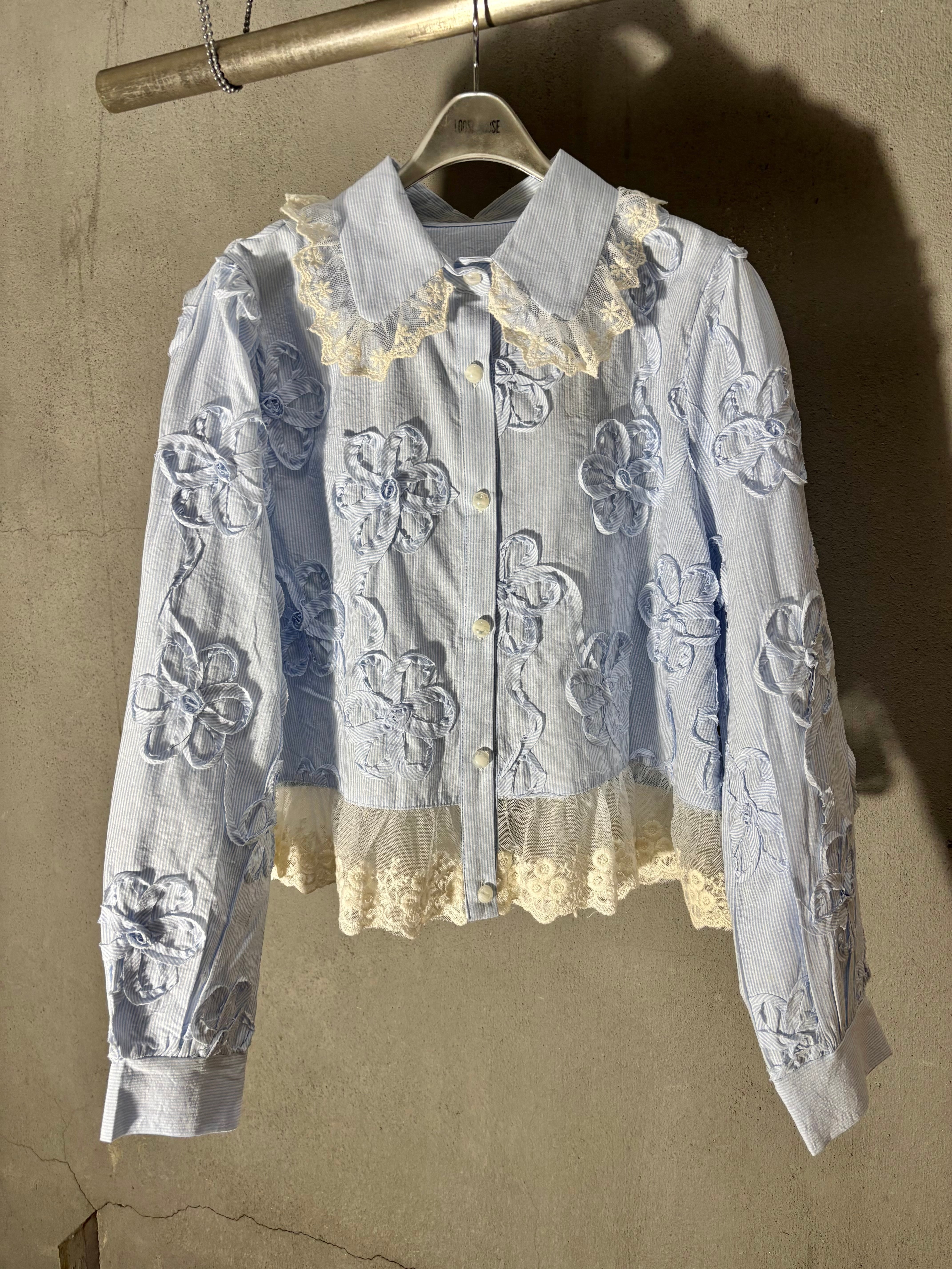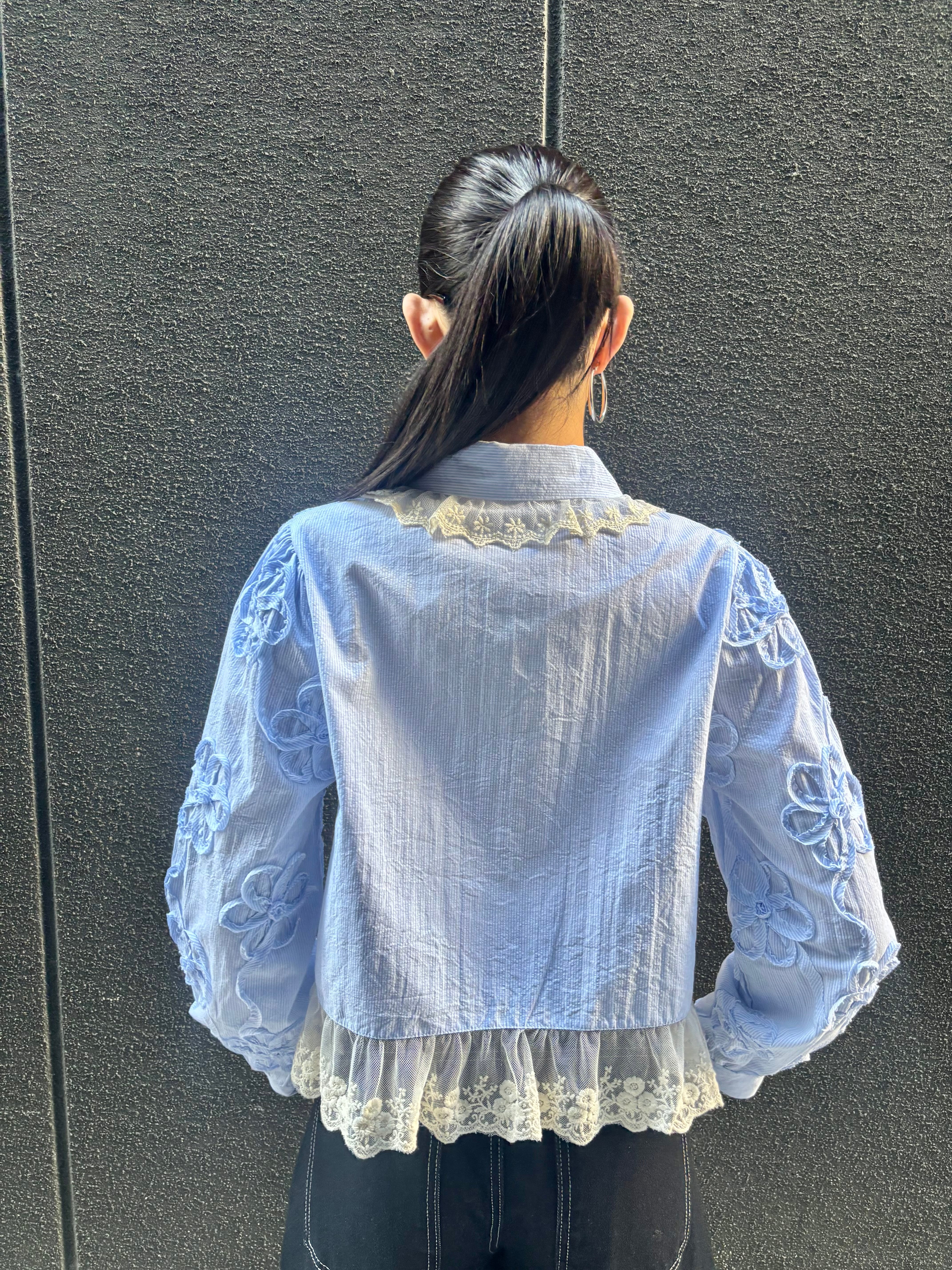 blue stripe code embroidery lace design shirt シャツ ストライプ レース コード 刺繍