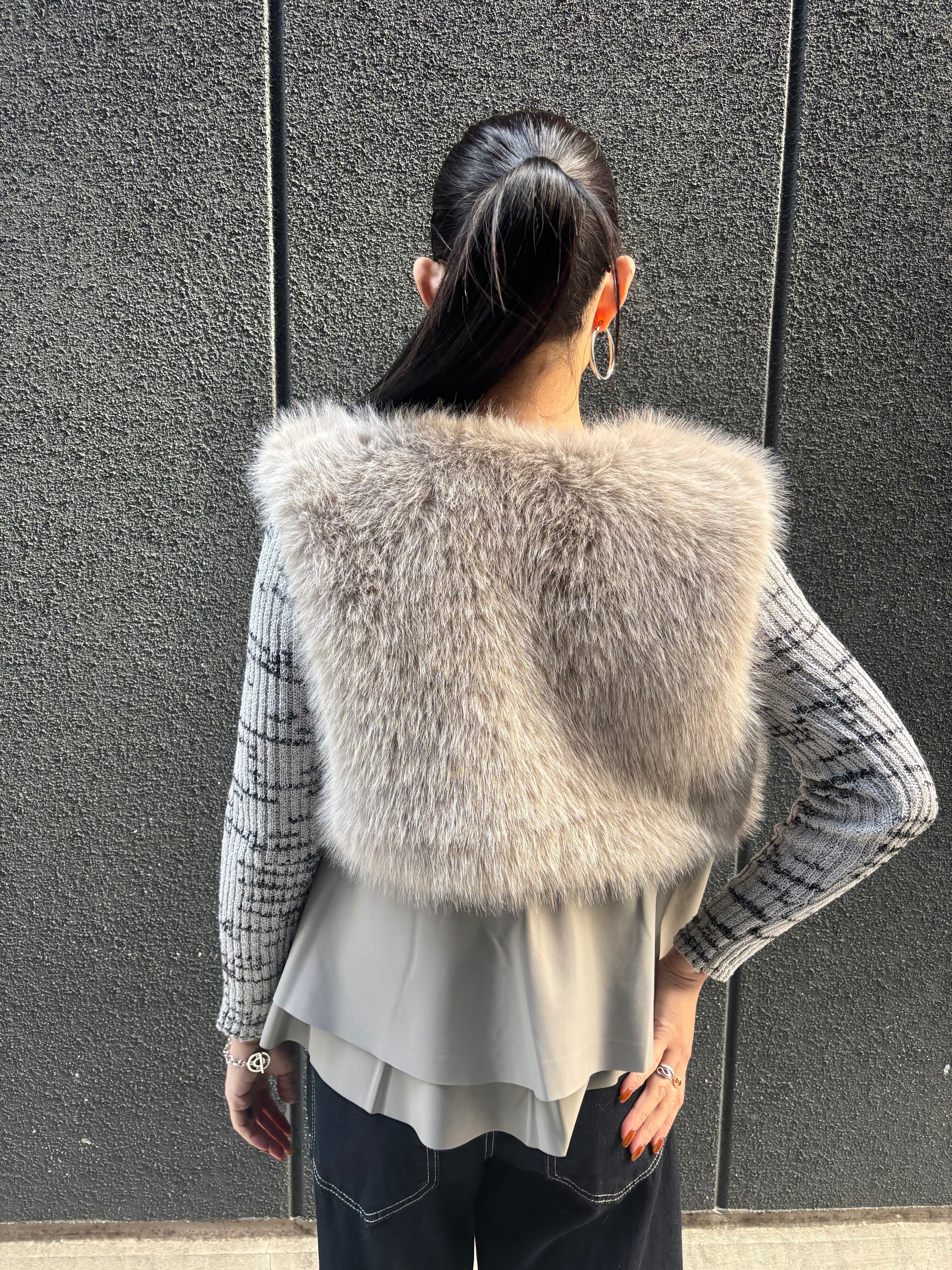 フェイクレザー×フェイクファーの絶妙な切替デザインが特徴のお洒落なベストです♡