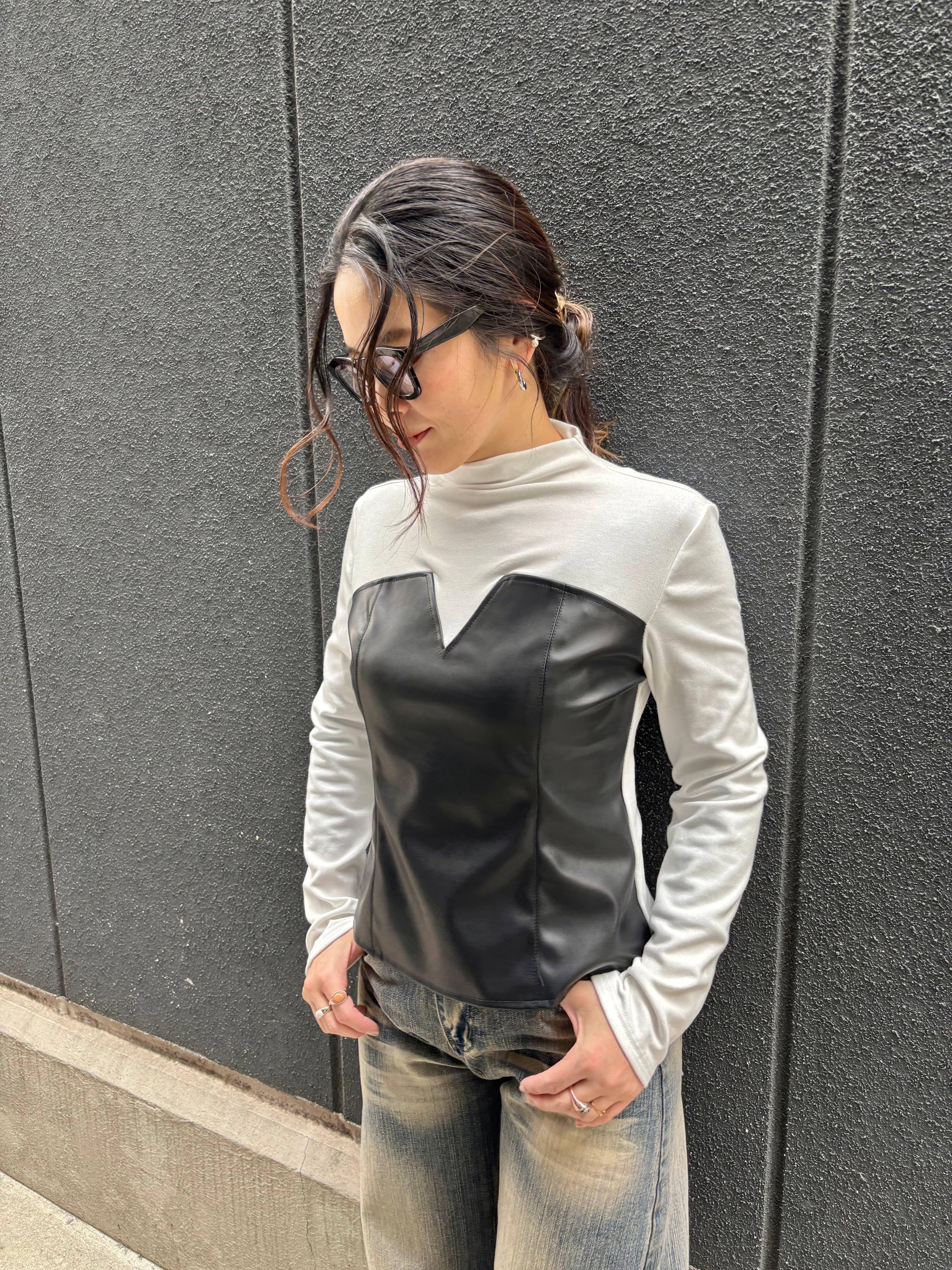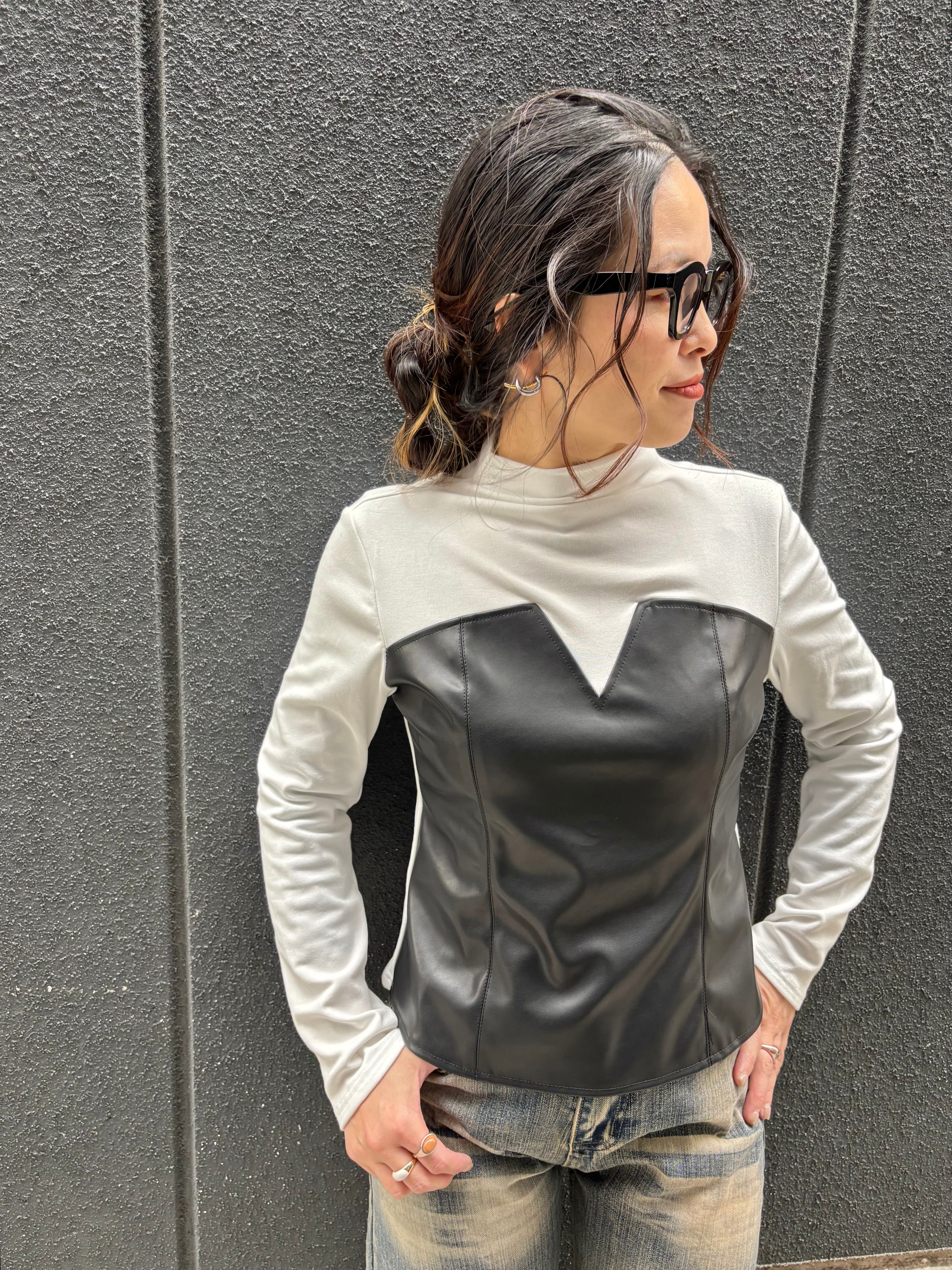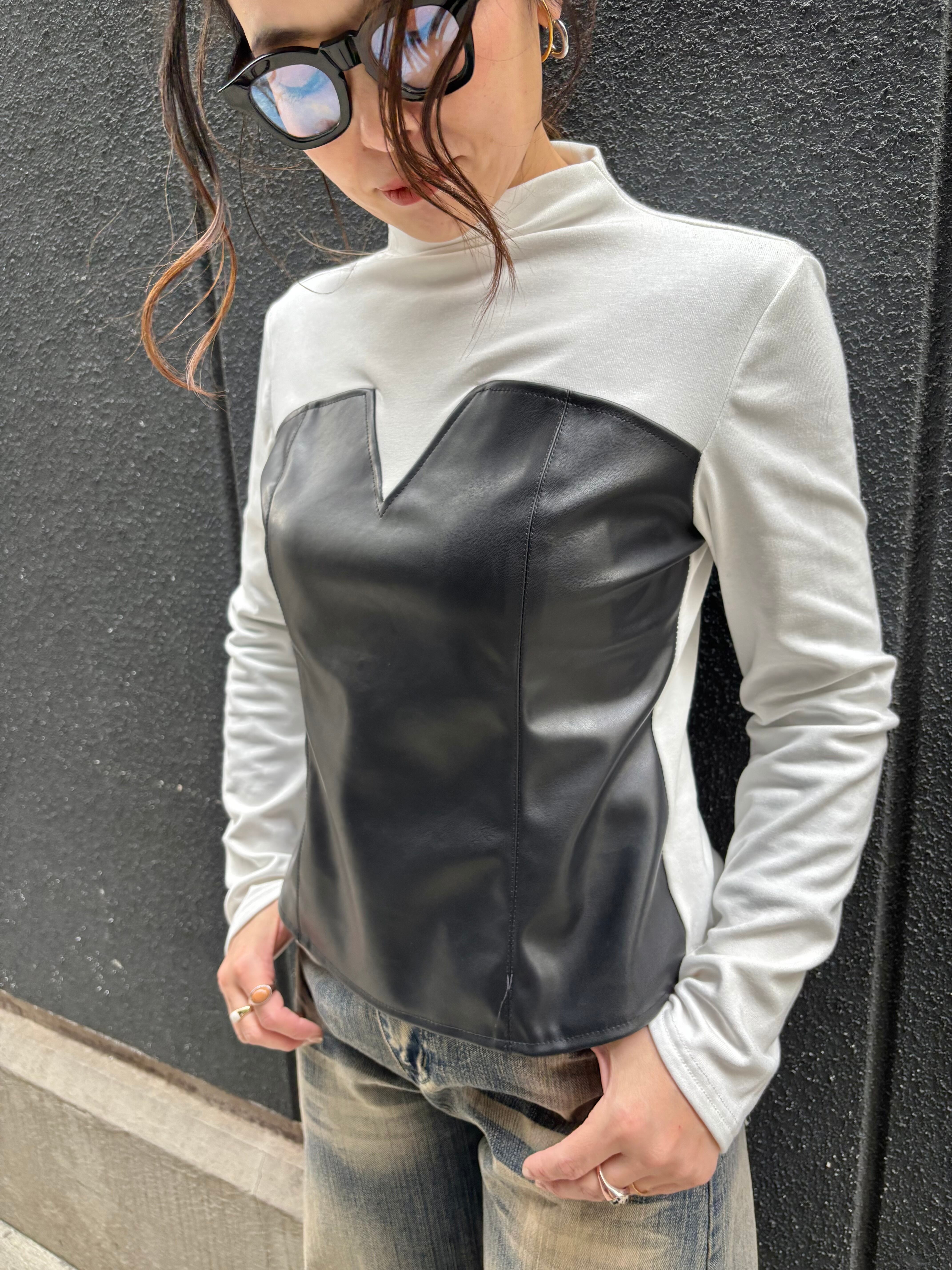 eco leather docking design stretch tops トップス デザイントップス エコレザー ストレッチ ドッキング 異素材切替