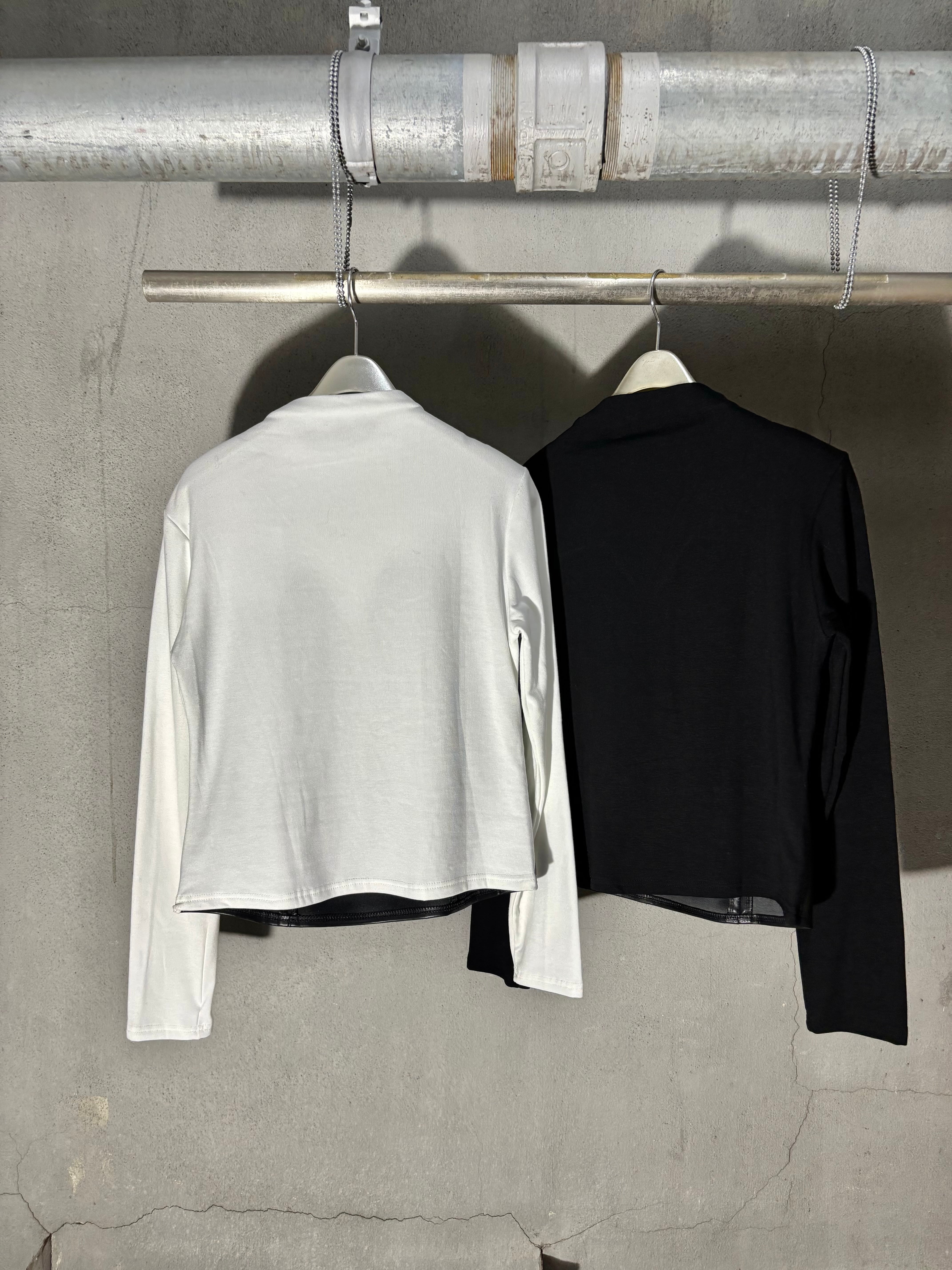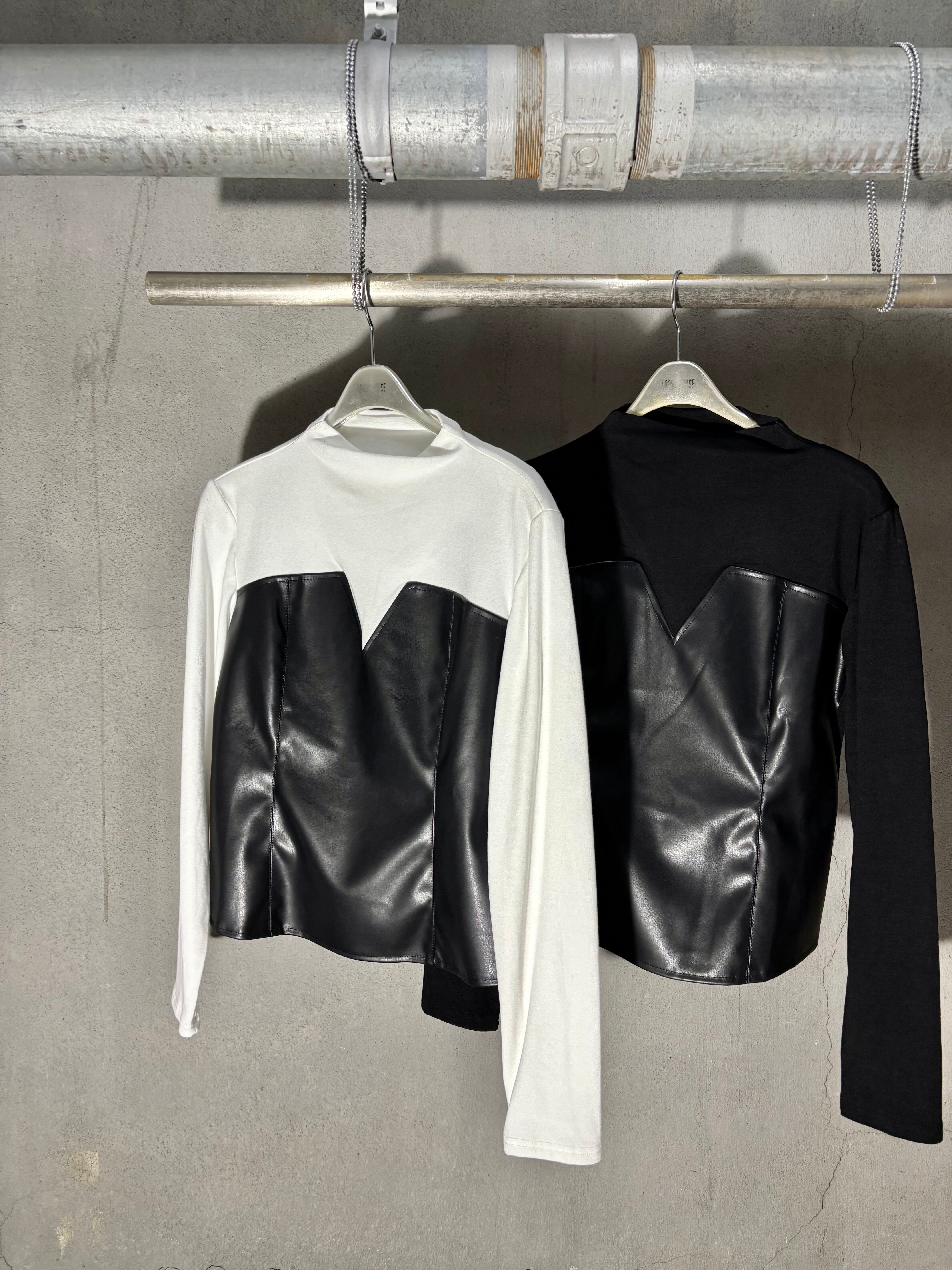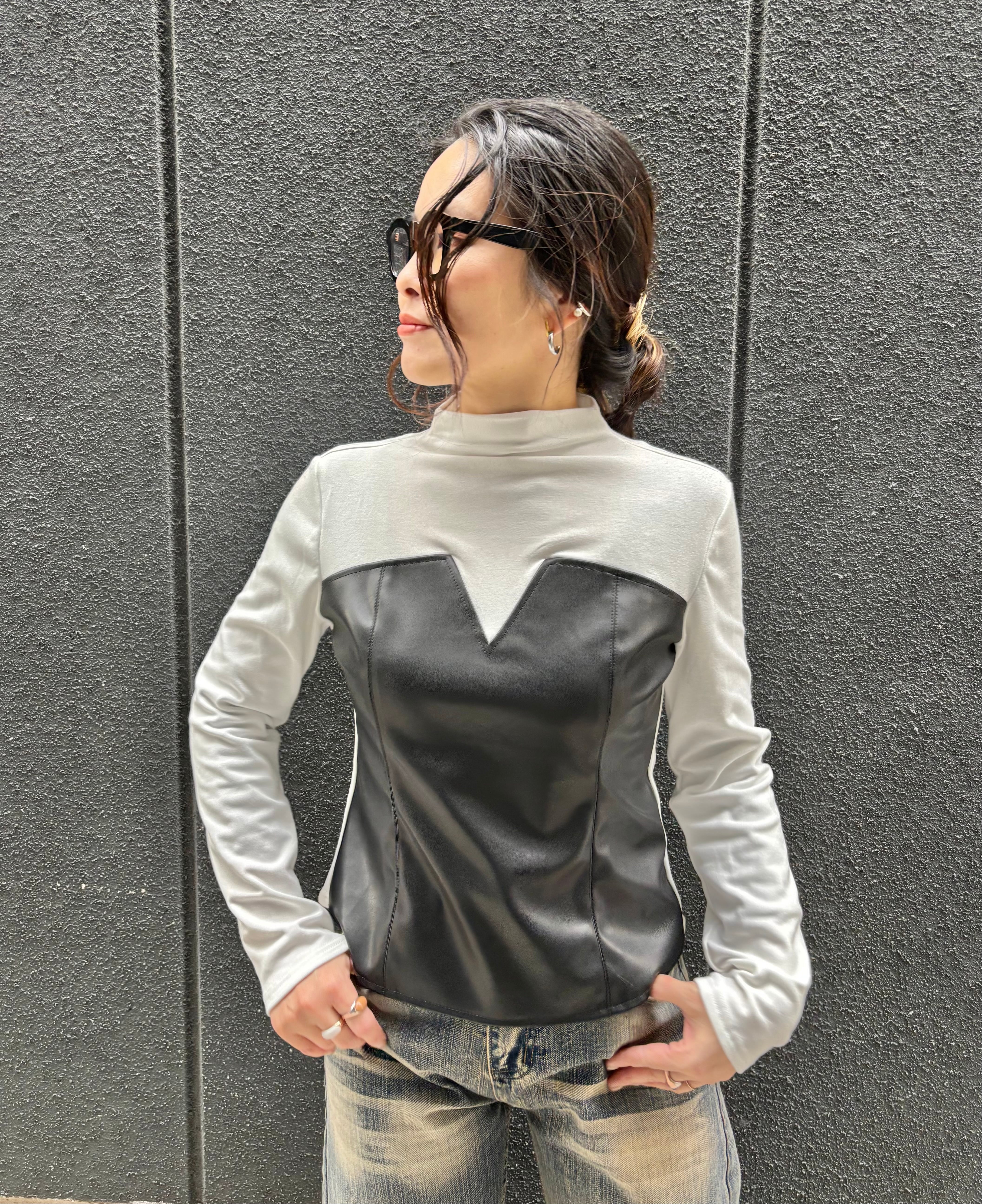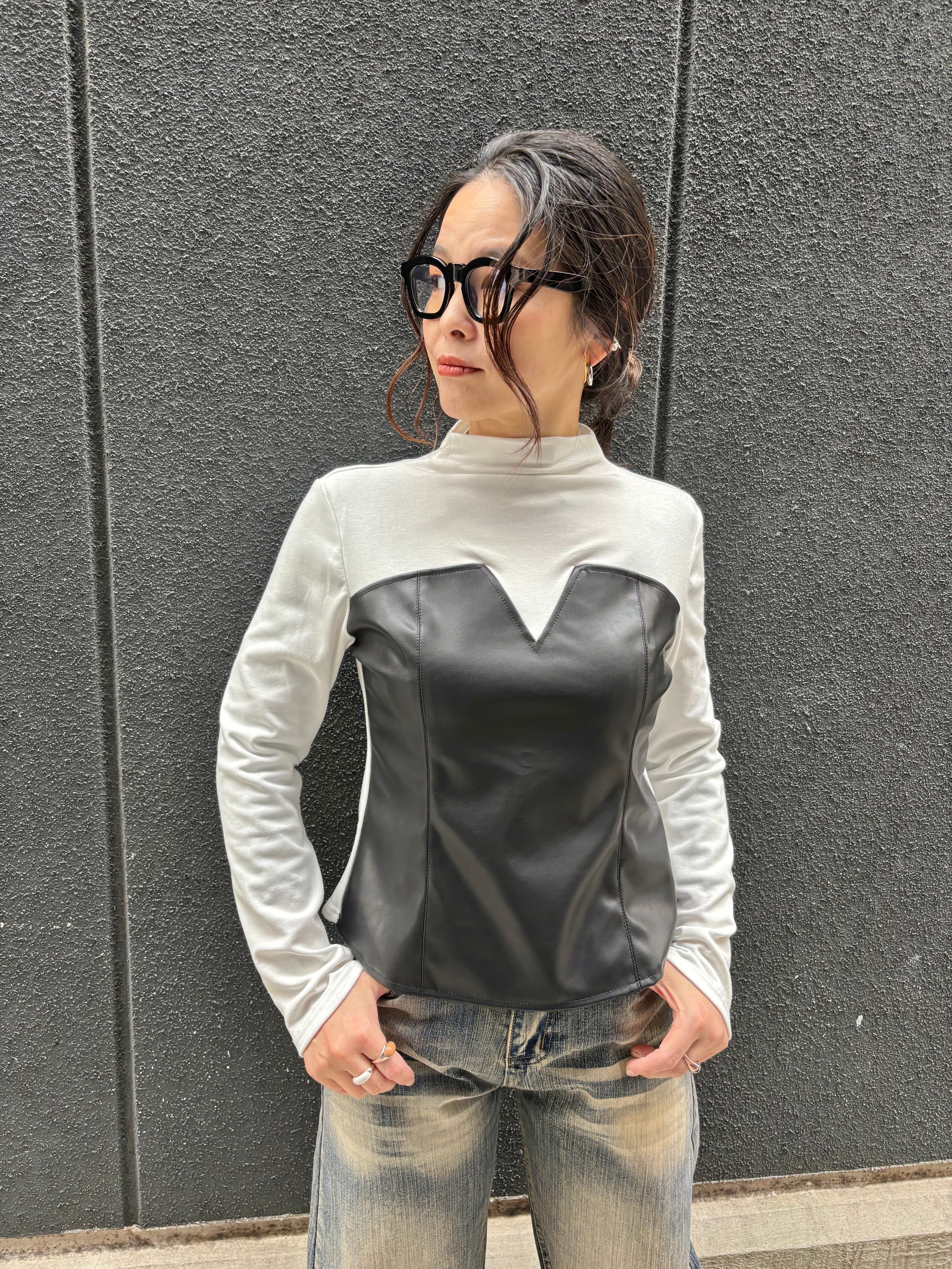 eco leather docking design stretch tops トップス デザイントップス エコレザー ストレッチ ドッキング 異素材切替