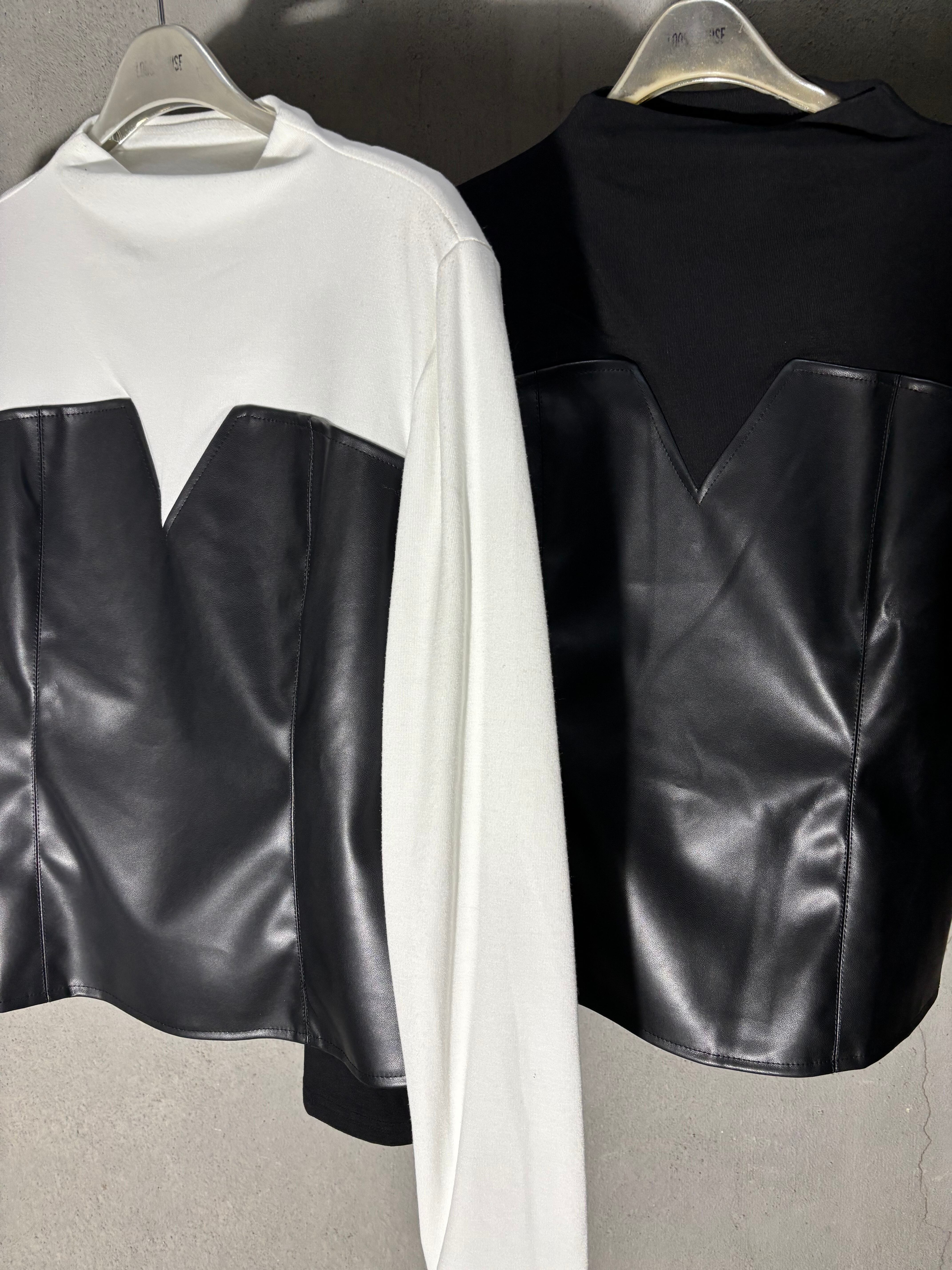 洗練されたレザーの切替デザインが際立つトップス!