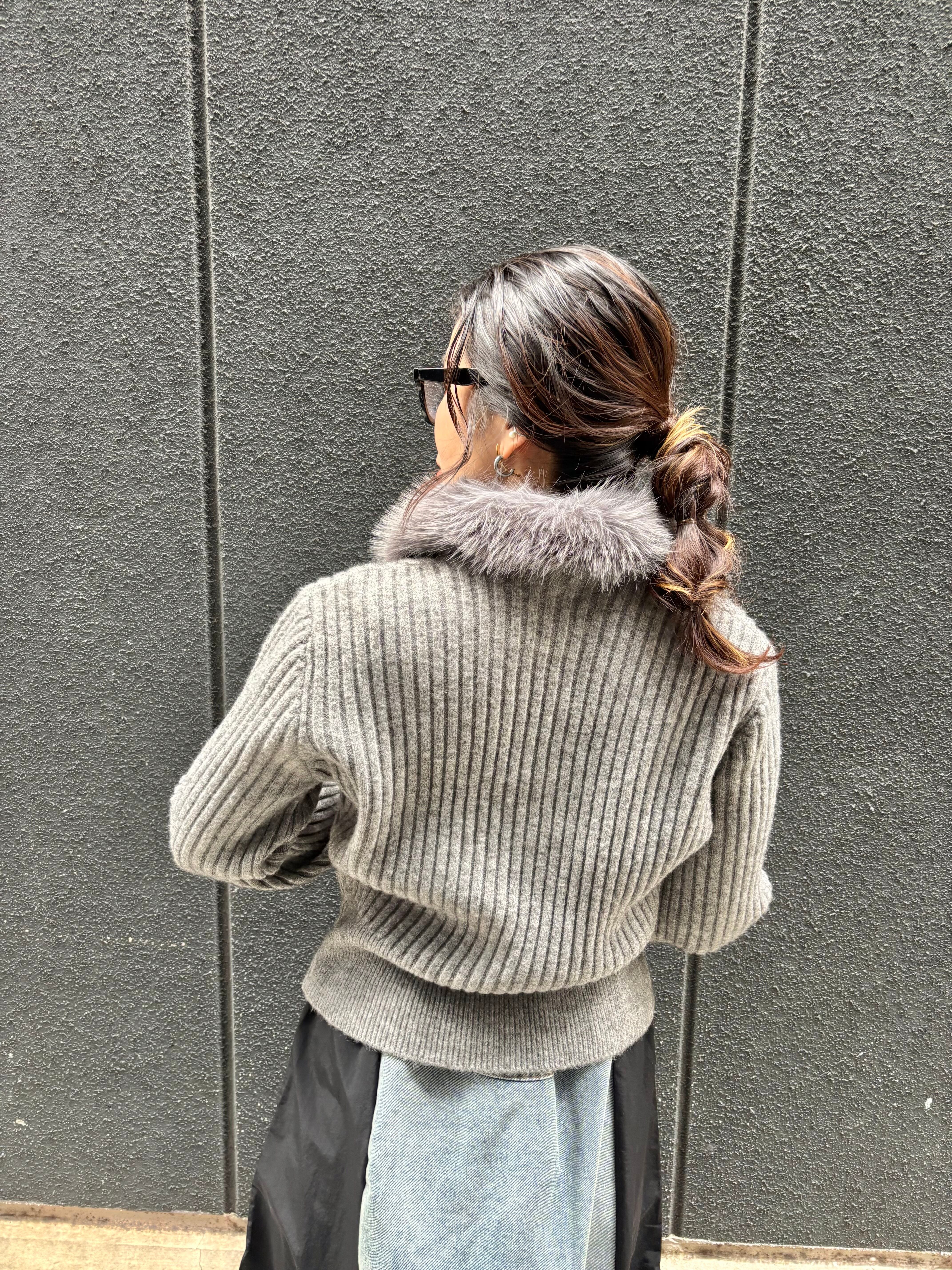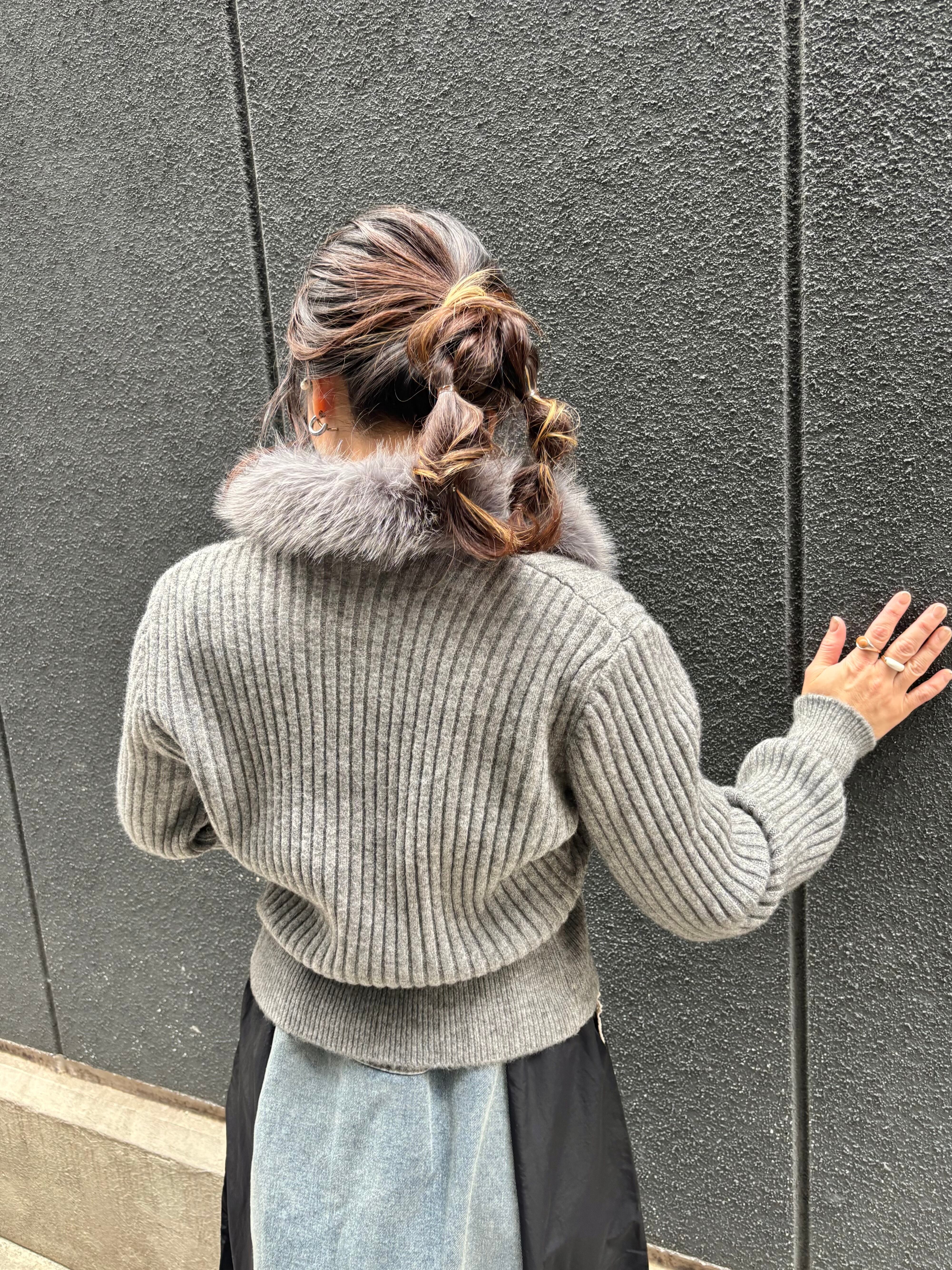 このニットカーディガンは、首元に施された贅沢なファーが特徴で、上品さと温かみを演出します。