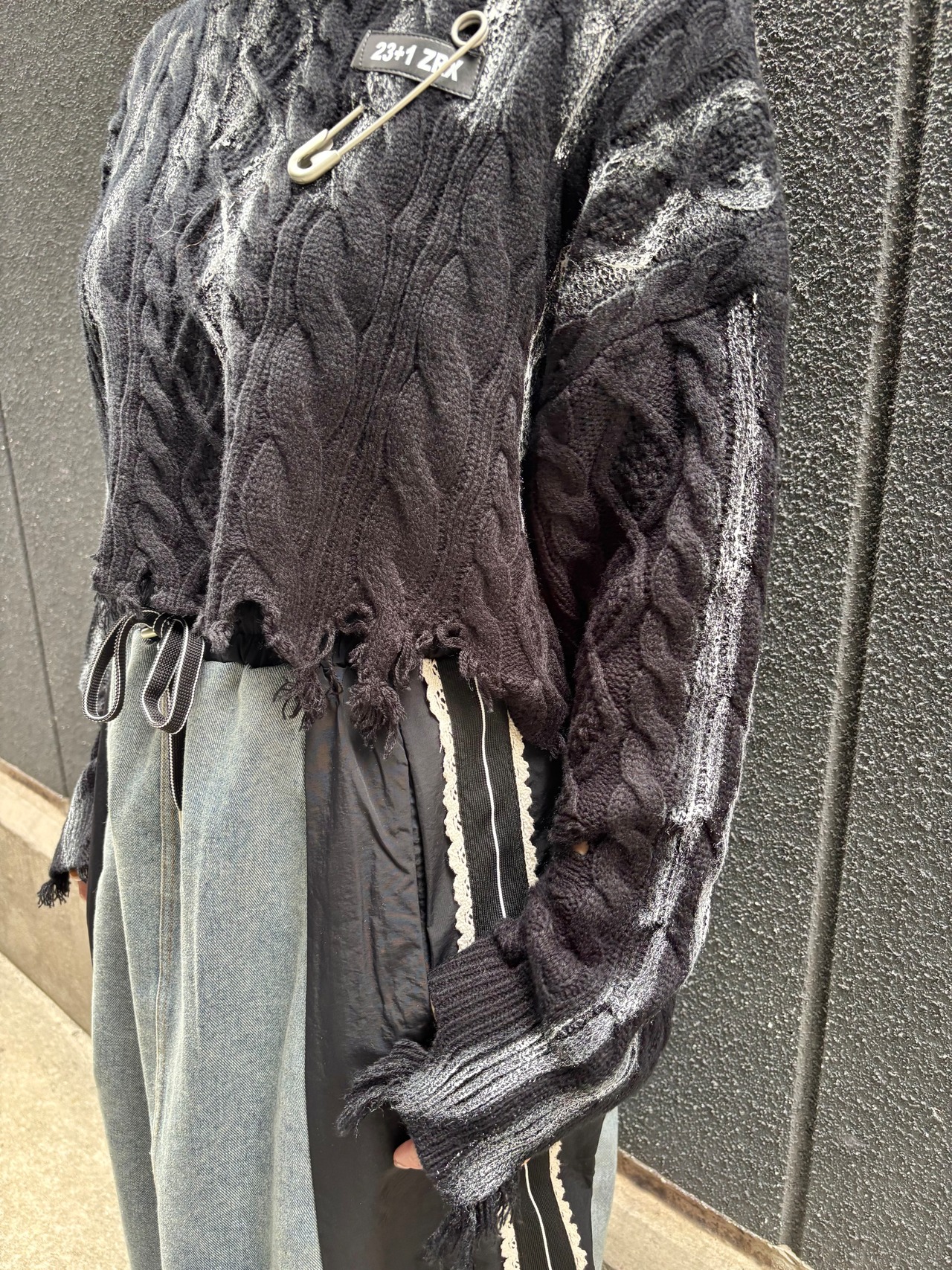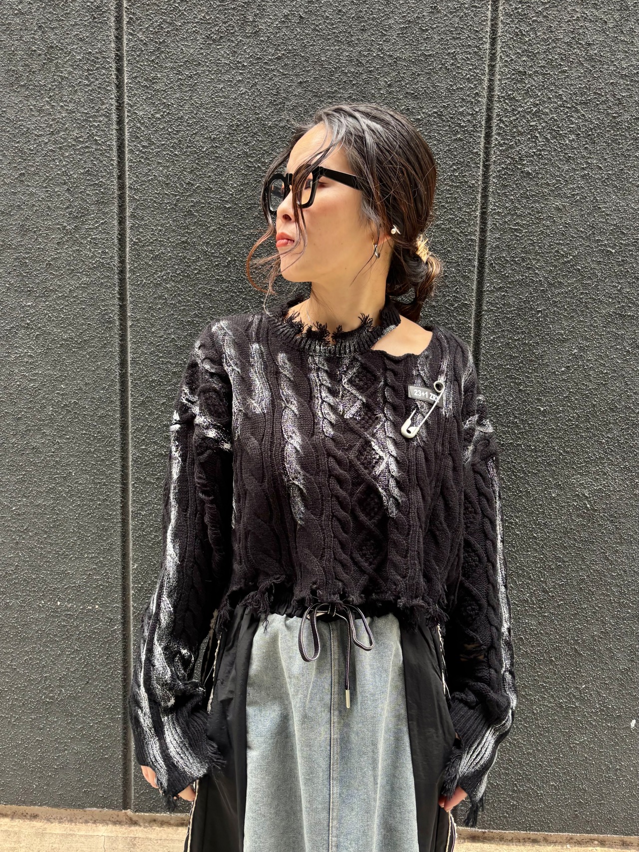 silver spray damage knit design tops トップス ニット ダメージ シルバー ショート丈 ブラック 黒