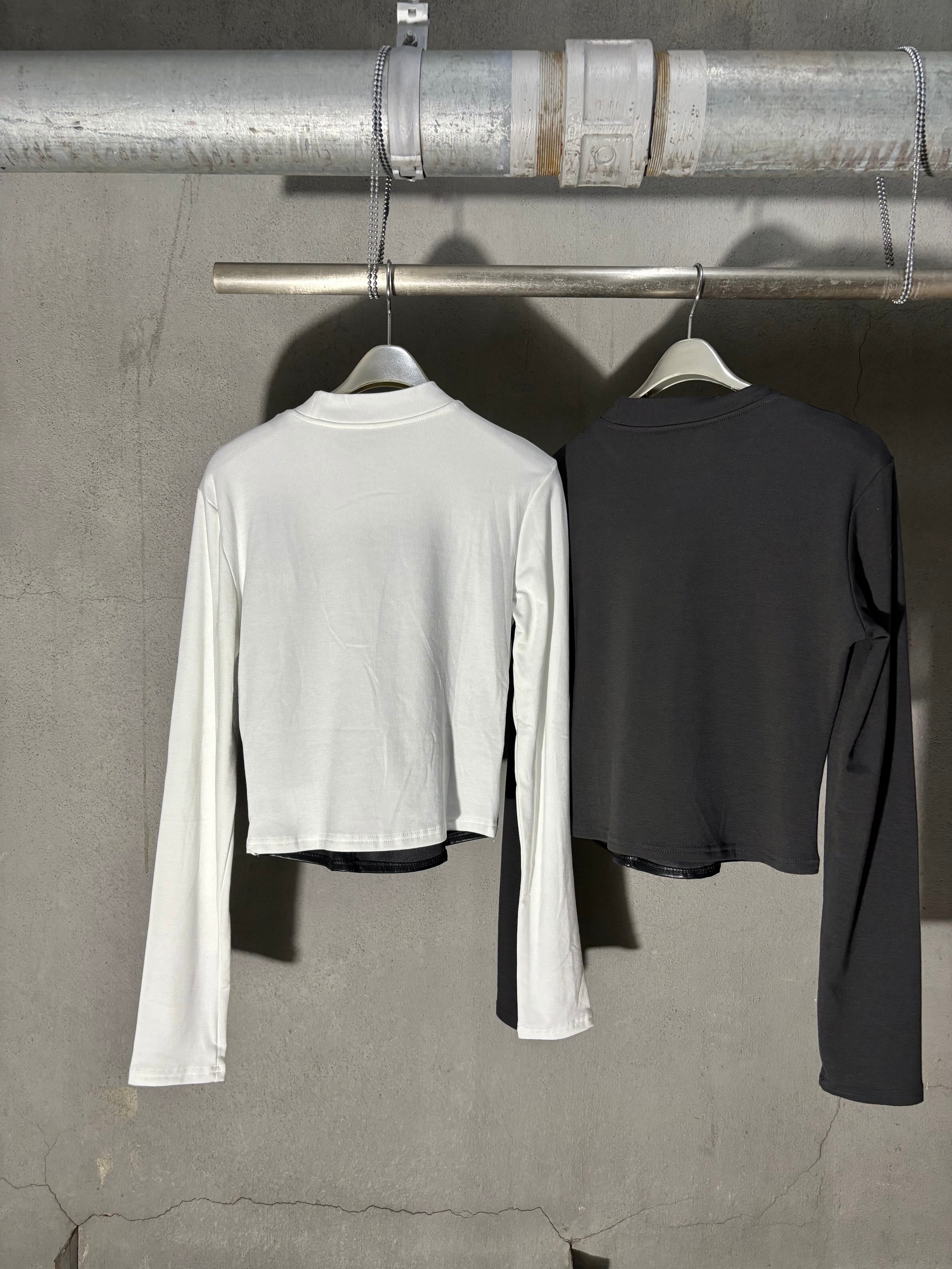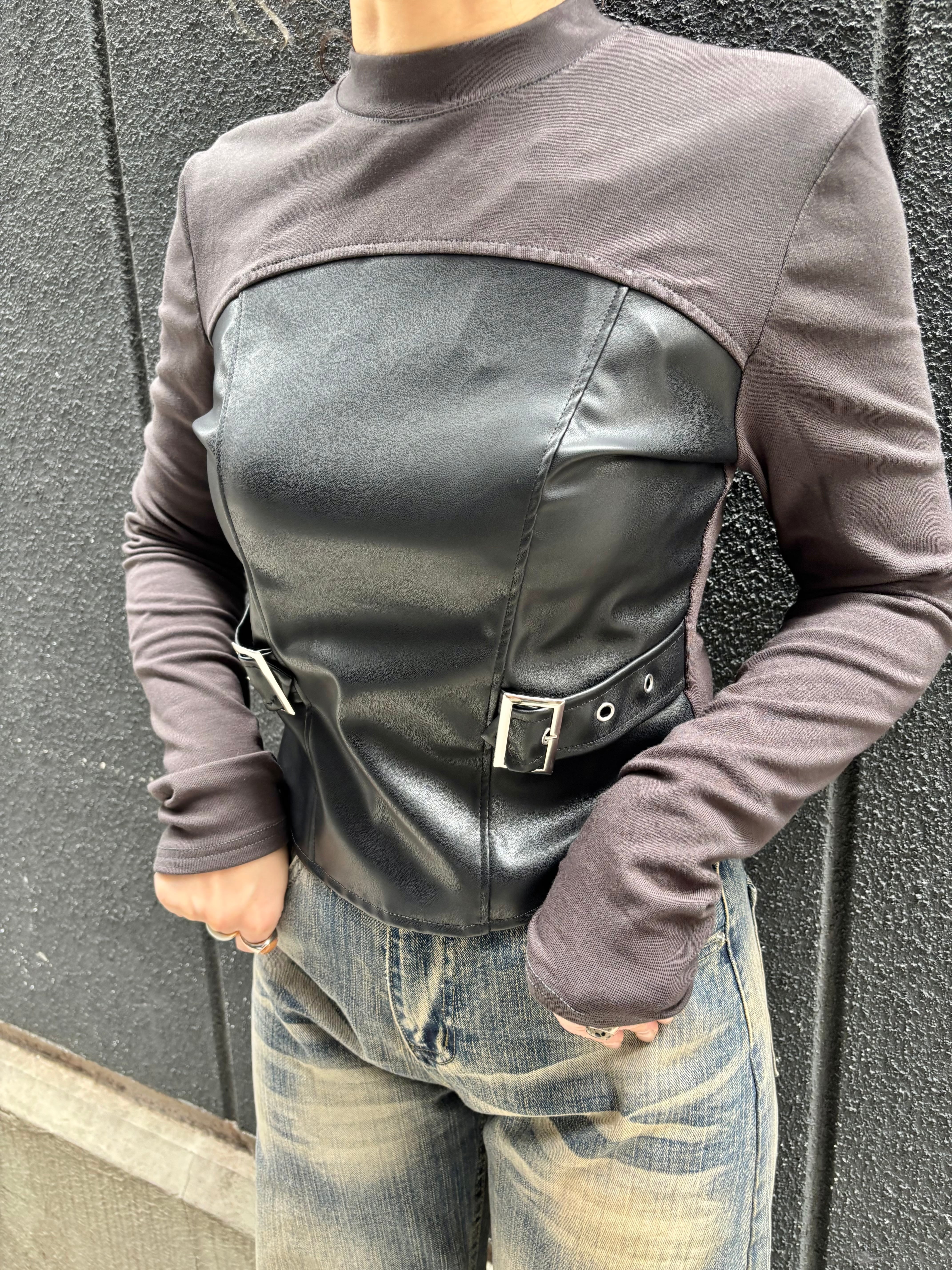 eco leather docking design stretch tops トップス デザイントップス エコレザー ストレッチ ドッキング 異素材切替