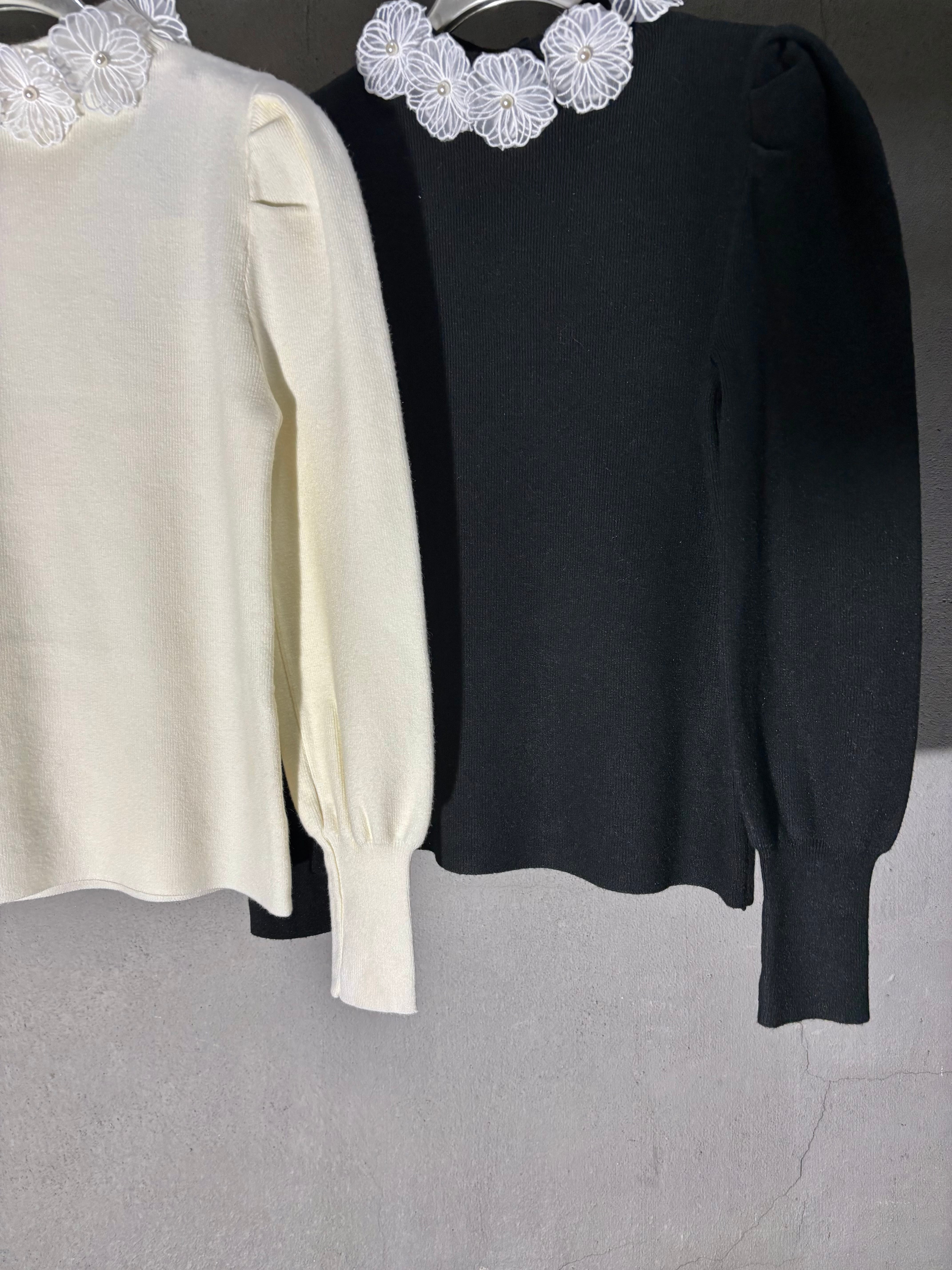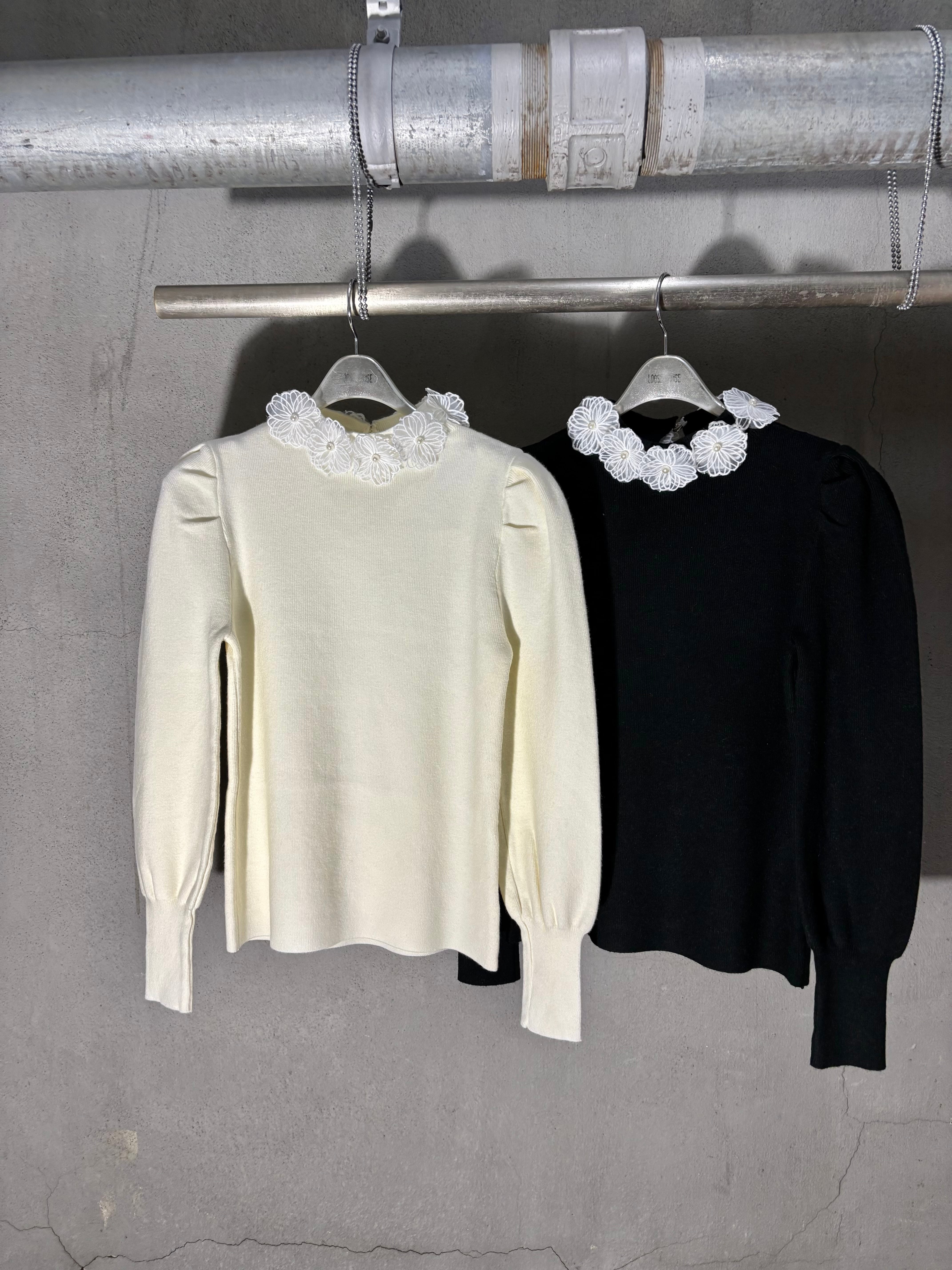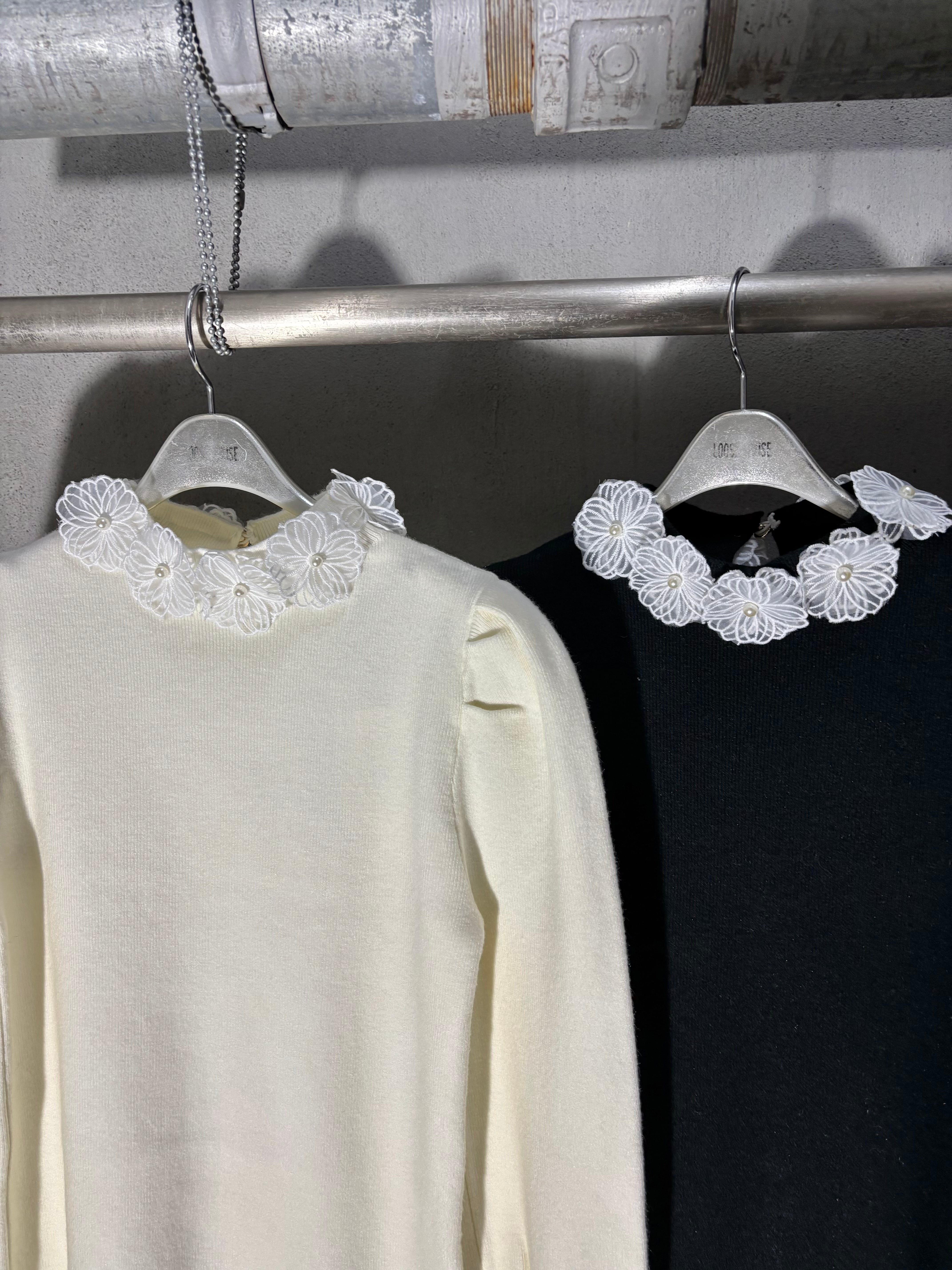 white flower lace collar design knit tops トップス ニット レース 襟 デザイントップス