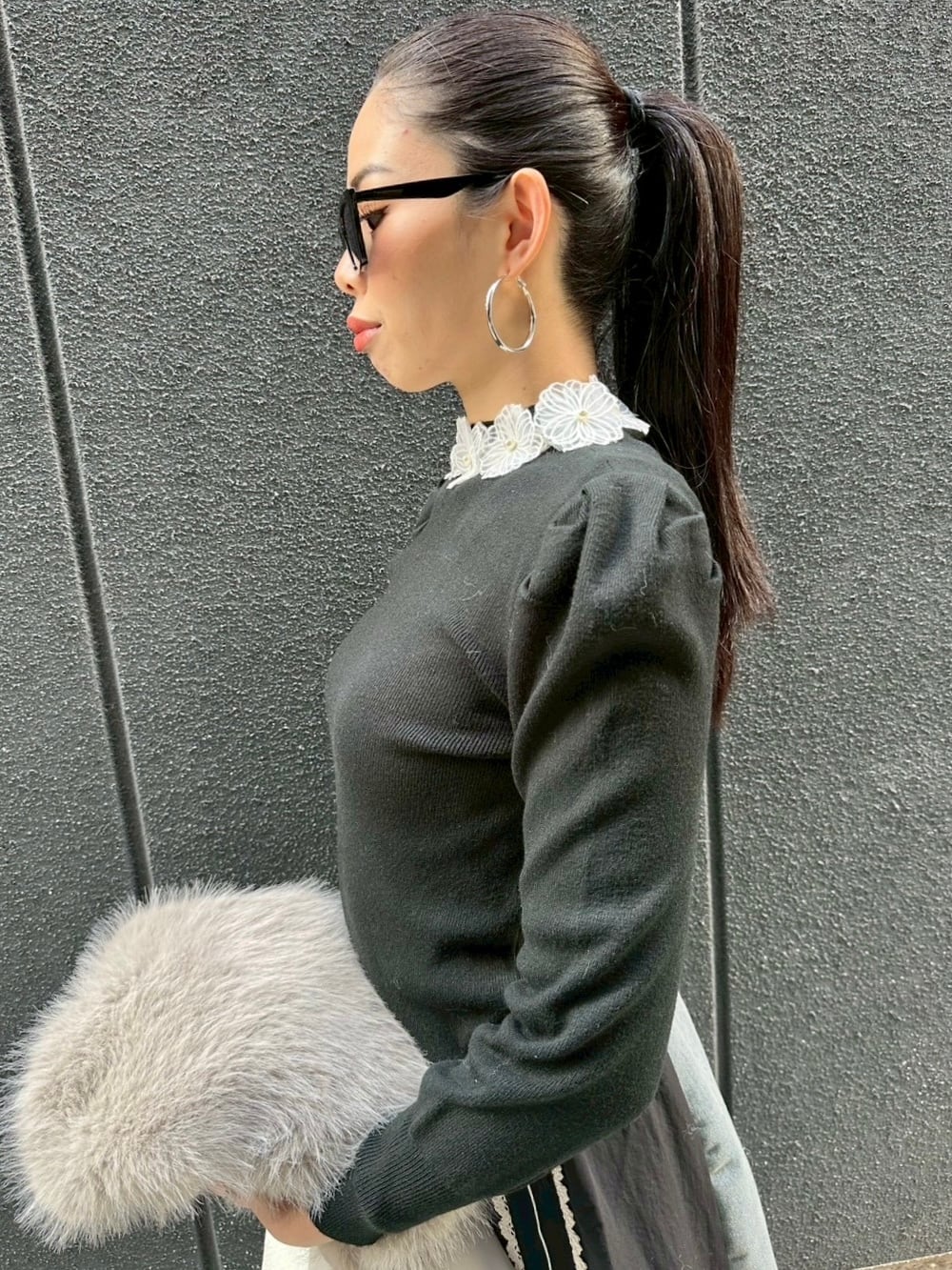 華やかな白いレース襟デザインが特徴のニットトップスです。
