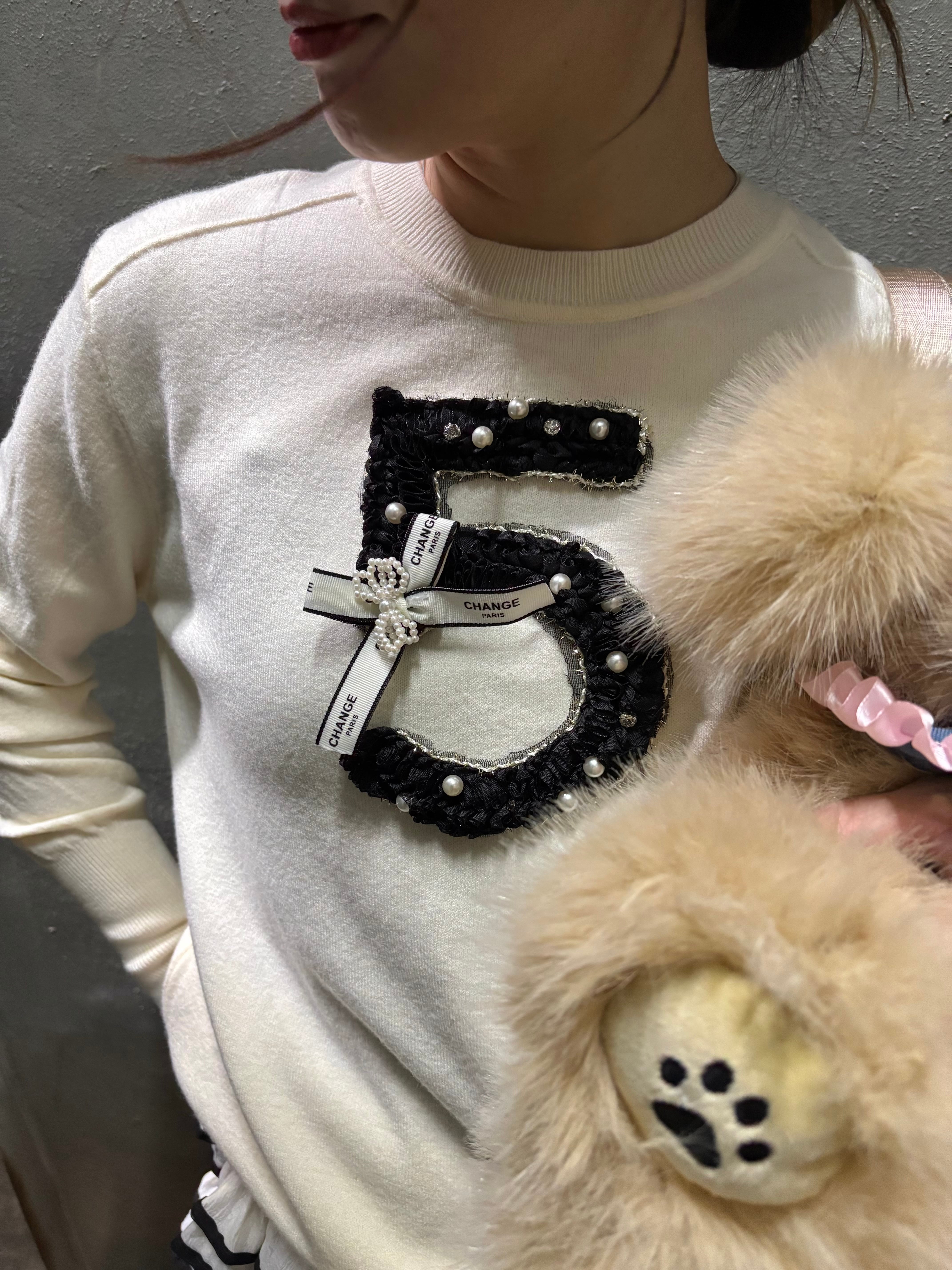 「5」モチーフのデザインにパールビジュが施された、可愛らしさ満点の薄手ニットトップス。