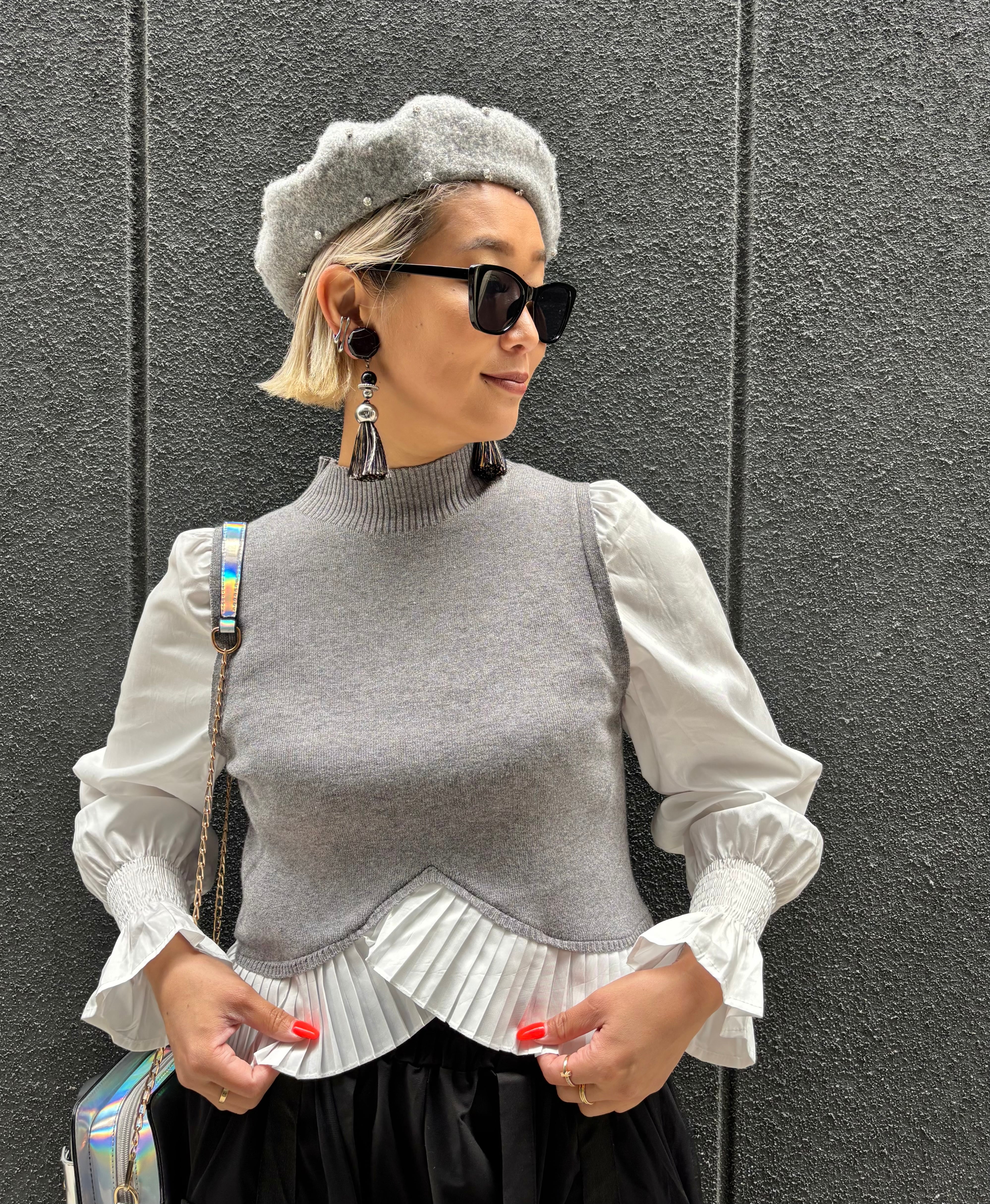 プリーツと布帛の絶妙な組み合わせで、普段のコーディネートに一気にアクセントを加えてくれます。裾や袖口のデザインがポイントになり、シンプルなボトムスと合わせるだけでおしゃれ度がアップします。