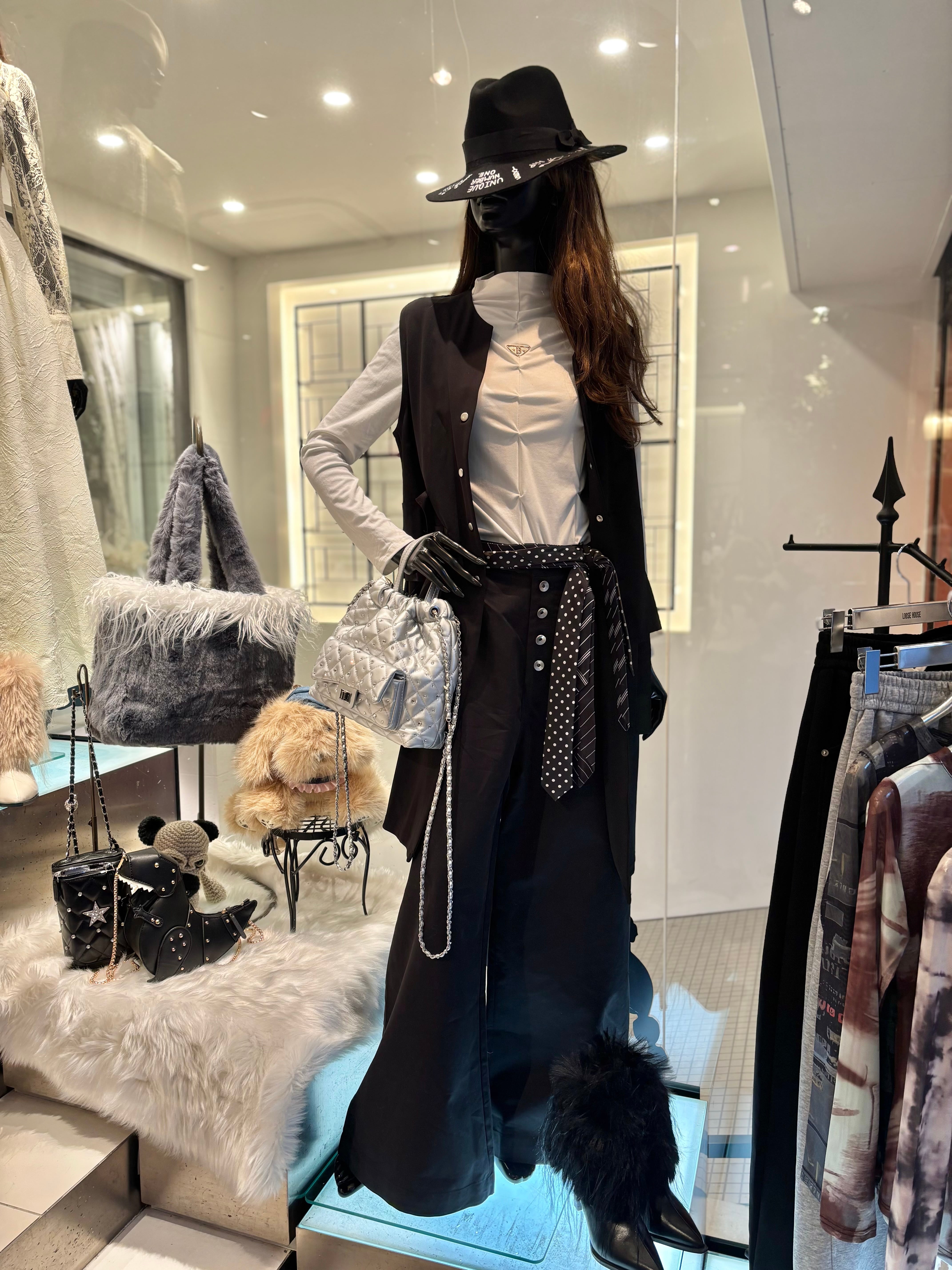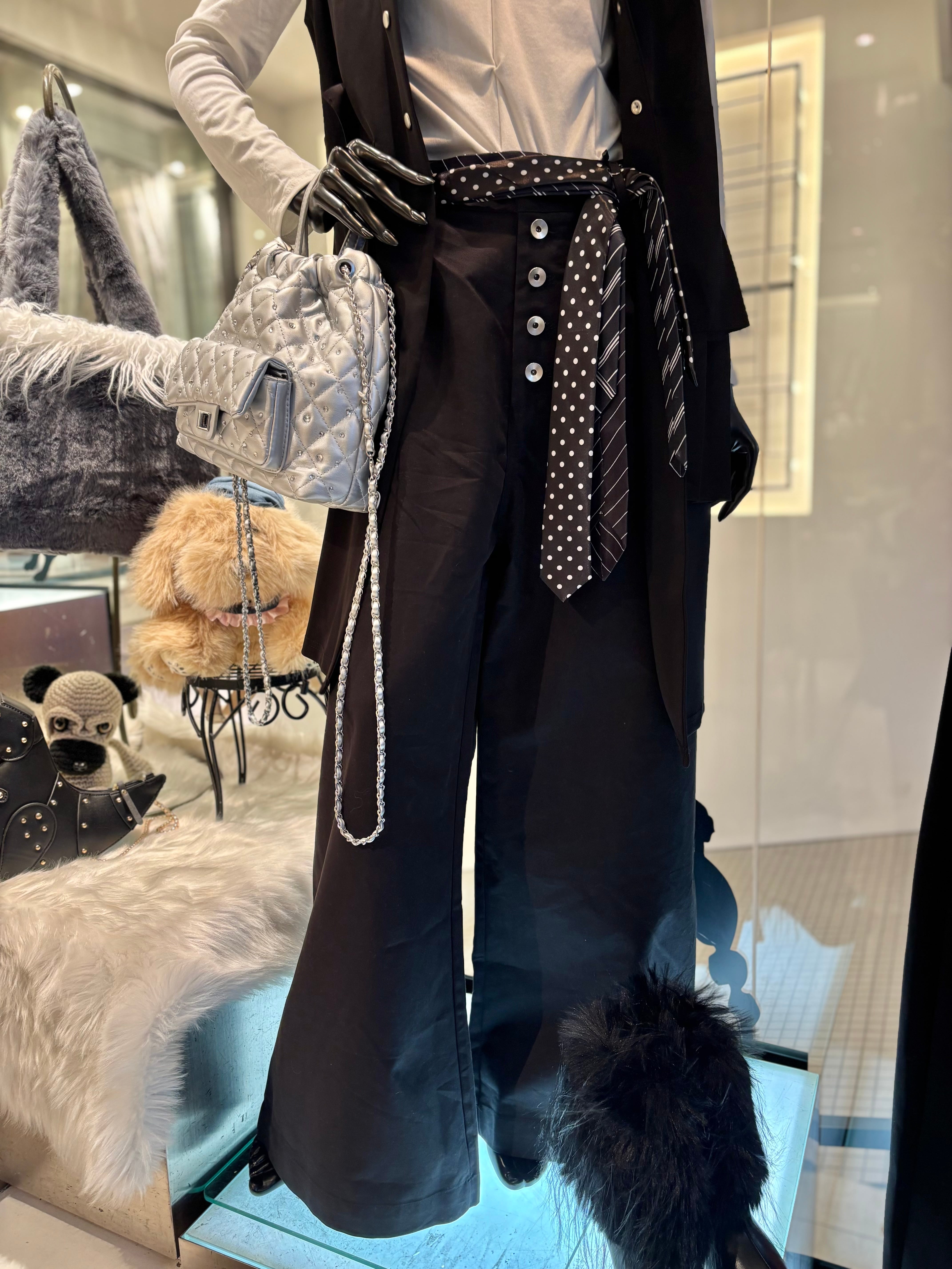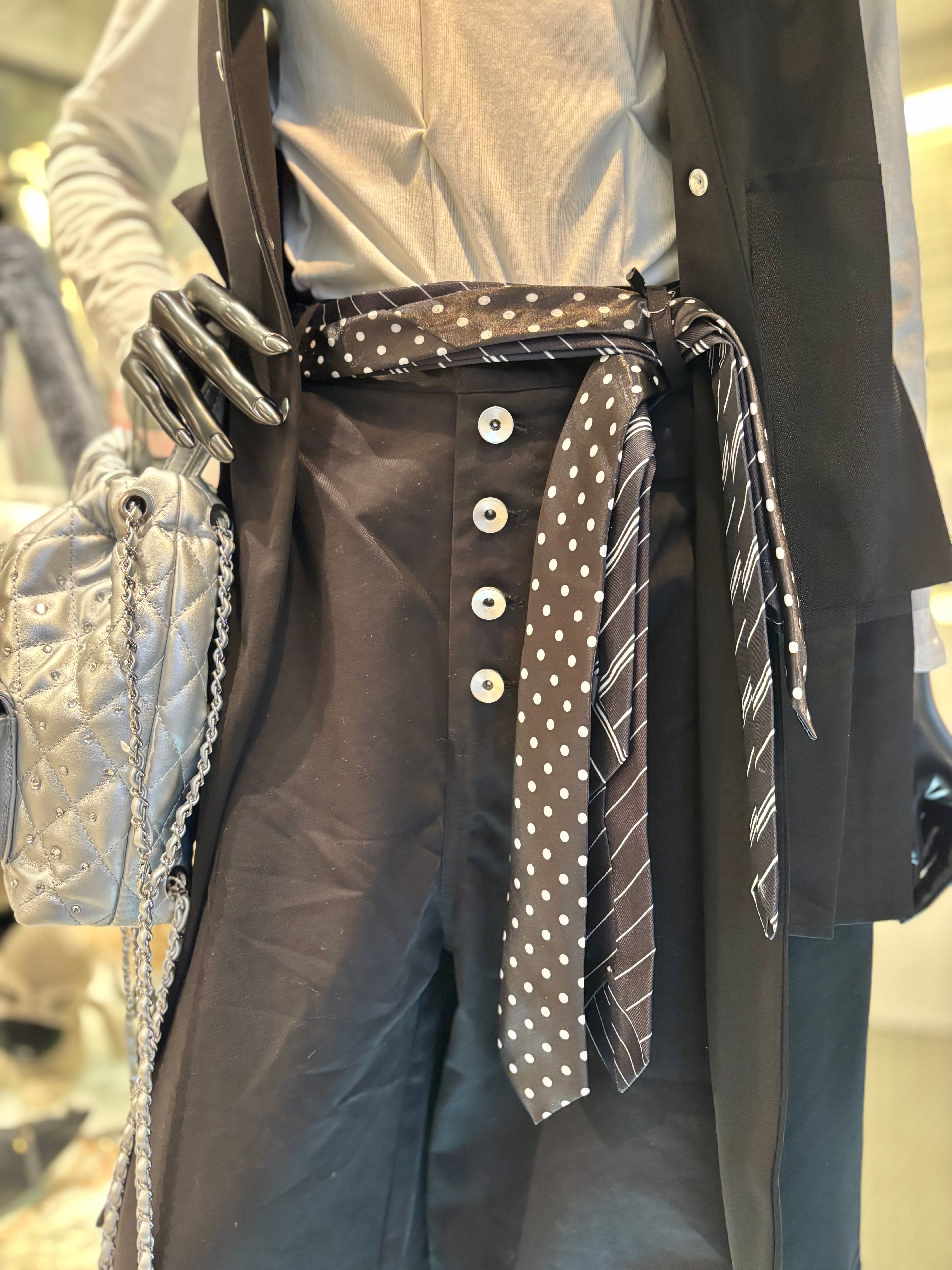 ボタン仕様が施されたフロントデザインと、ネクタイがベルトになったユニークなスタイルが魅力♡