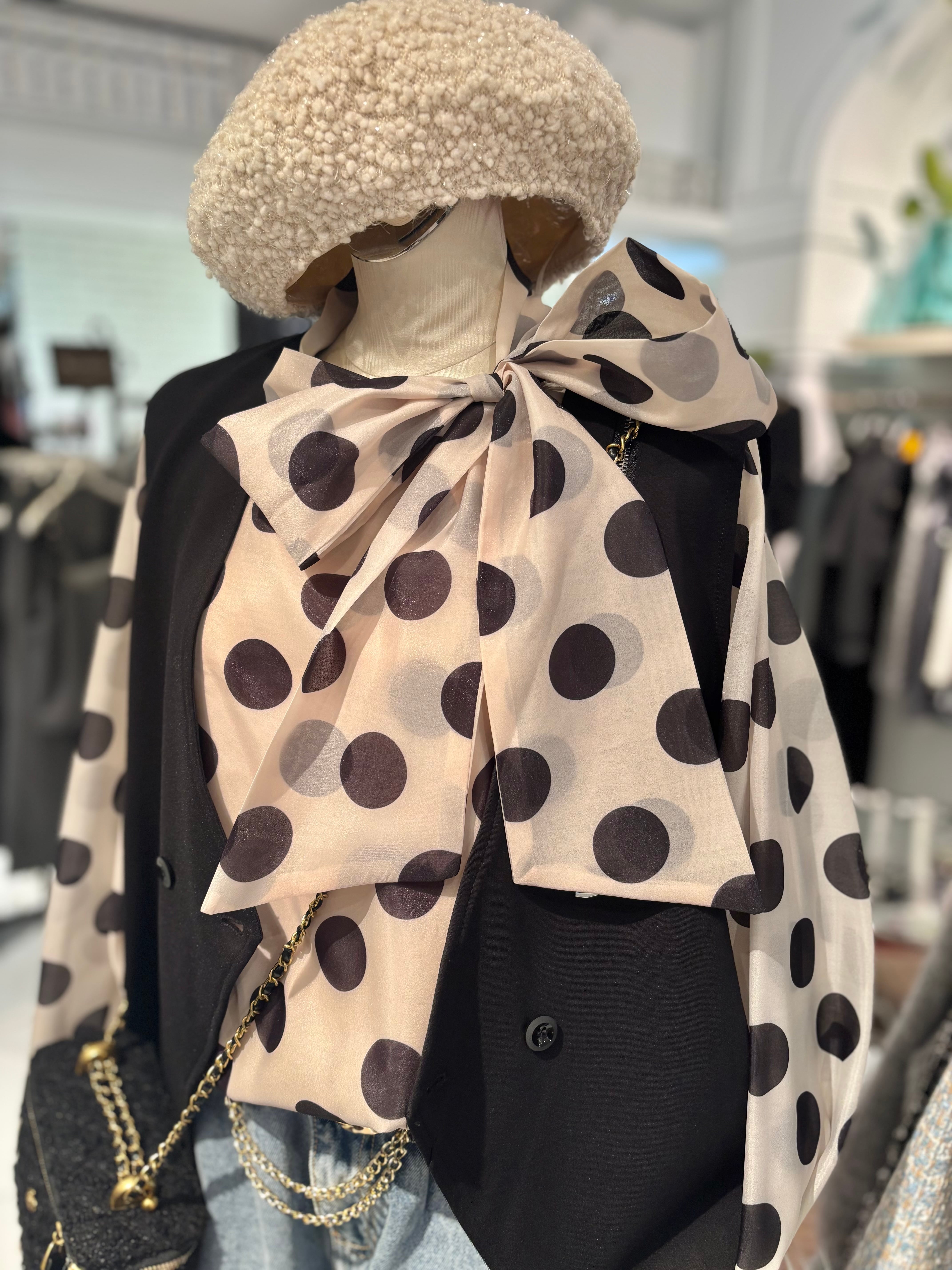 大きなドット柄が華やかさを引き立て、リボンタイが可愛いアクセントに!