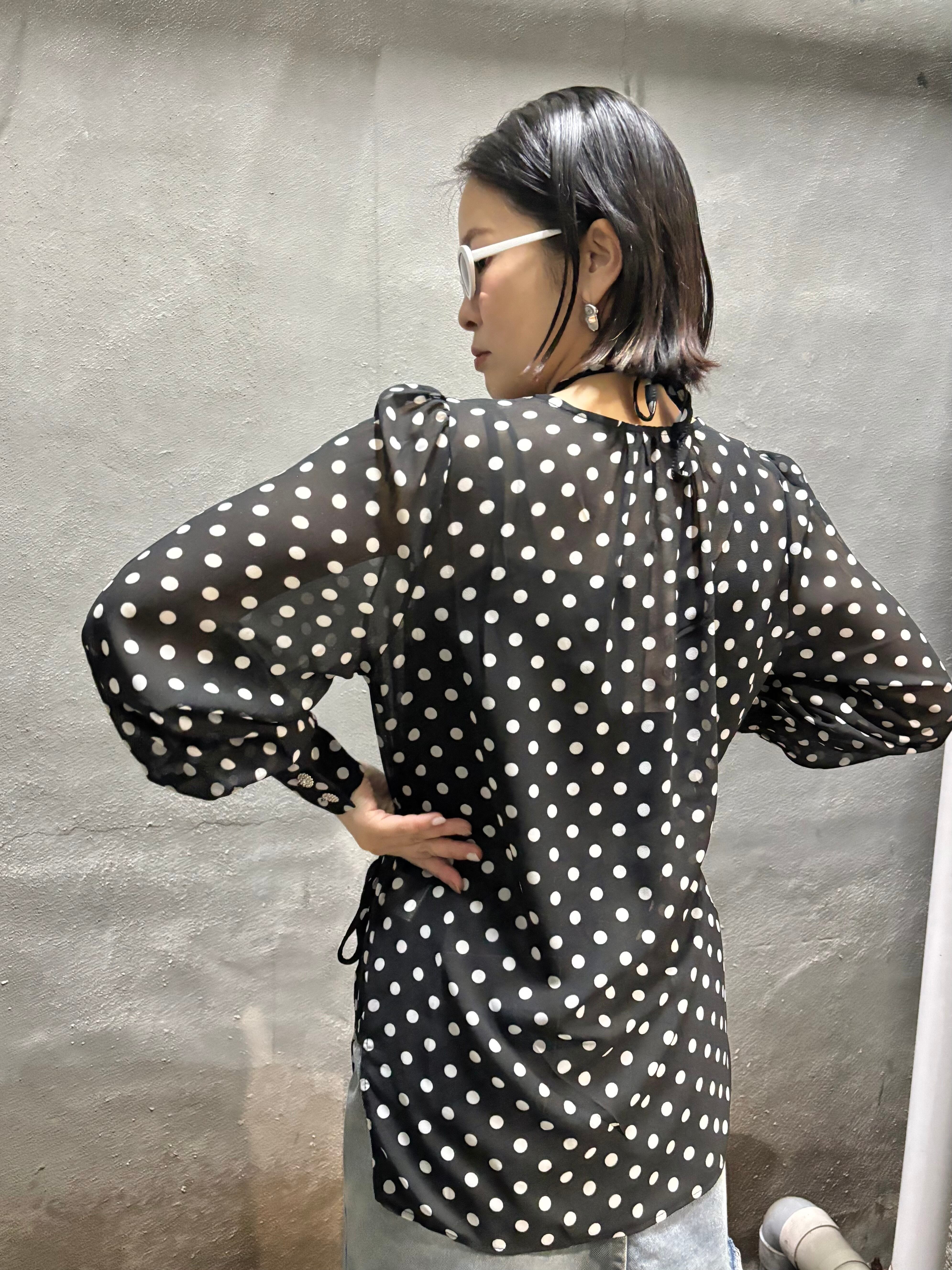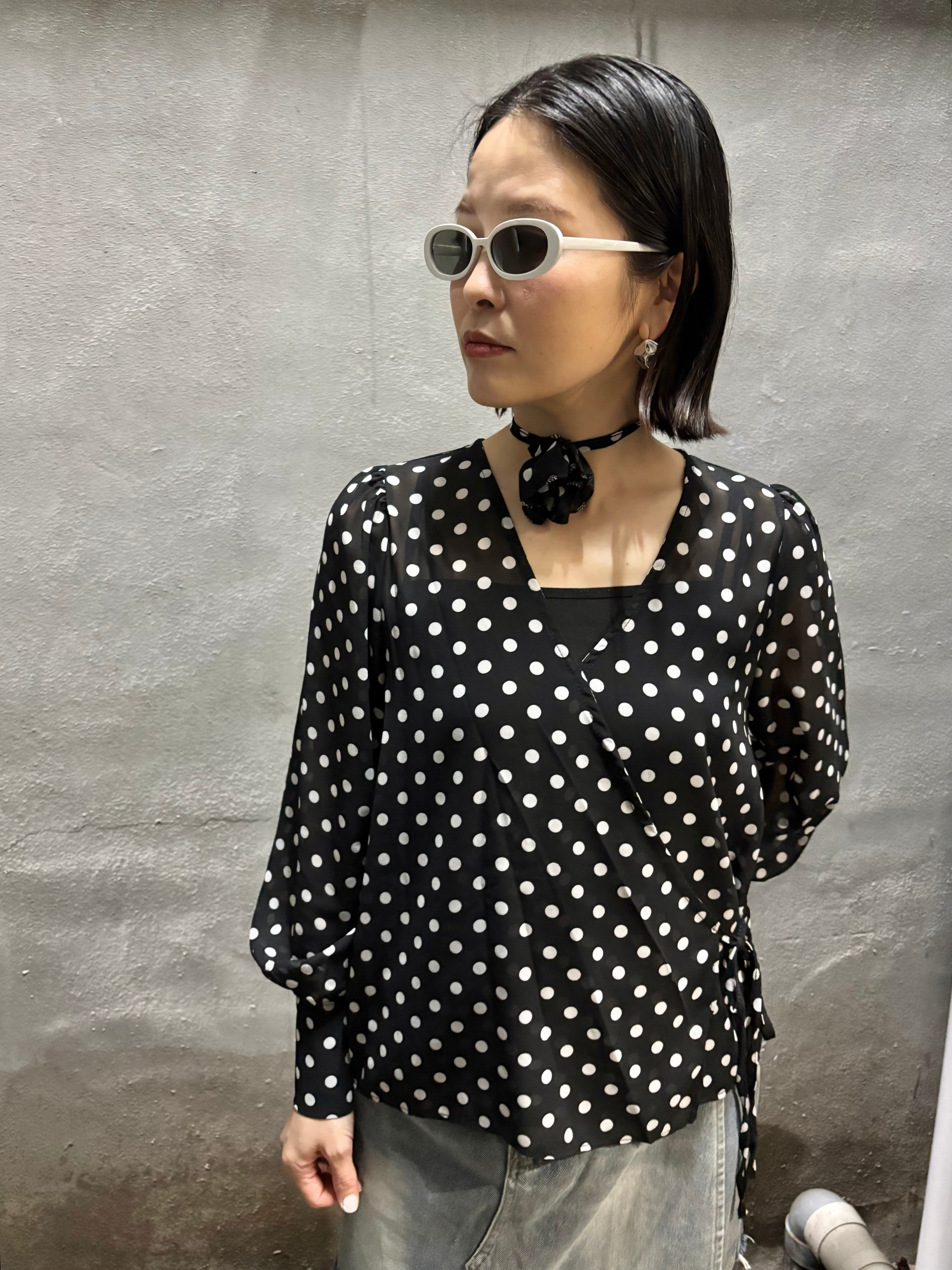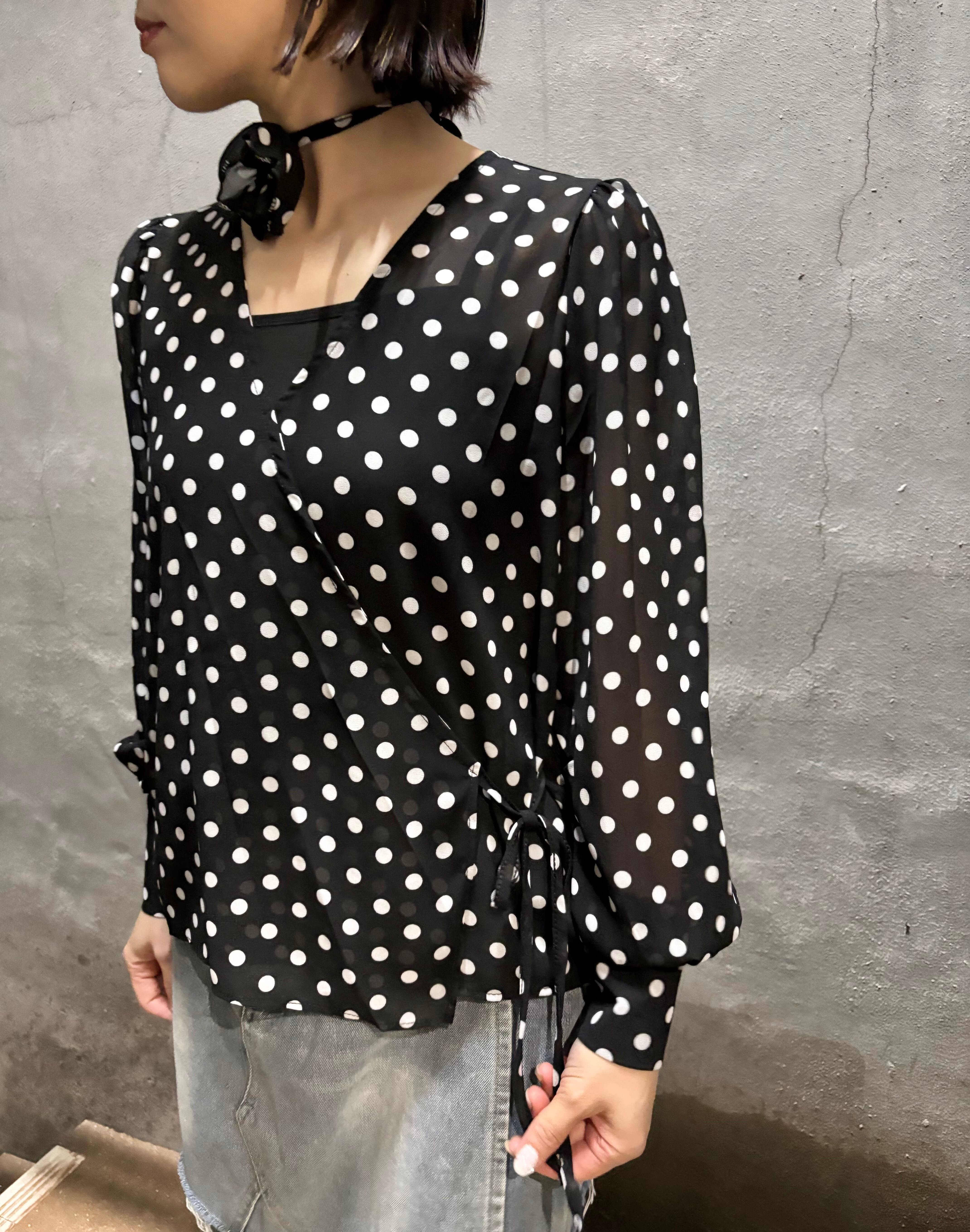 dot × chiffon cache-coeur V-neck design tops トップス カシュクール ドット 水玉 シフォン 白黒 シースルー