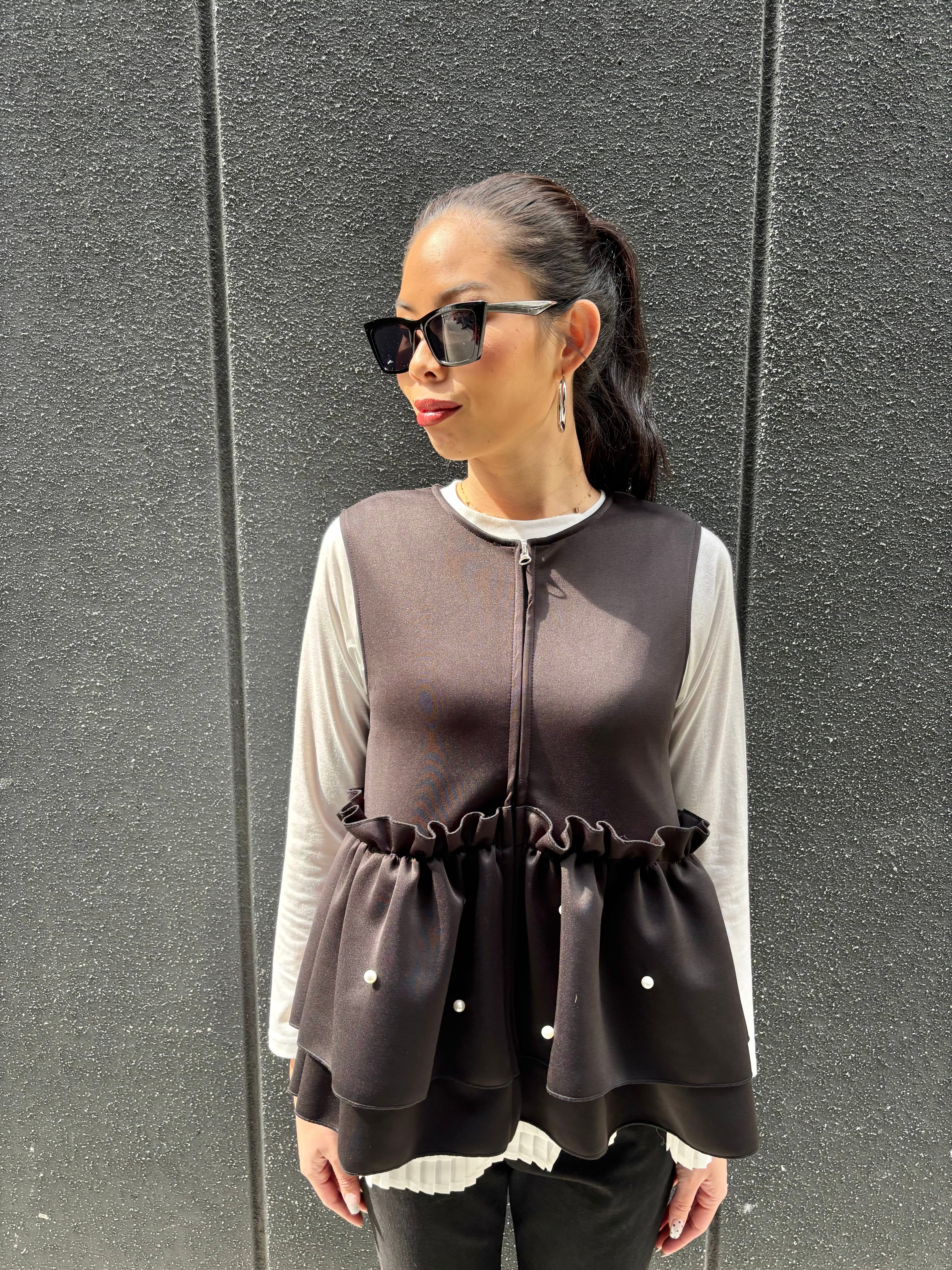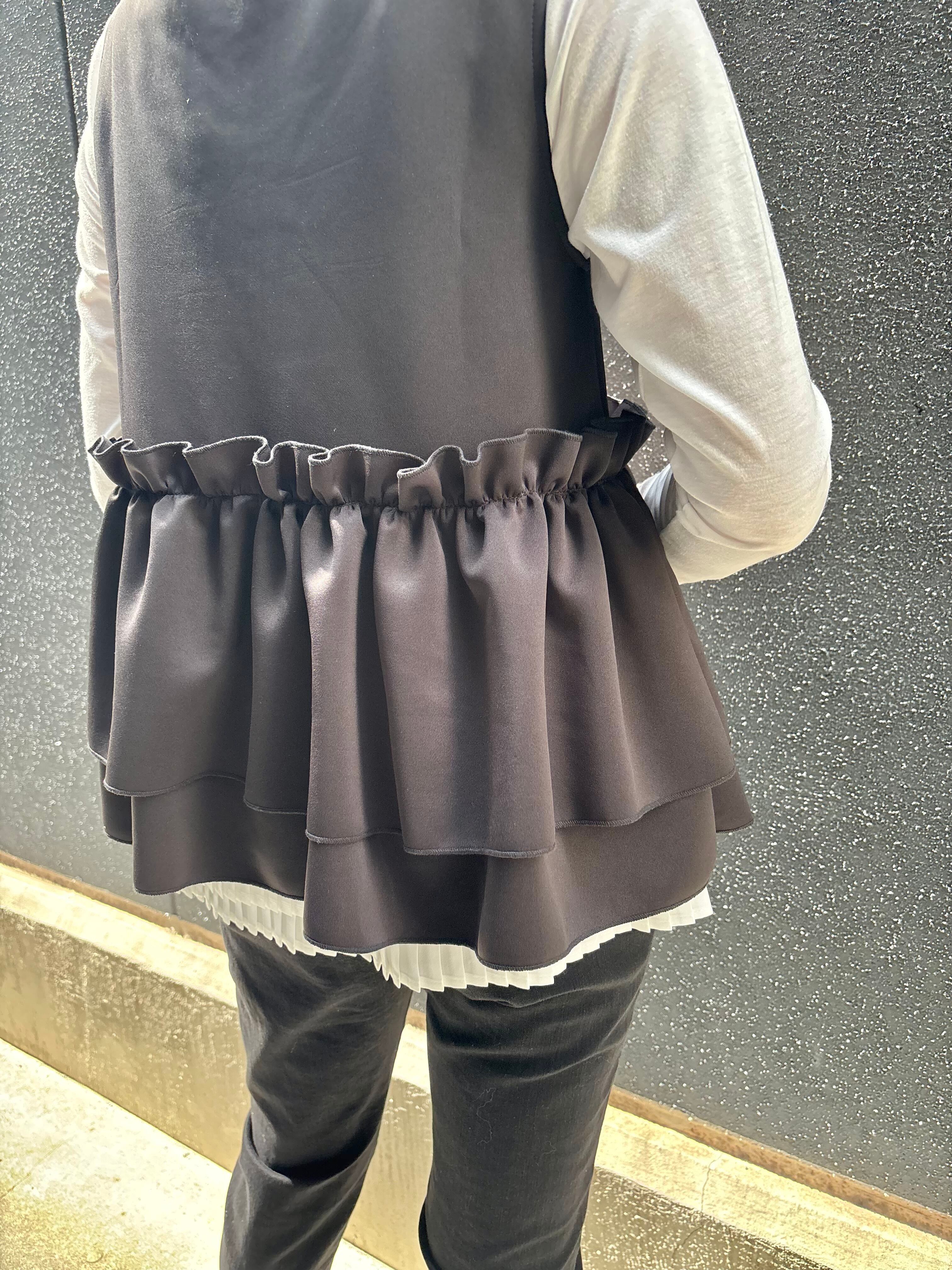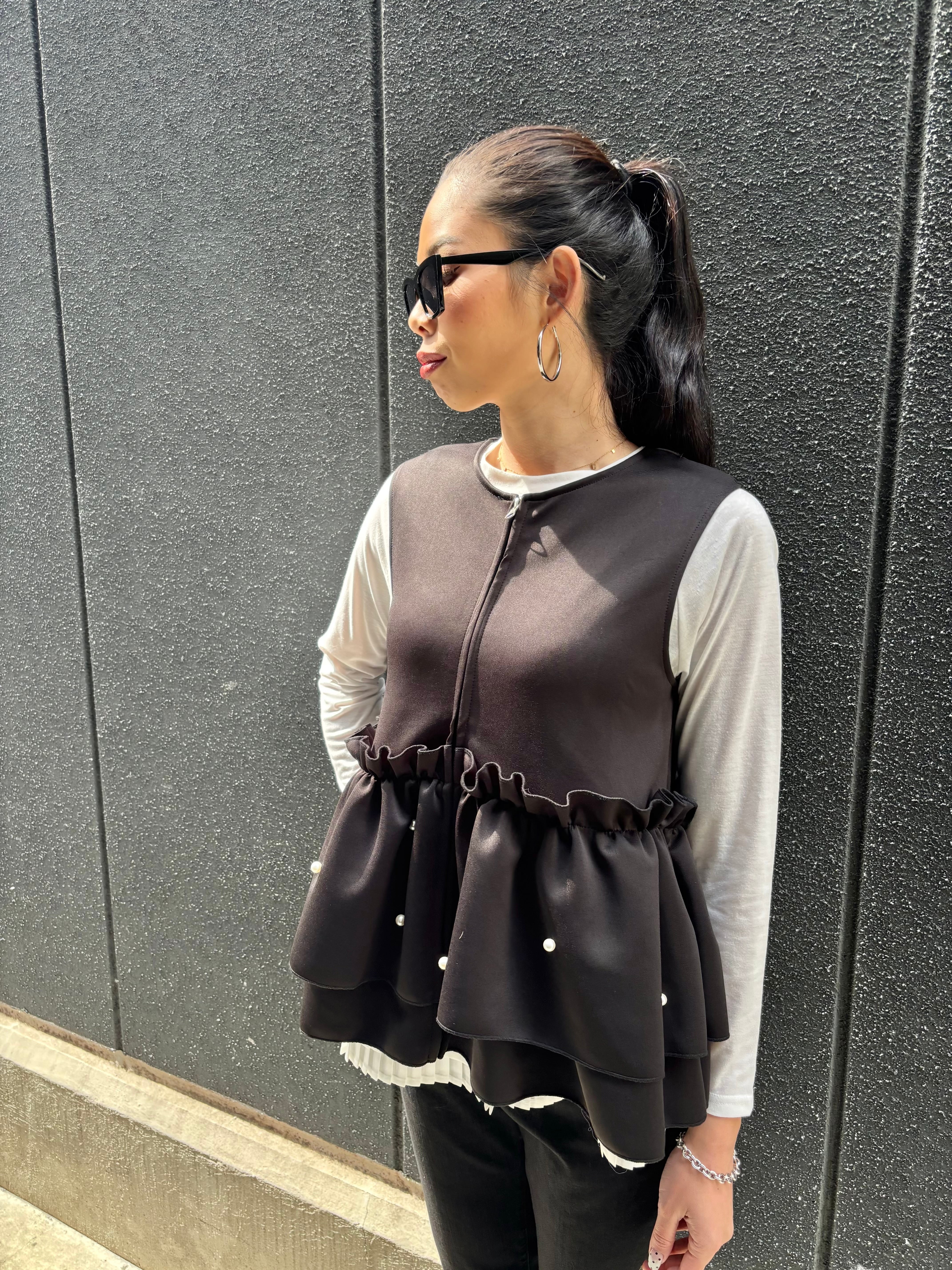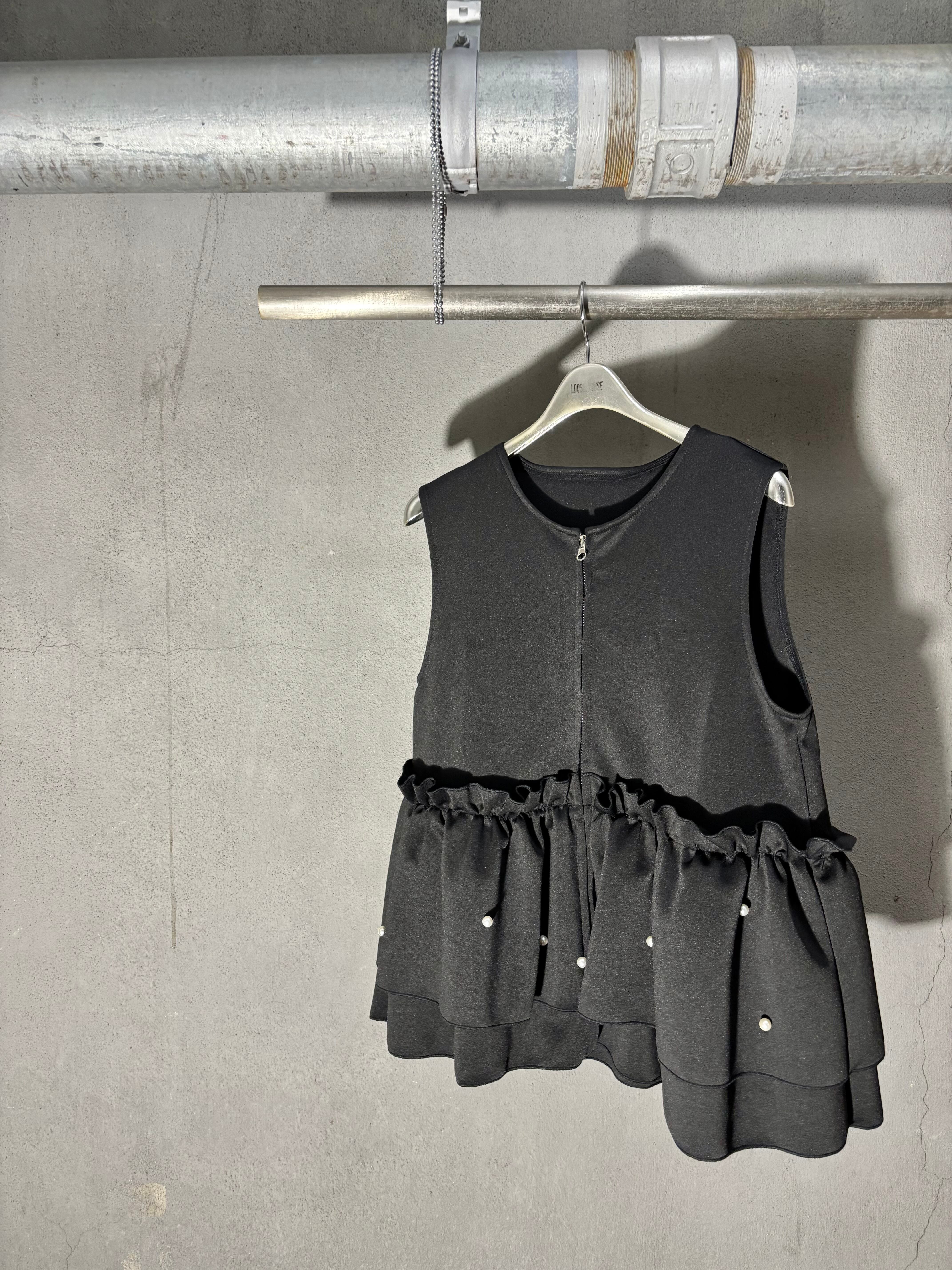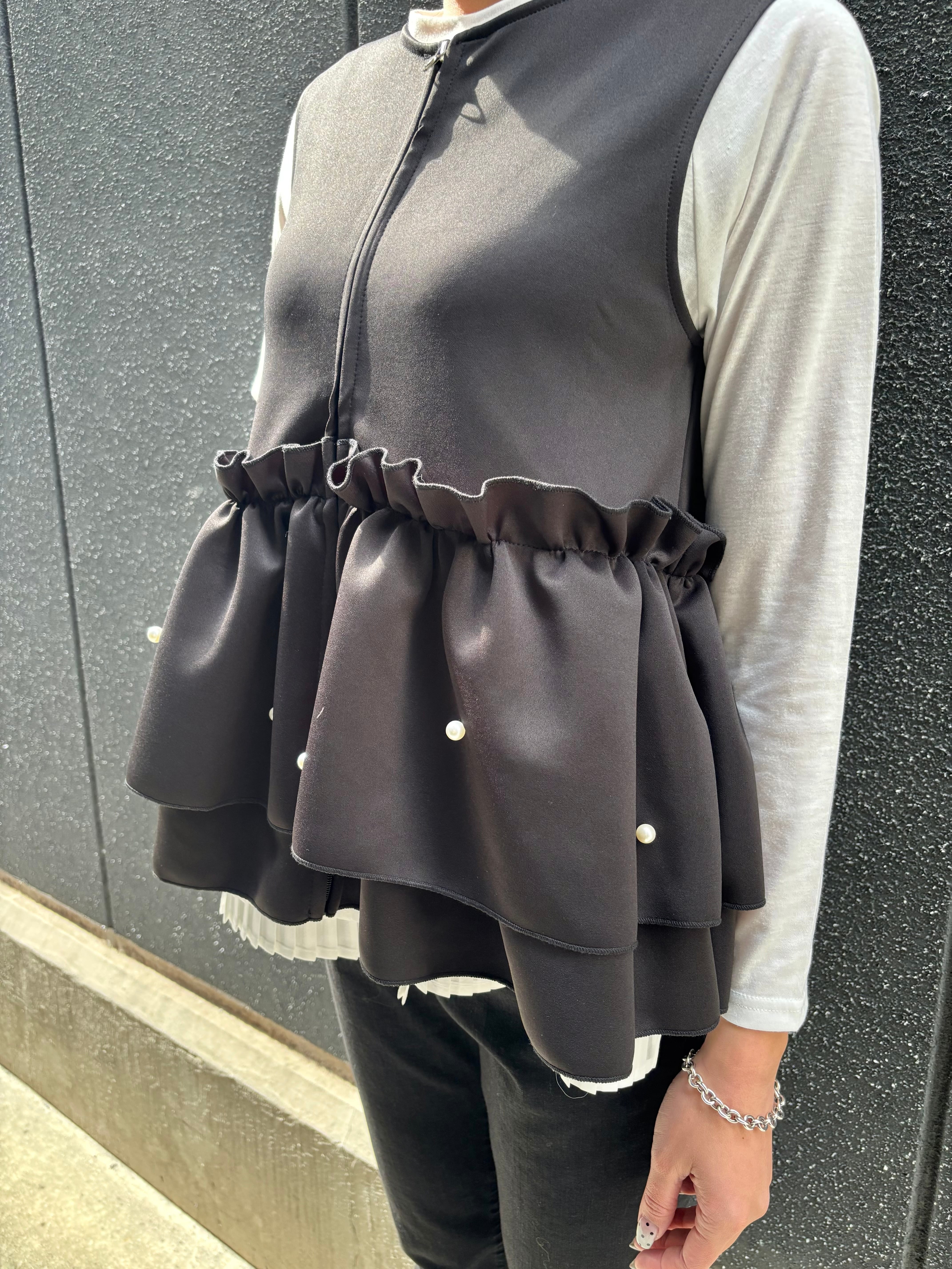 ester ponch pearl × frill zip up design tops トップス ベスト ジップアップ フリル パール ウレタン ブラック 黒 重ね着