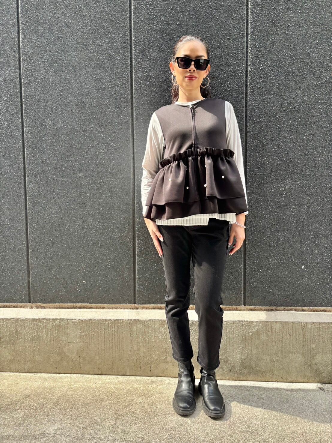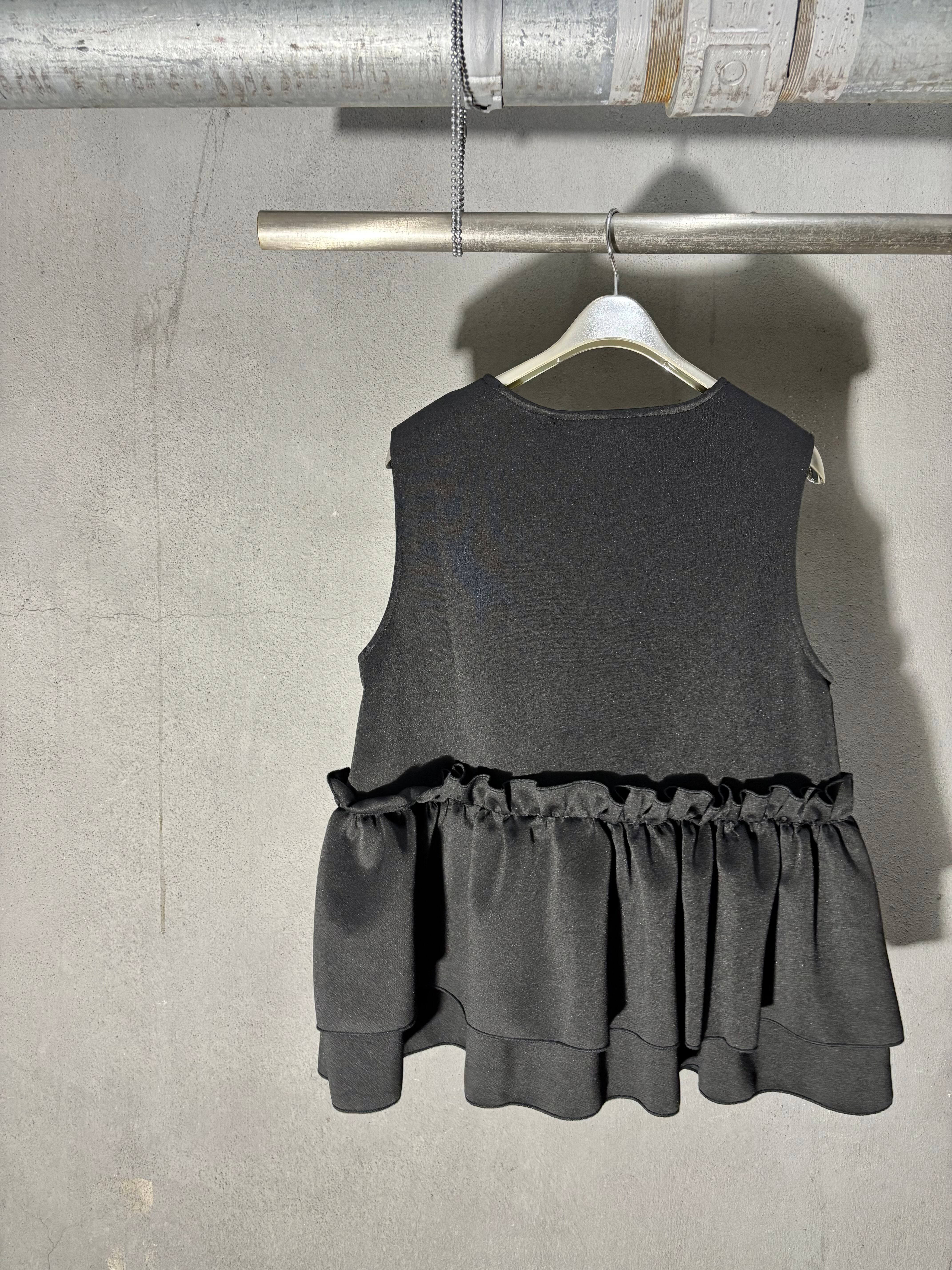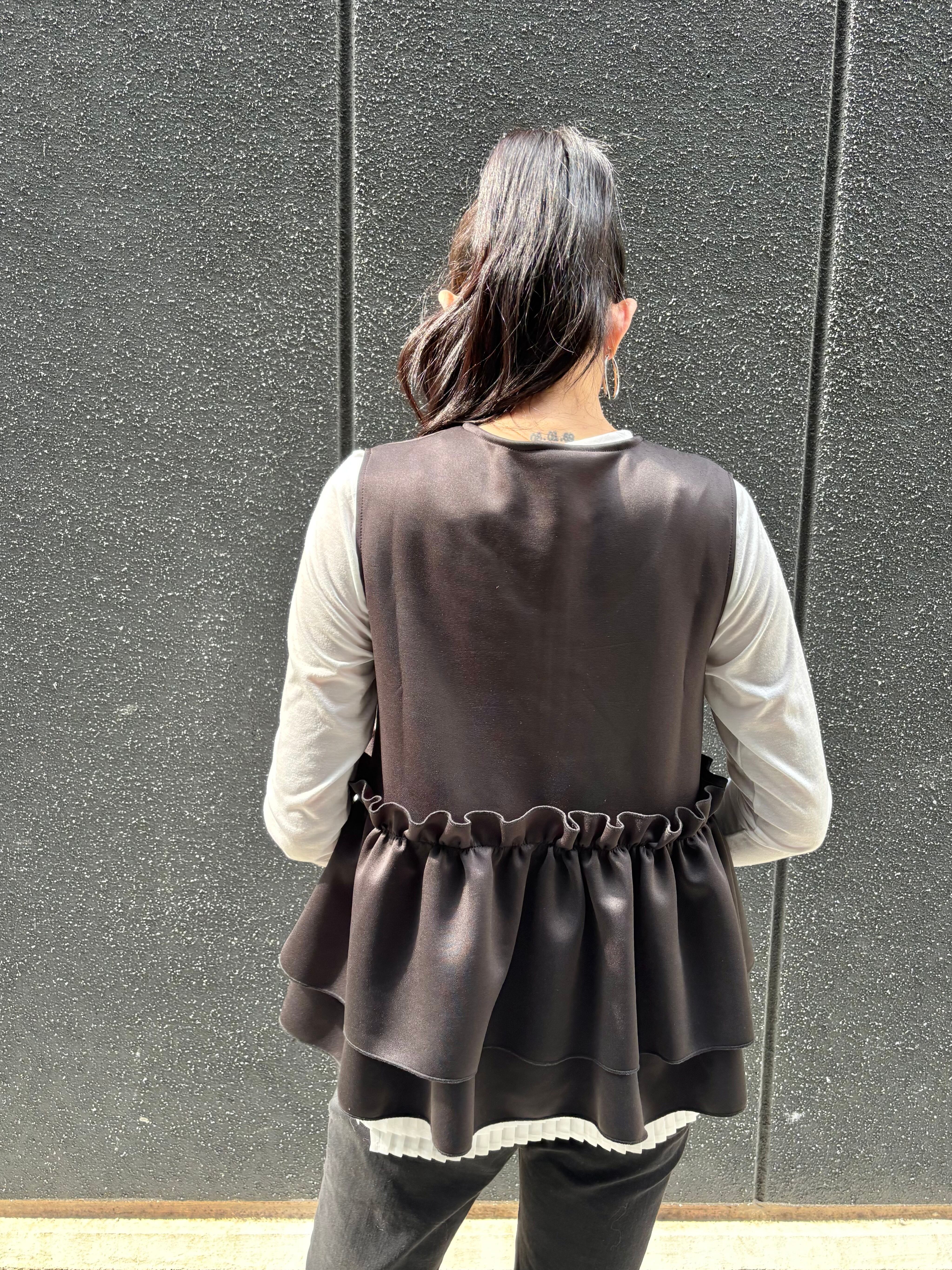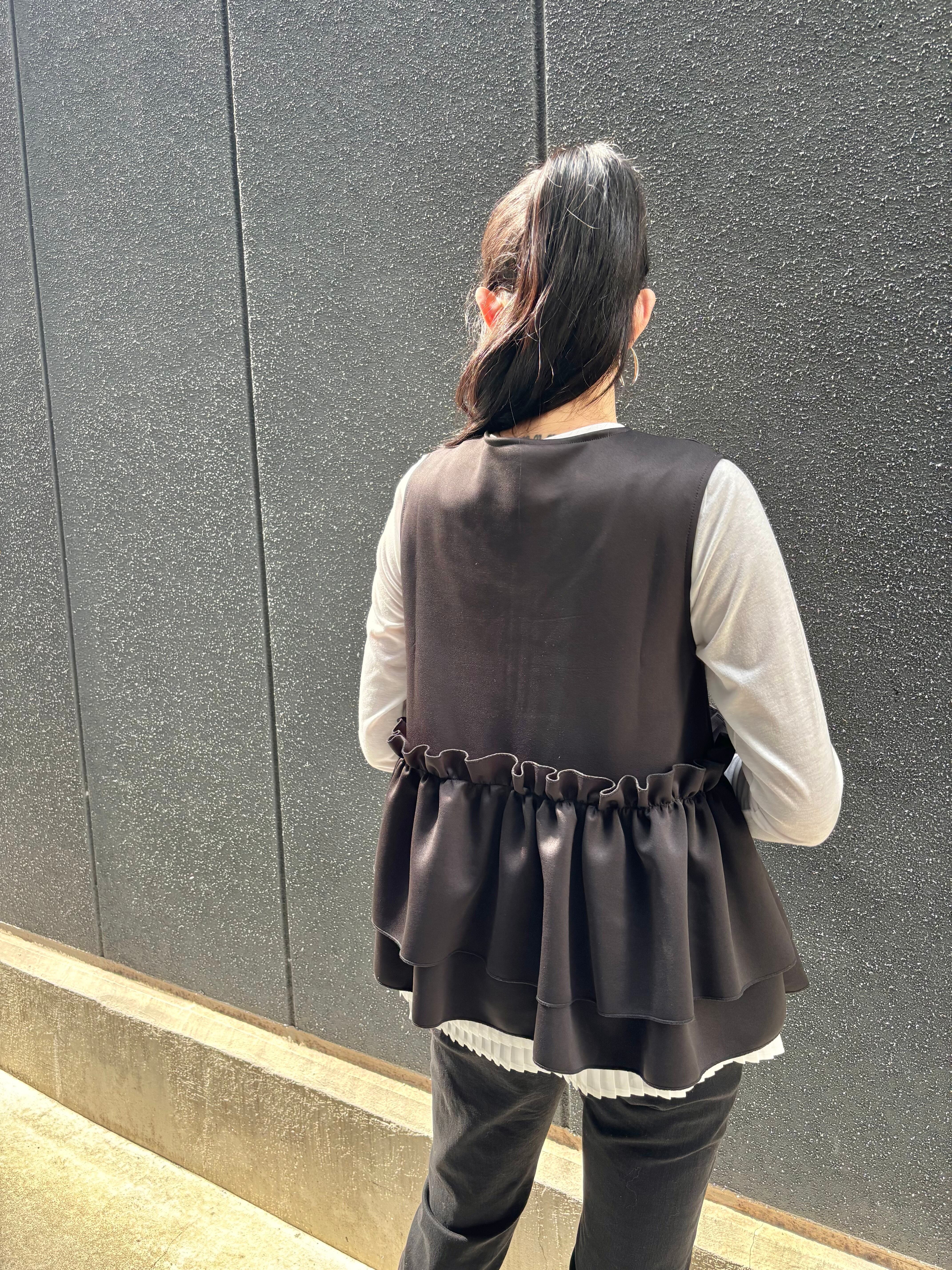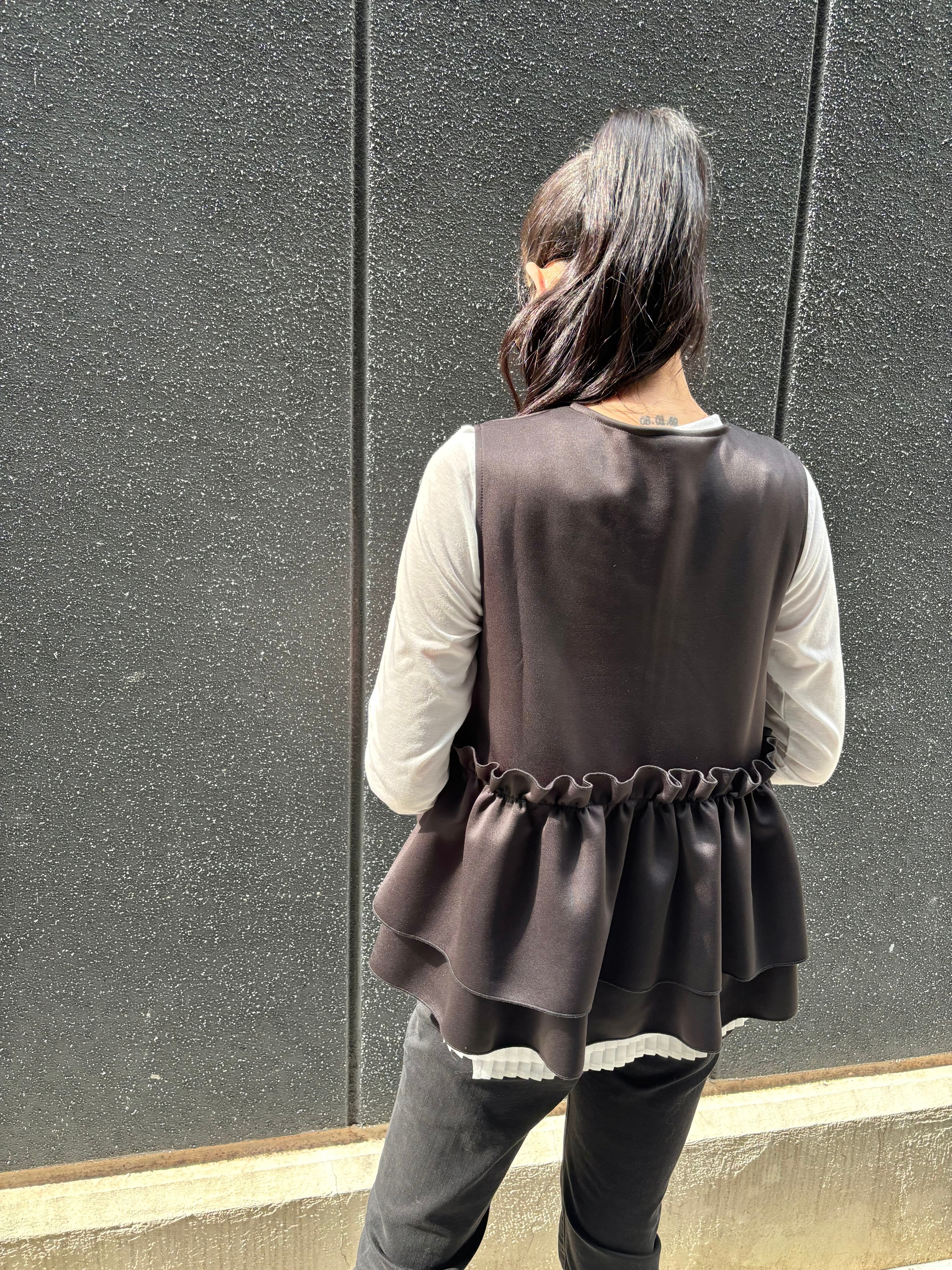 ester ponch pearl × frill zip up design tops トップス ベスト ジップアップ フリル パール ウレタン ブラック 黒 重ね着