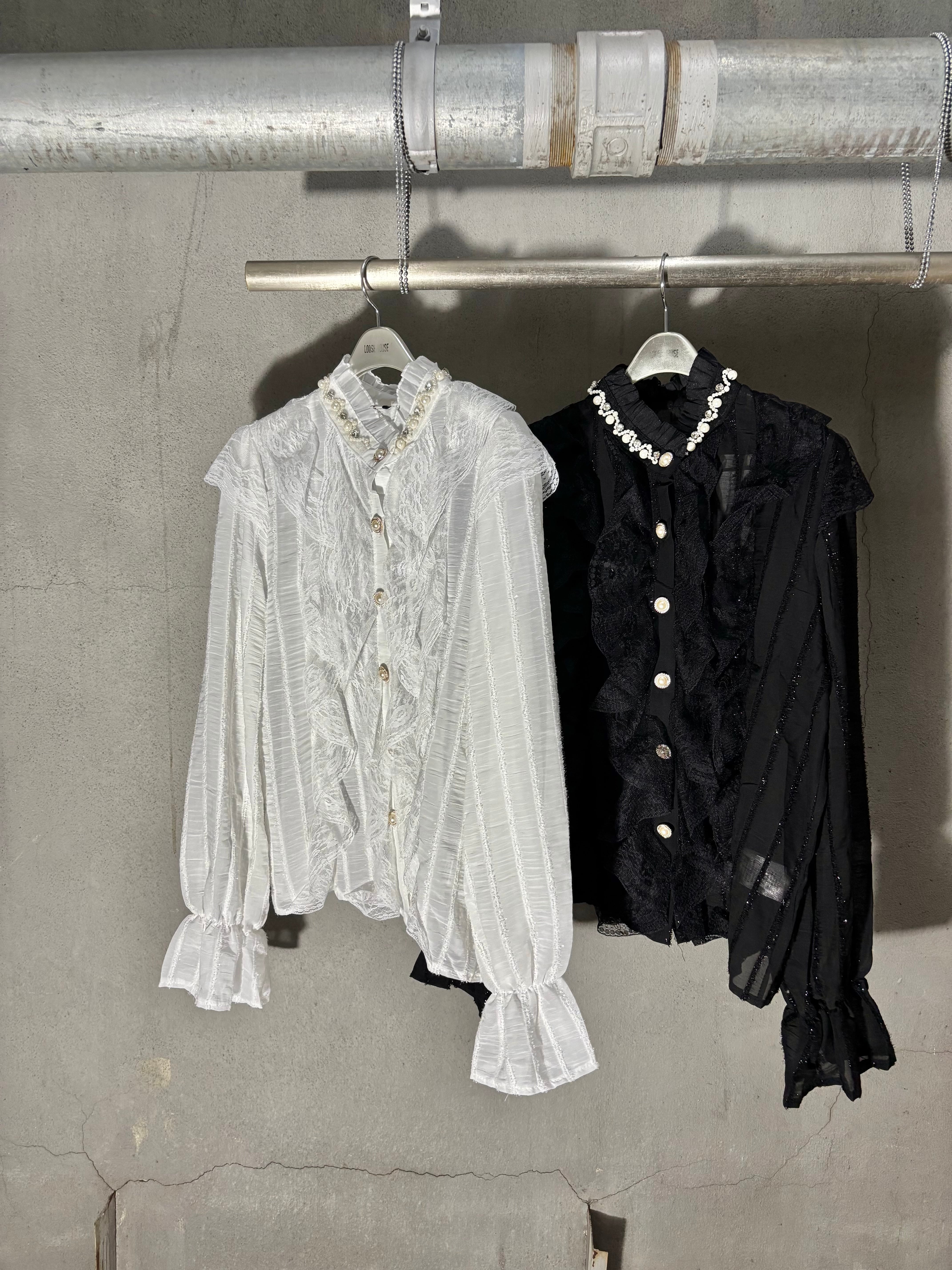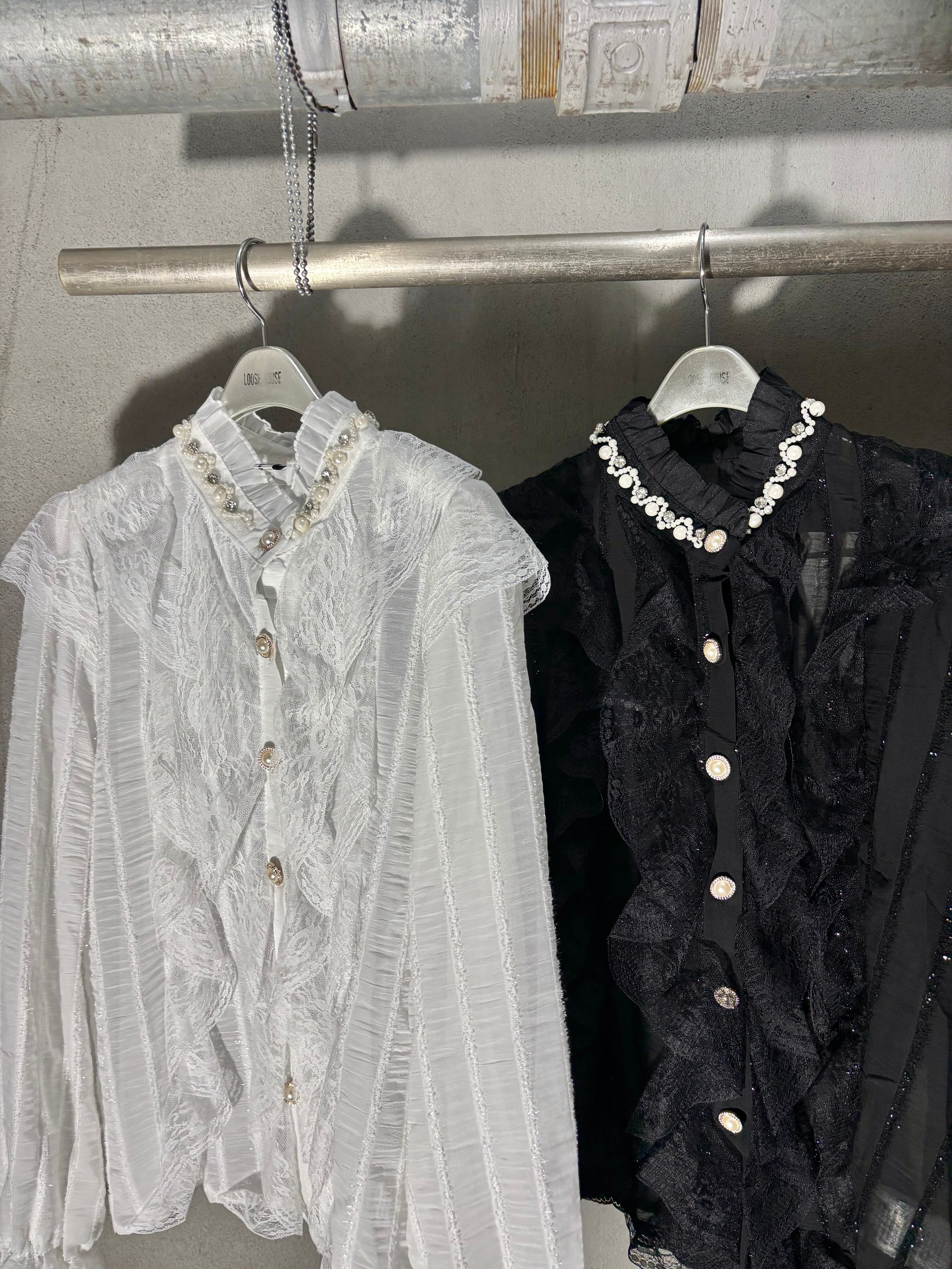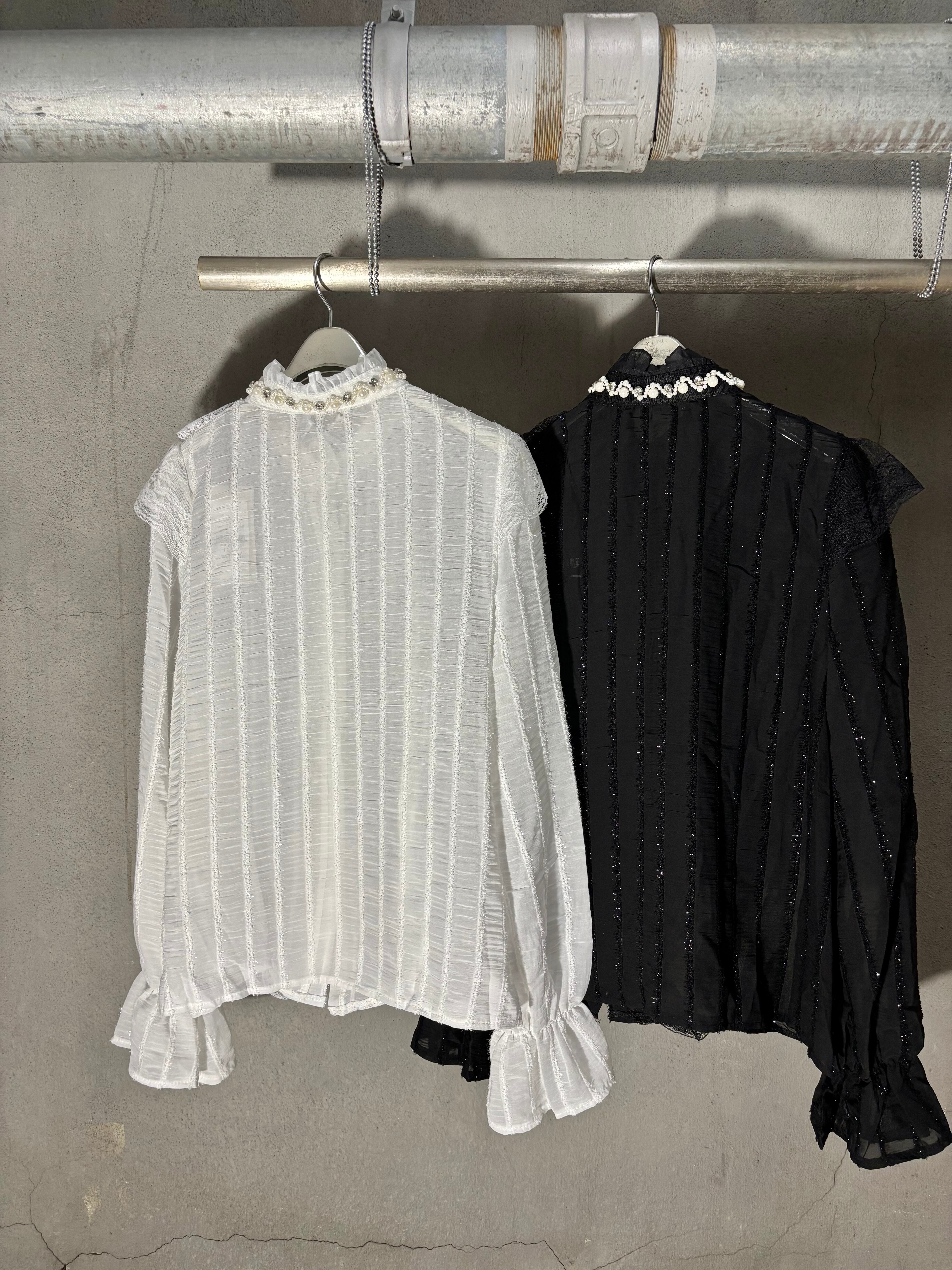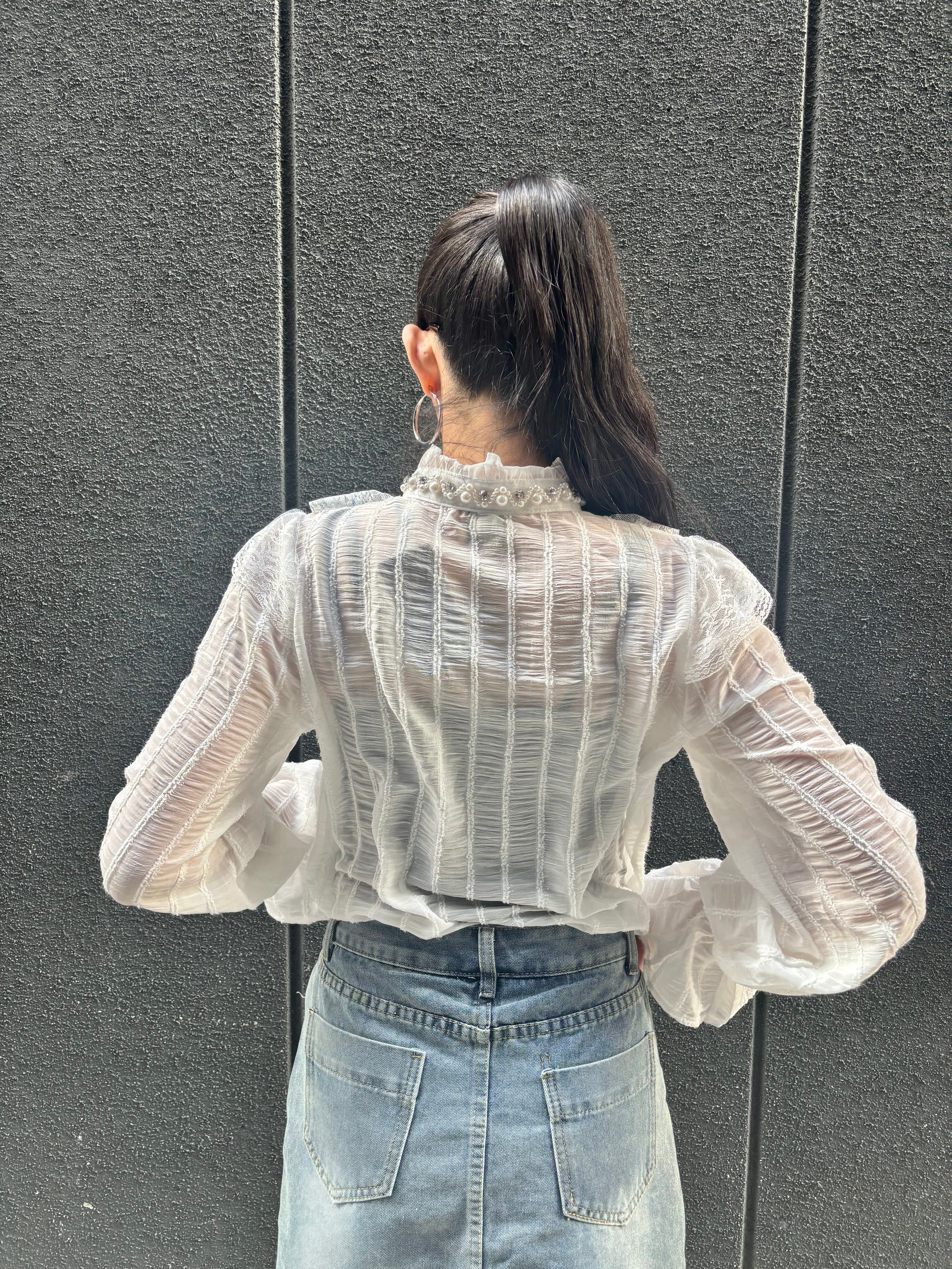 chiffon film stripe × lace design shirt シャツ ブラウス シフォン レース フィルム パール ビジュー