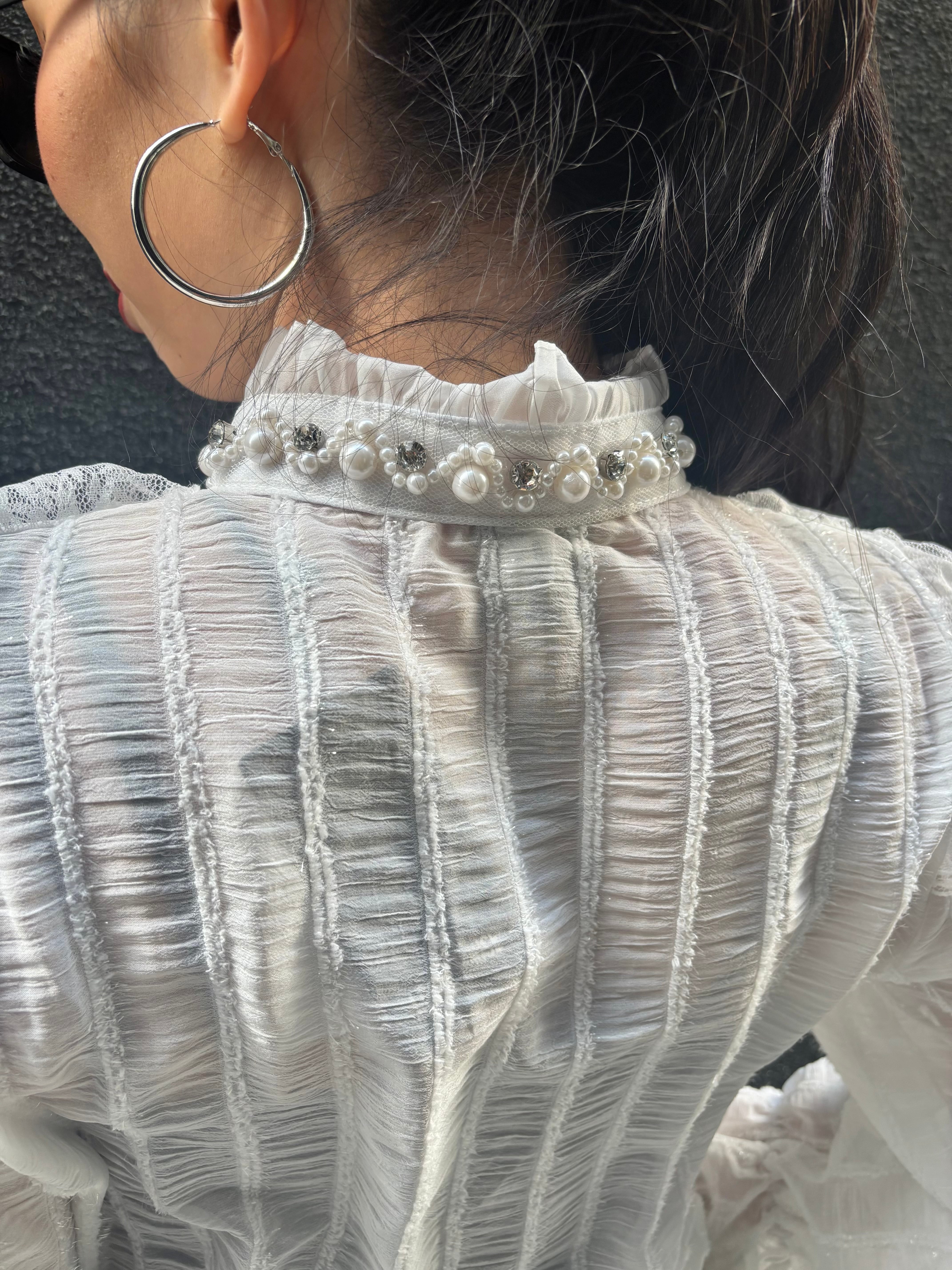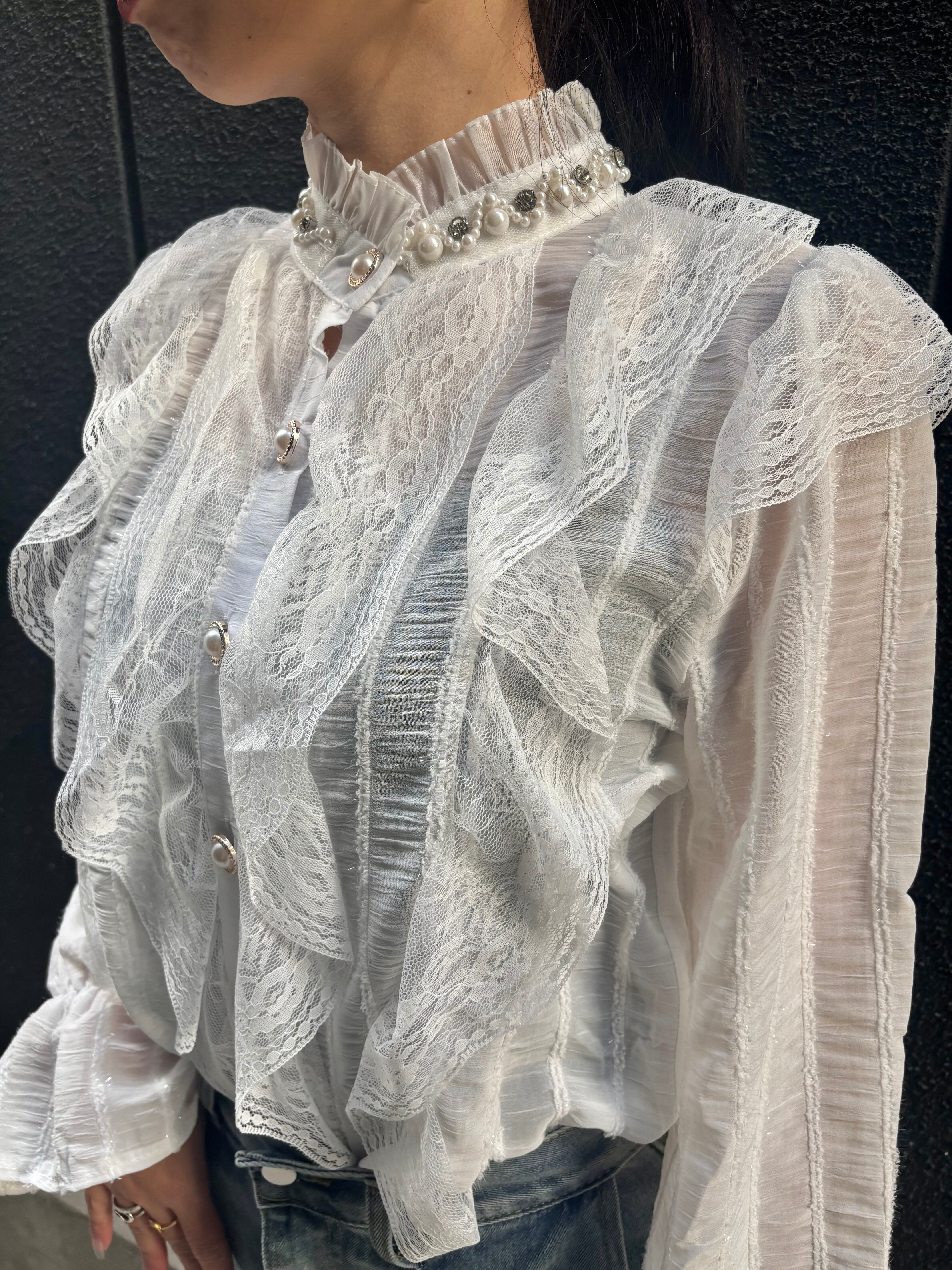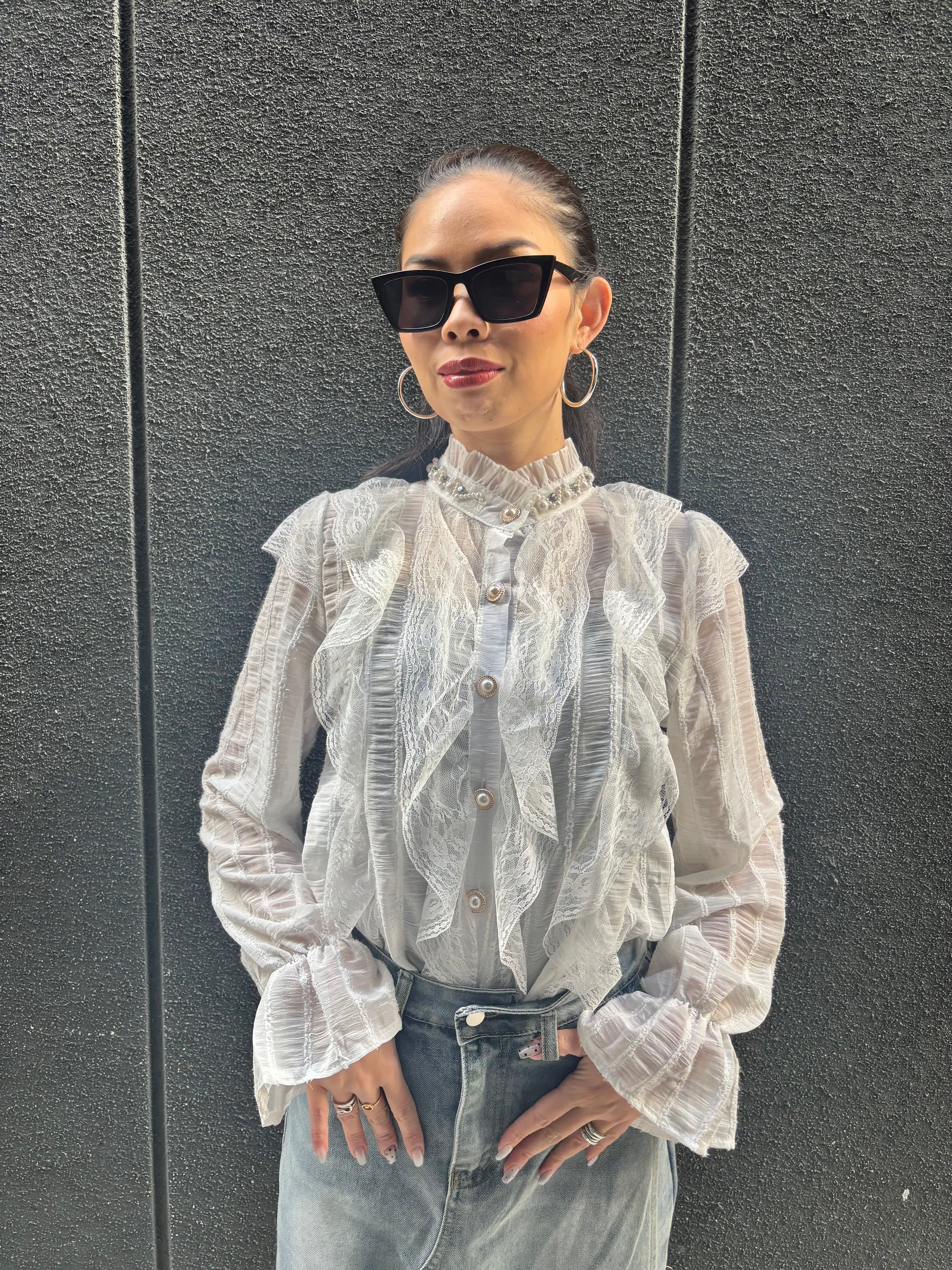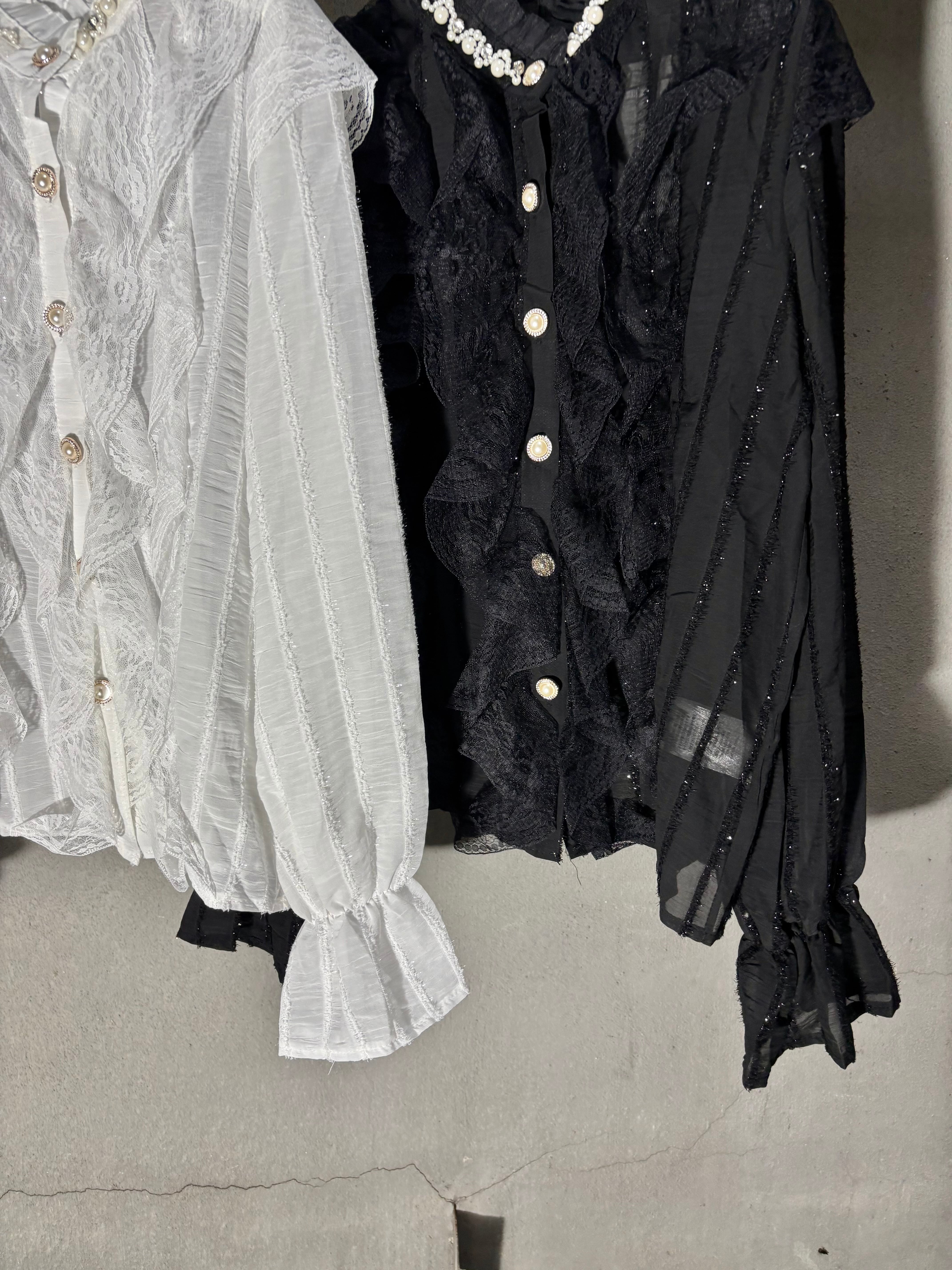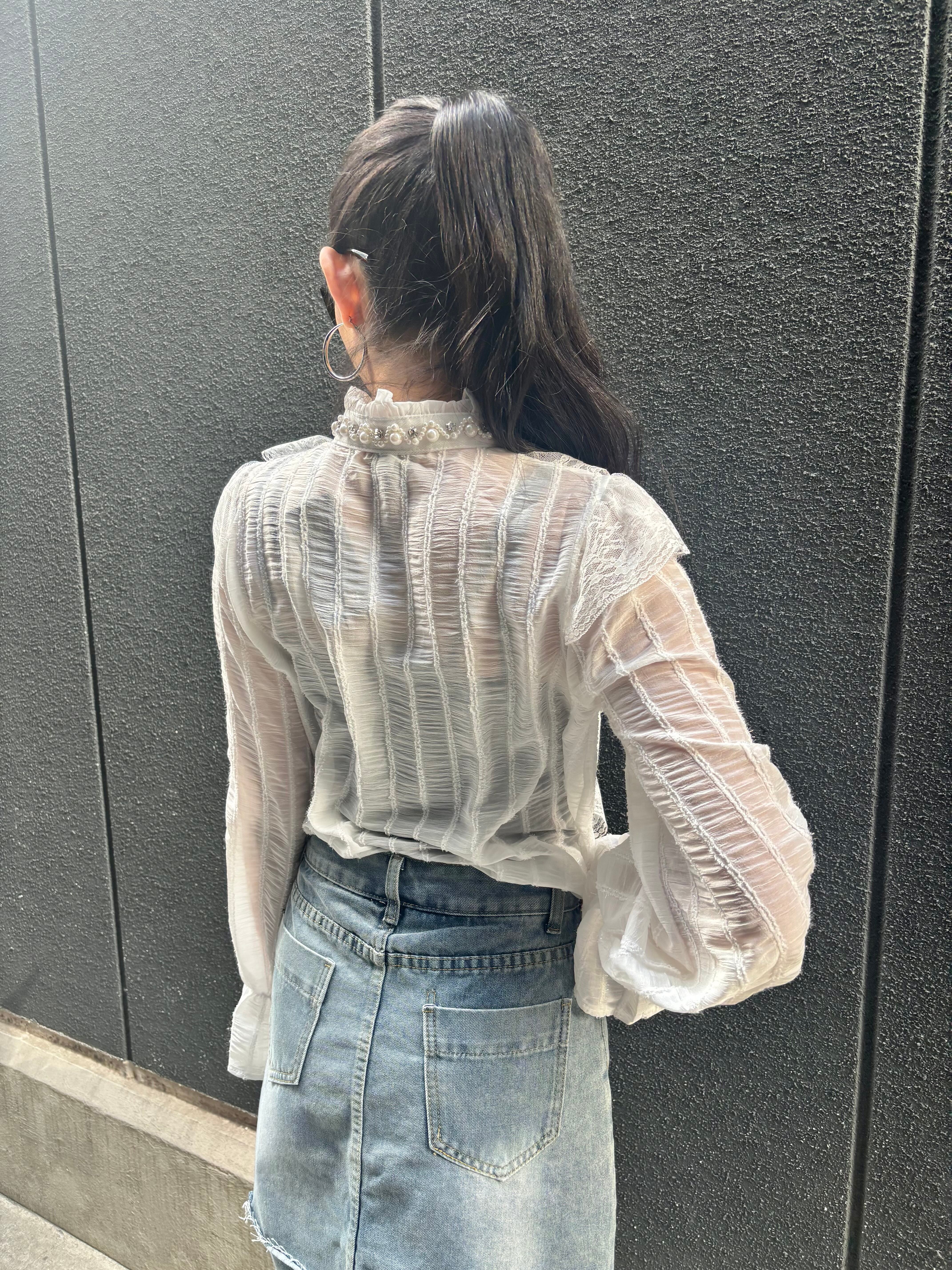 chiffon film stripe × lace design shirt シャツ ブラウス シフォン レース フィルム パール ビジュー