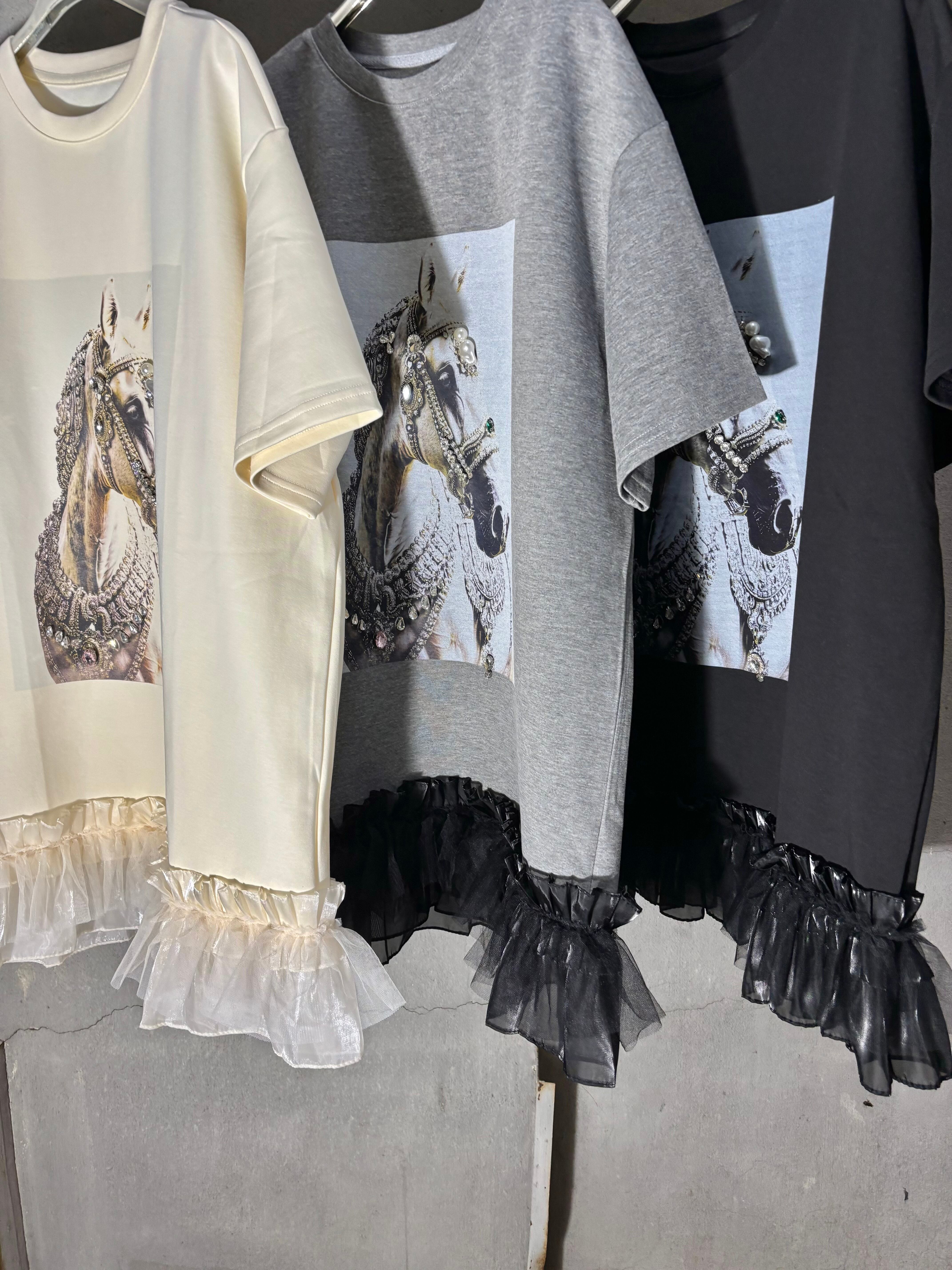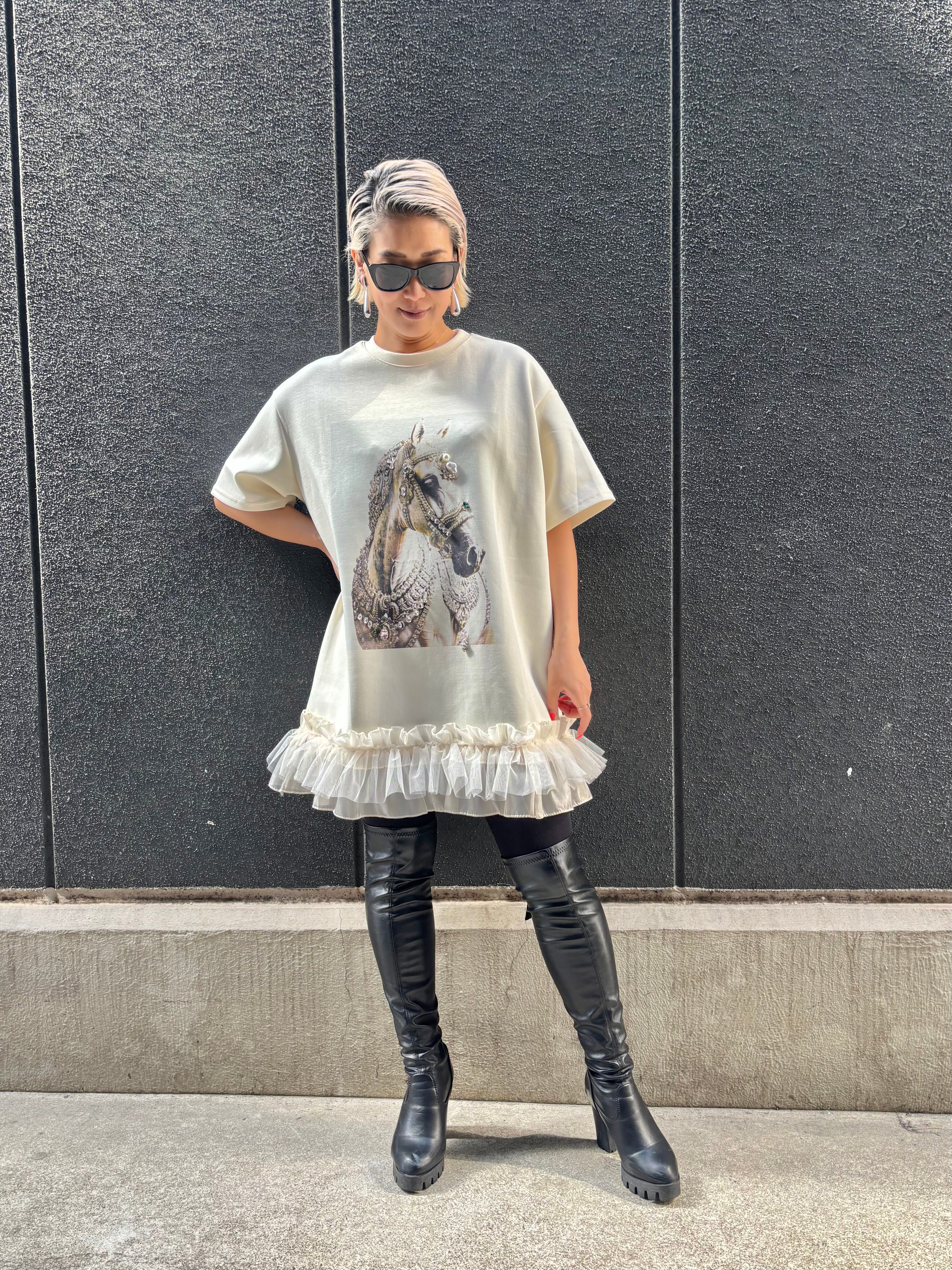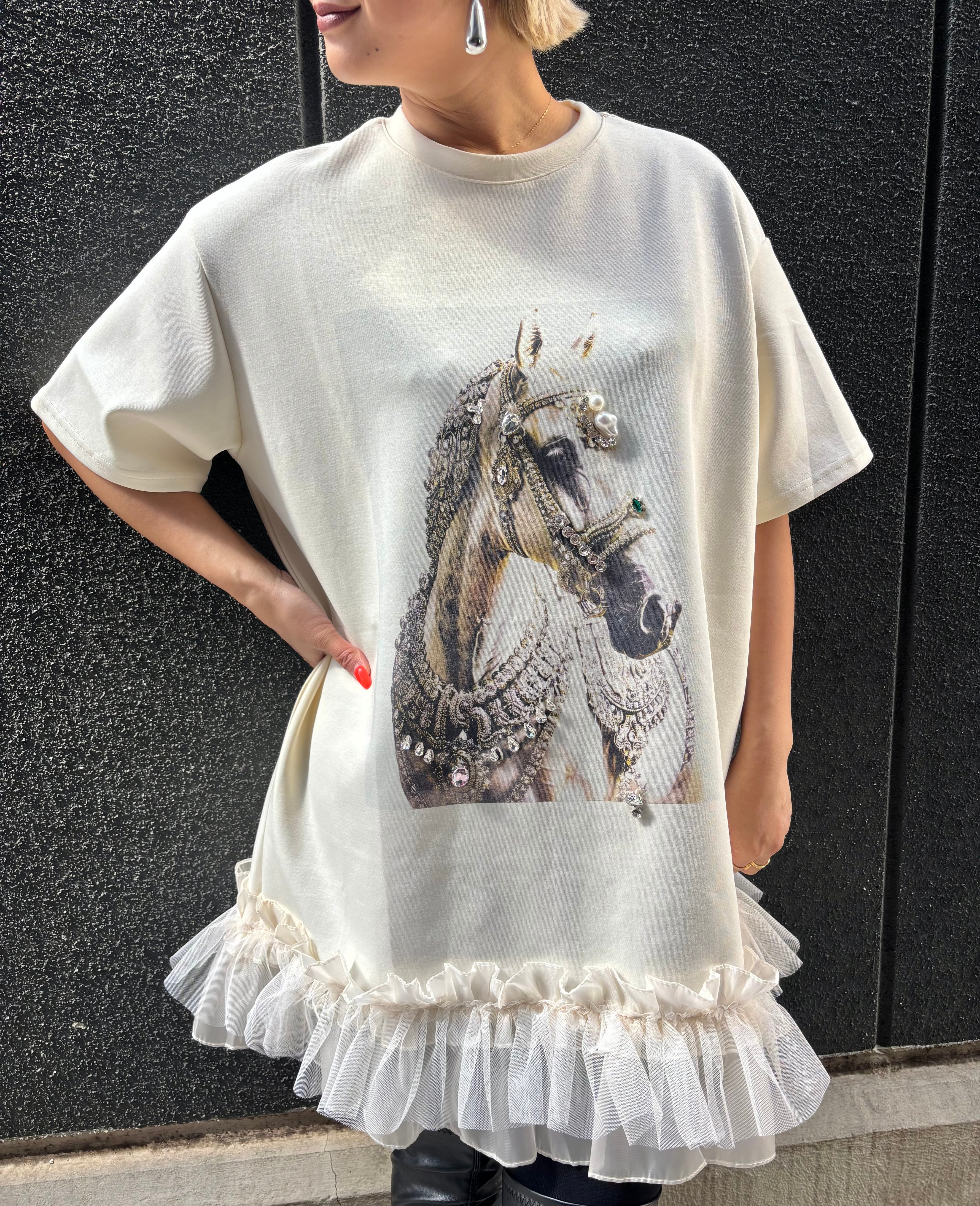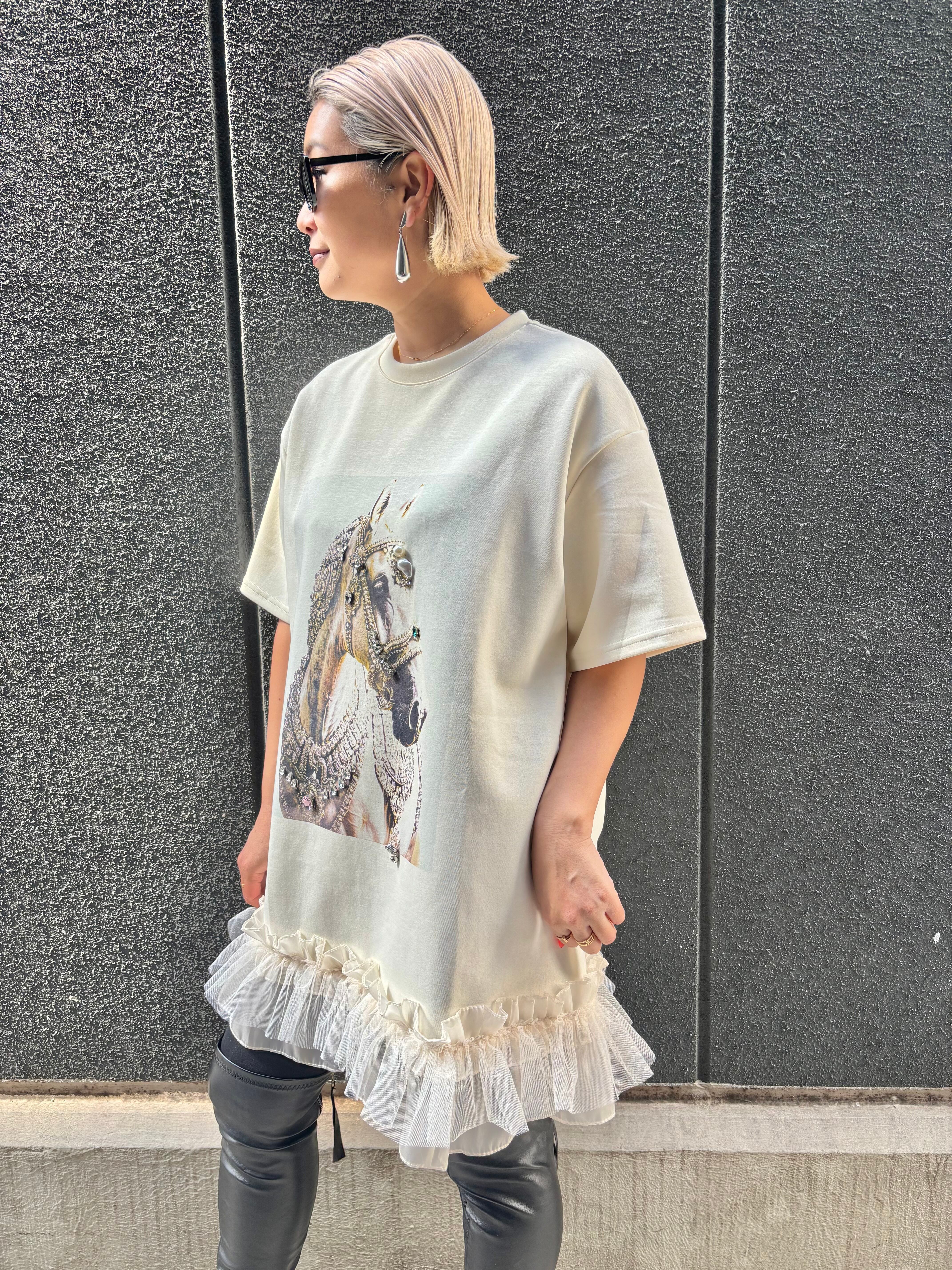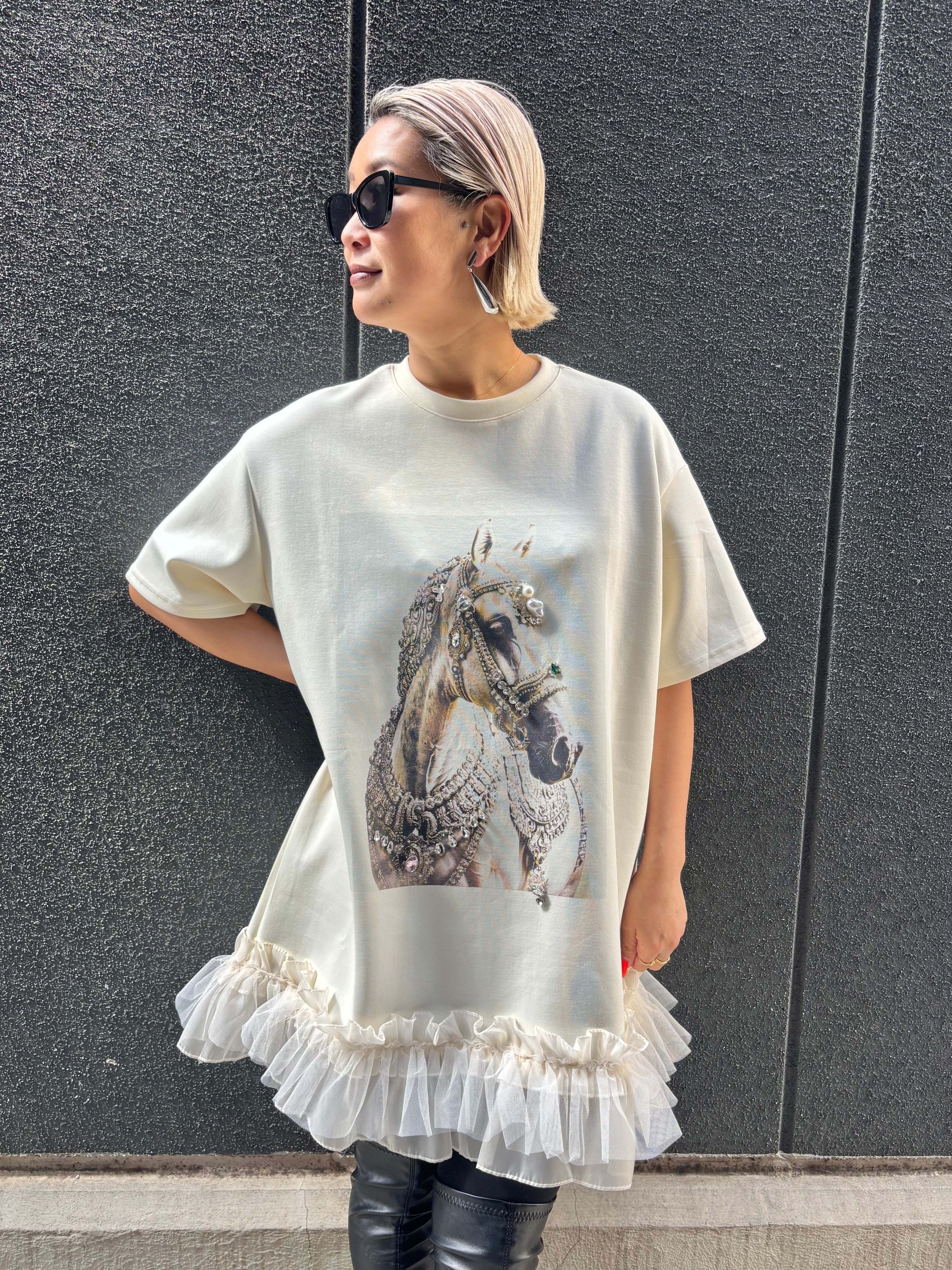 decoration horse × frill hem design ester ponch tunic チュニック プリント ホース フリル ビジュー パール