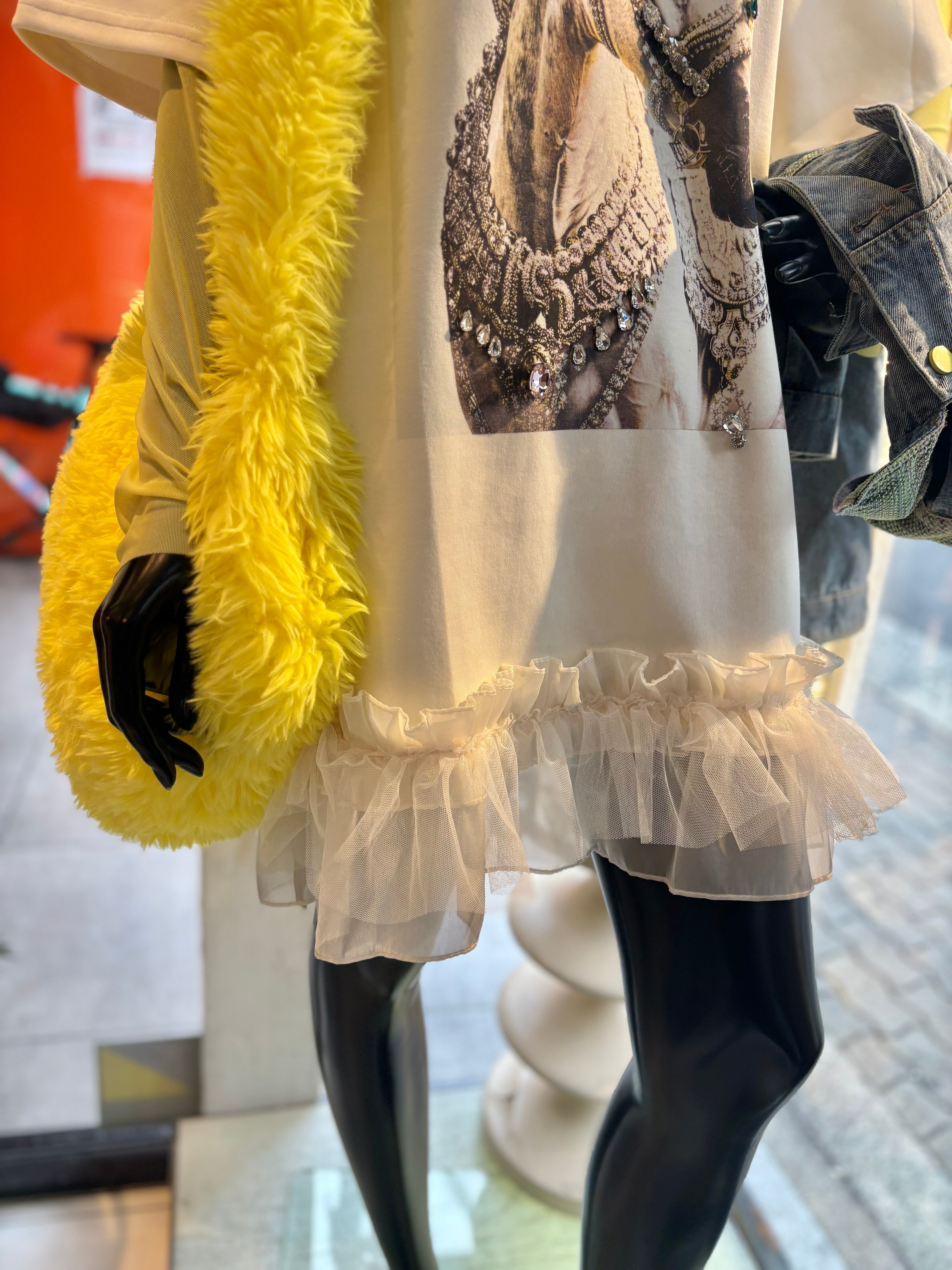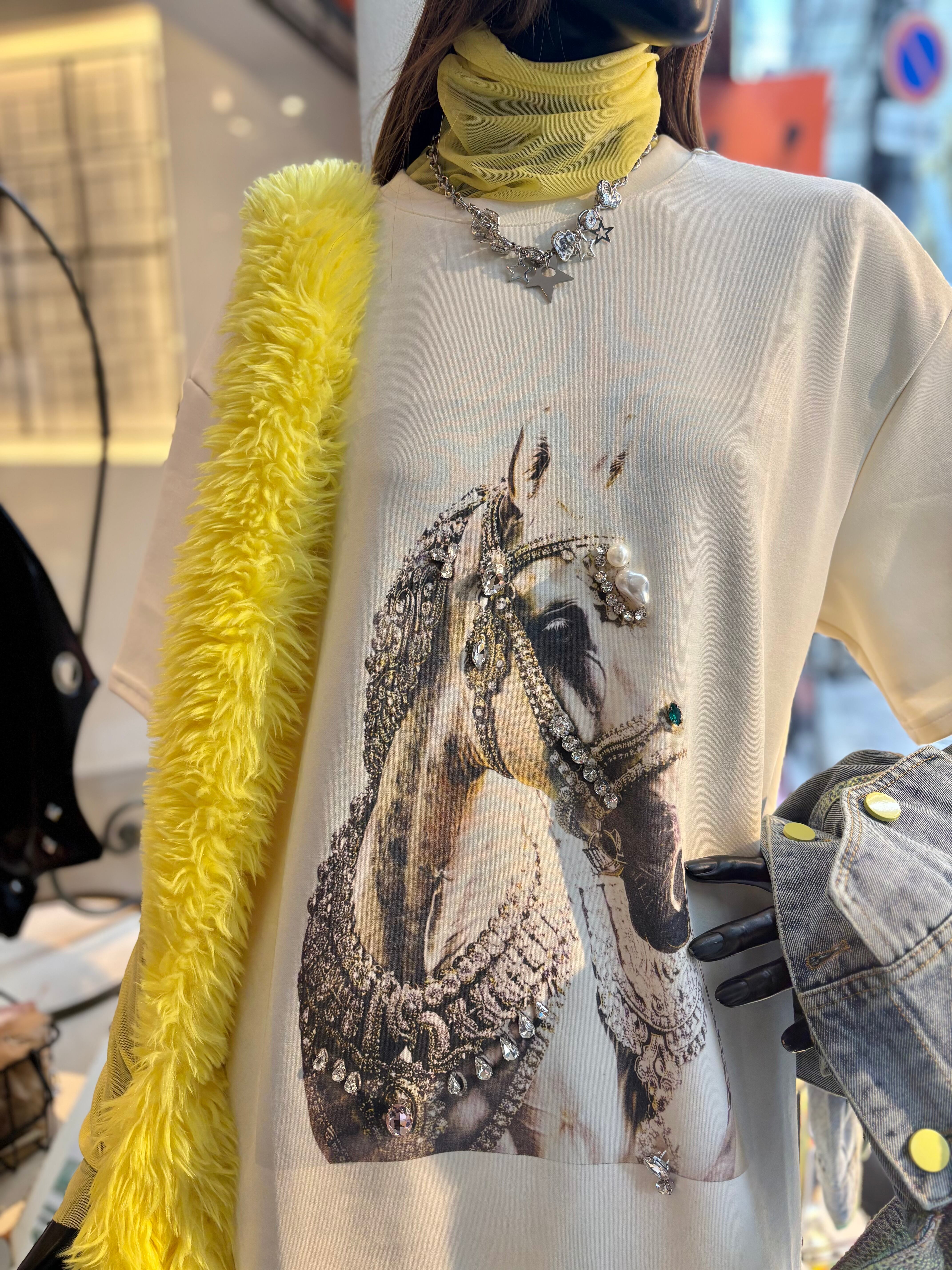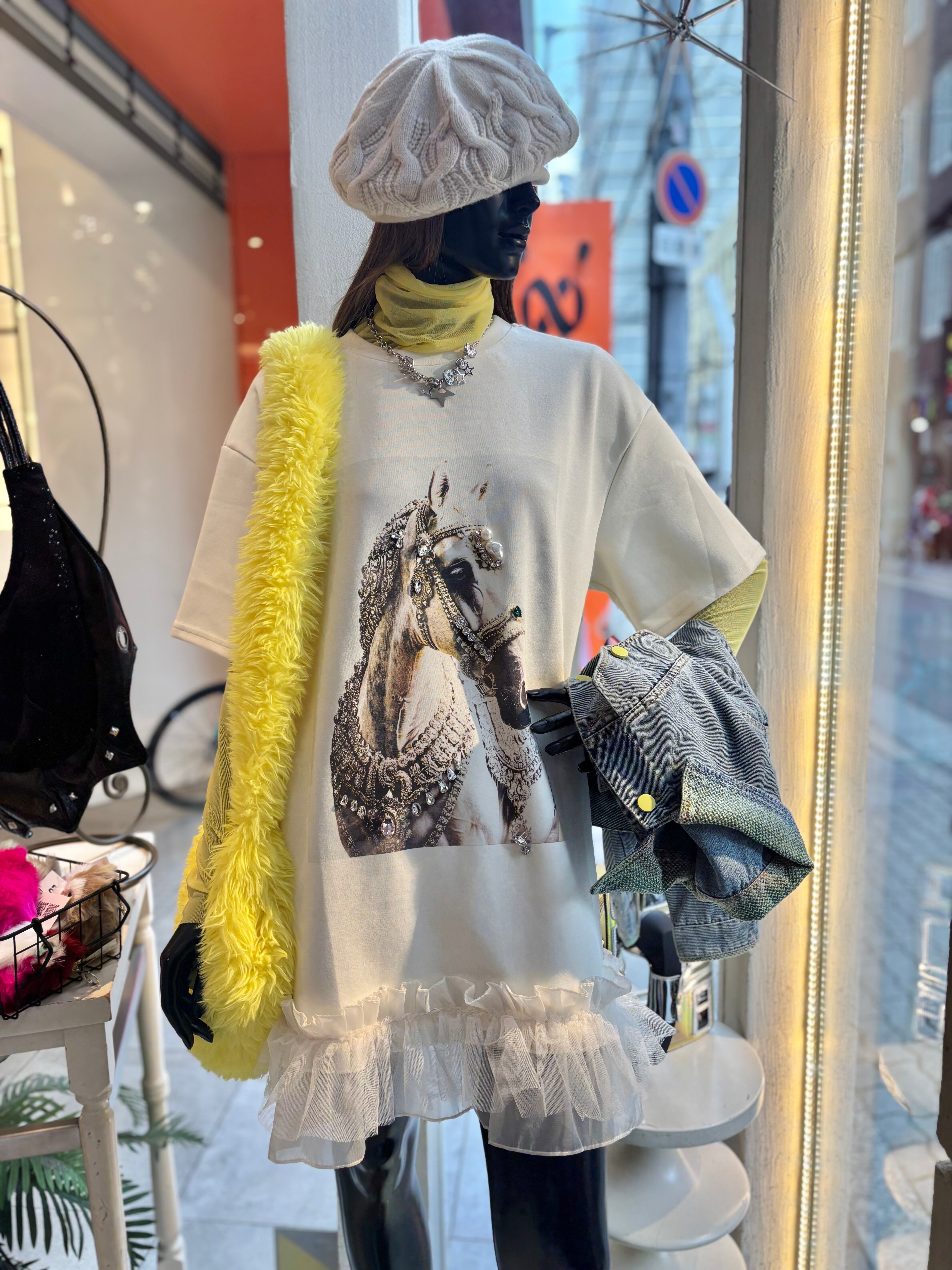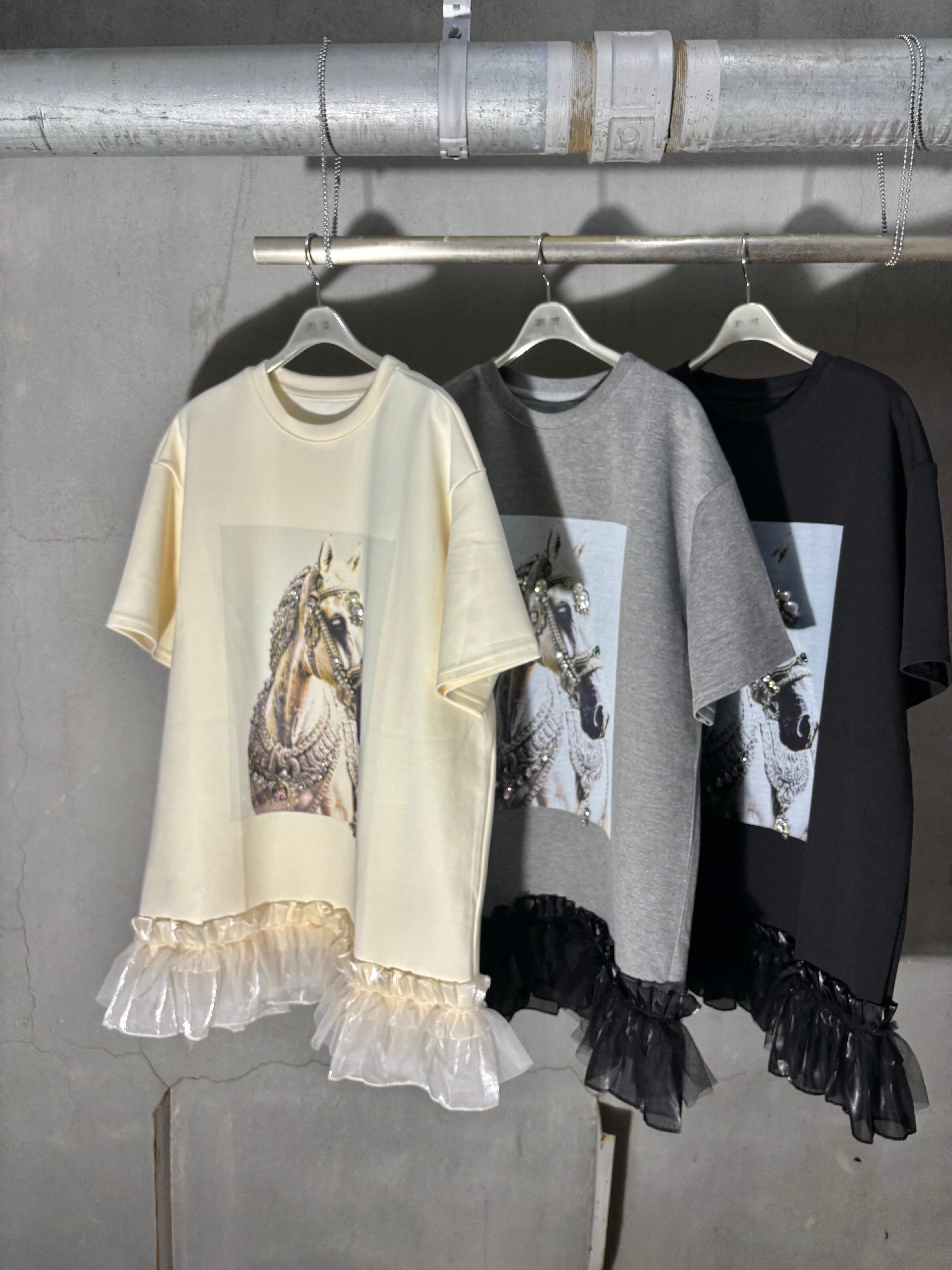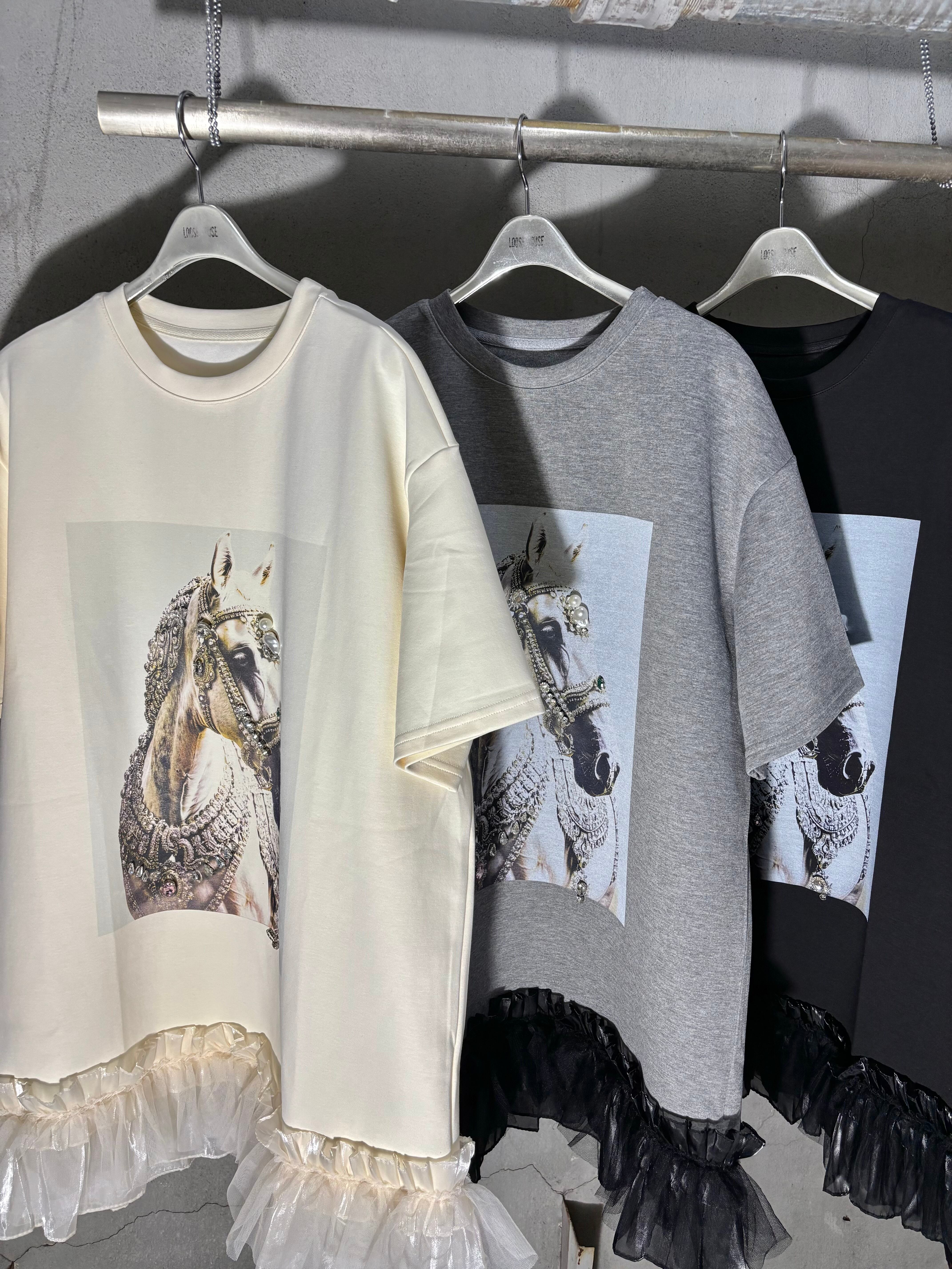decoration horse × frill hem design ester ponch tunic チュニック プリント ホース フリル ビジュー パール