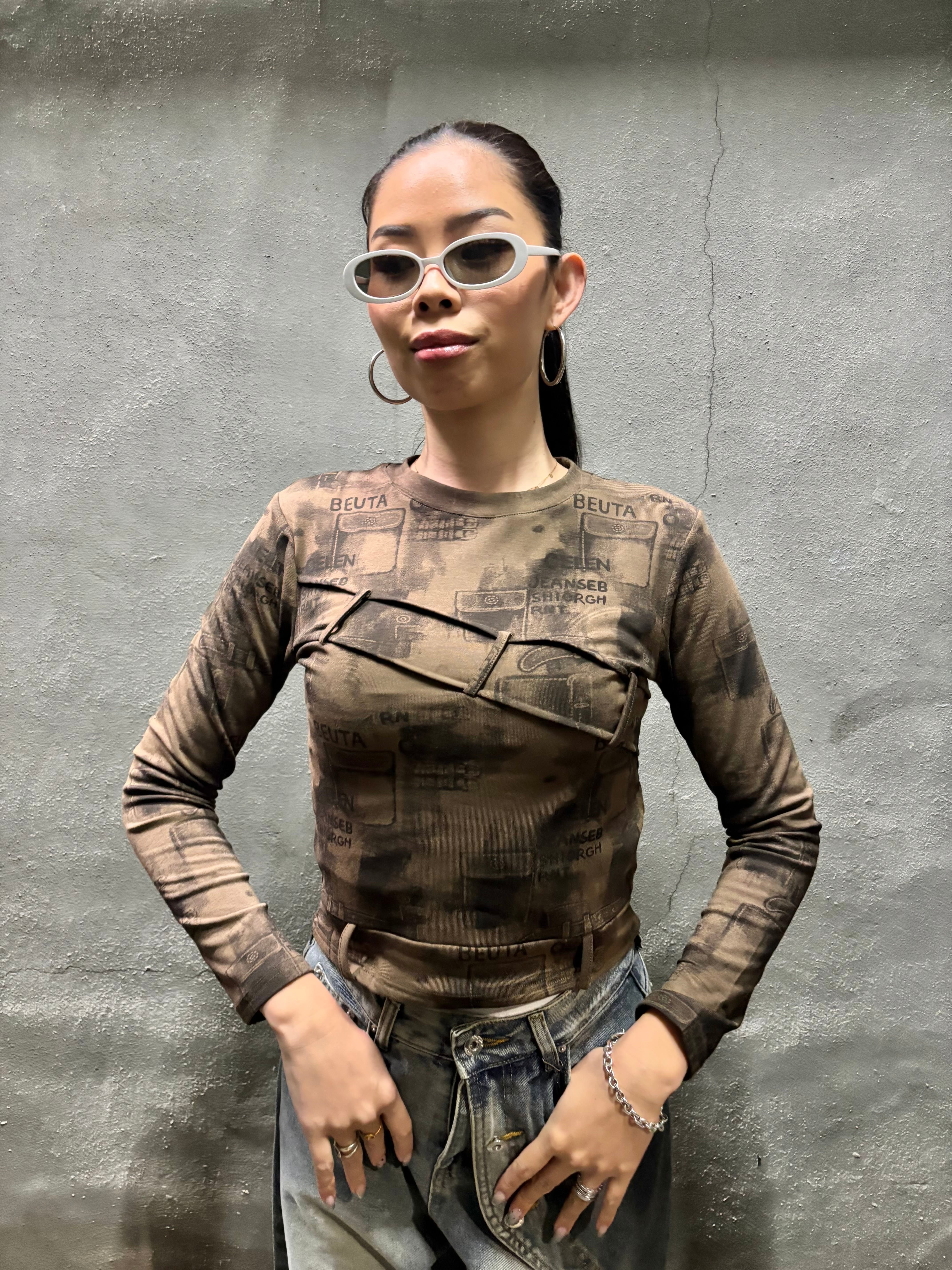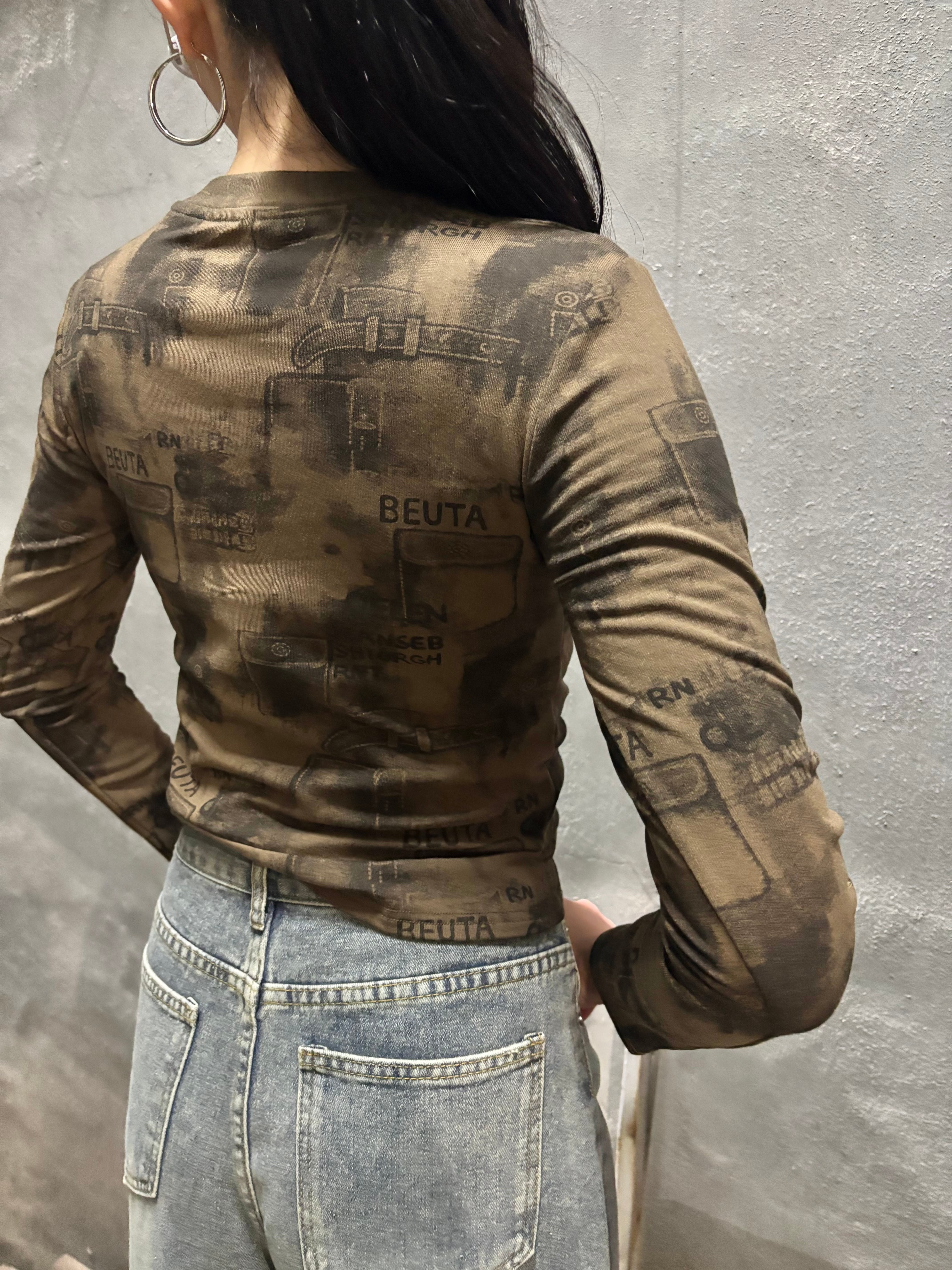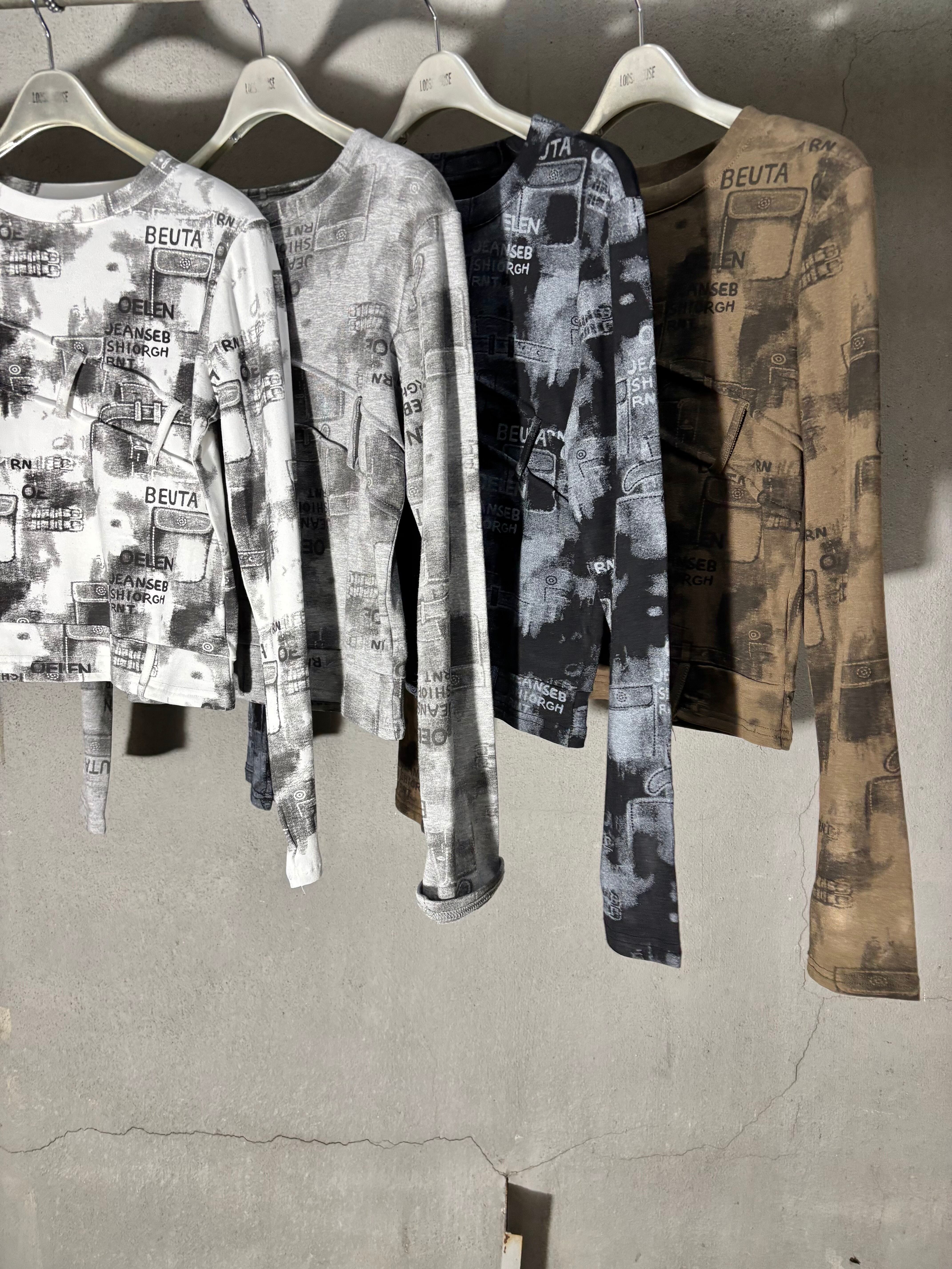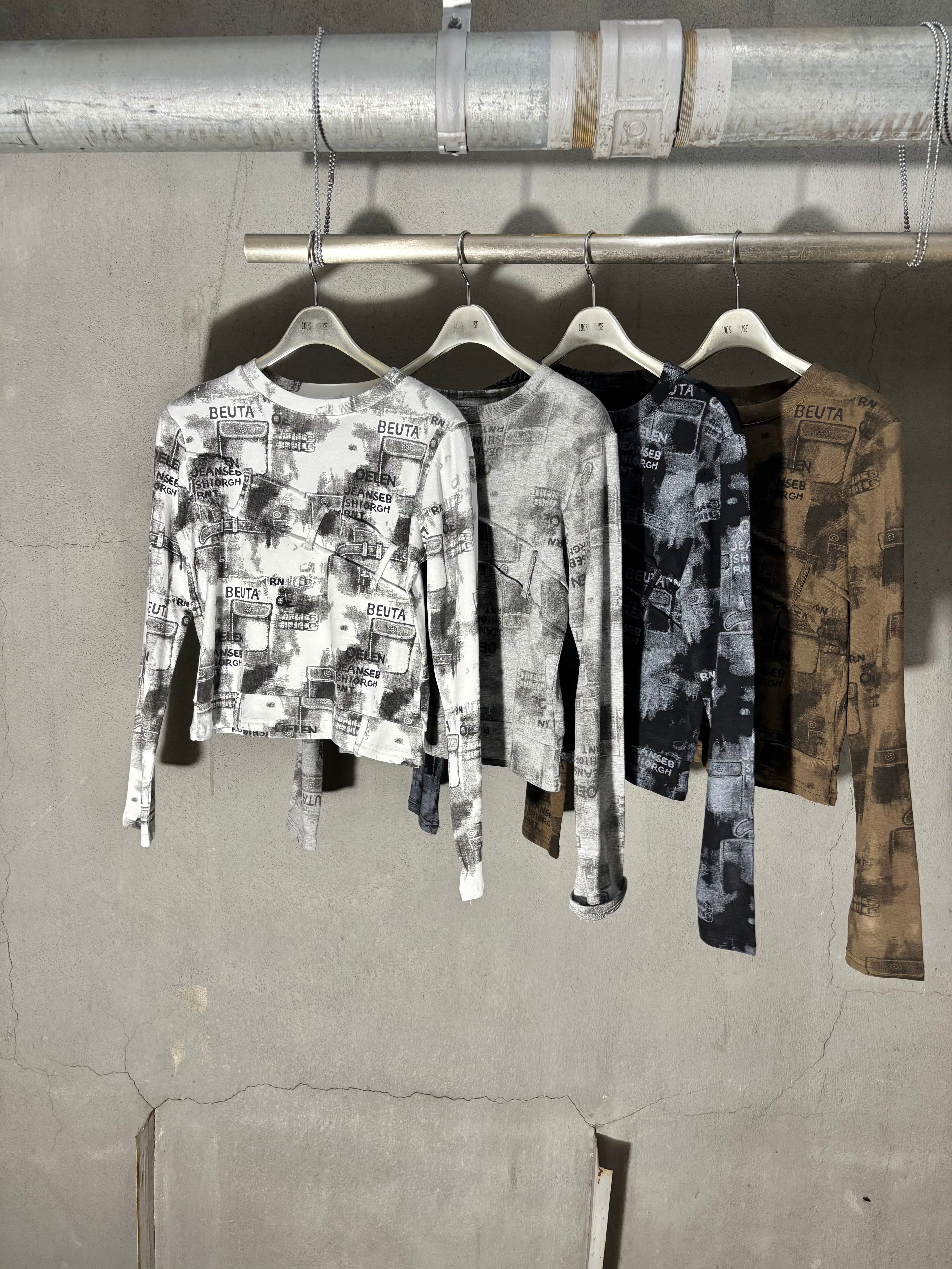 print × loop design stretch long sleeve tops トップス ストレッチ プリント 長袖 ループ