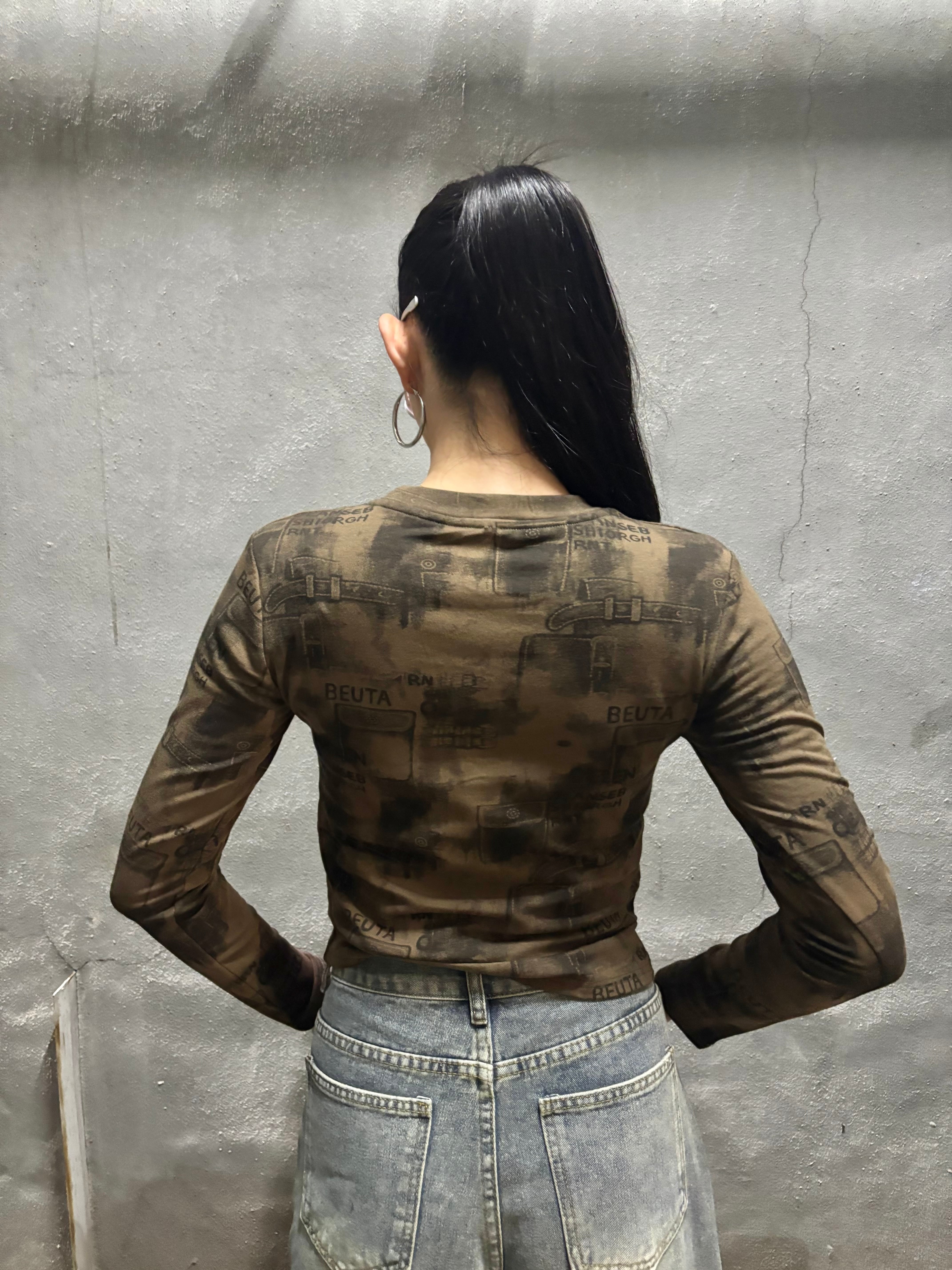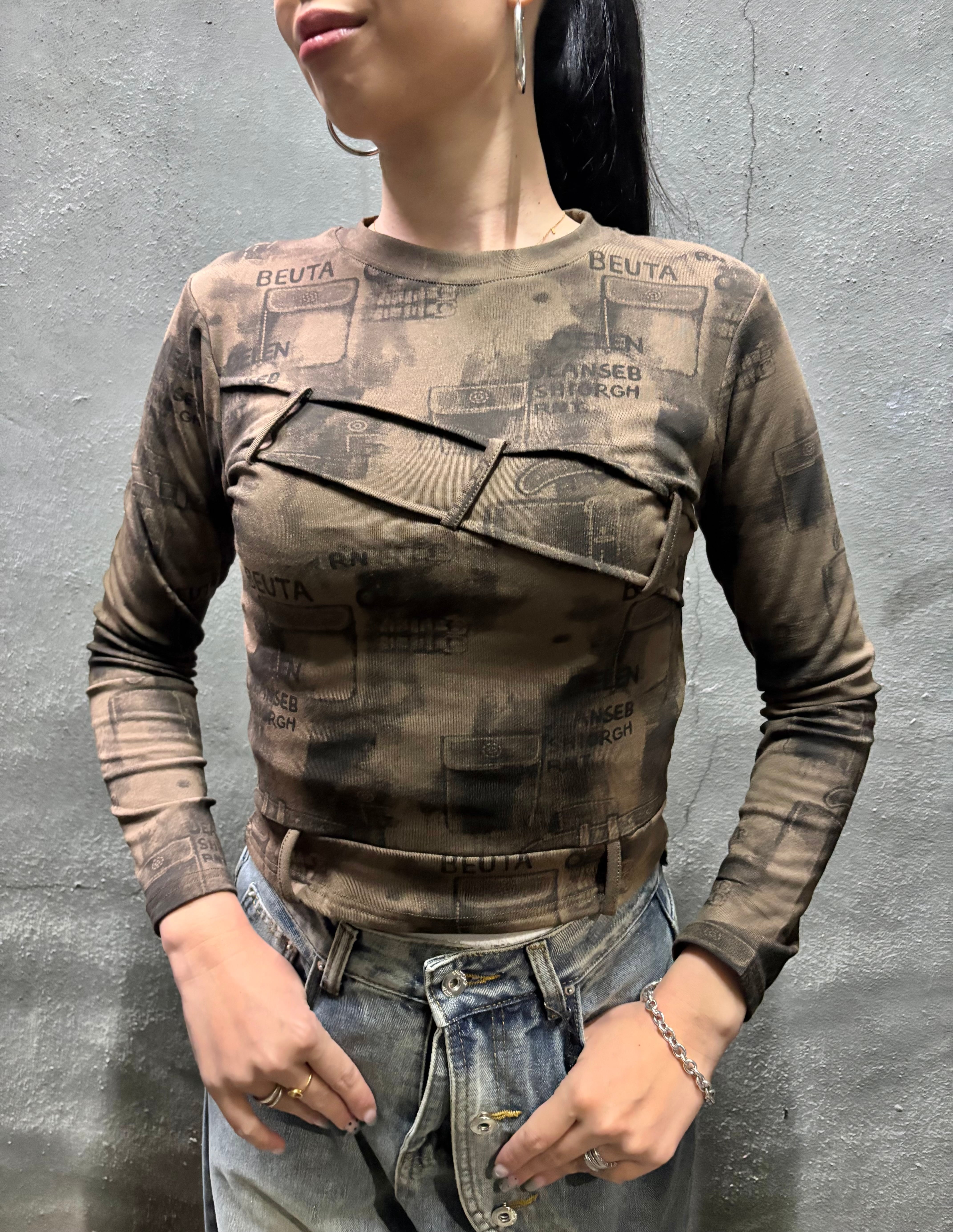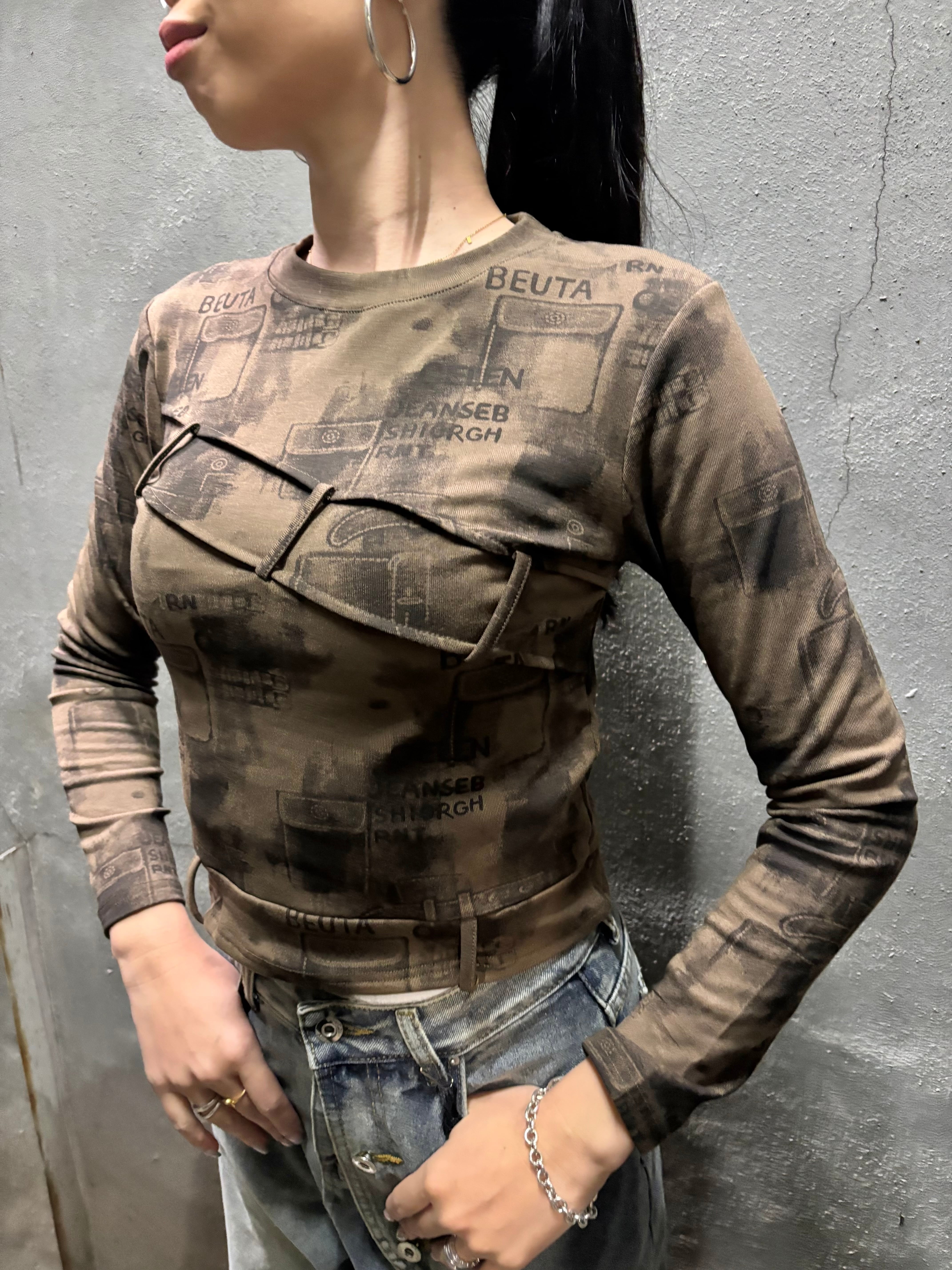 print × loop design stretch long sleeve tops トップス ストレッチ プリント 長袖 ループ