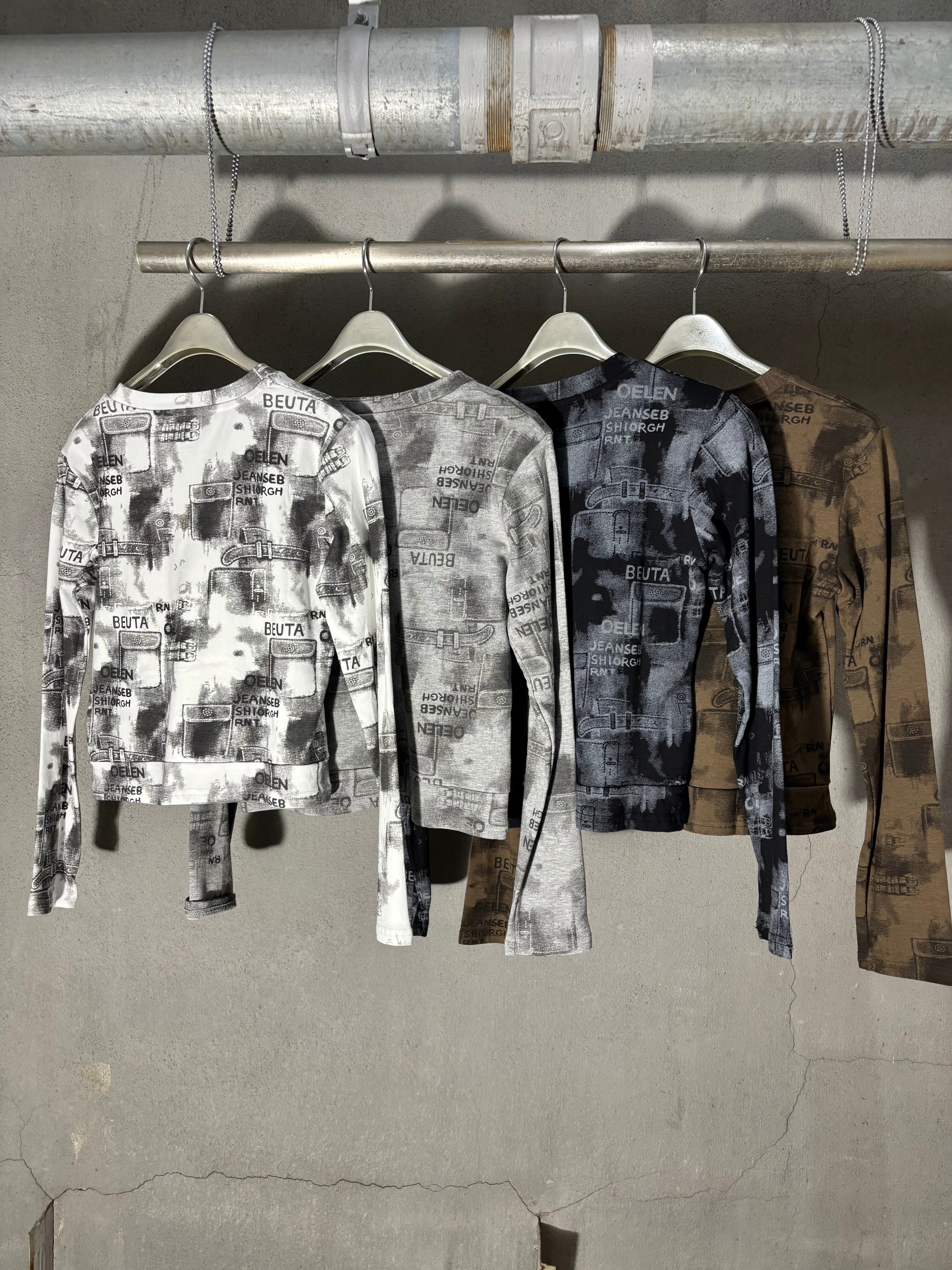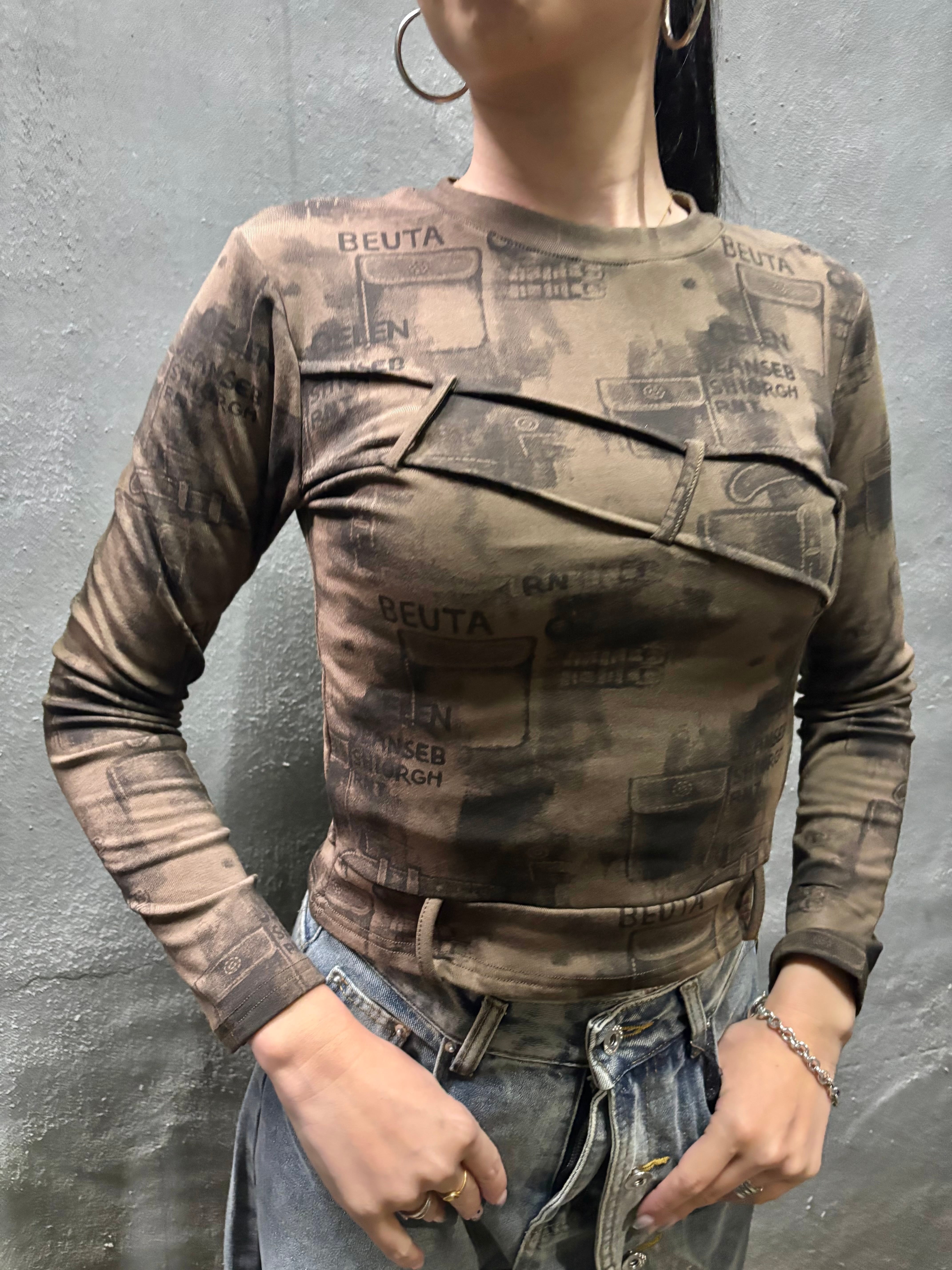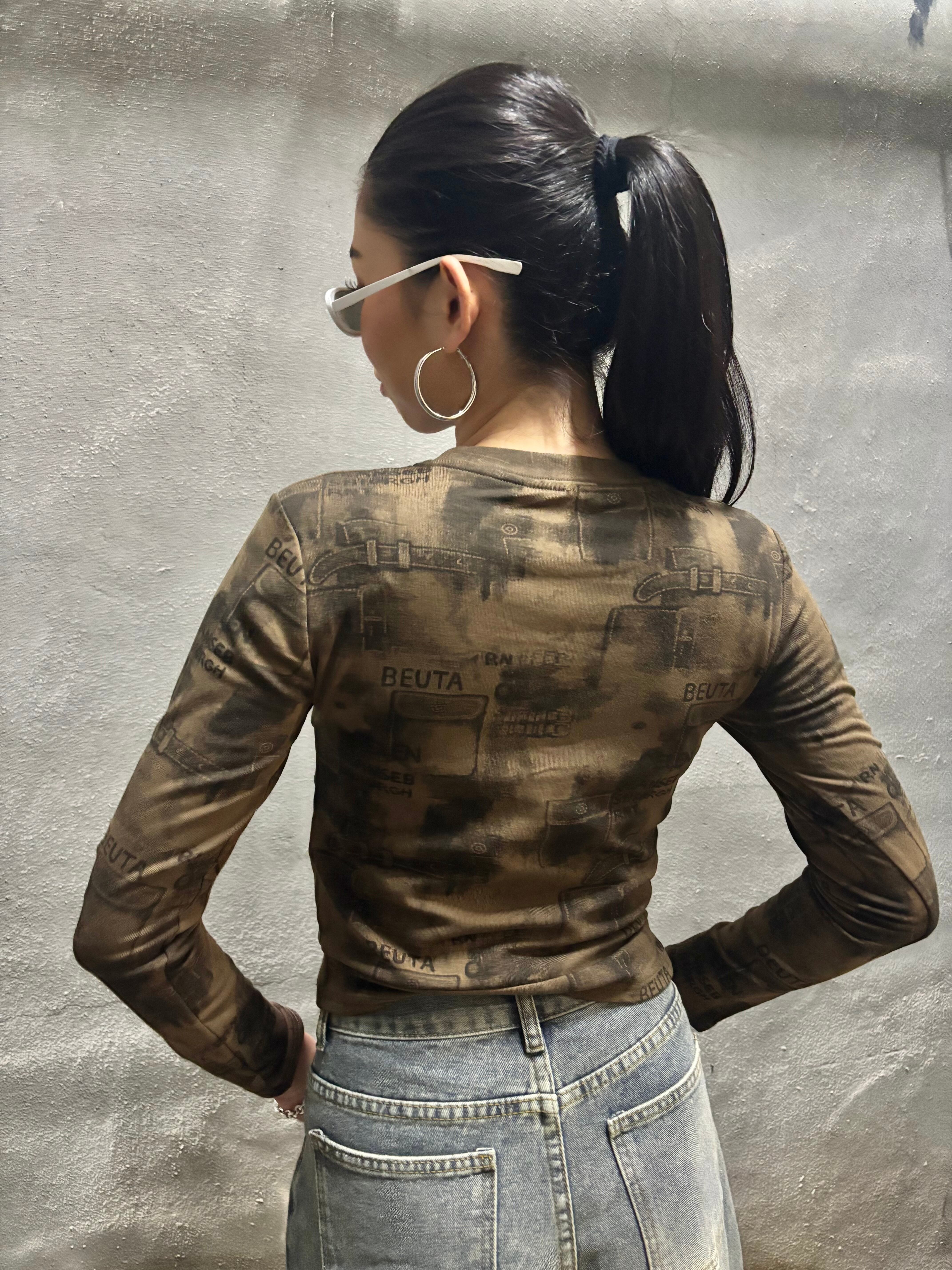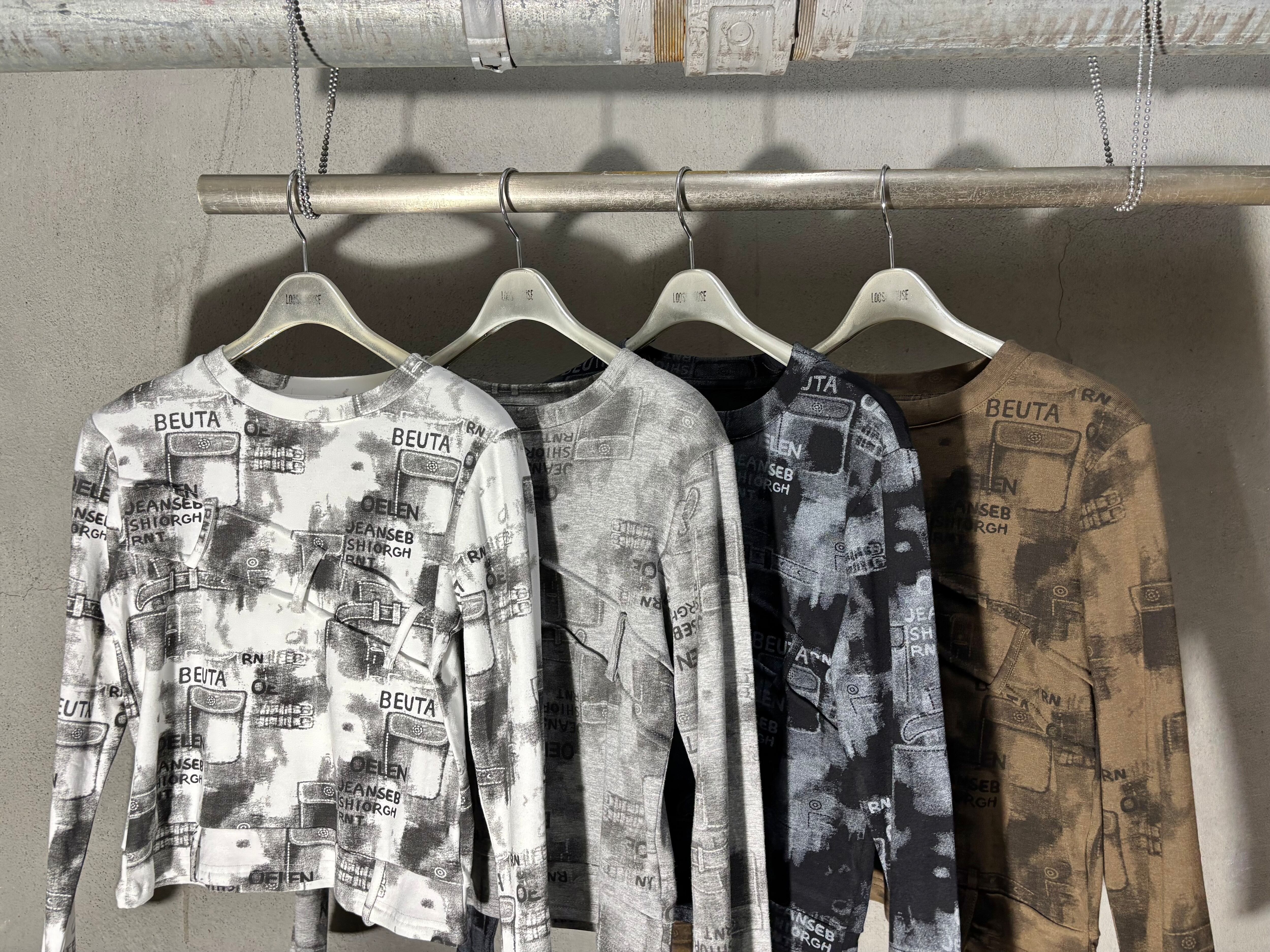 print × loop design stretch long sleeve tops トップス ストレッチ プリント 長袖 ループ