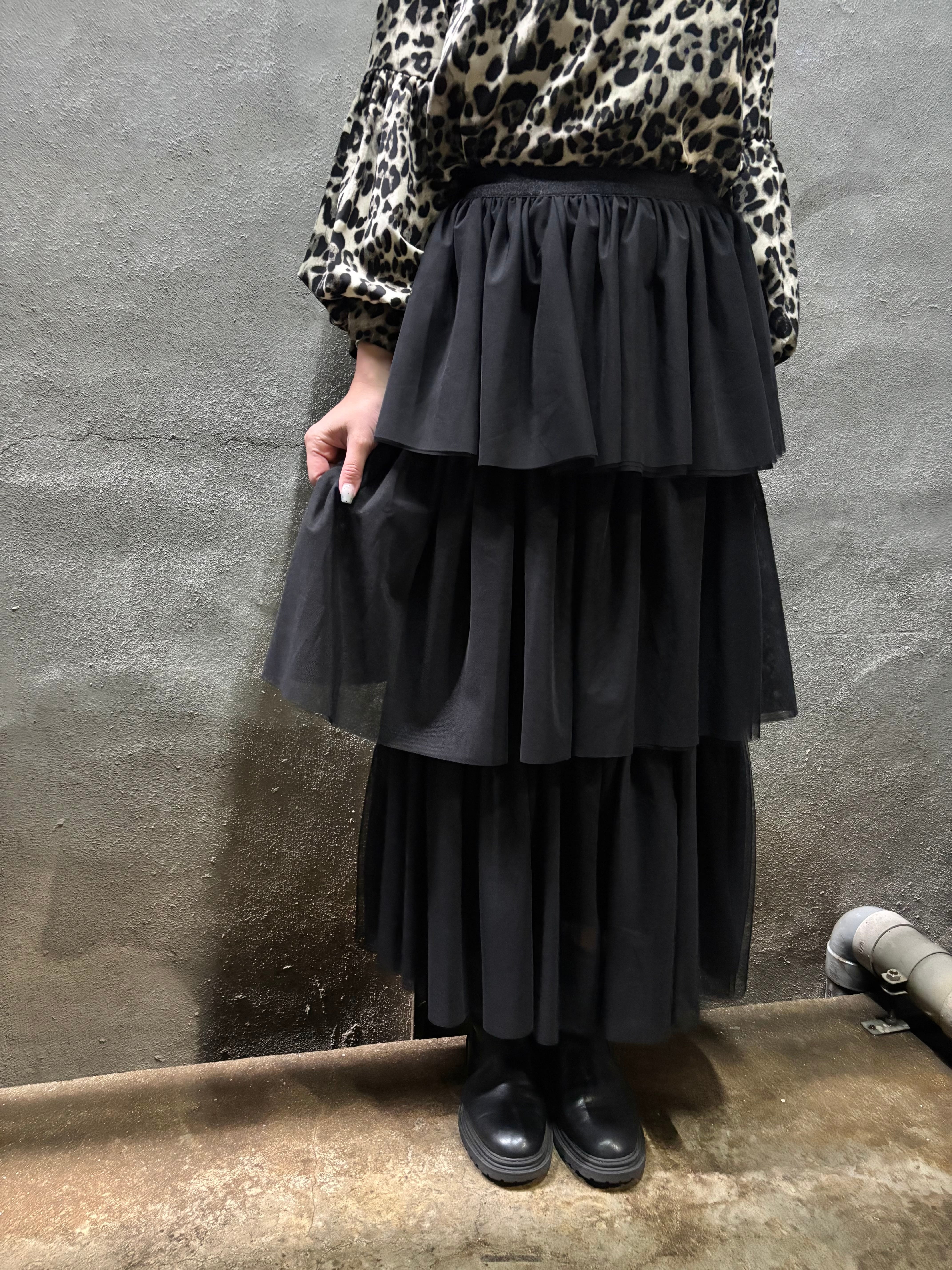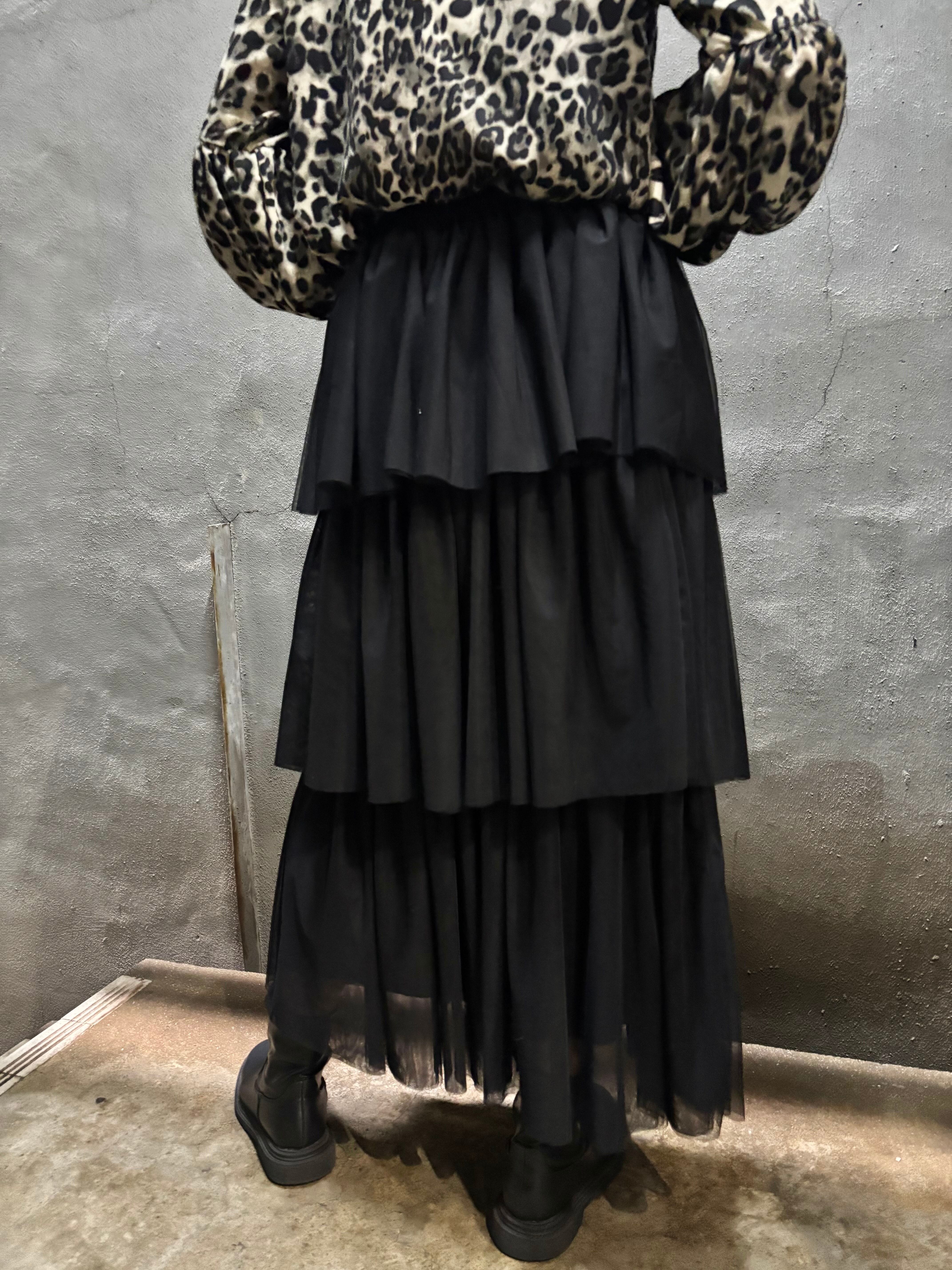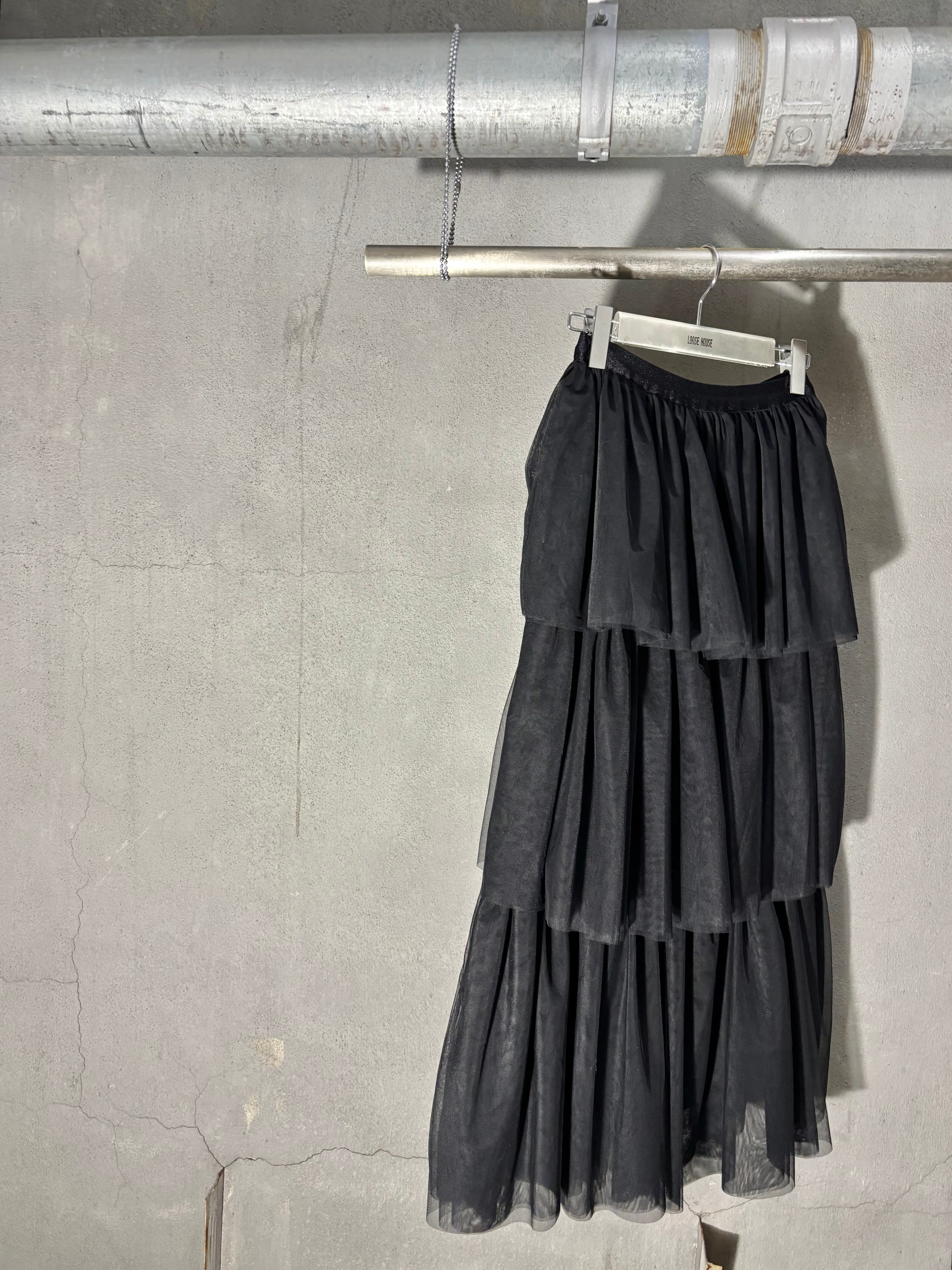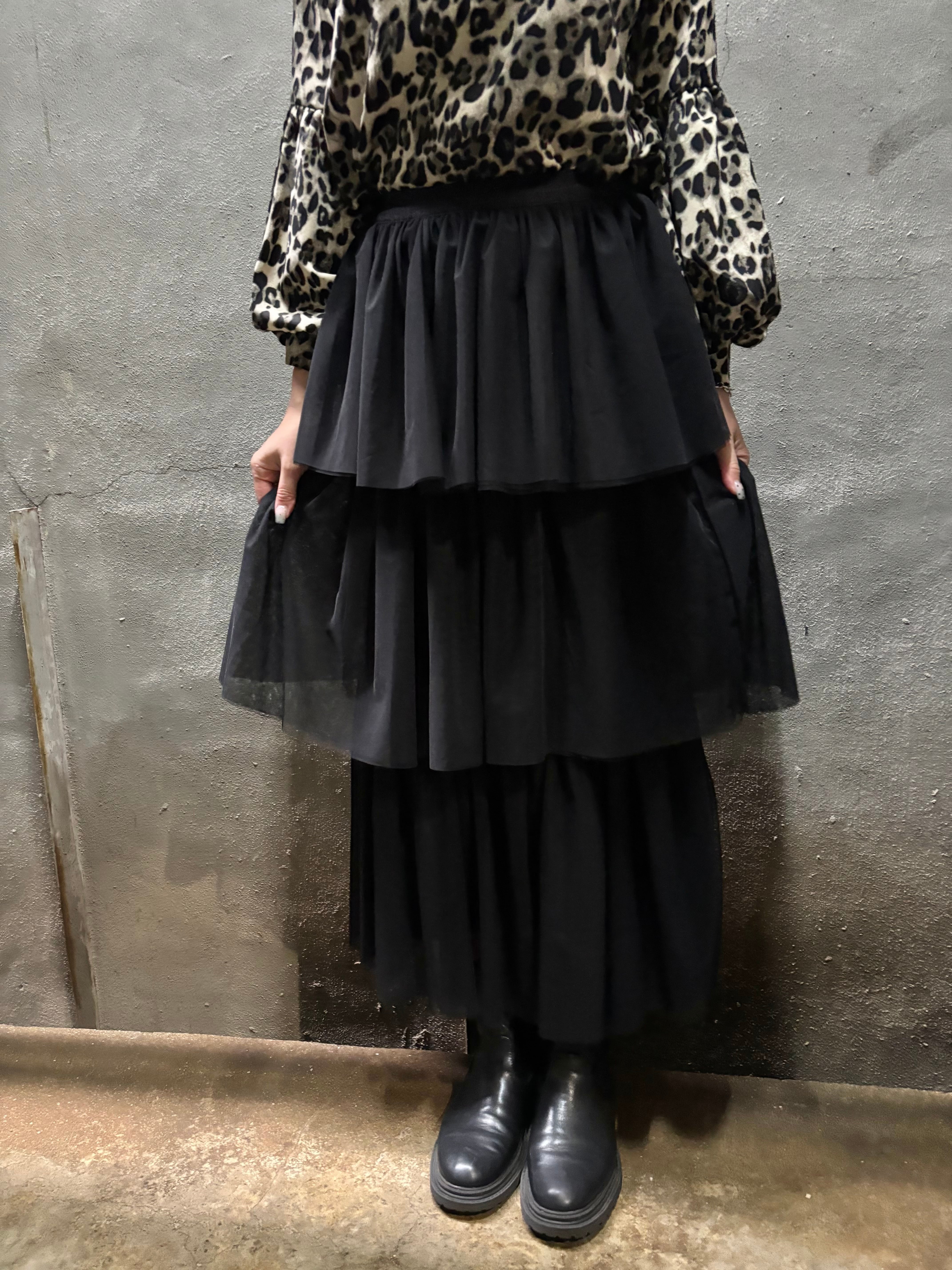 tulle mesh tiered gather frill design long skirt スカート ロングスカート チュール メッシュ フリル ゴムウエスト ブラック 黒