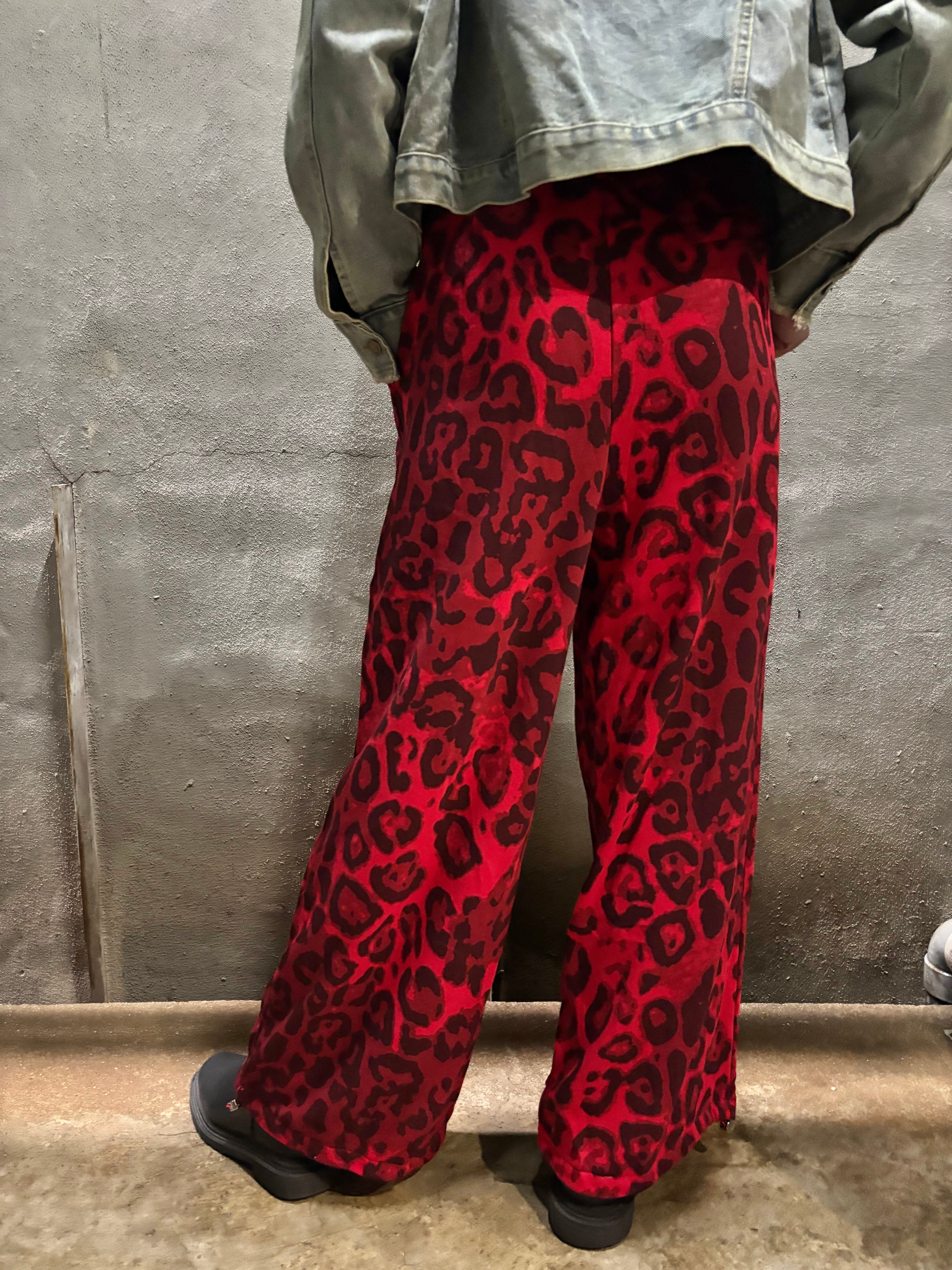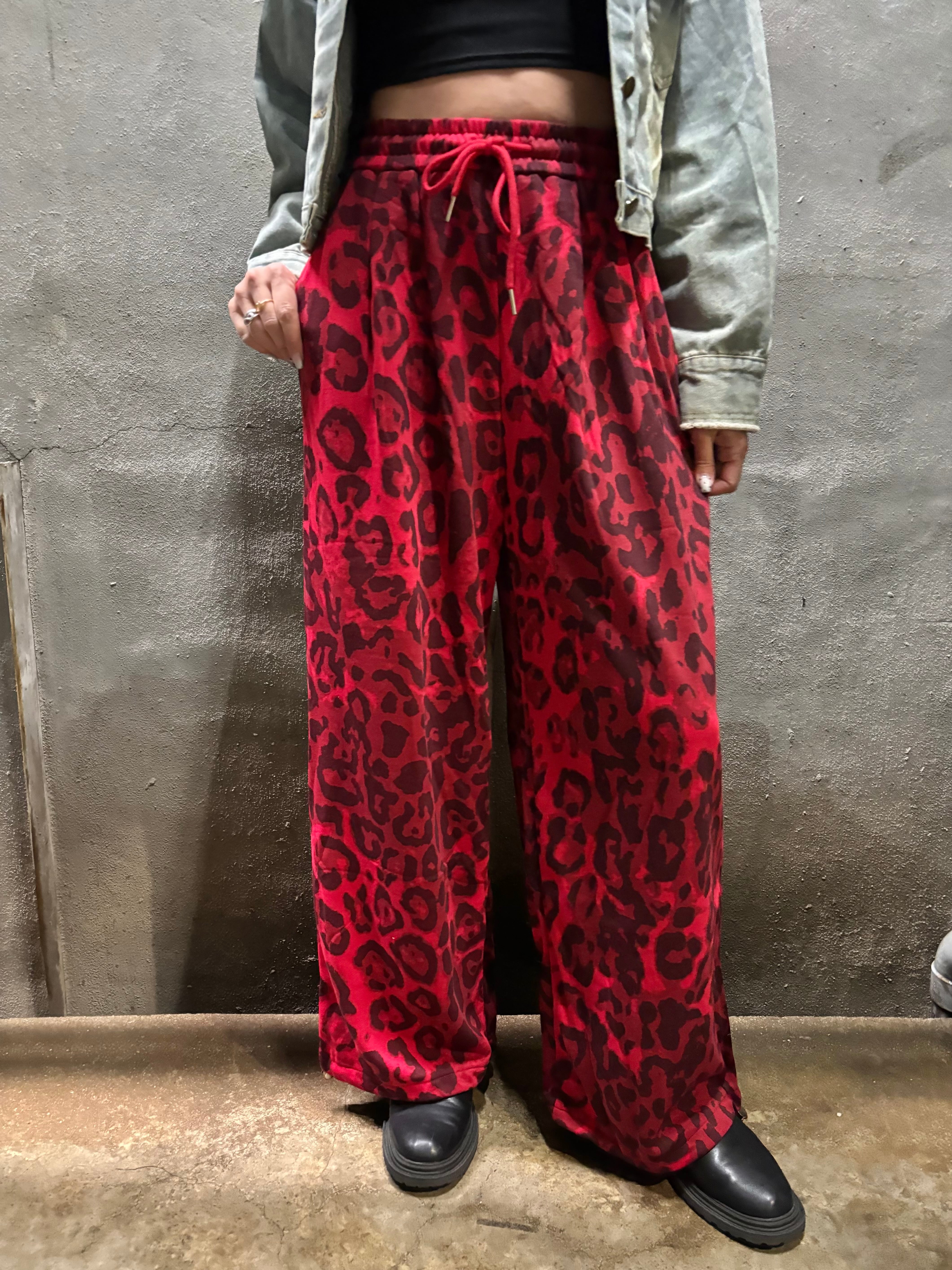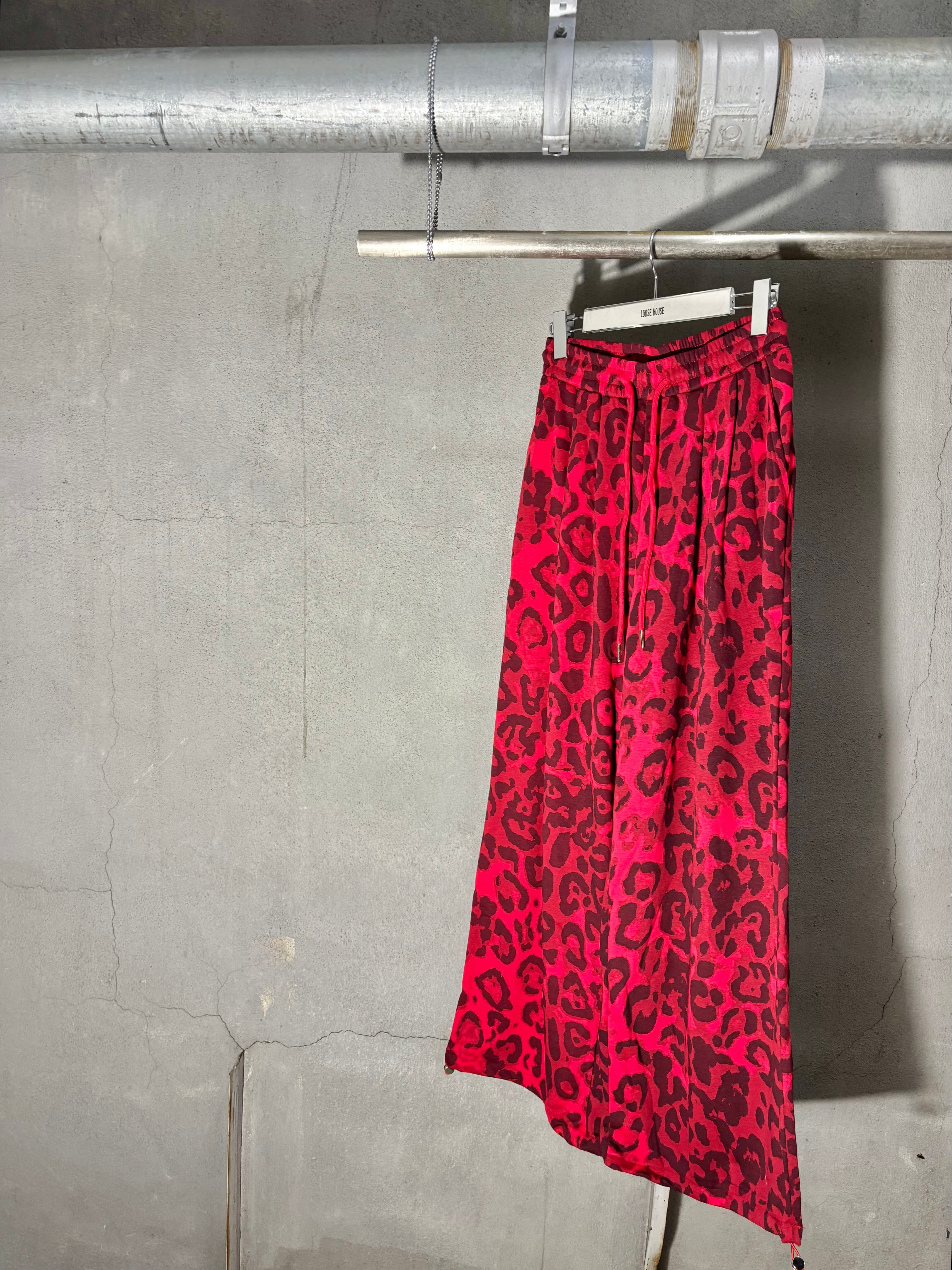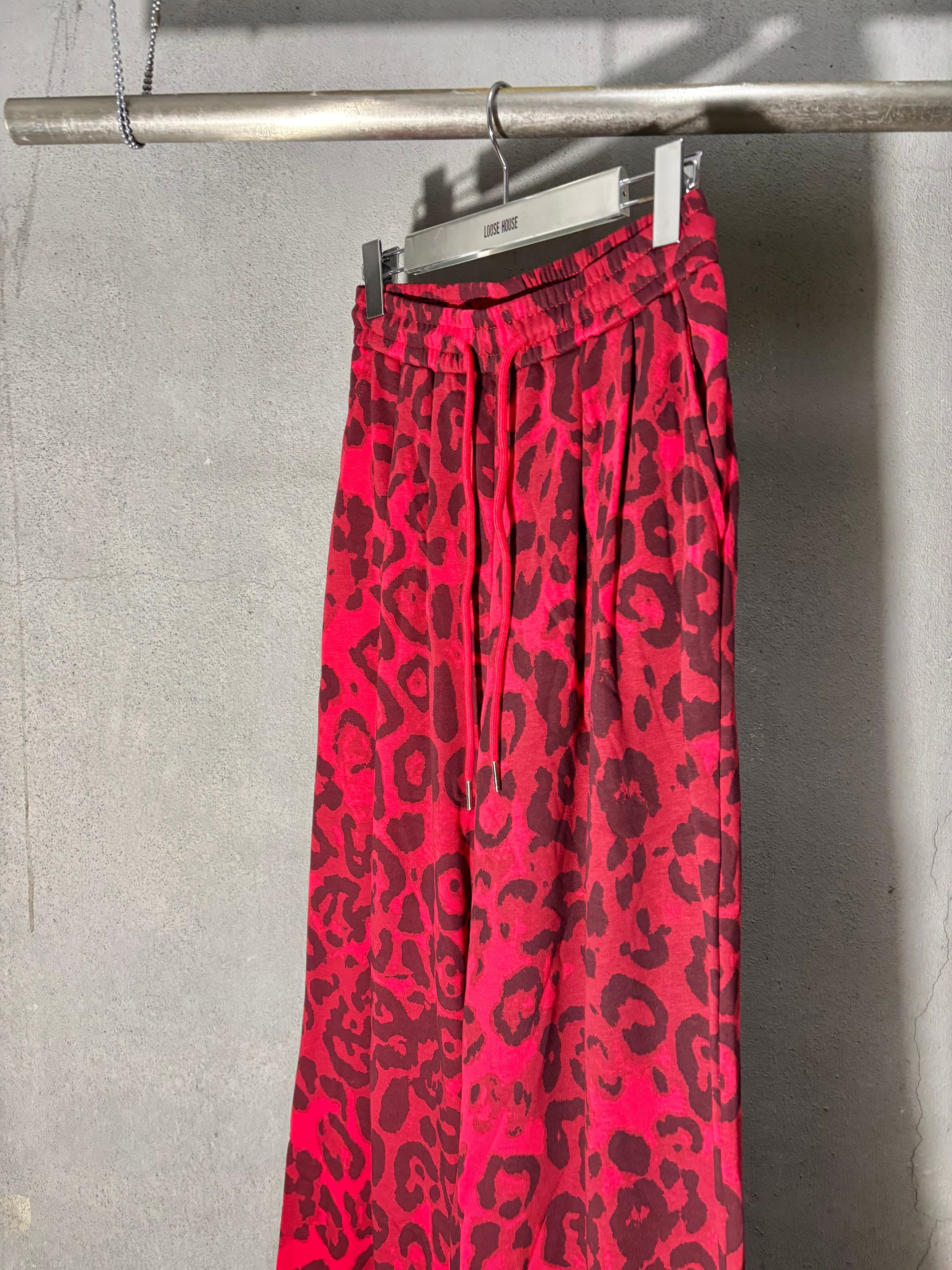 red leopard print easy long pants パンツ レオパード 豹柄 ヒョウ柄 裏毛 ゴムウエスト ドローコード