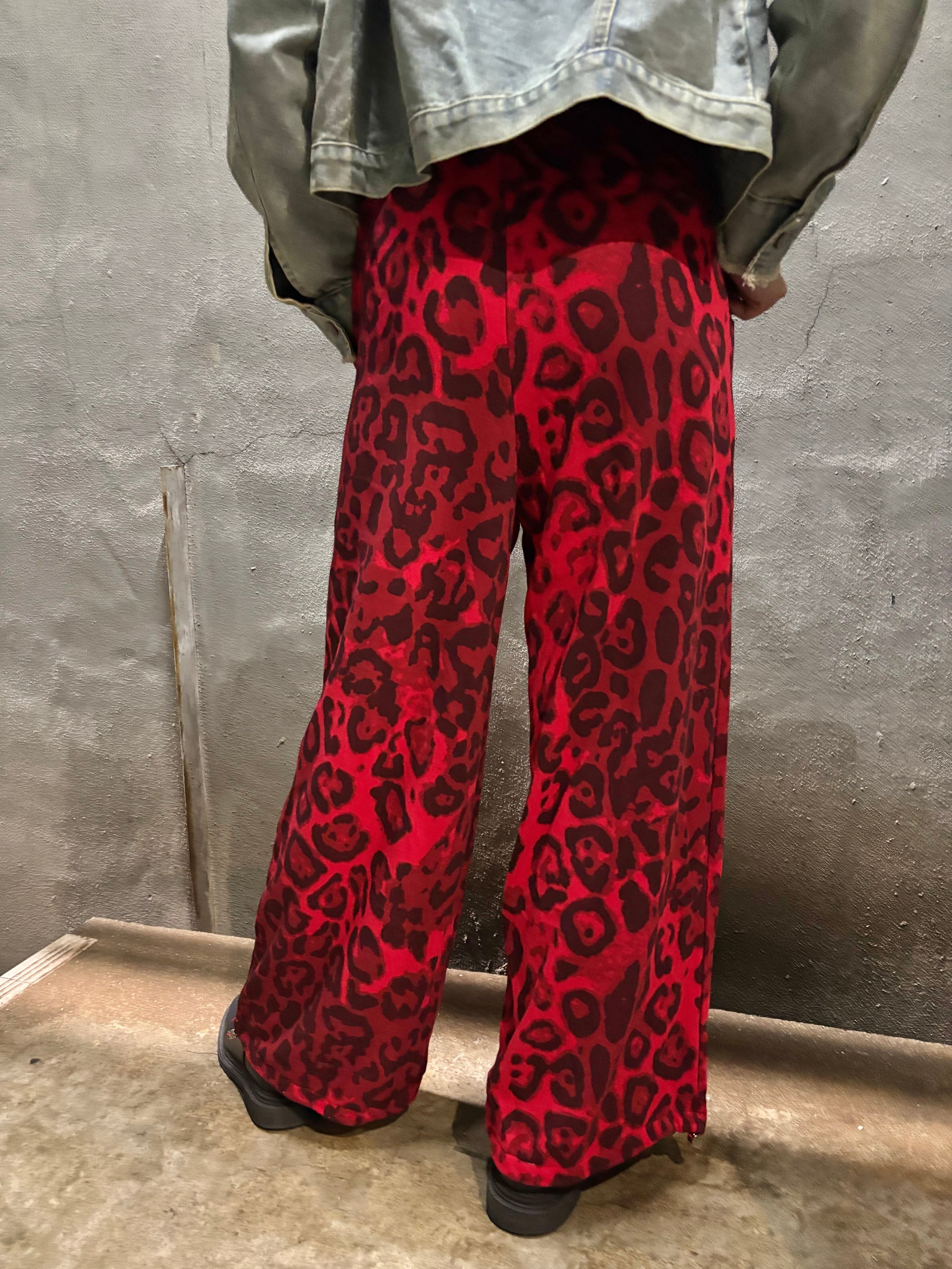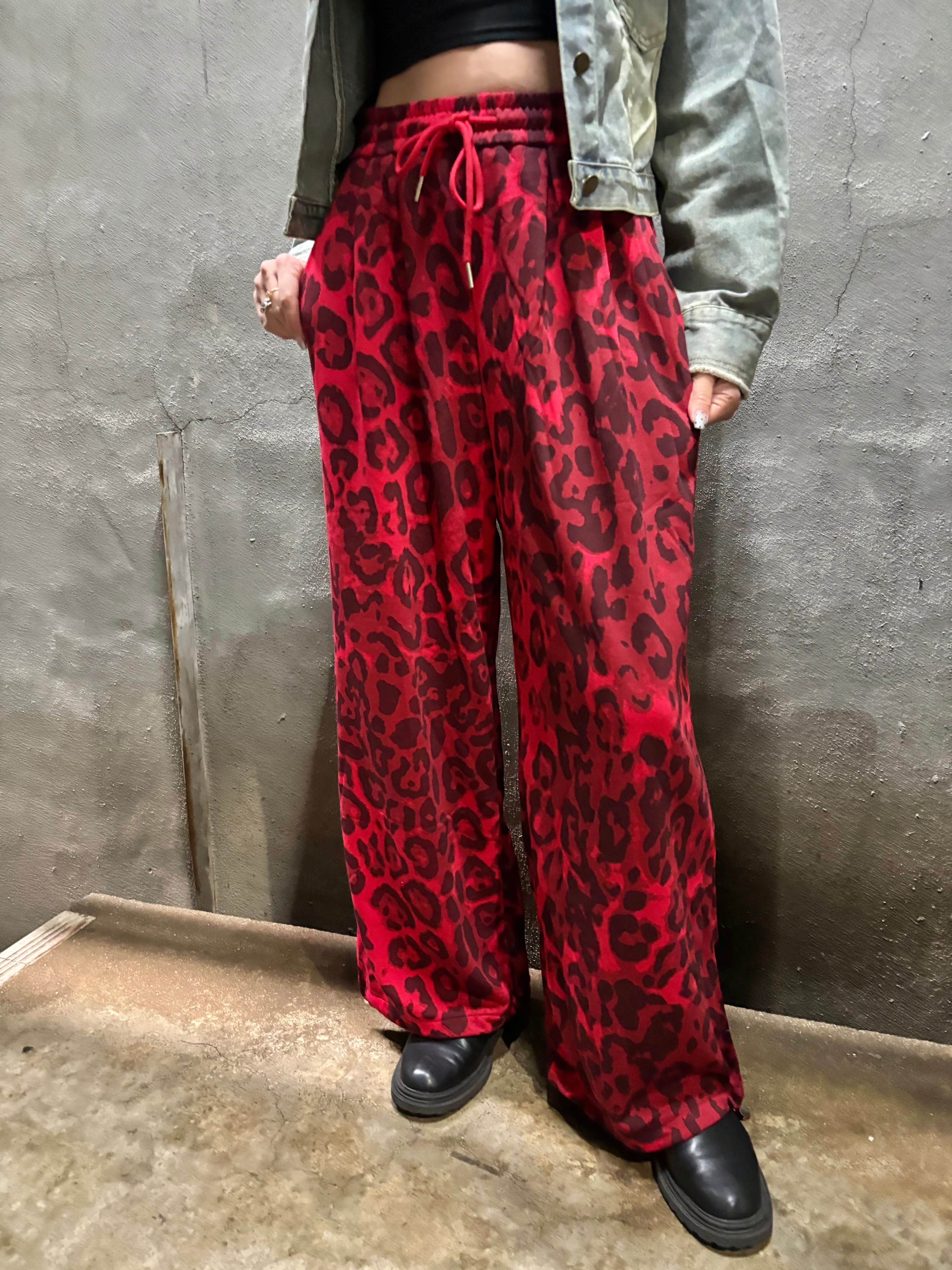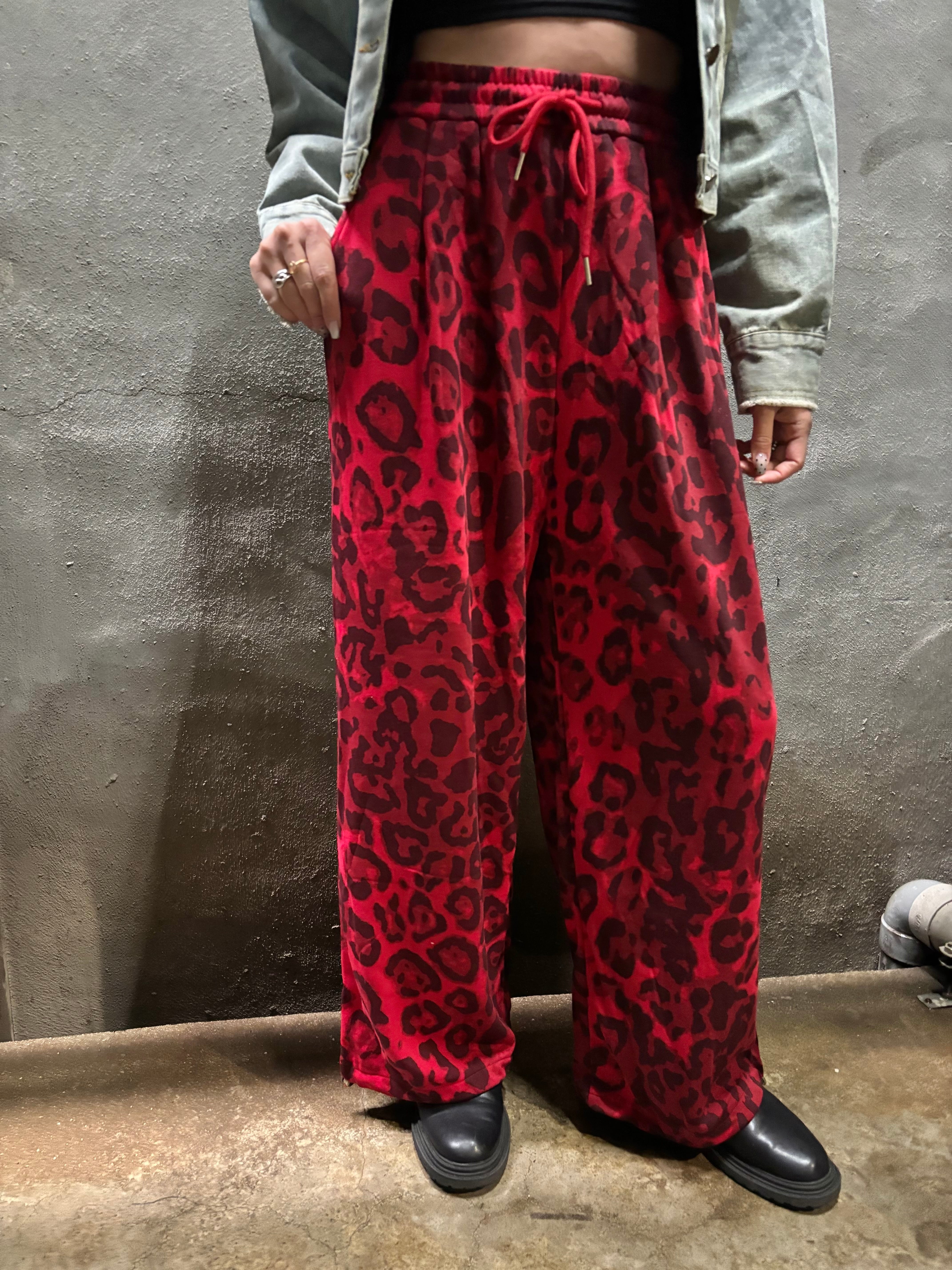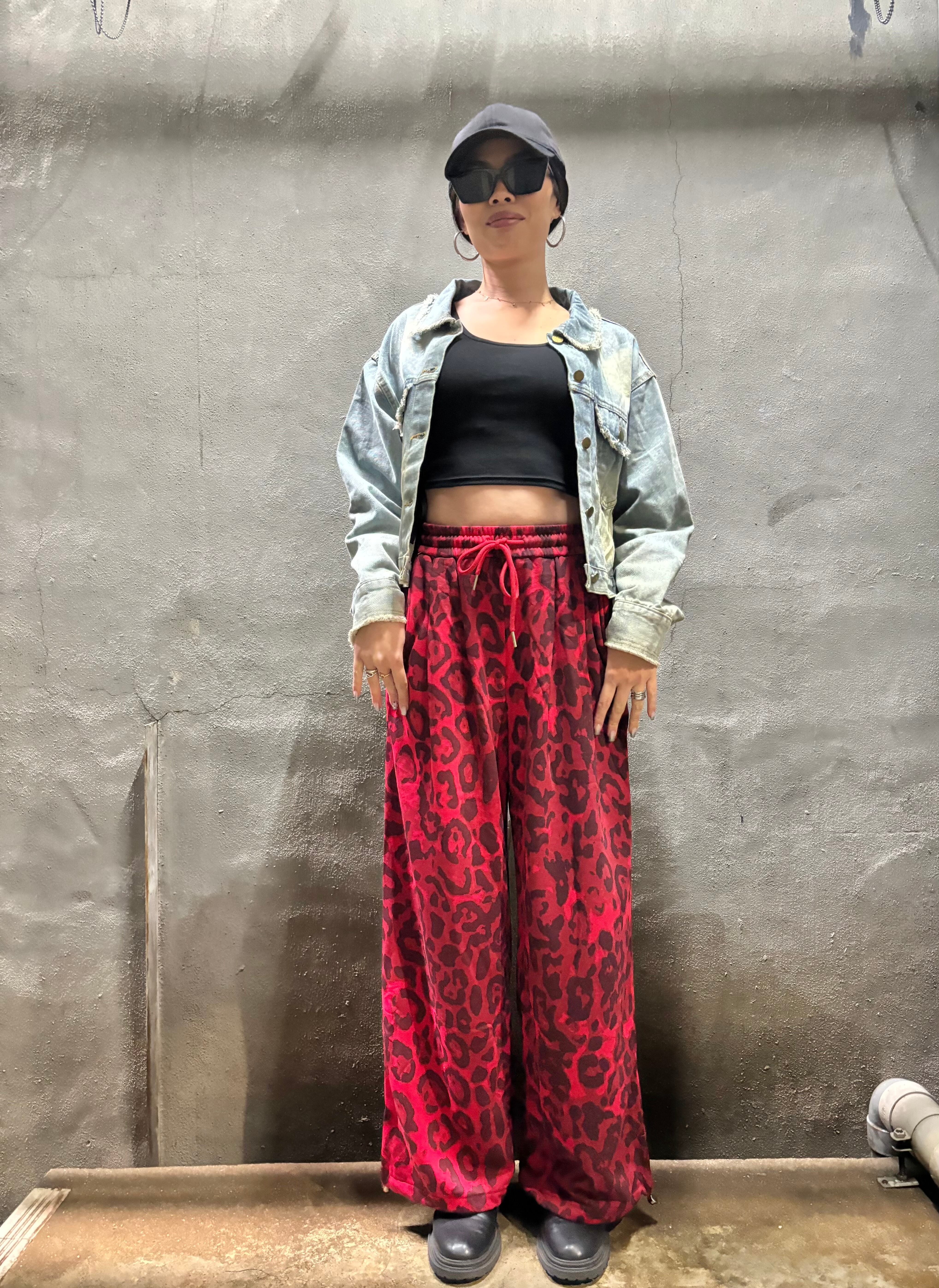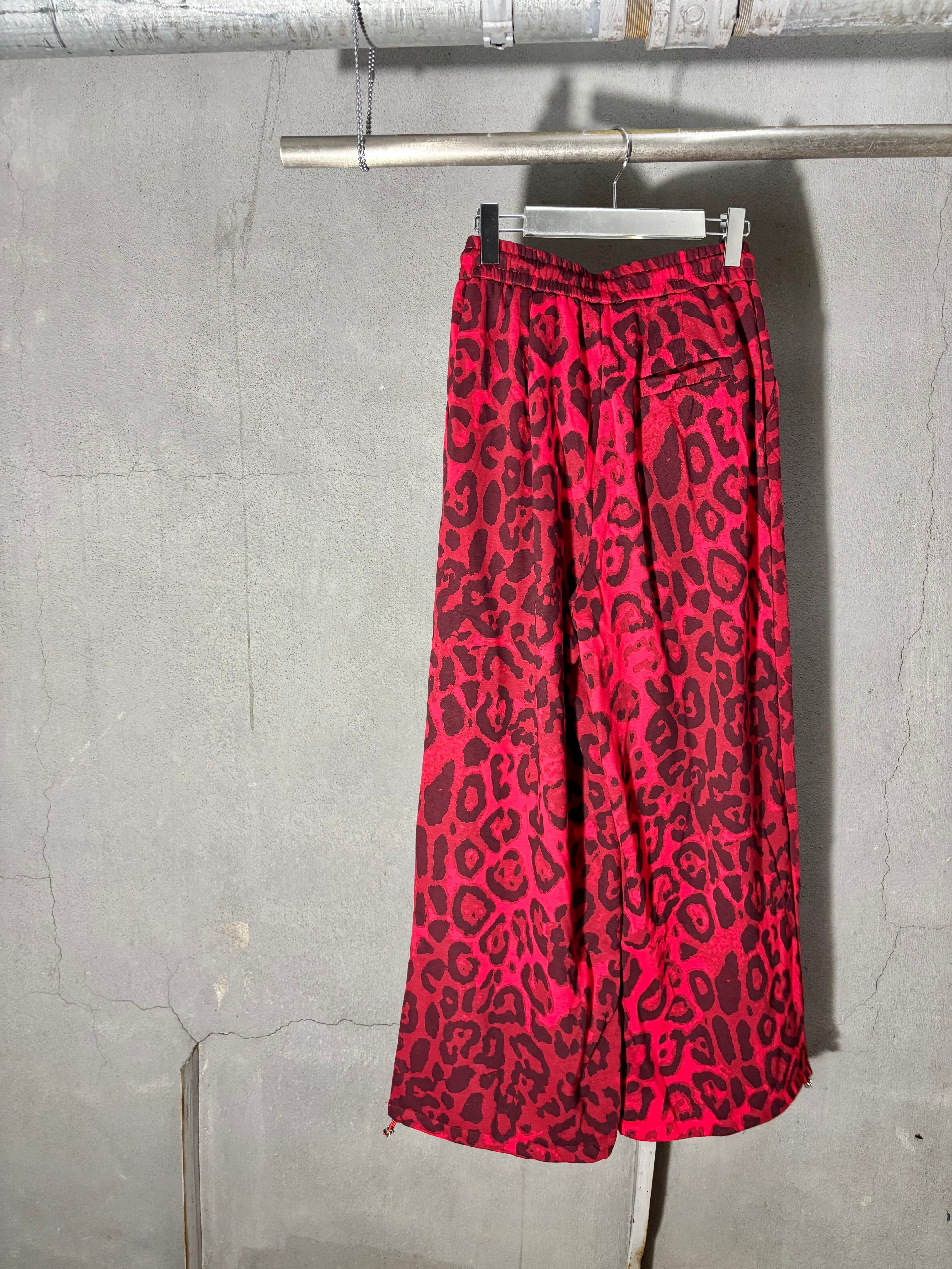 red leopard print easy long pants パンツ レオパード 豹柄 ヒョウ柄 裏毛 ゴムウエスト ドローコード