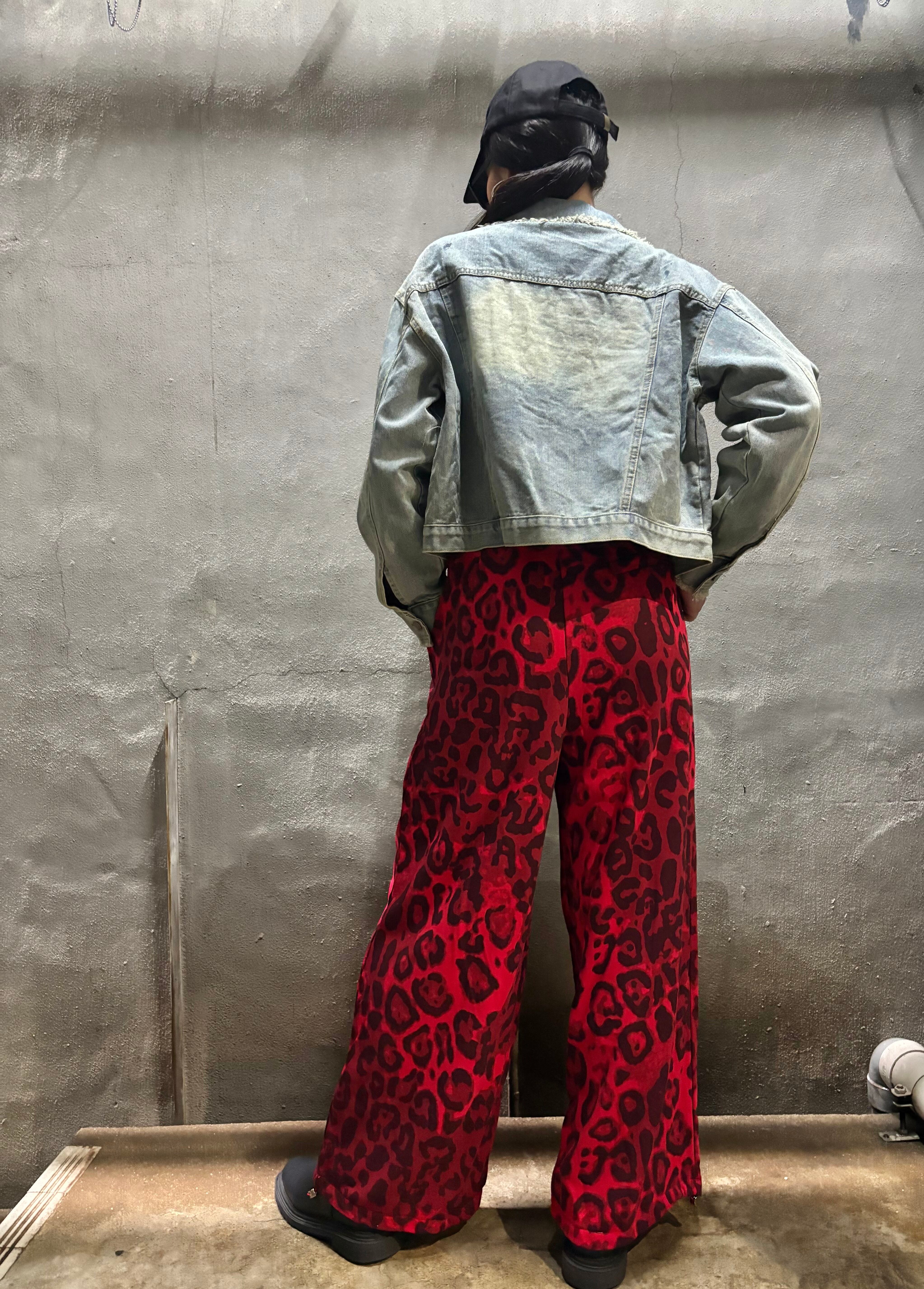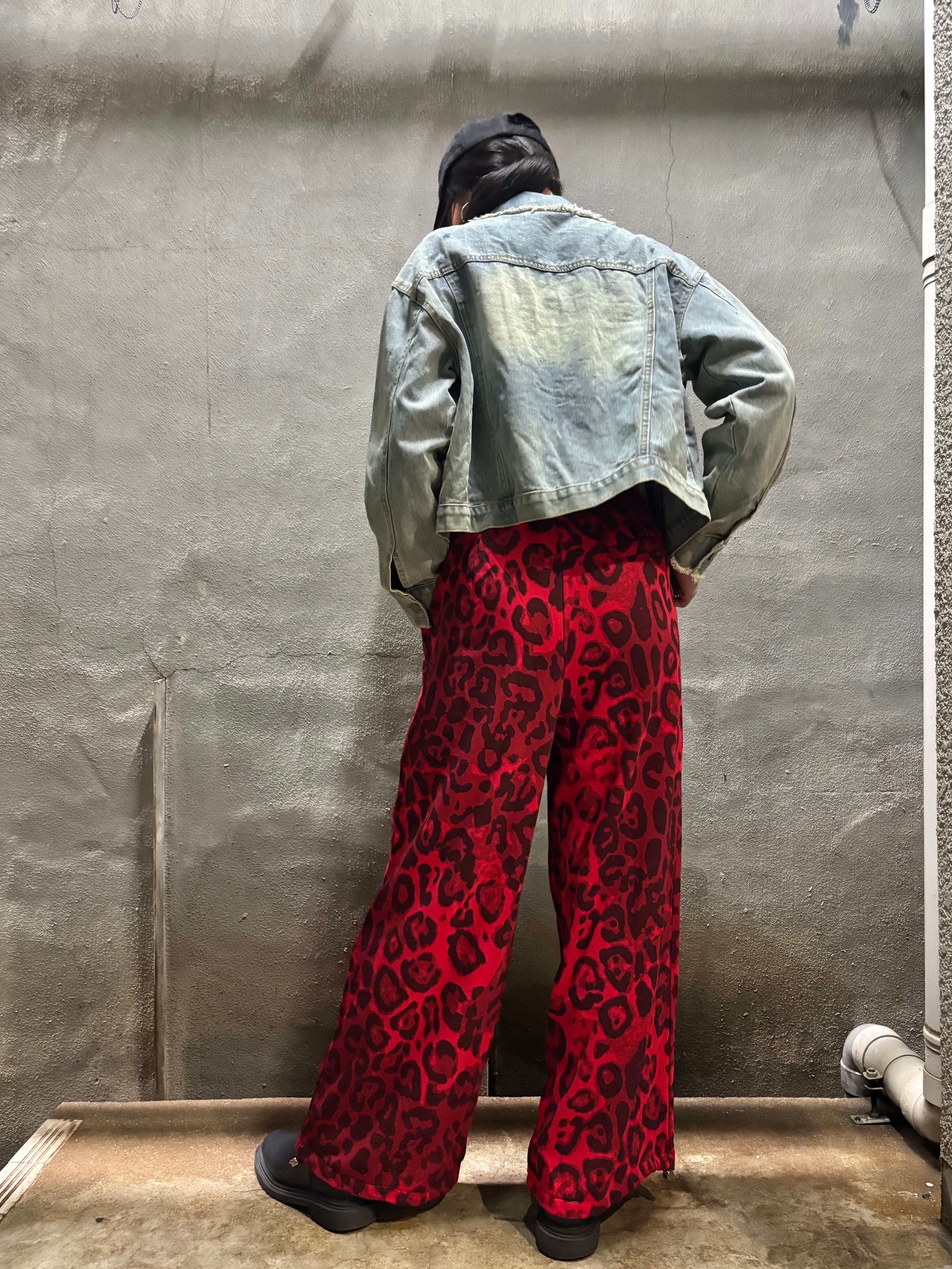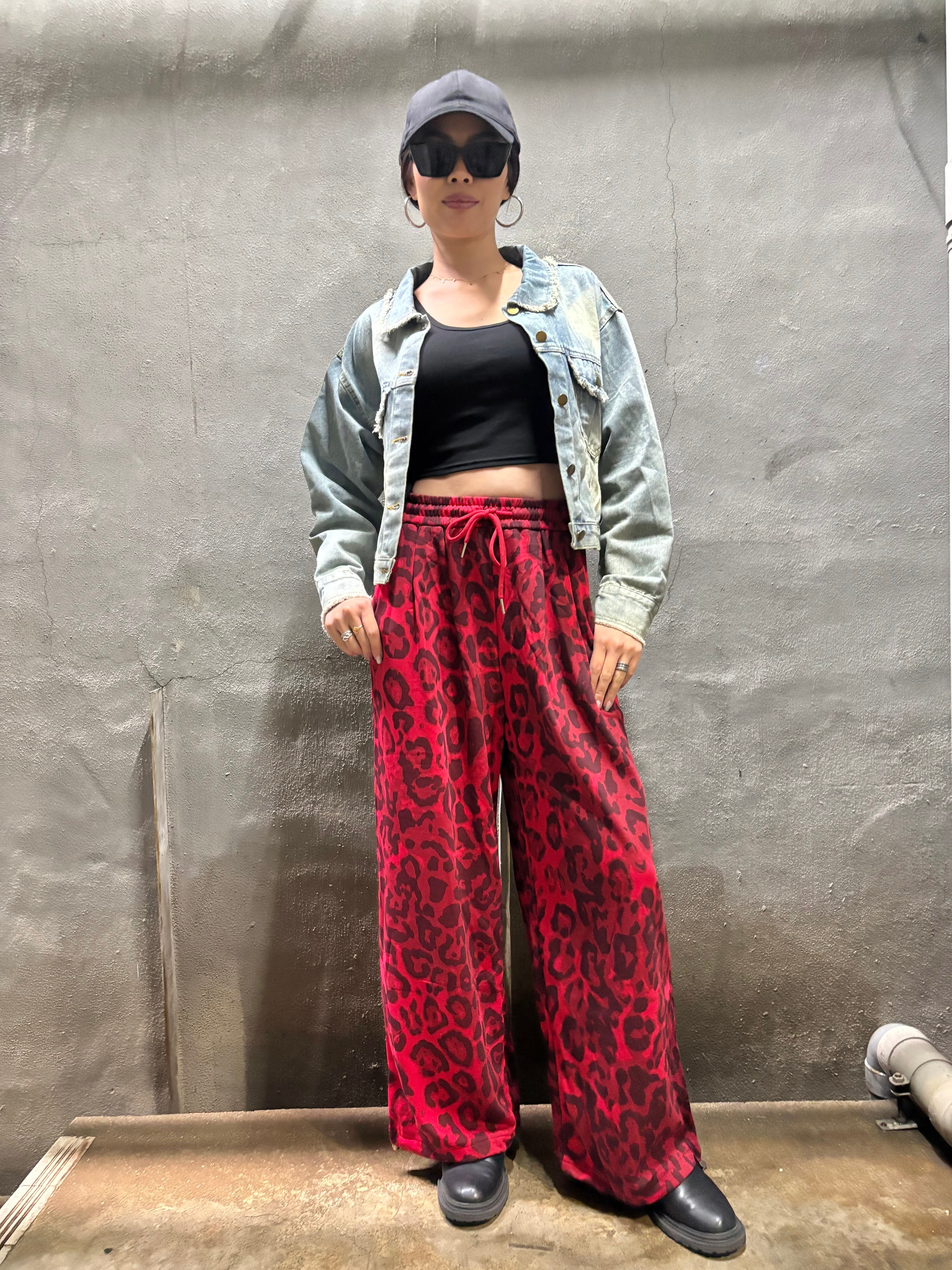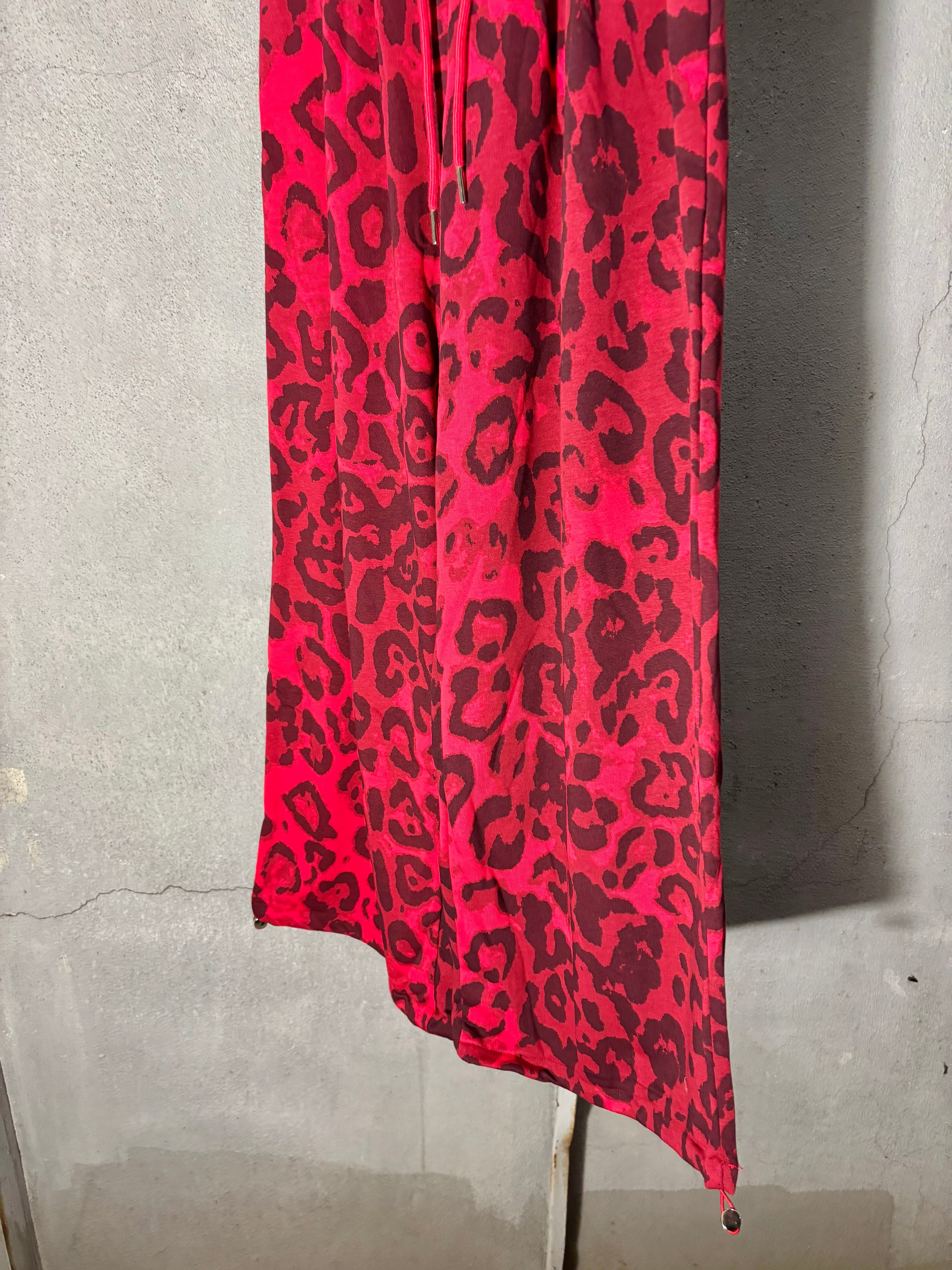 red leopard print easy long pants パンツ レオパード 豹柄 ヒョウ柄 裏毛 ゴムウエスト ドローコード